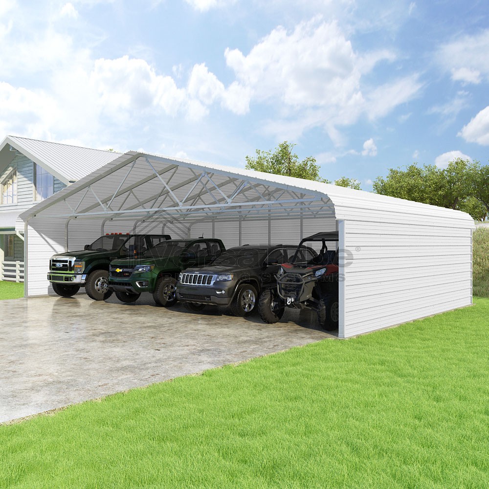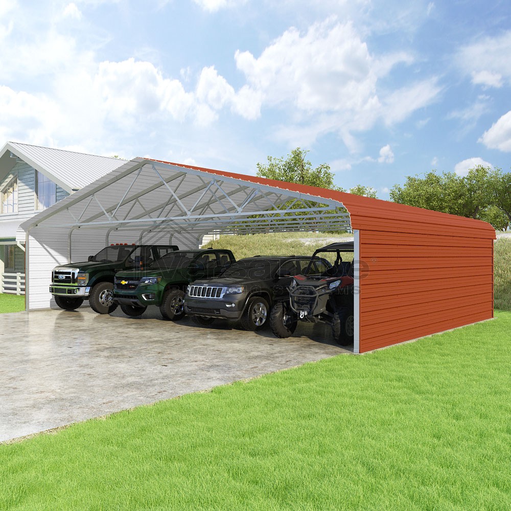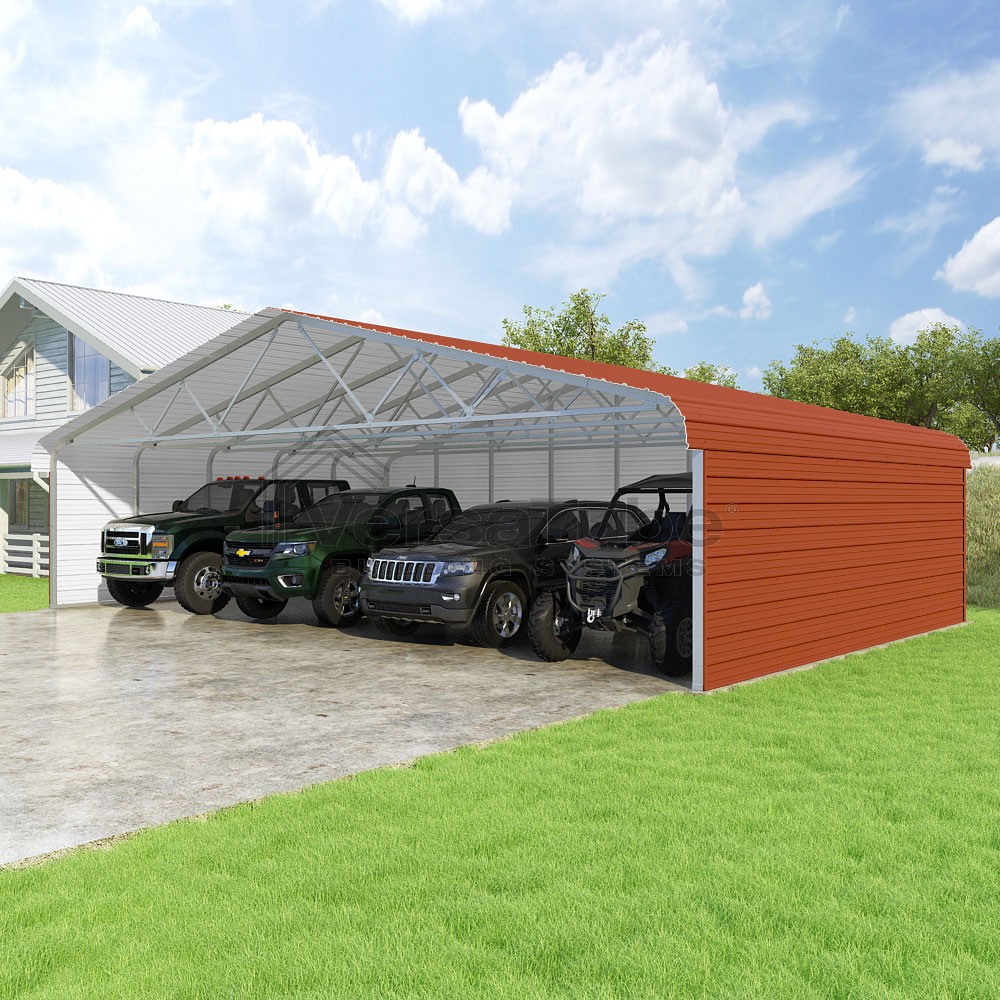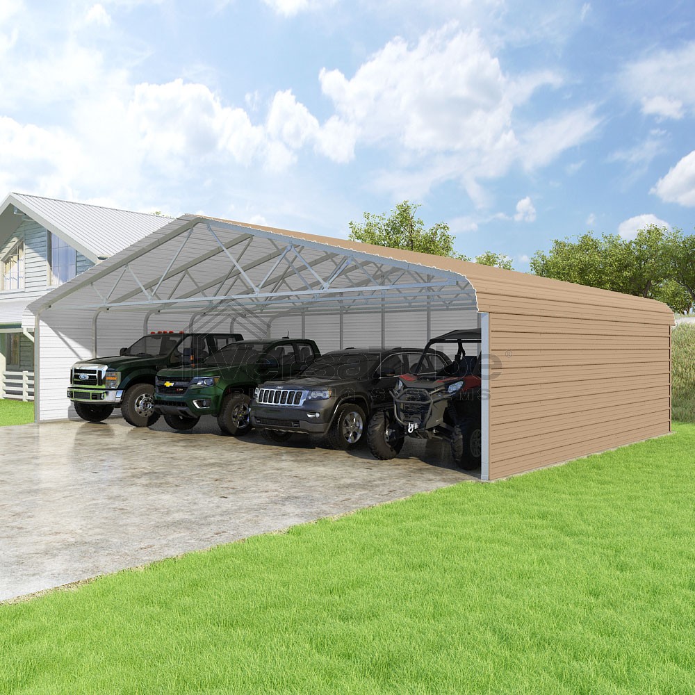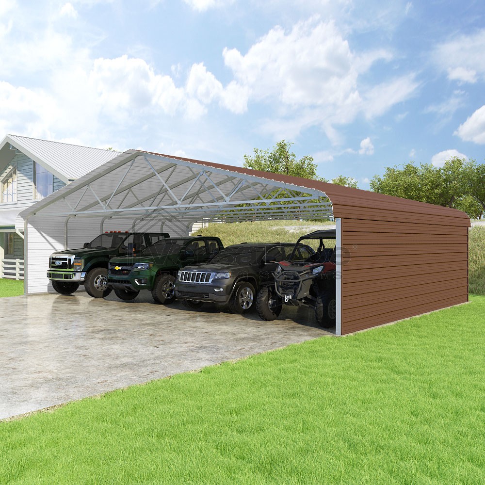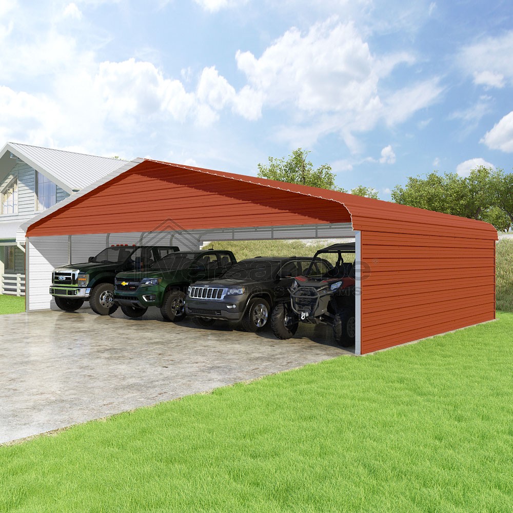 Classic Series DIY carport kit features horizontal application of sheet metal panels with the extra protection of rounded eaves.