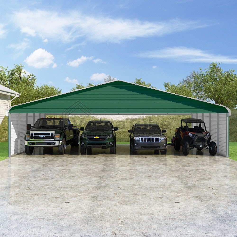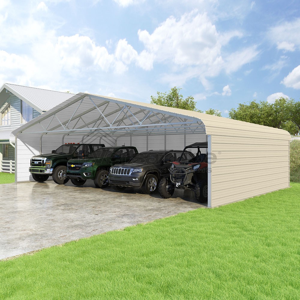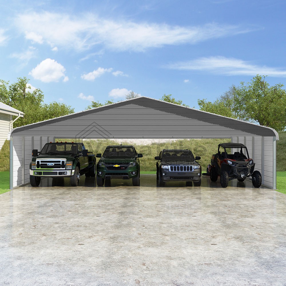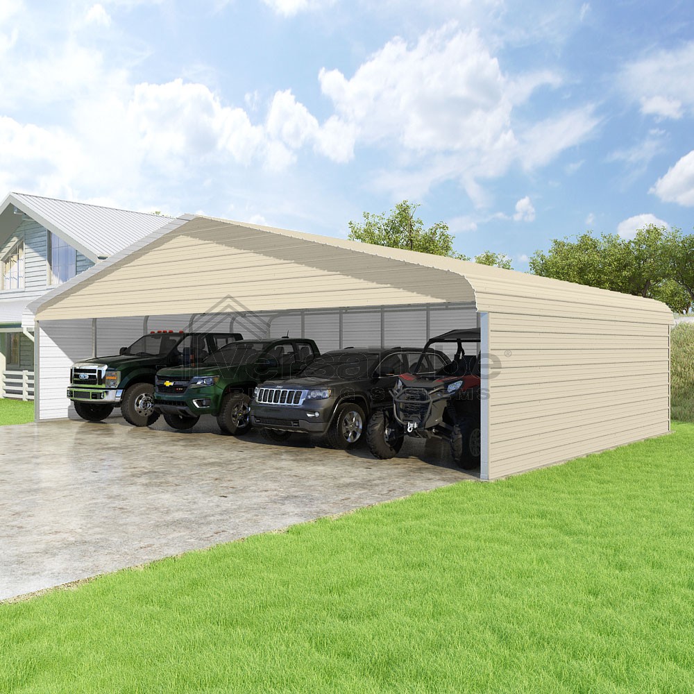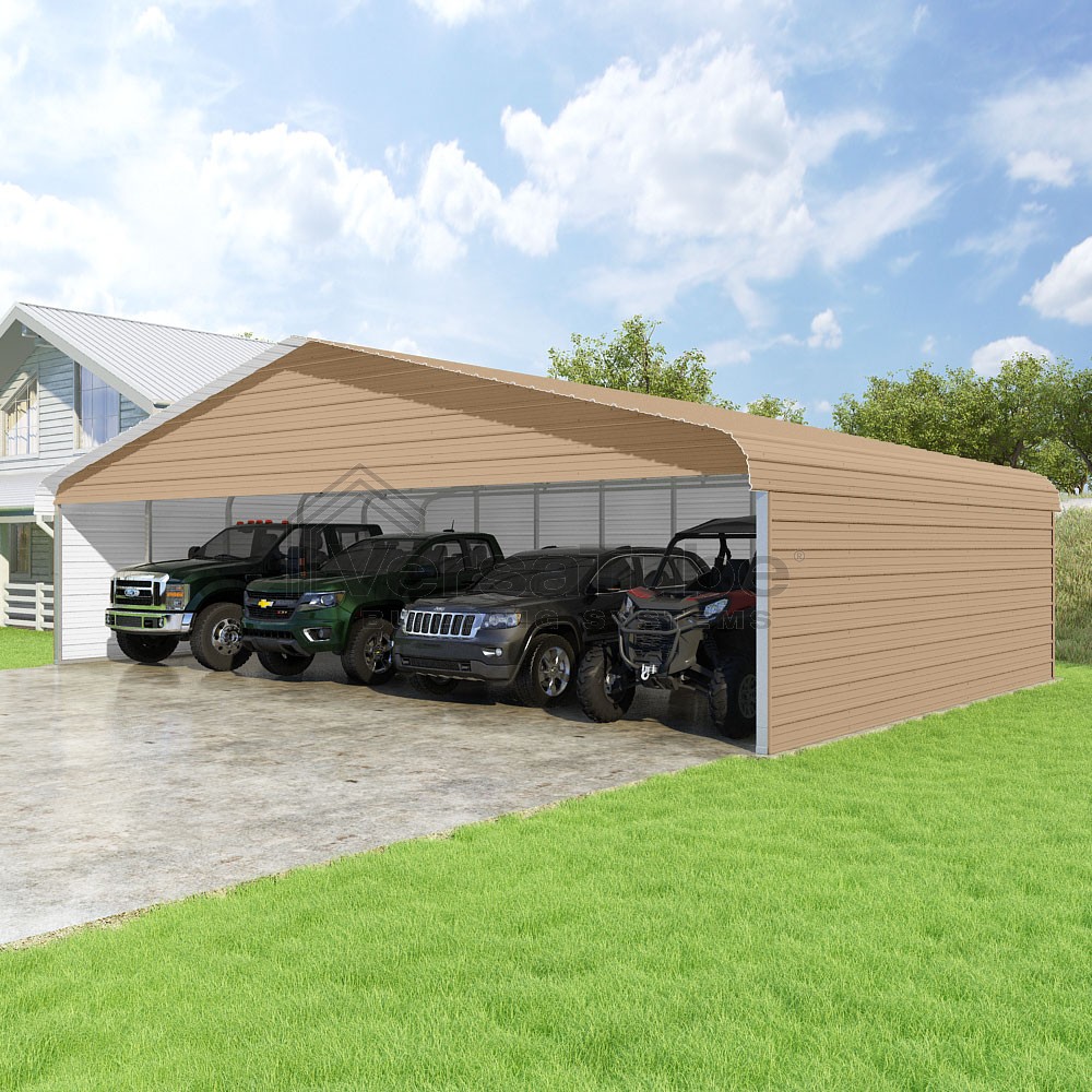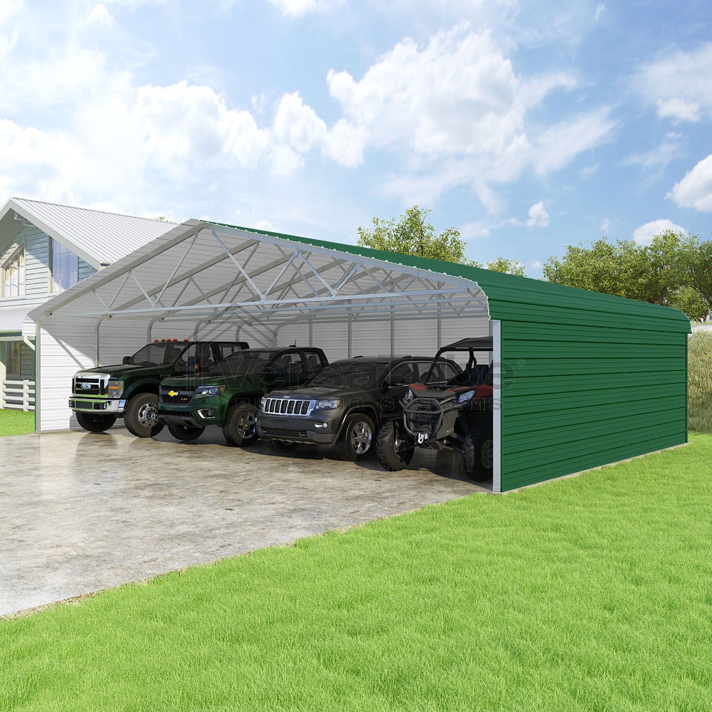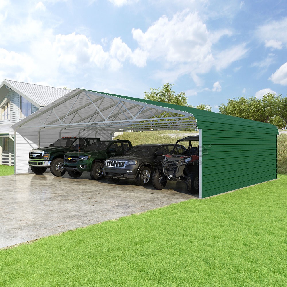 Classic Series DIY carport kit features horizontal application of sheet metal panels with the extra protection of rounded eaves.