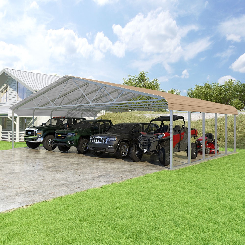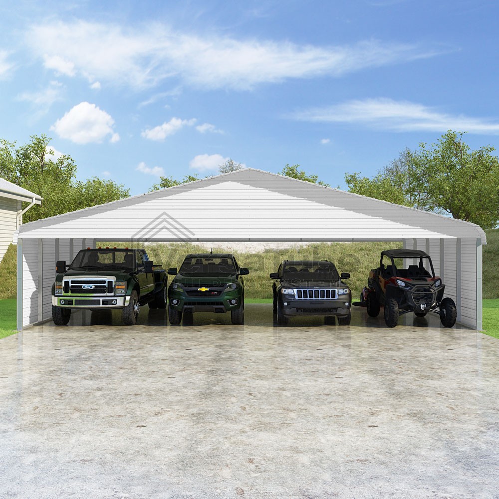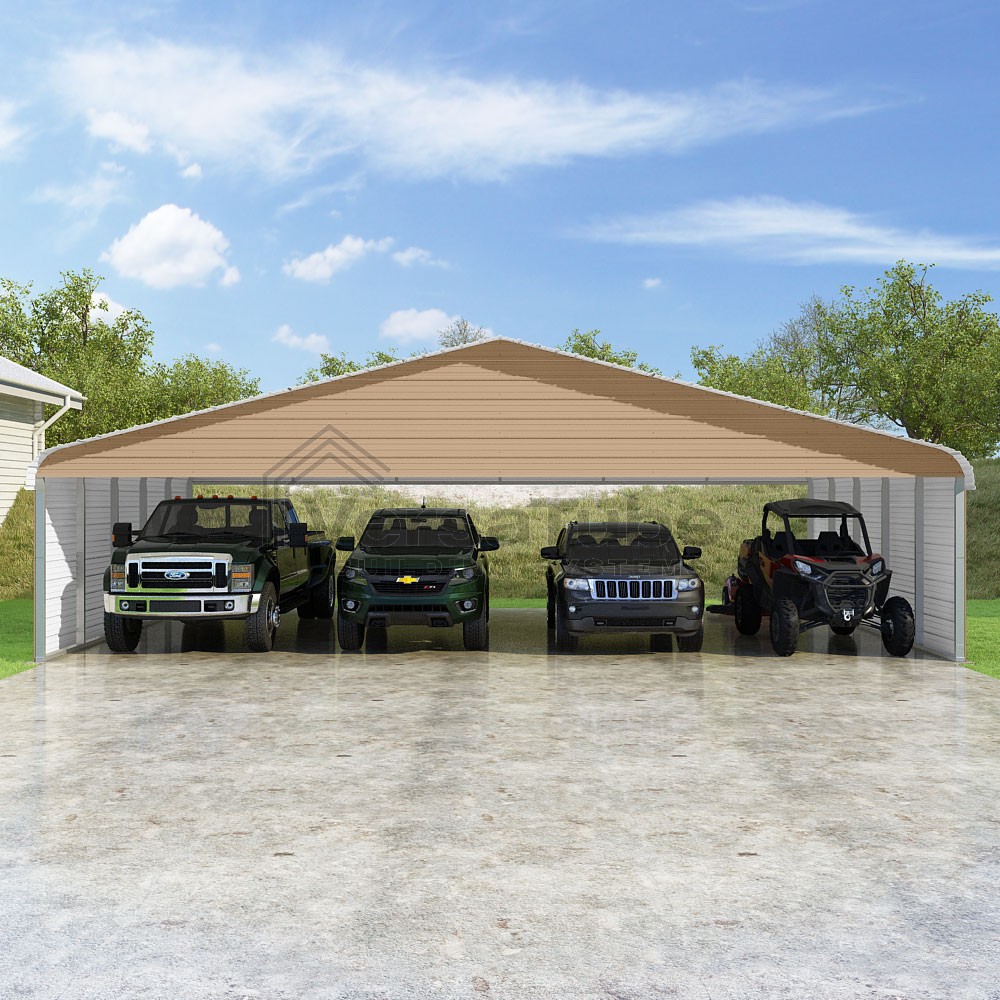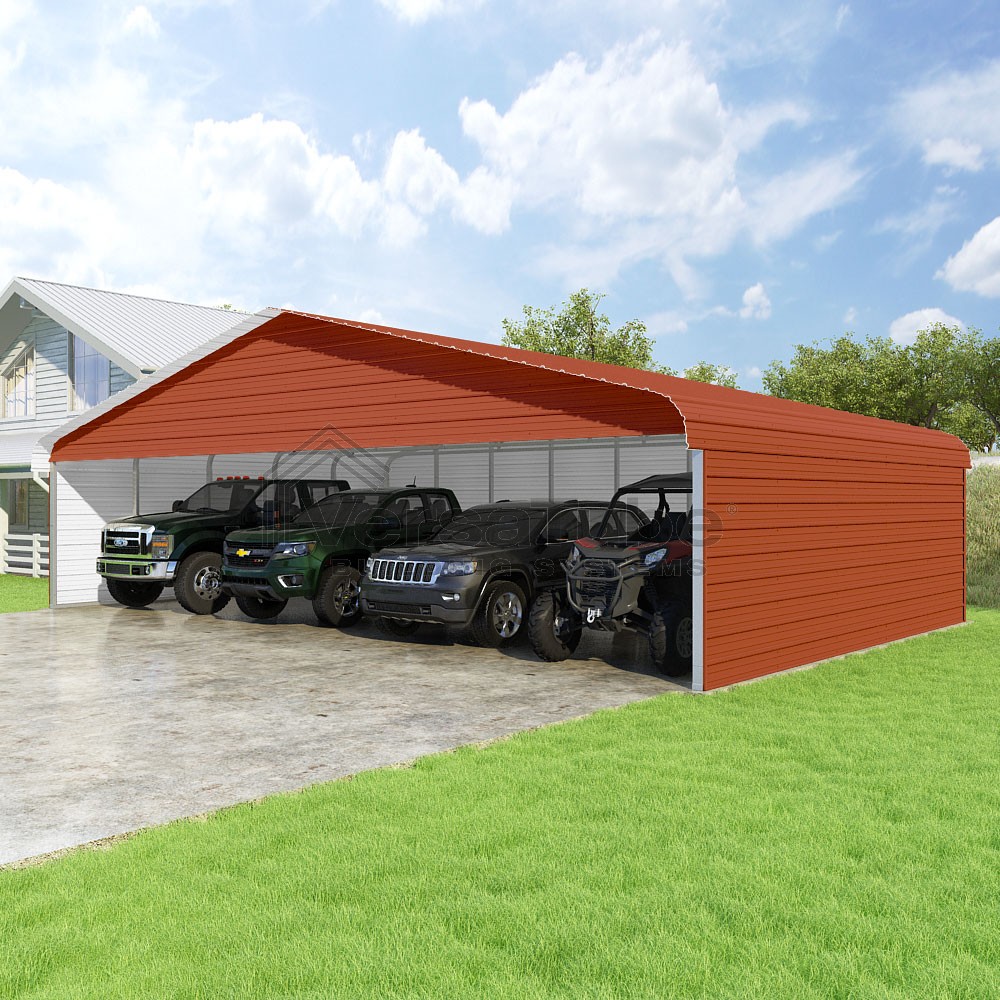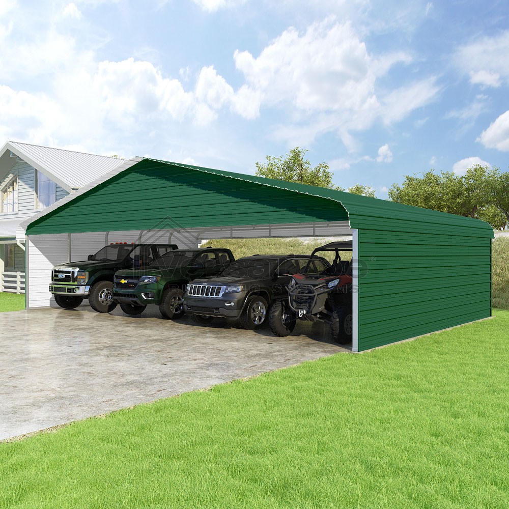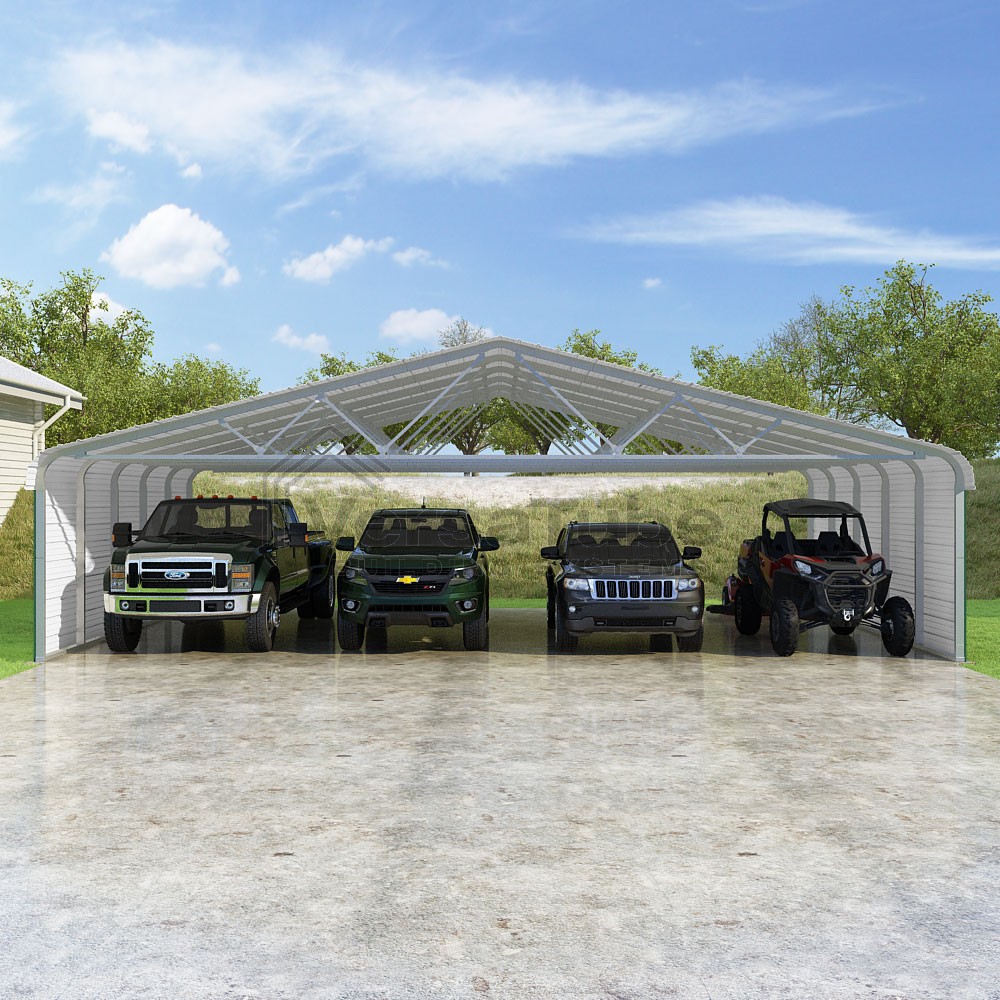 Classic Series DIY carport kit features horizontal application of sheet metal panels with the extra protection of rounded eaves.