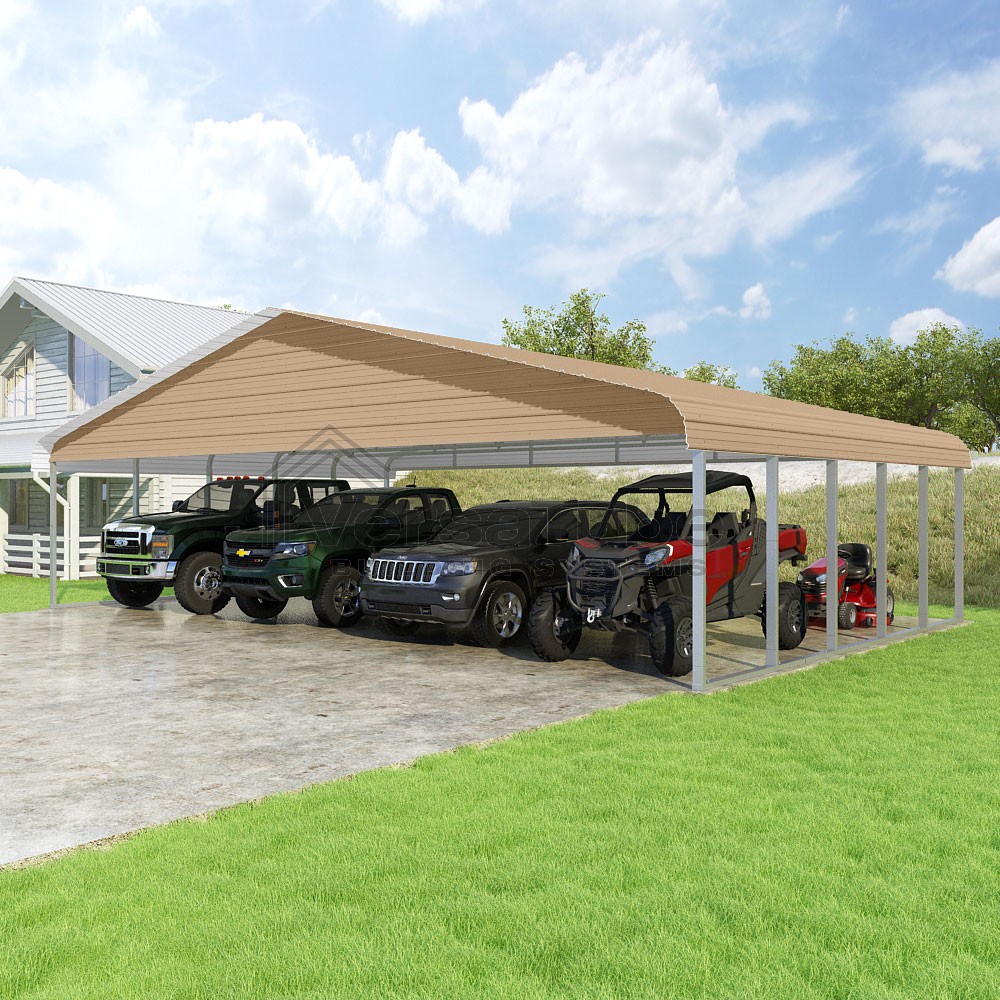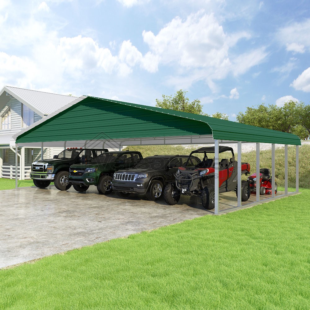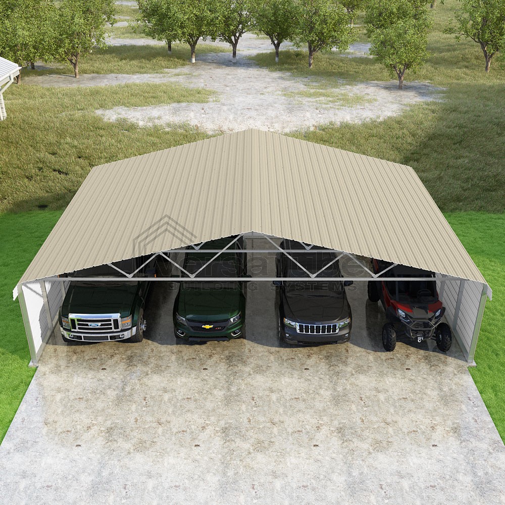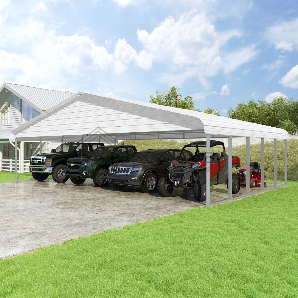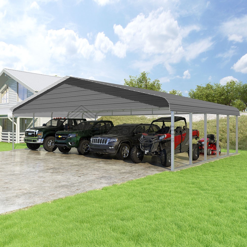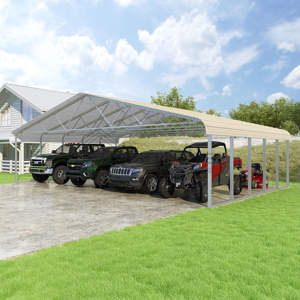 Classic Series DIY carport kit features horizontal application of sheet metal panels with the extra protection of rounded eaves.