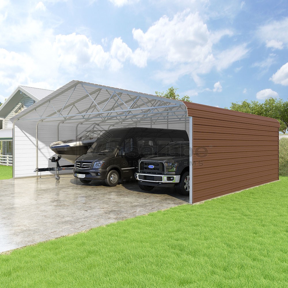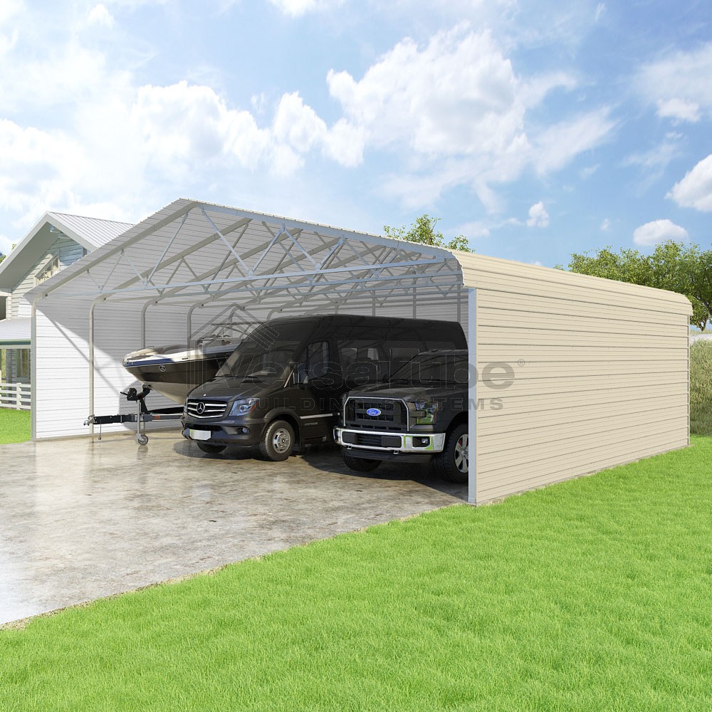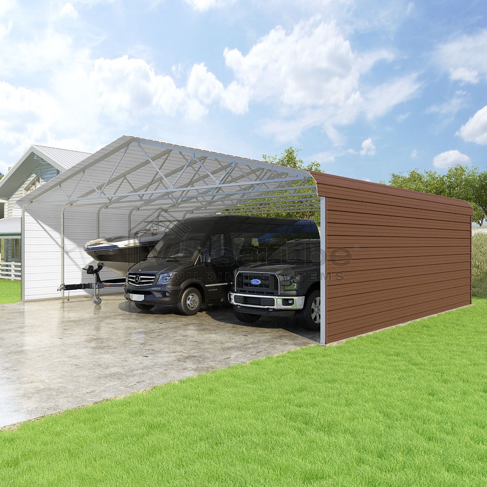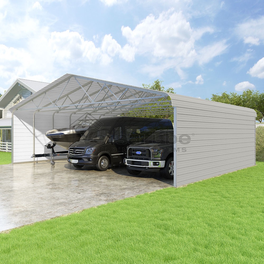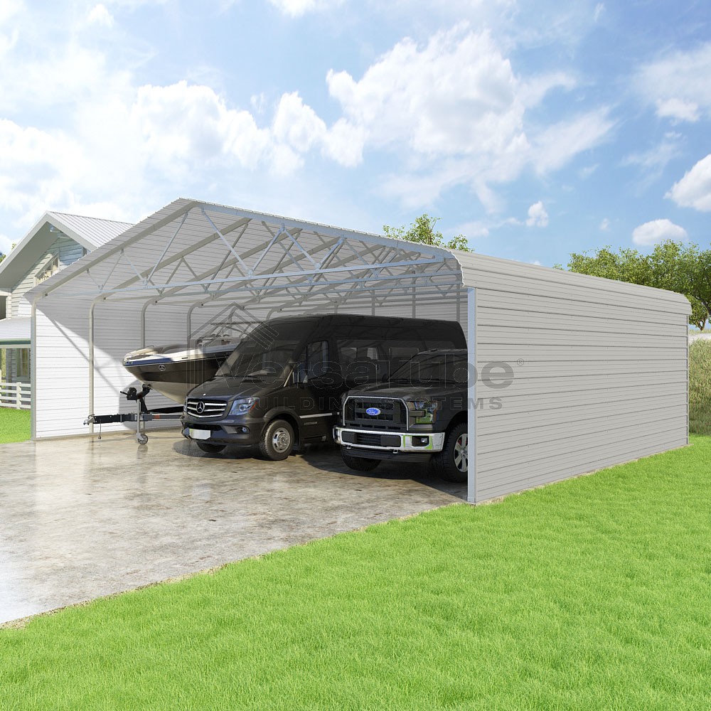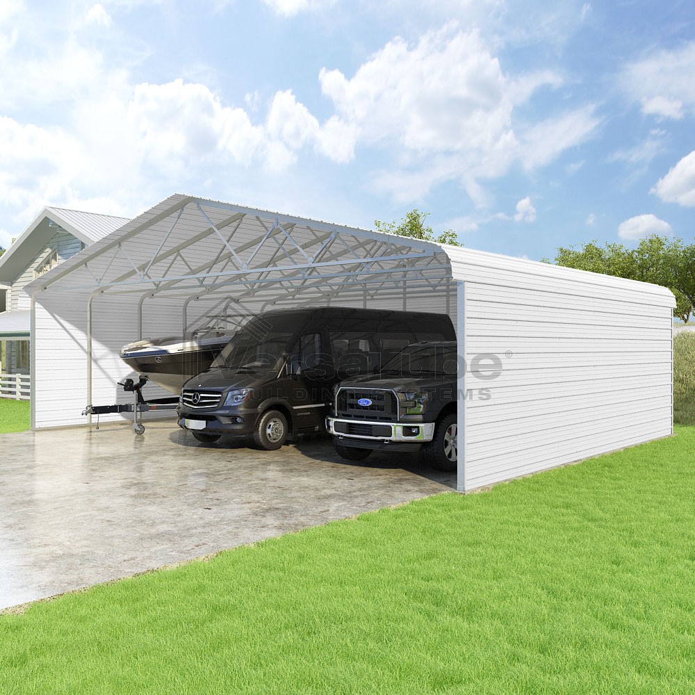 Classic Series DIY carport kit features horizontal application of sheet metal panels with the extra protection of rounded eaves.