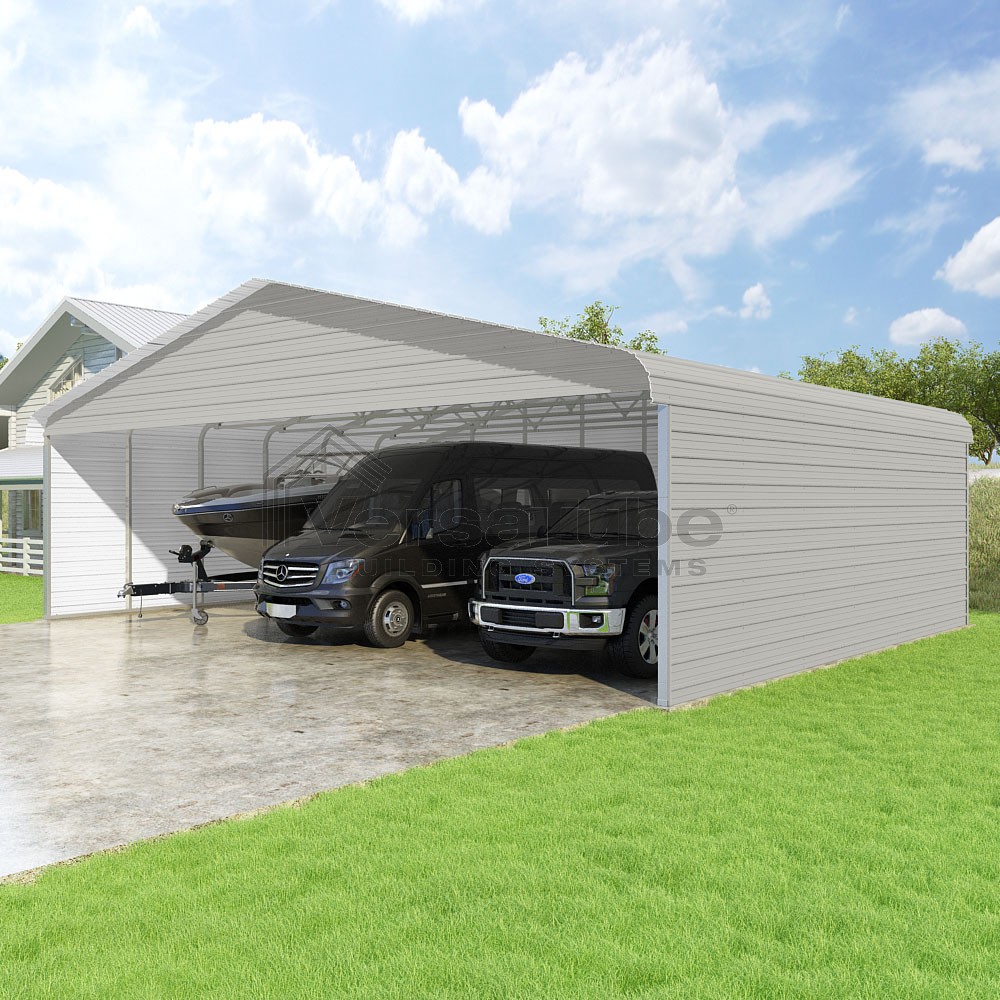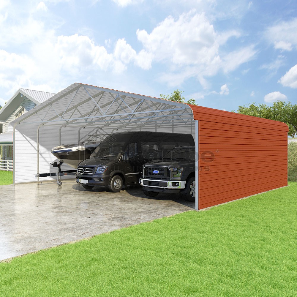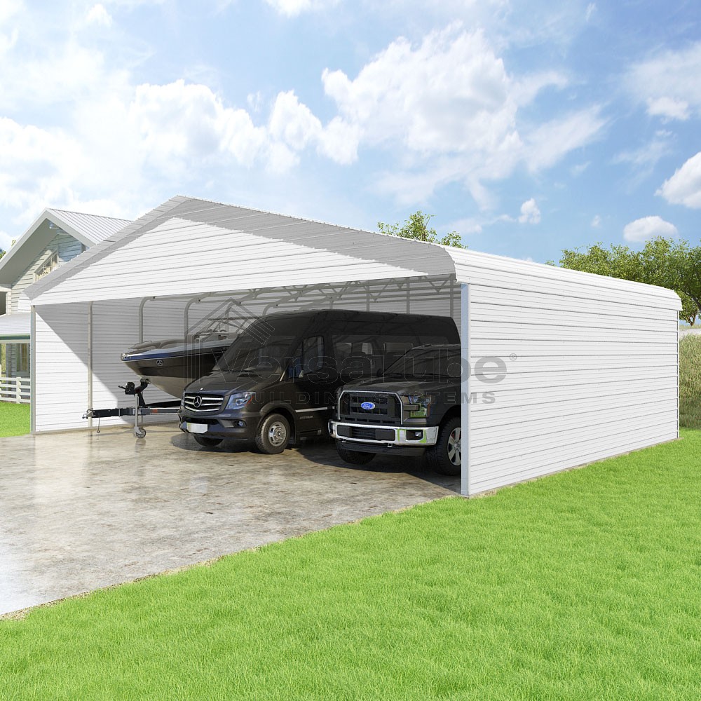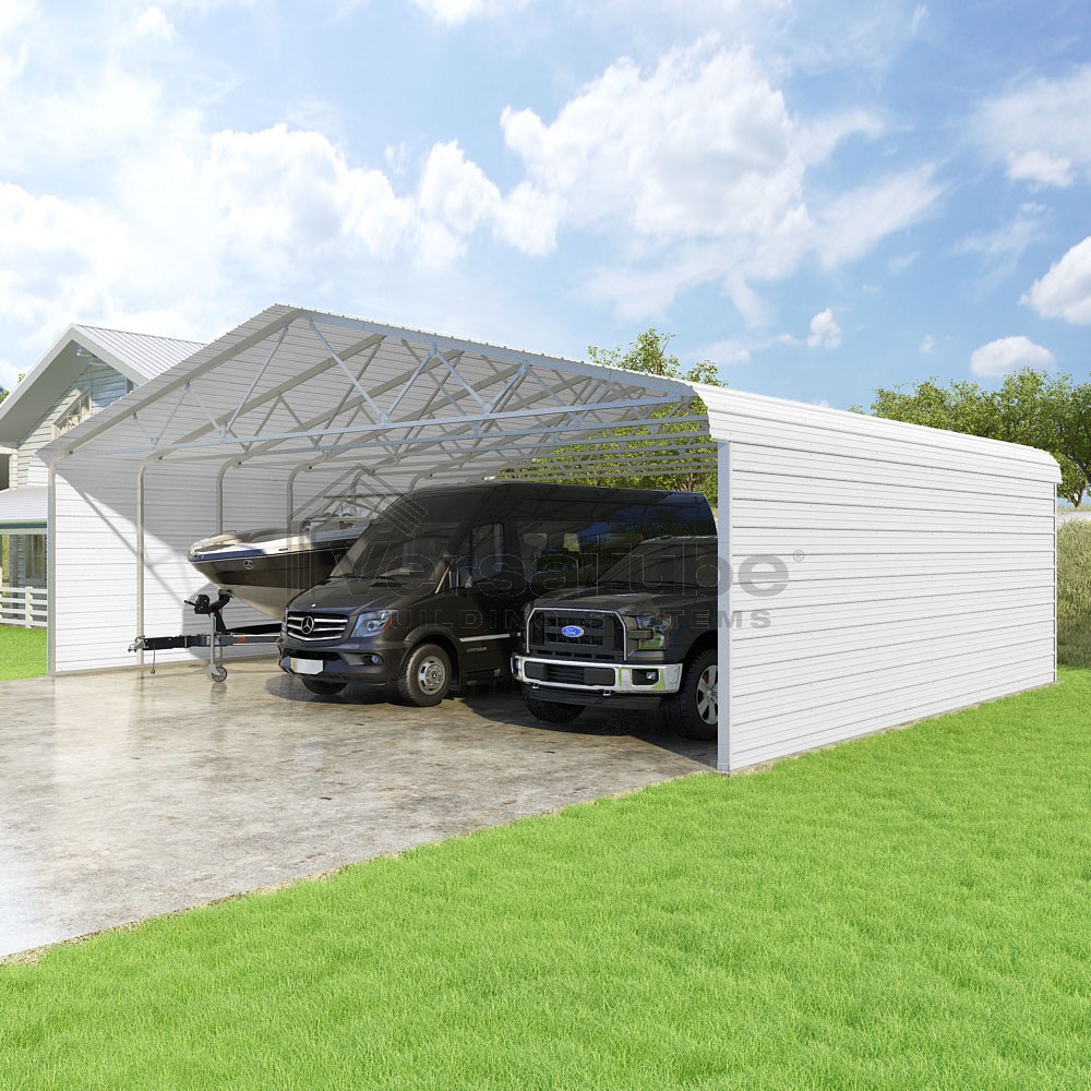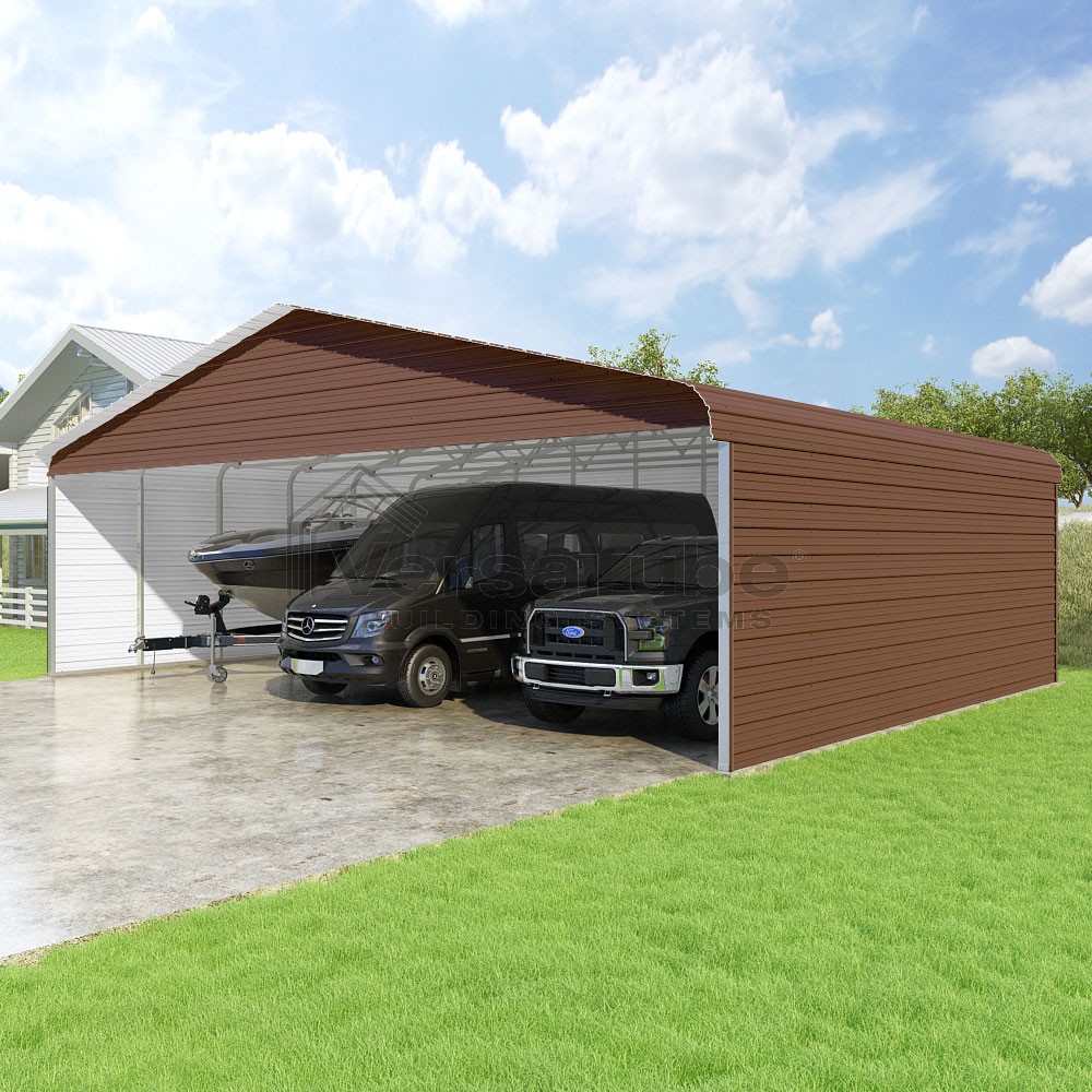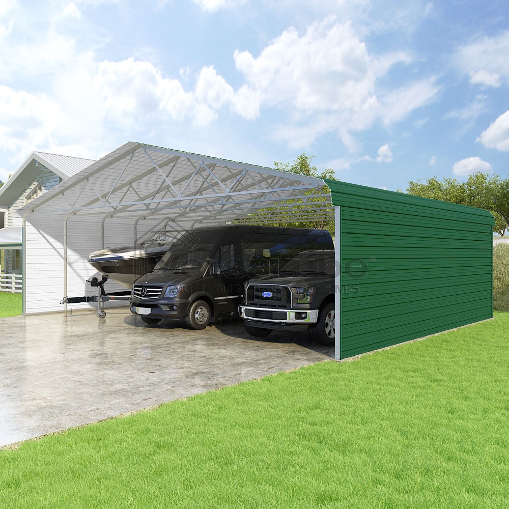 Classic Series DIY carport kit features horizontal application of sheet metal panels with the extra protection of rounded eaves.