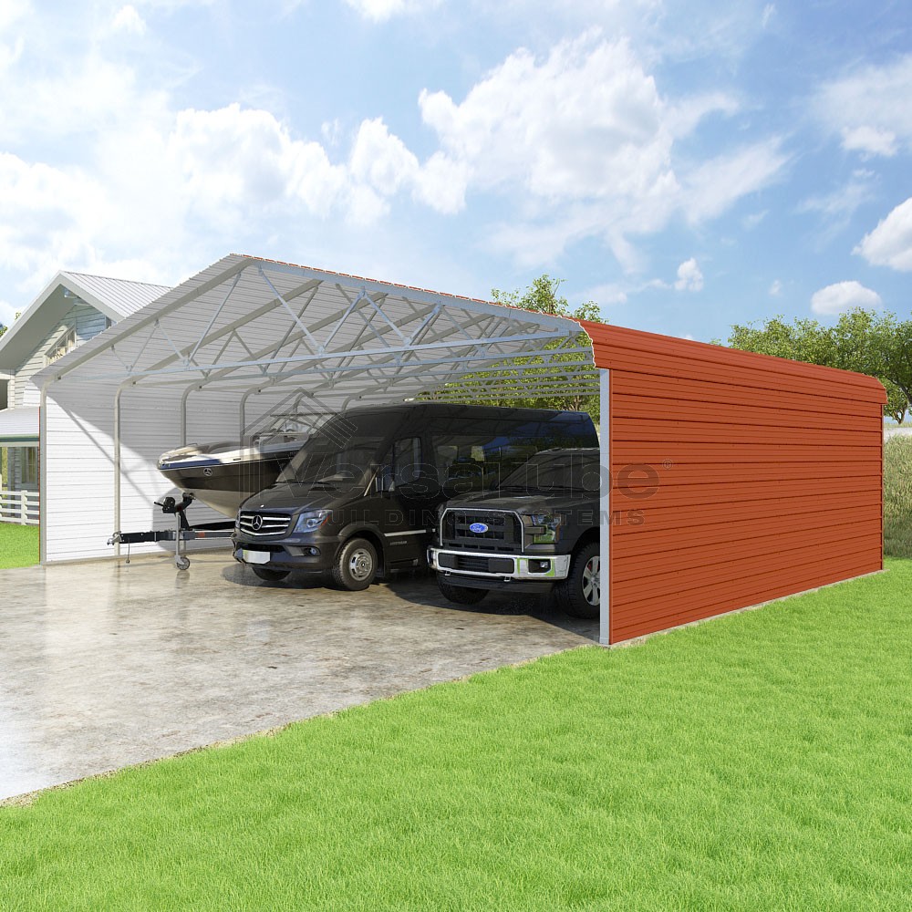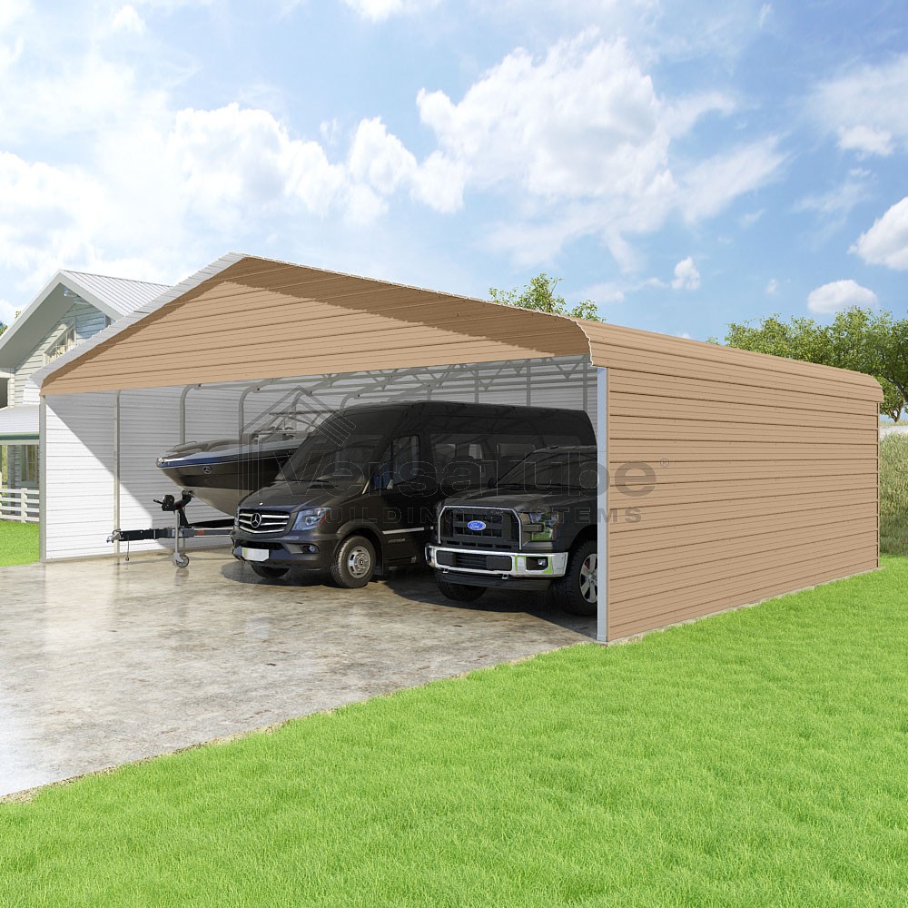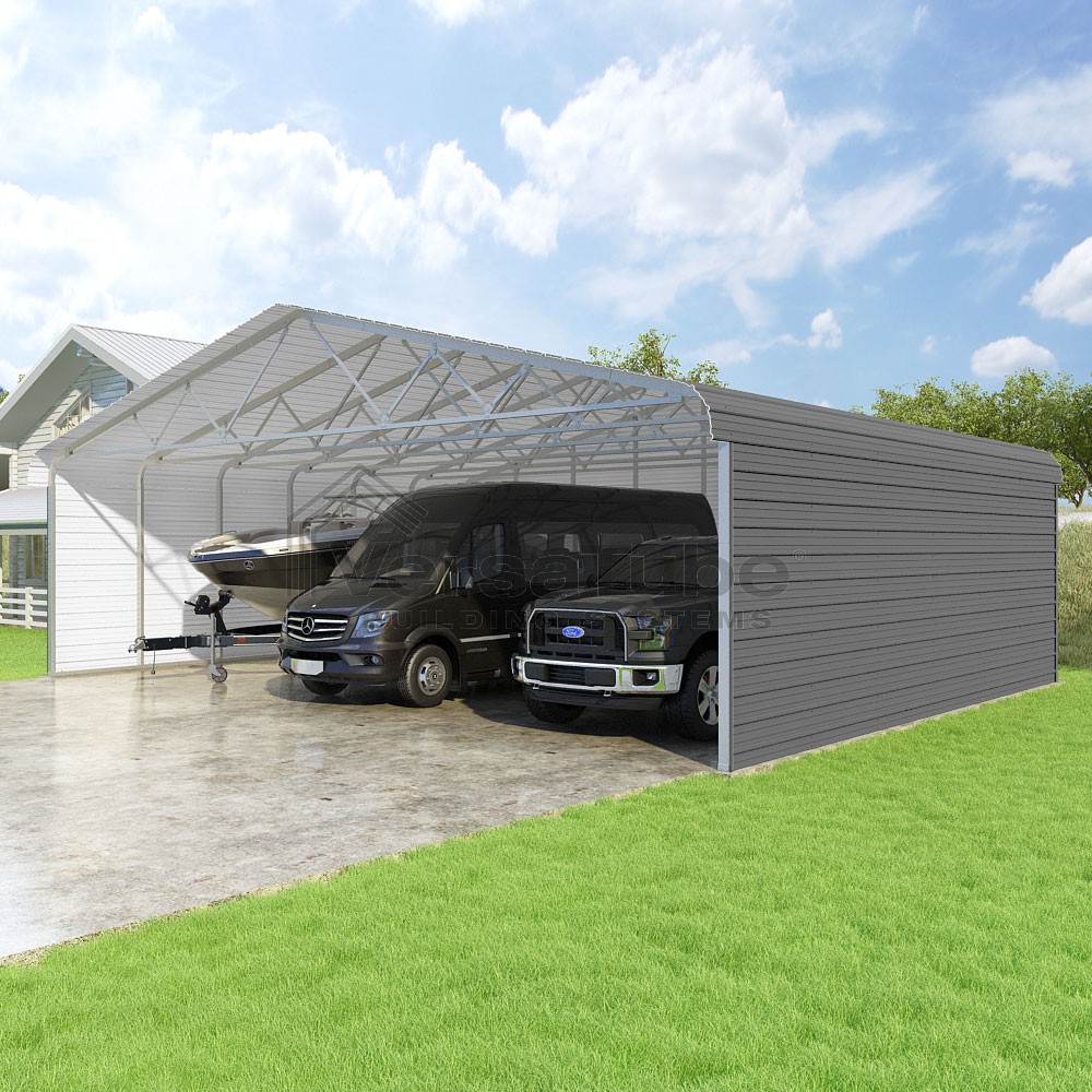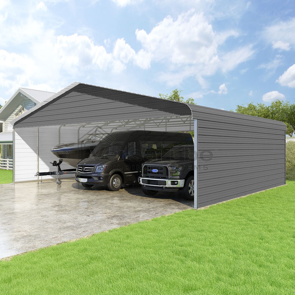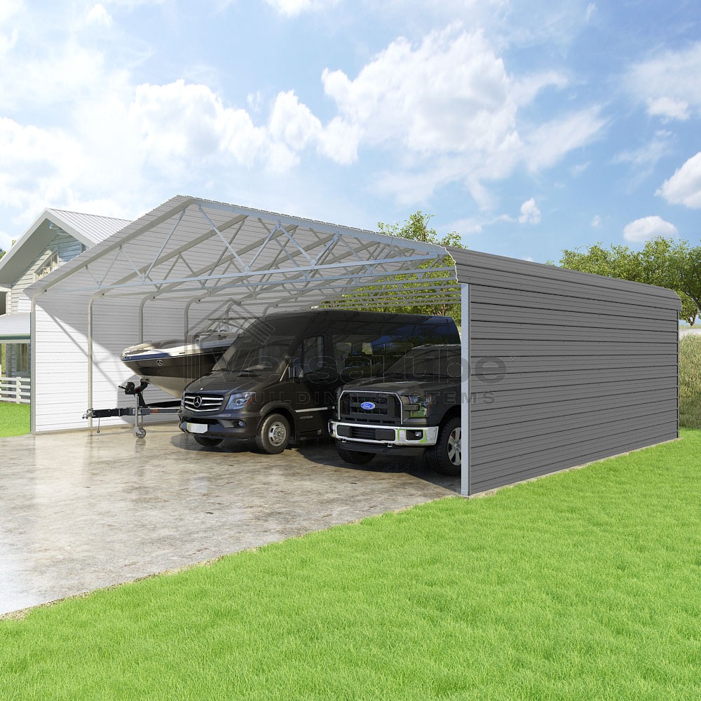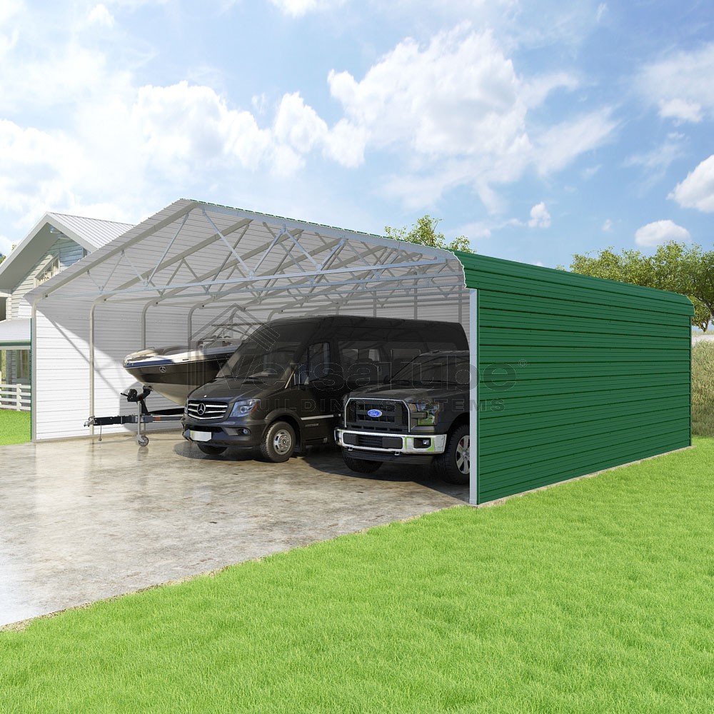Classic Series DIY carport kit features horizontal application of sheet metal panels with the extra protection of rounded eaves.