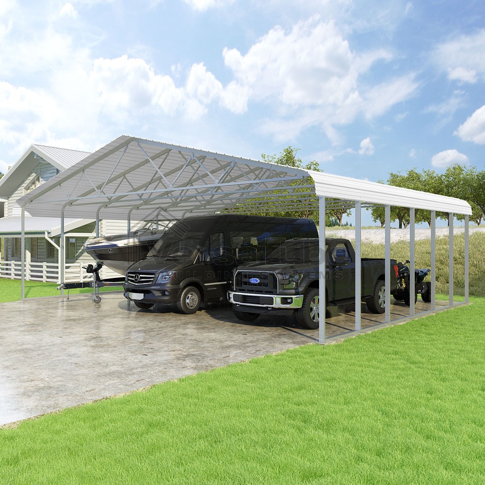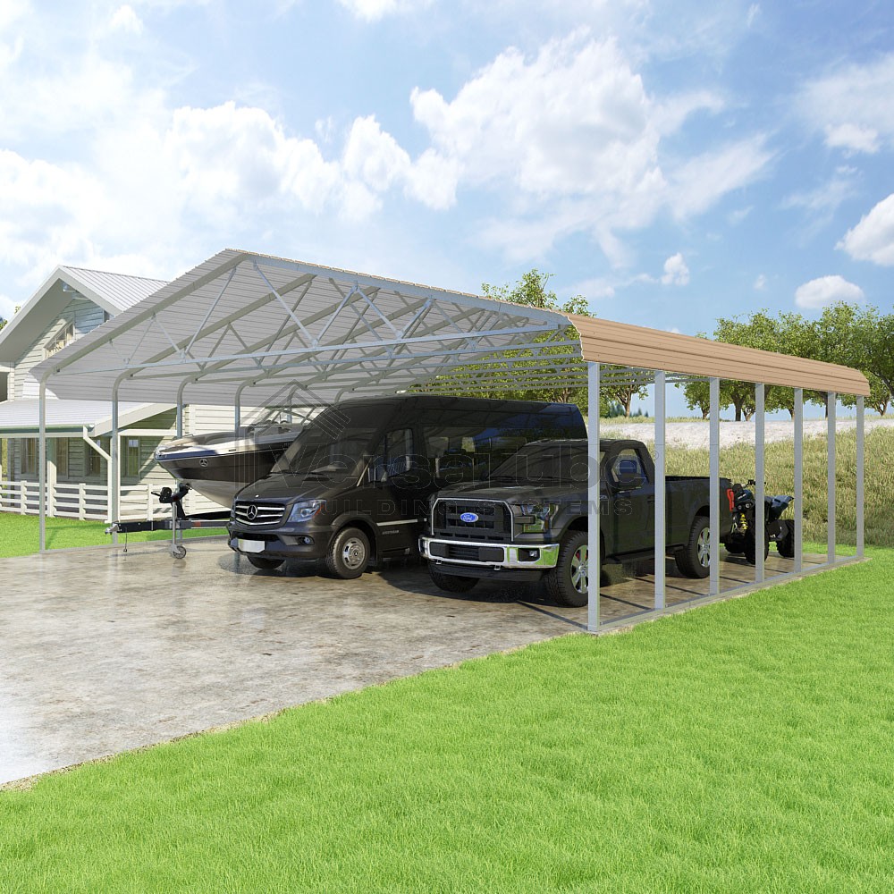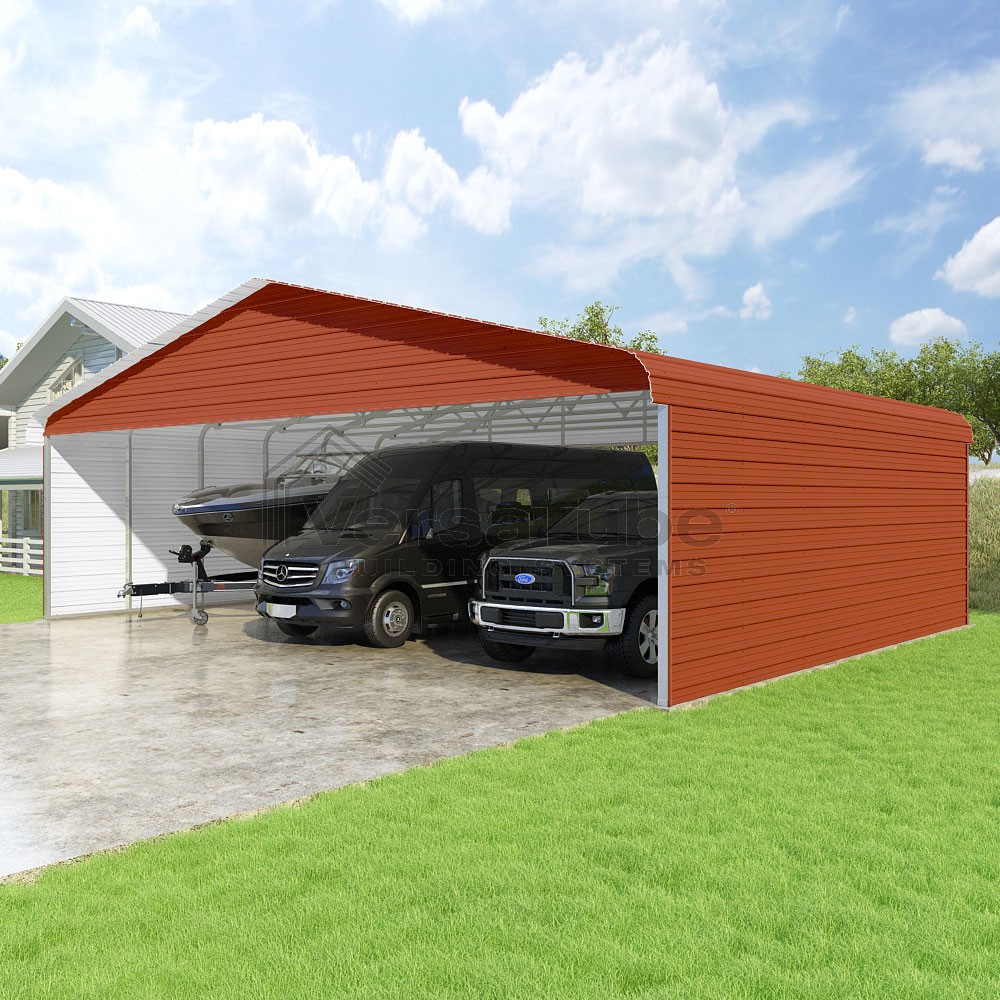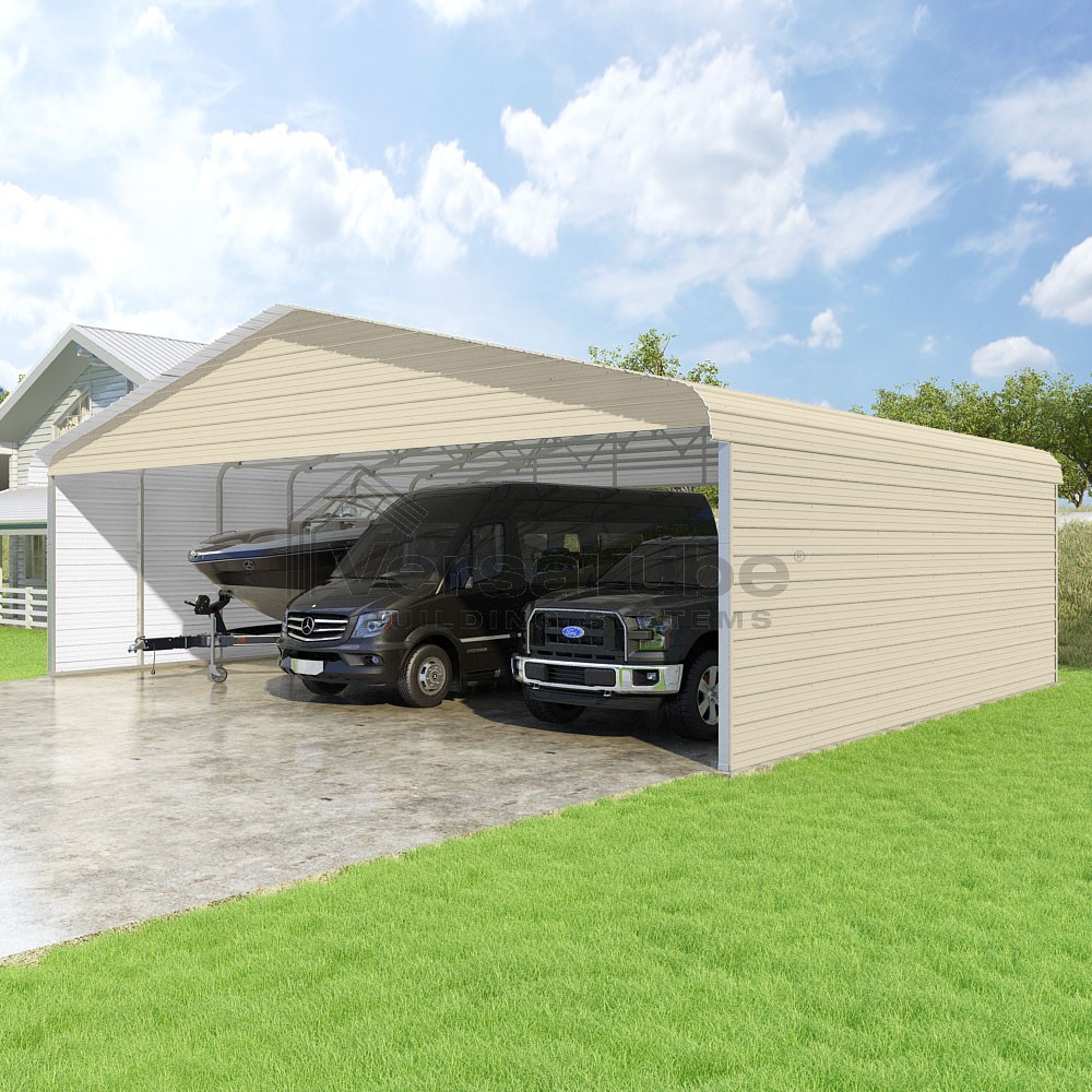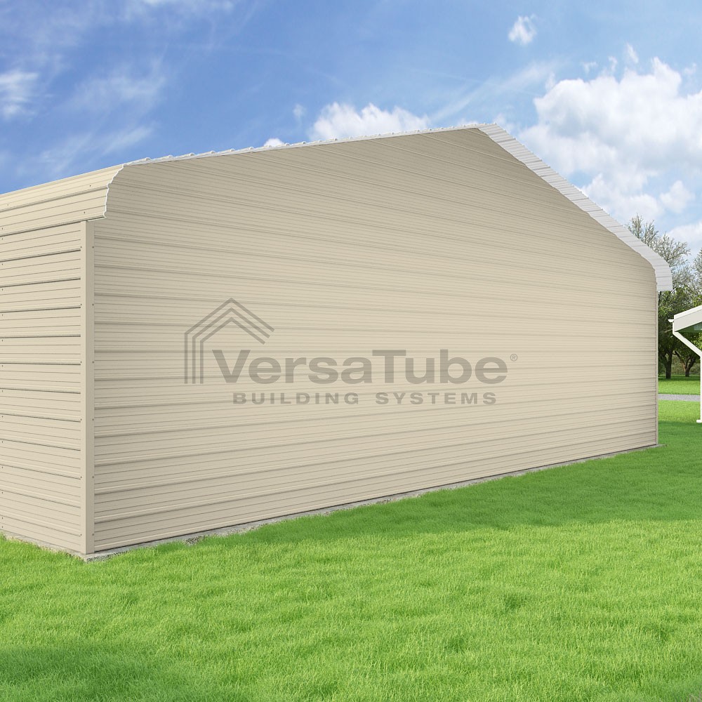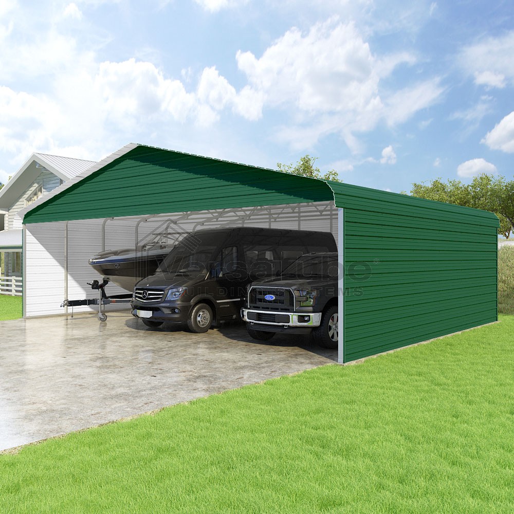 Classic Series DIY carport kit features horizontal application of sheet metal panels with the extra protection of rounded eaves.