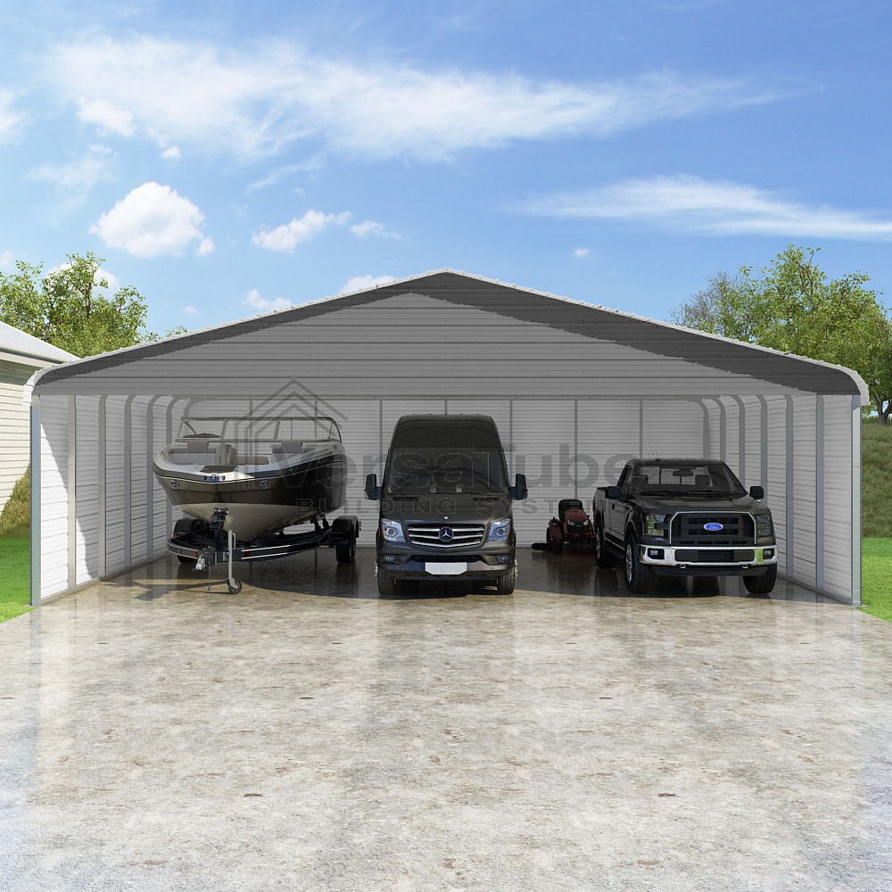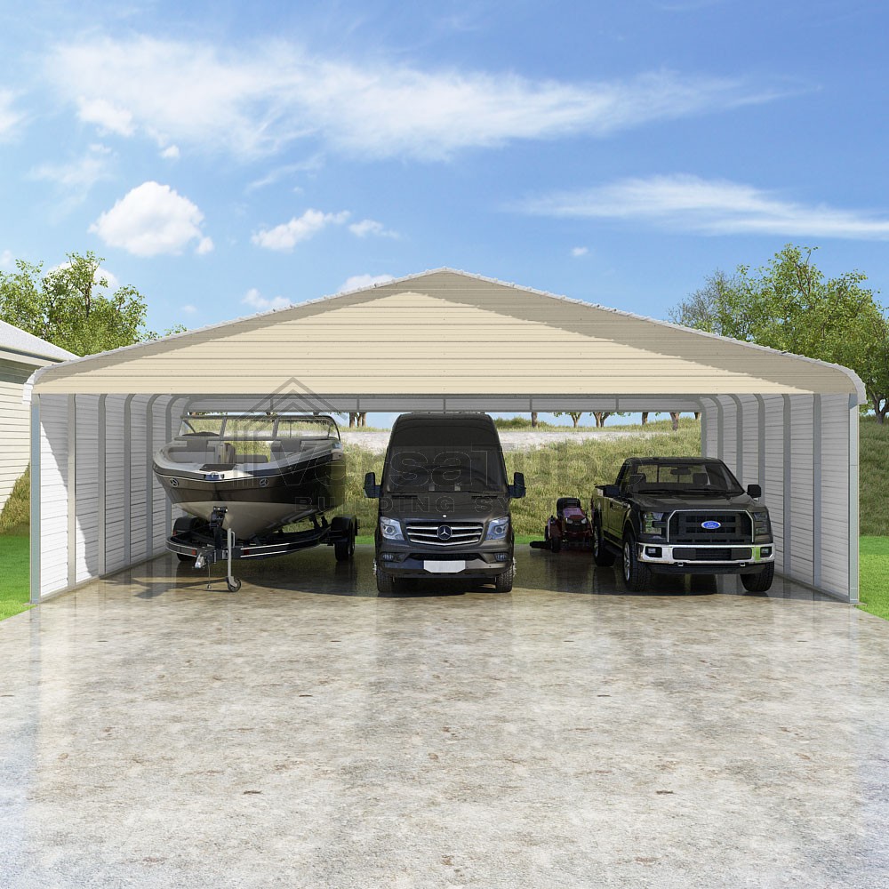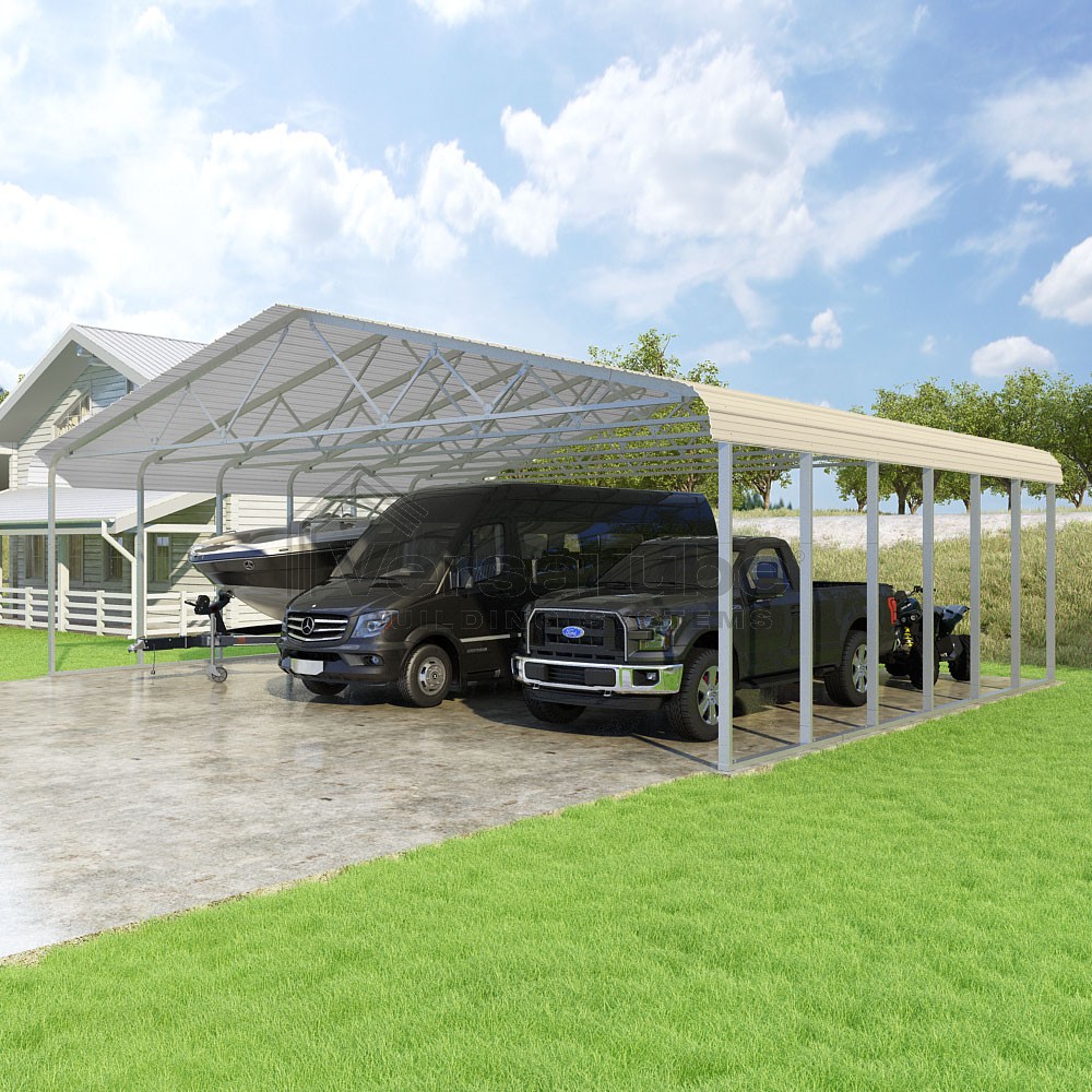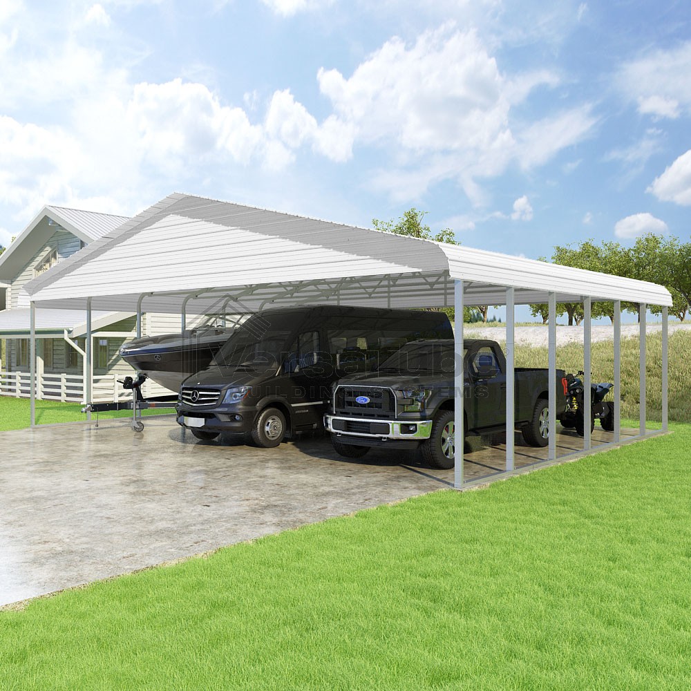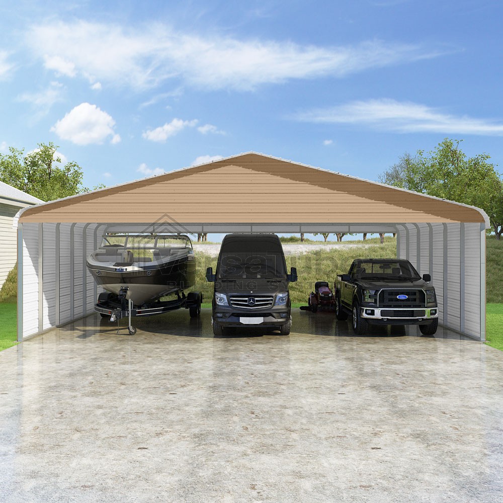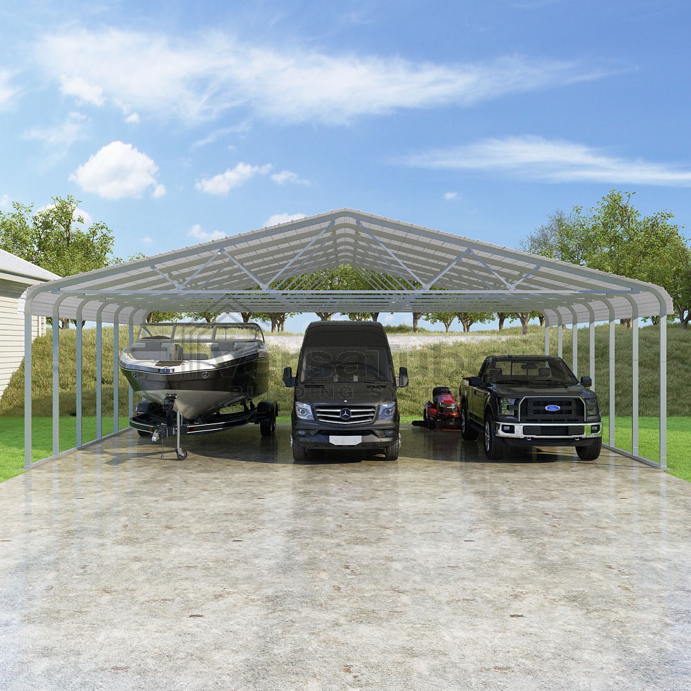 Classic Series DIY carport kit features horizontal application of sheet metal panels with the extra protection of rounded eaves.