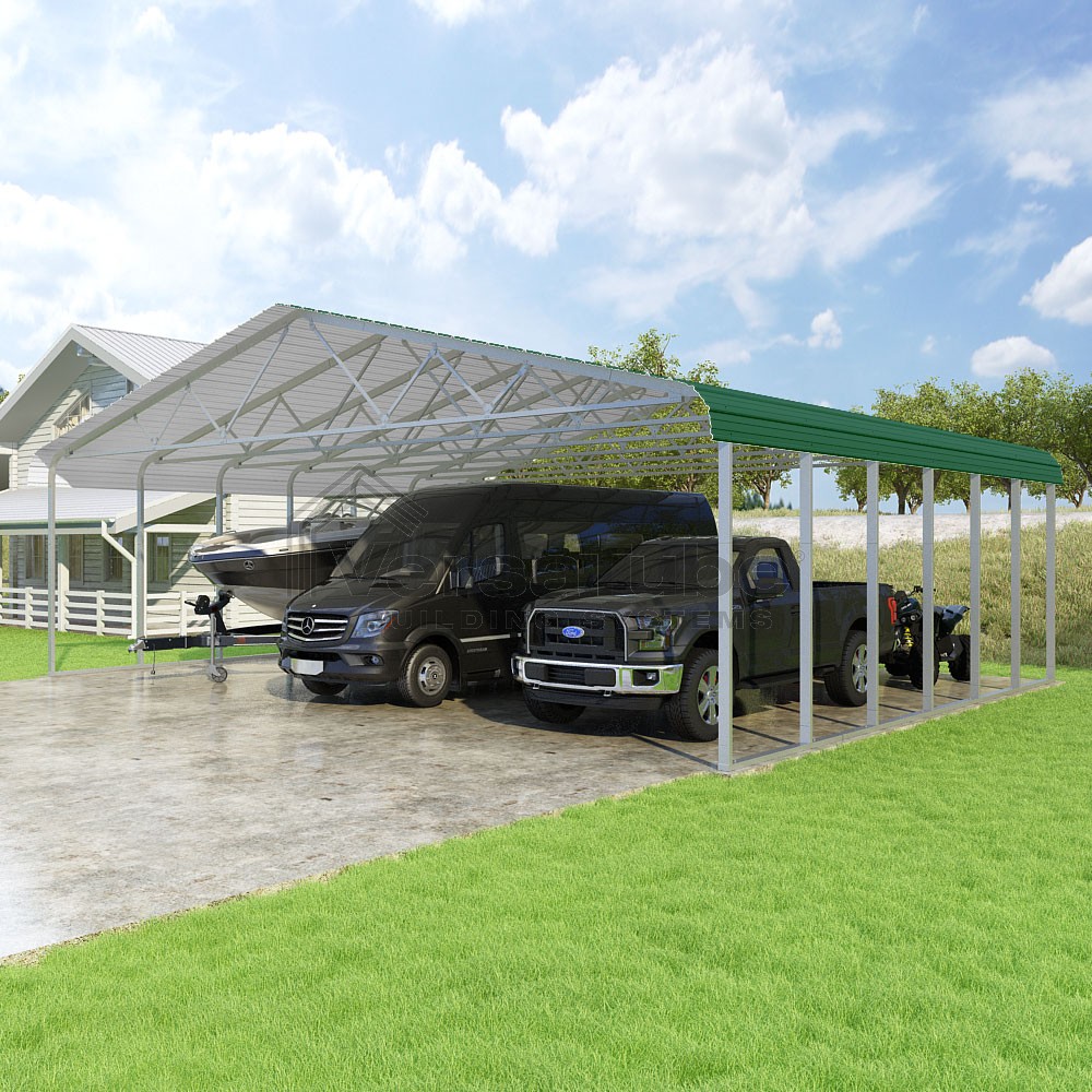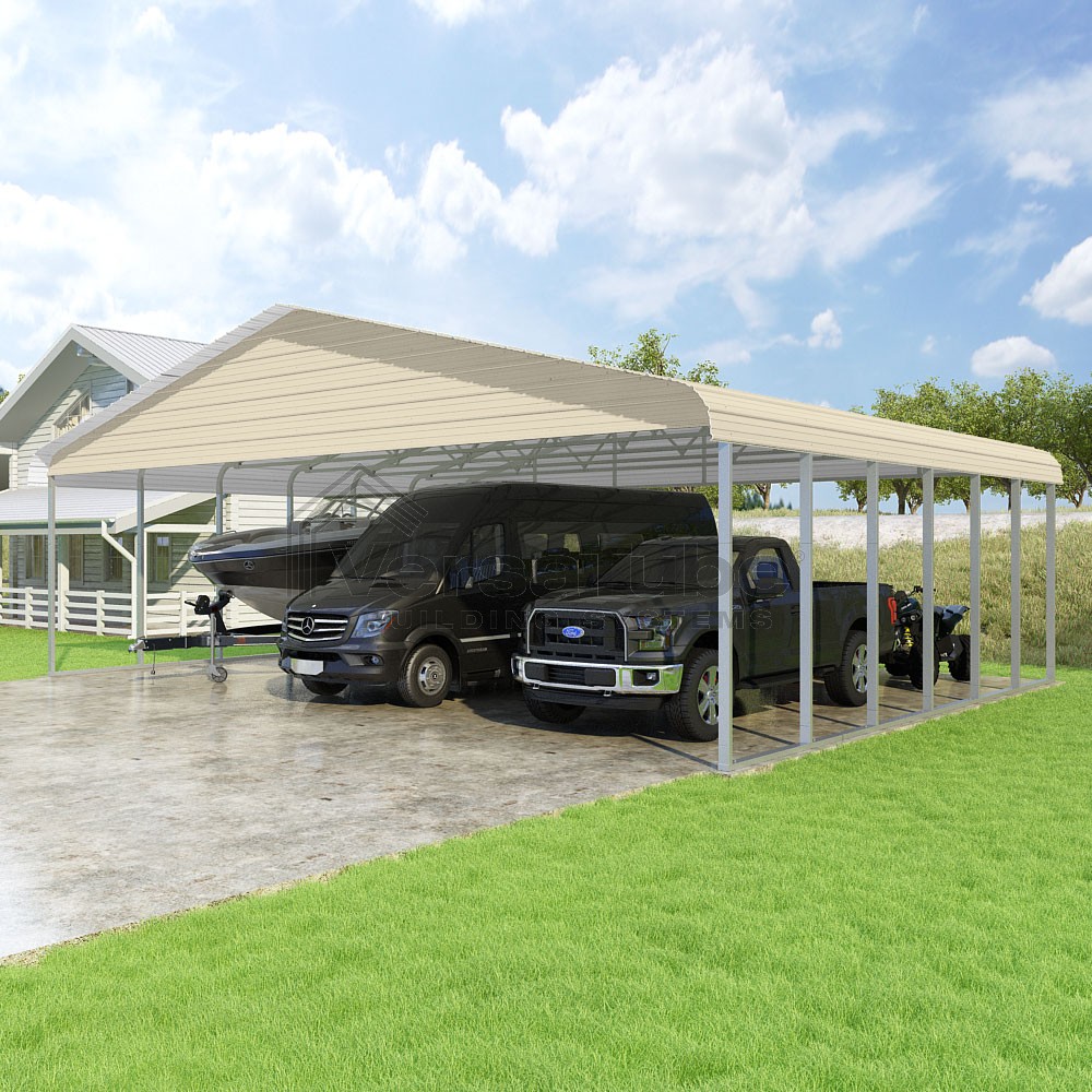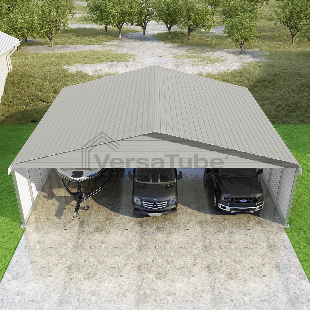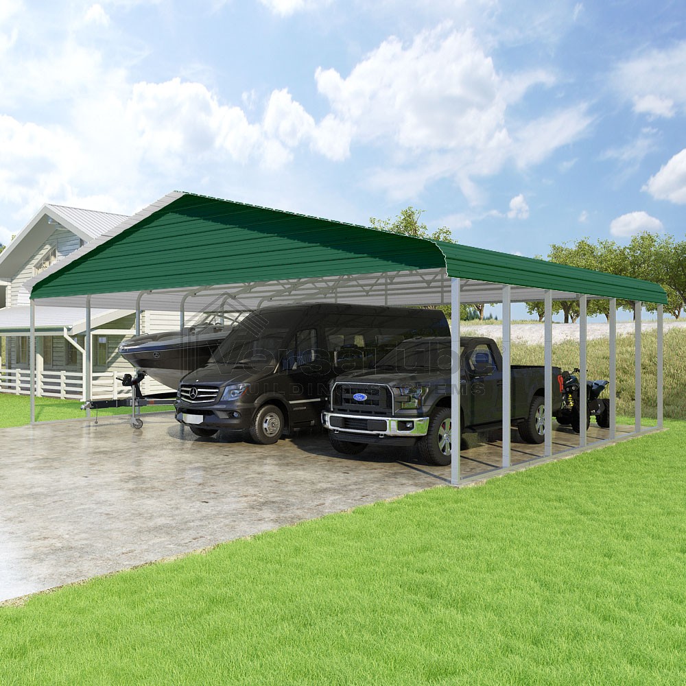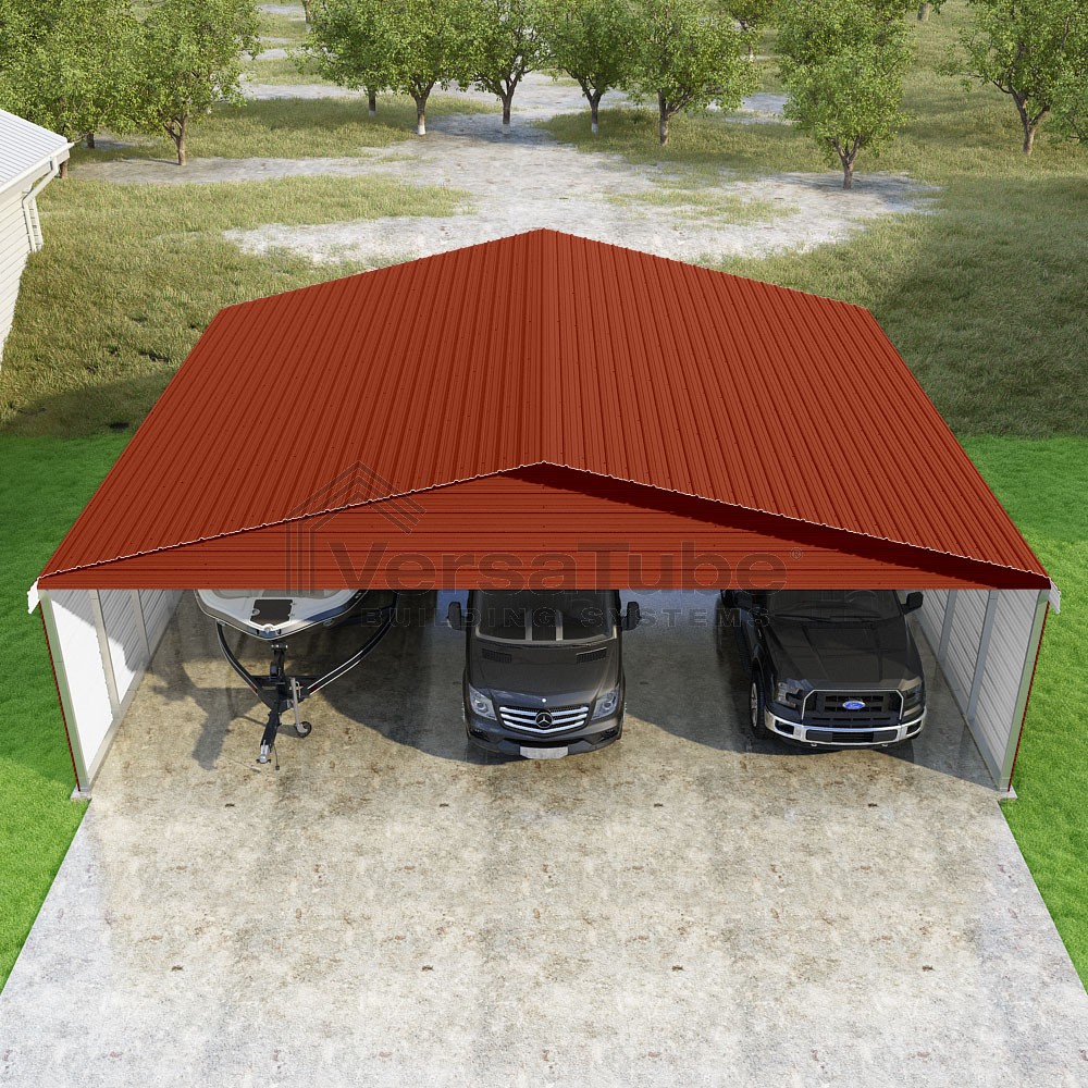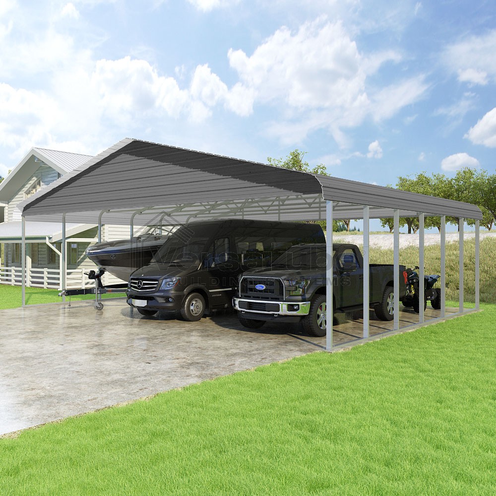 Classic Series DIY carport kit features horizontal application of sheet metal panels with the extra protection of rounded eaves.