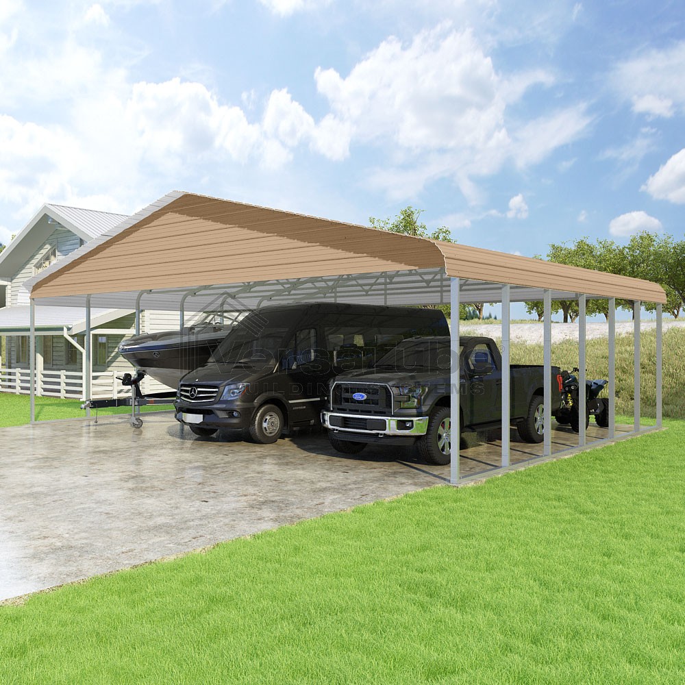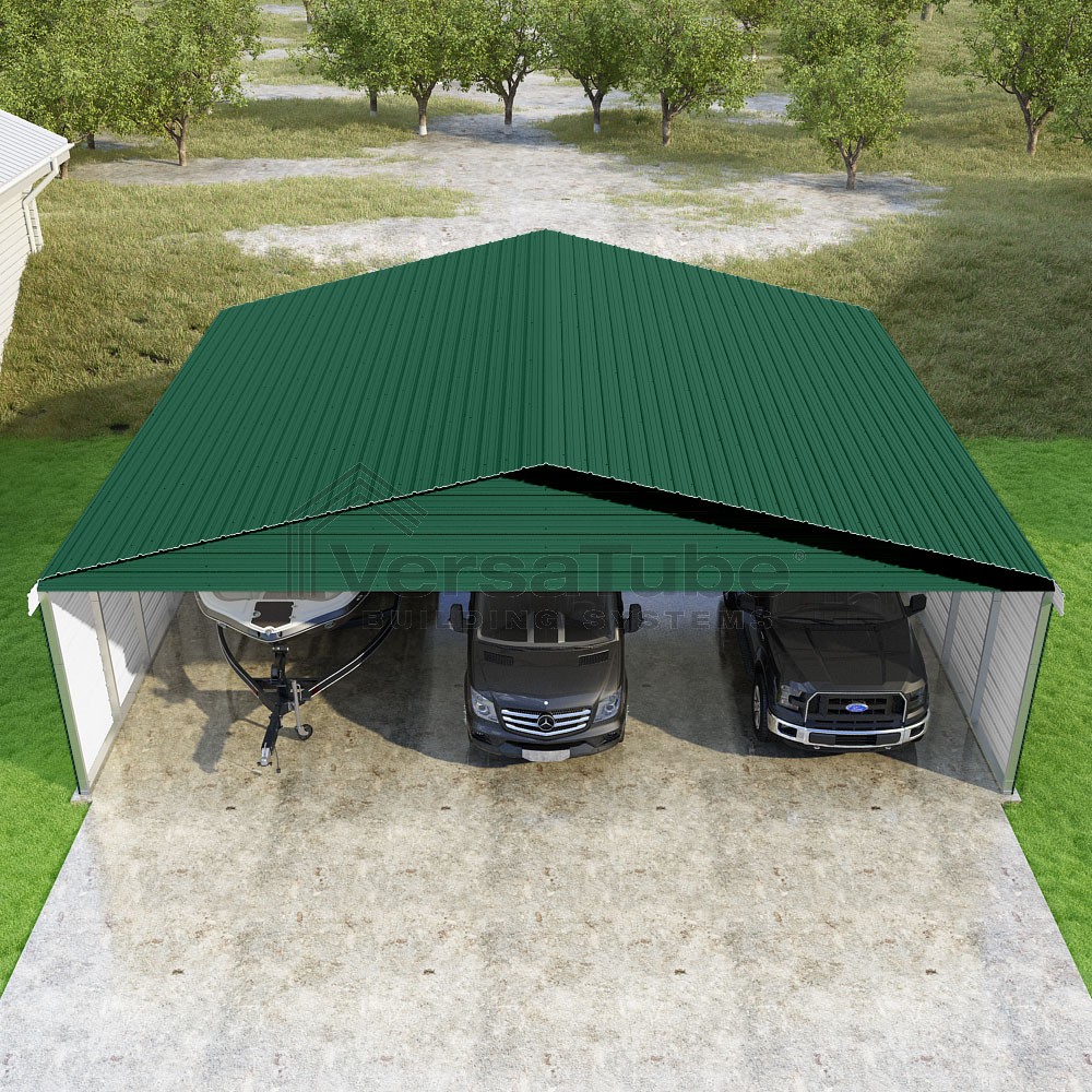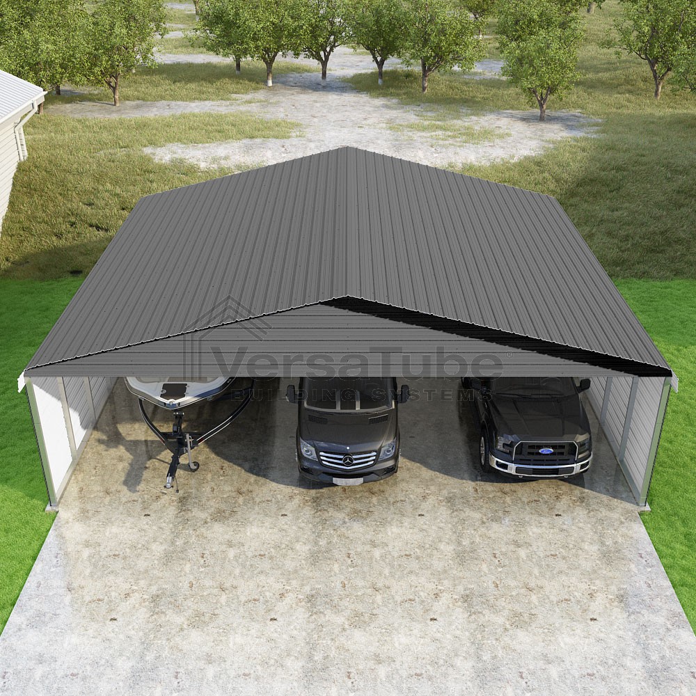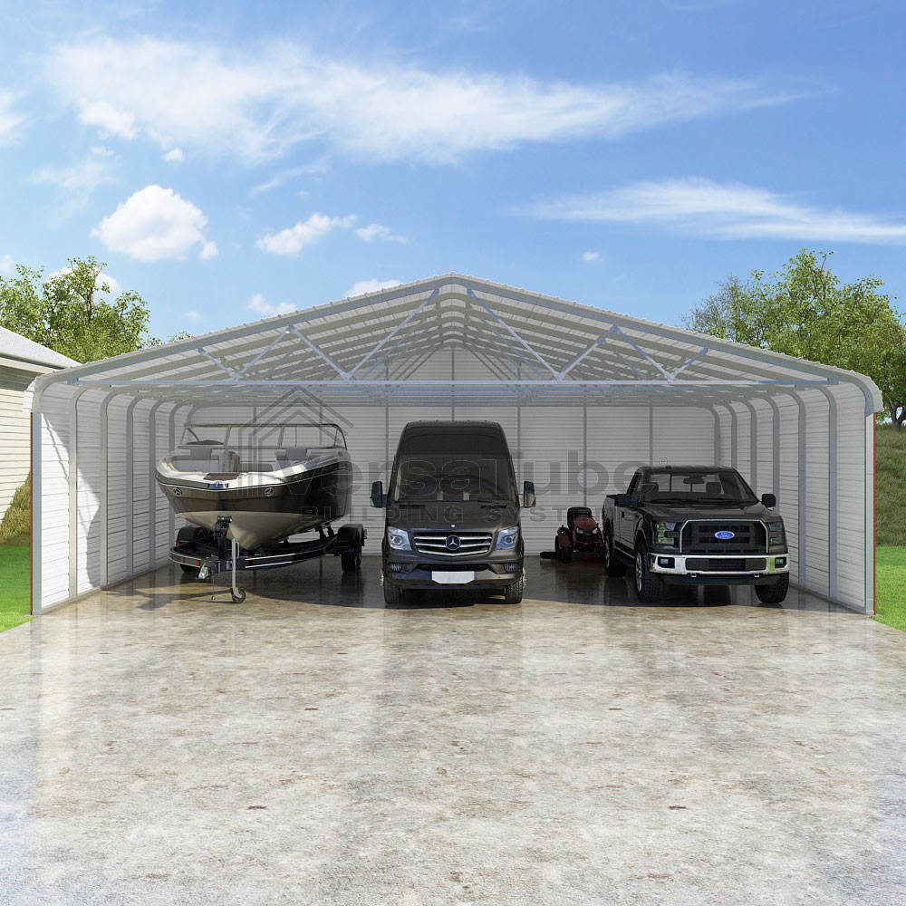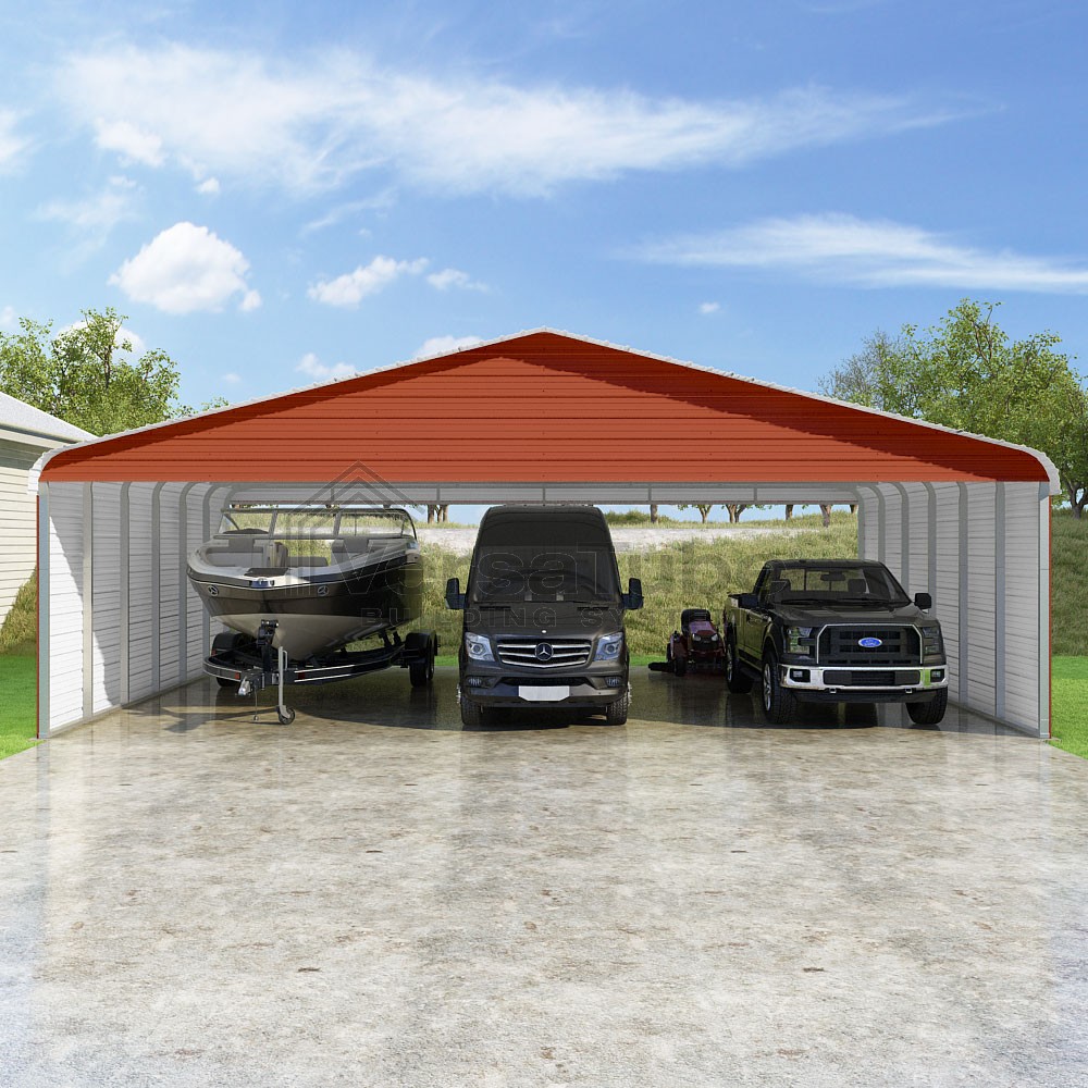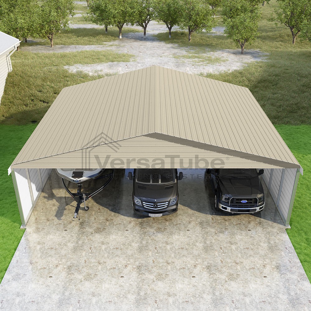 Classic Series DIY carport kit features horizontal application of sheet metal panels with the extra protection of rounded eaves.