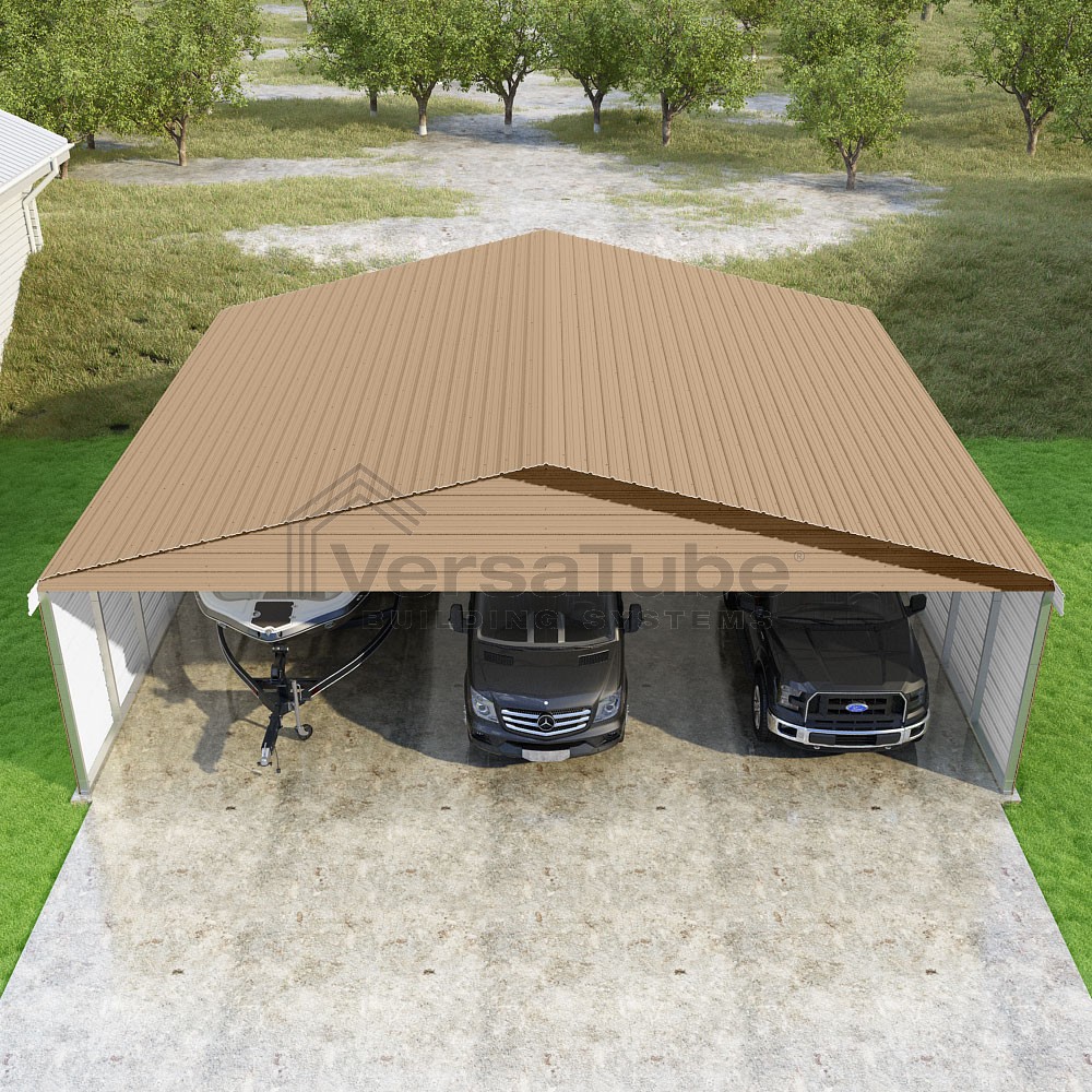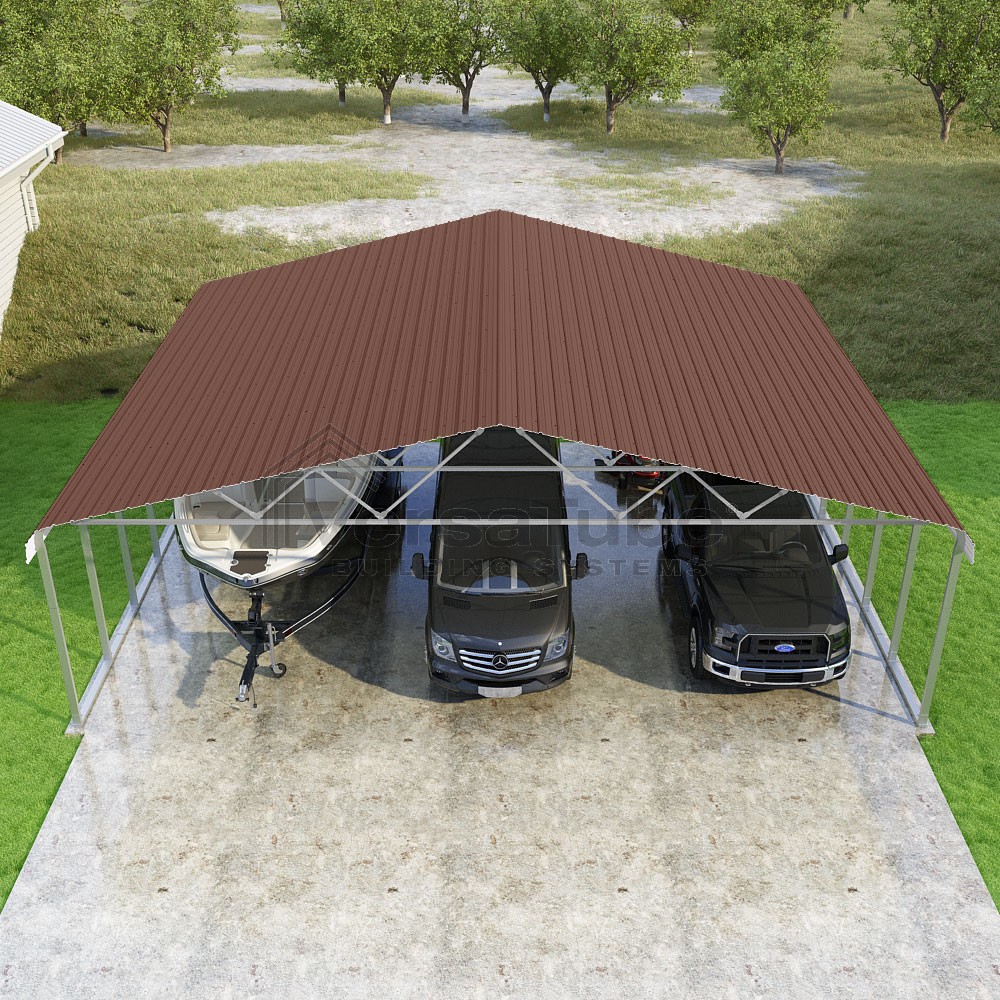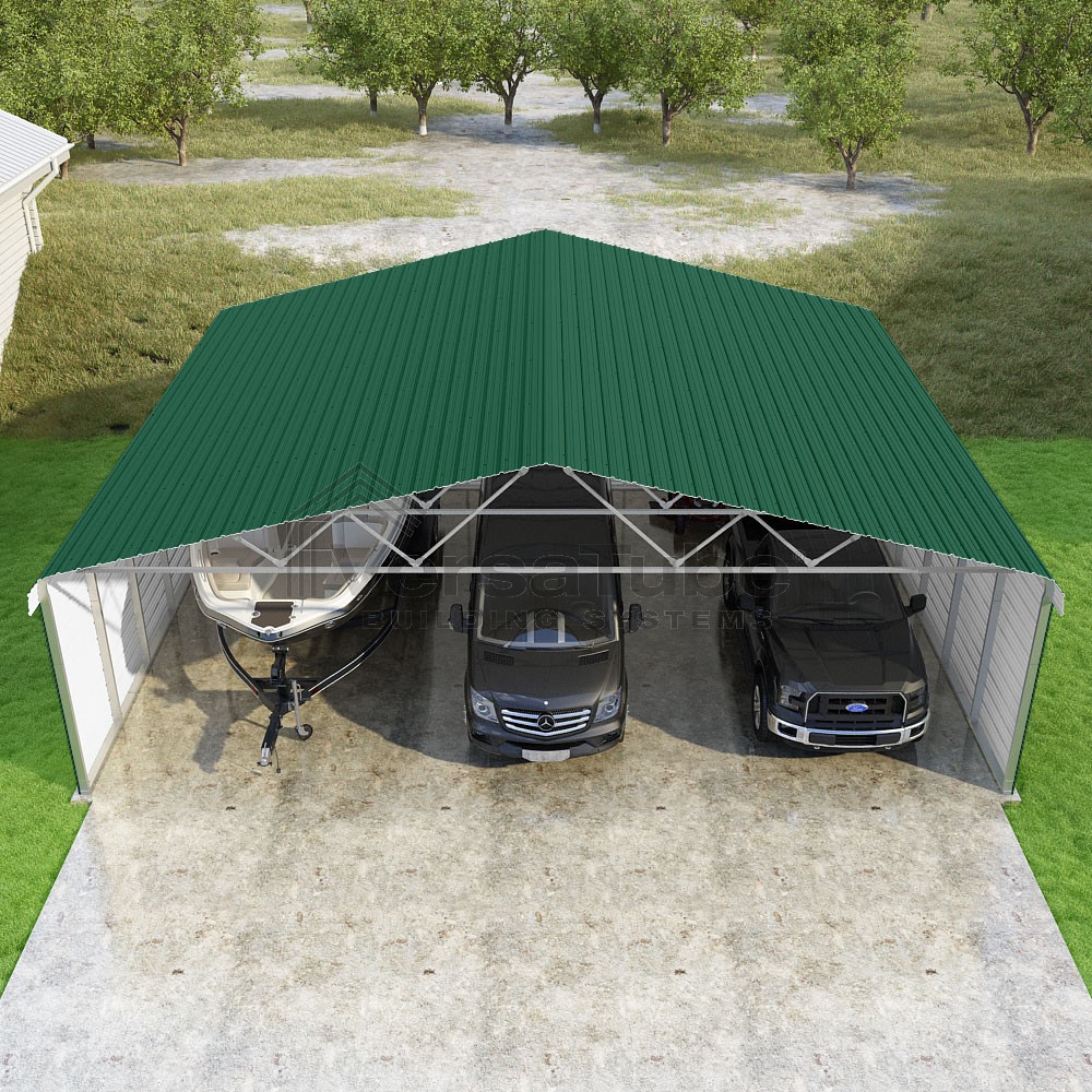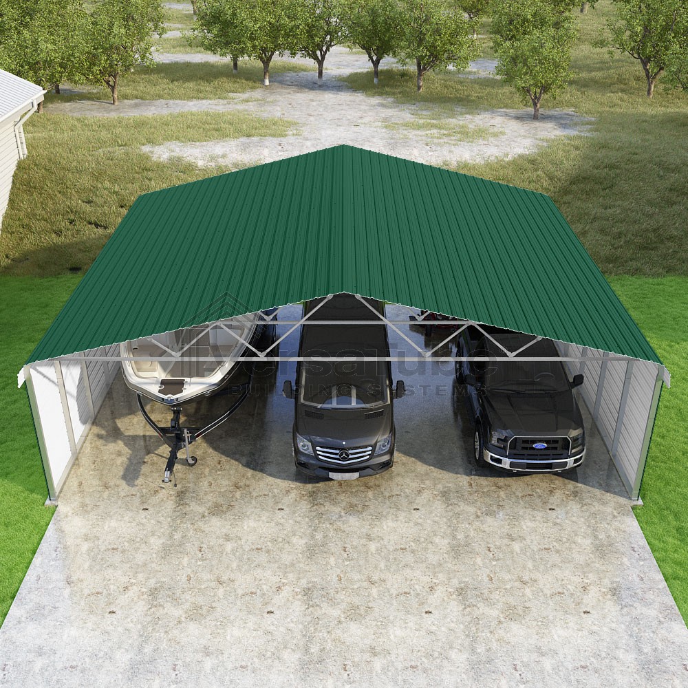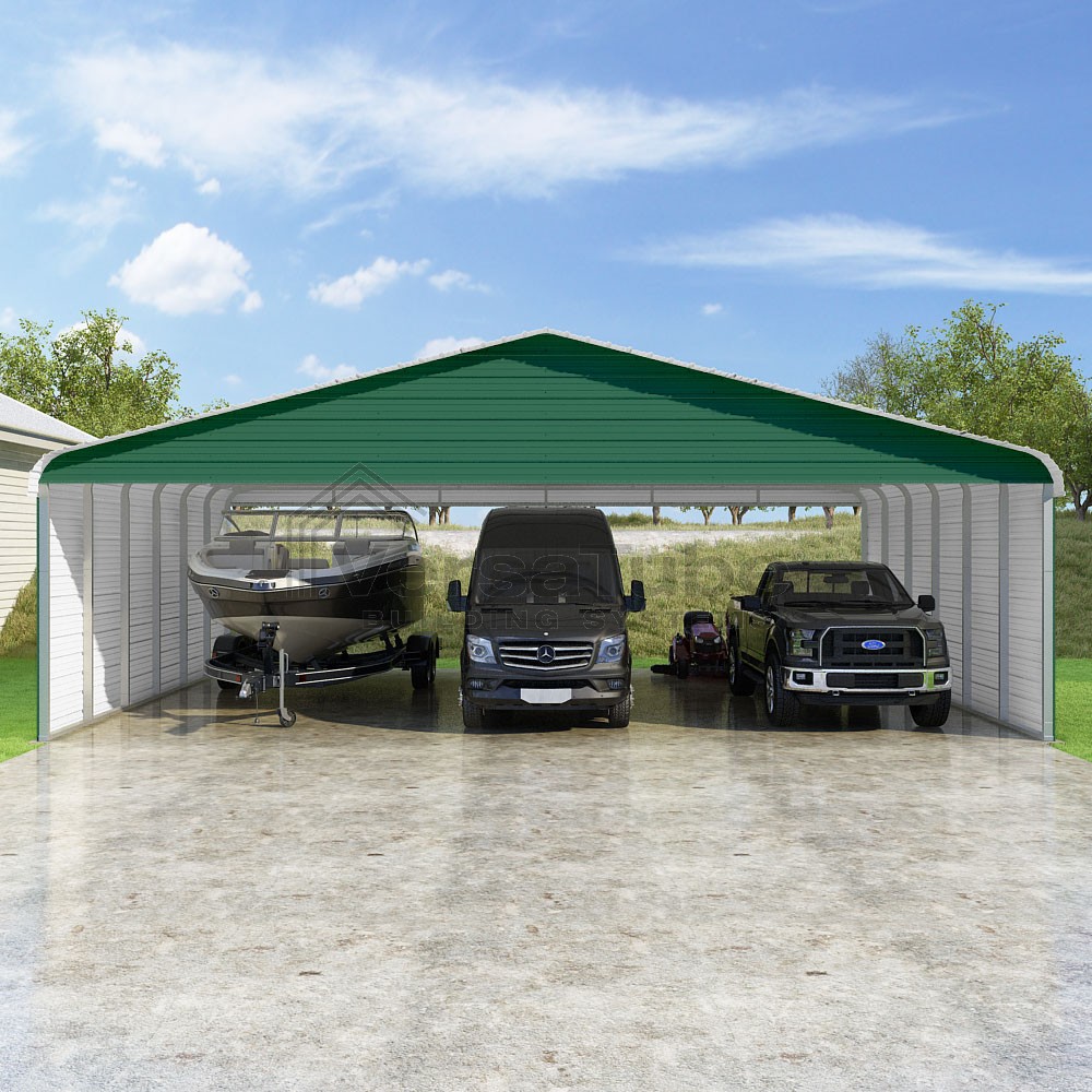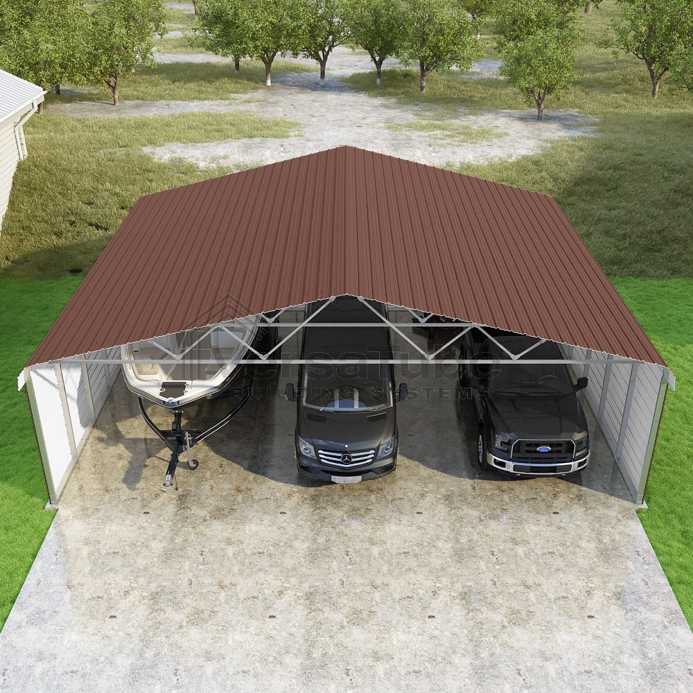 Classic Series DIY carport kit features horizontal application of sheet metal panels with the extra protection of rounded eaves.