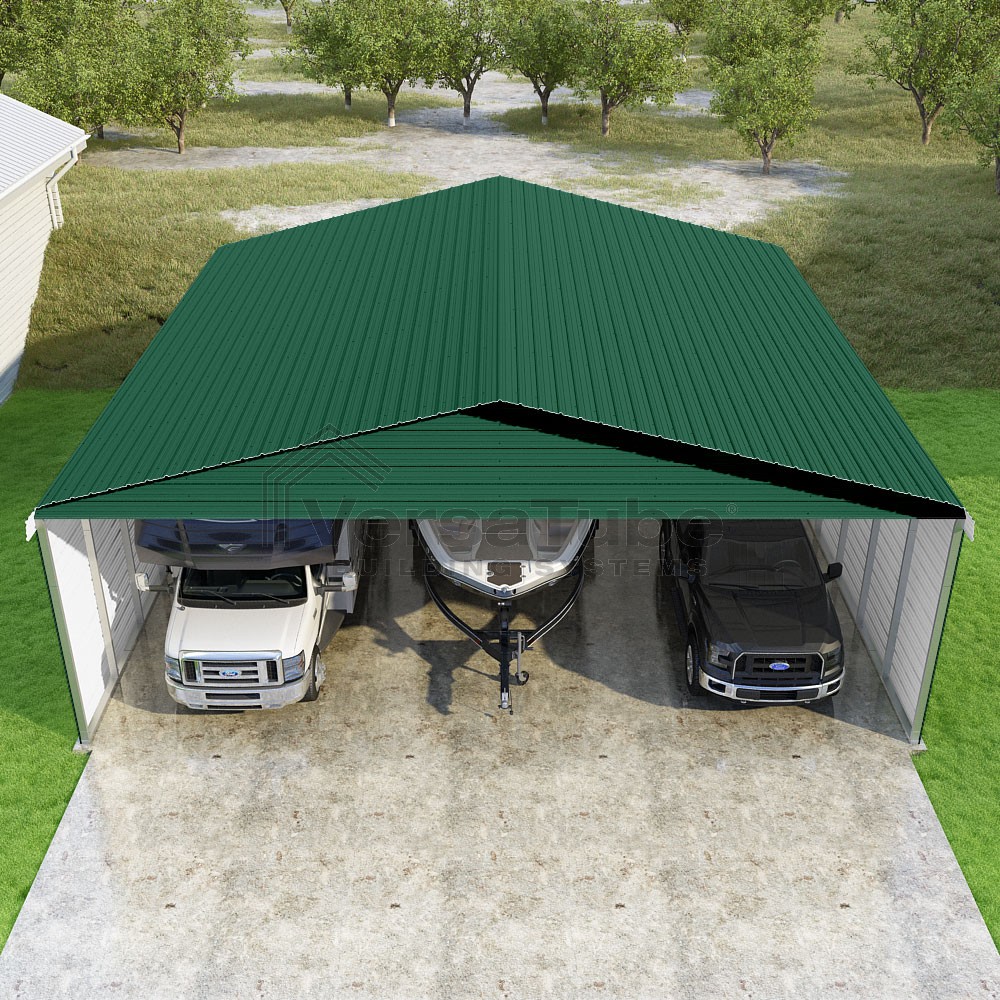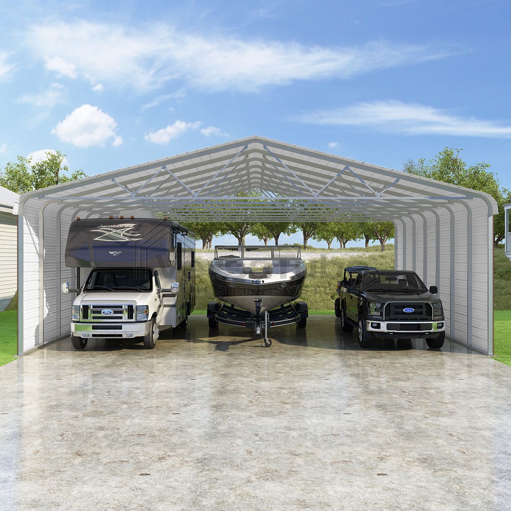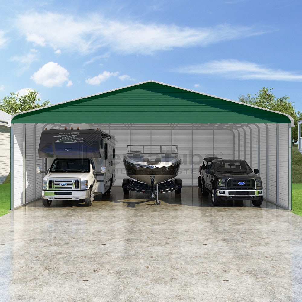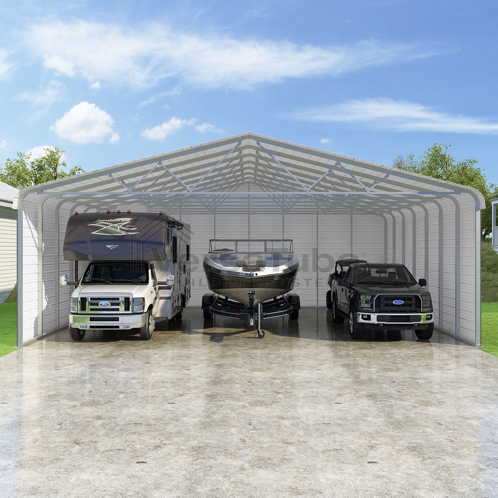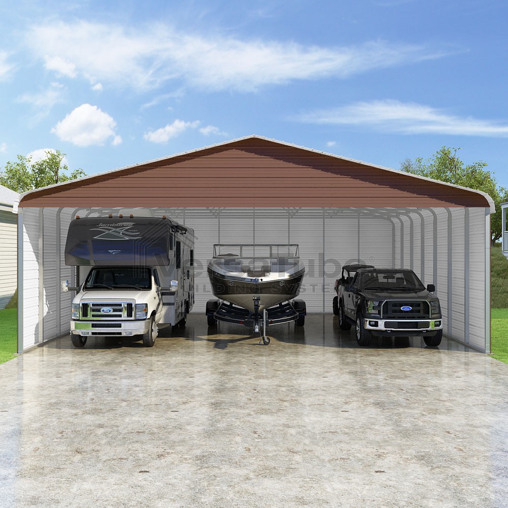 Classic Series DIY carport kit features horizontal application of sheet metal panels with the extra protection of rounded eaves.