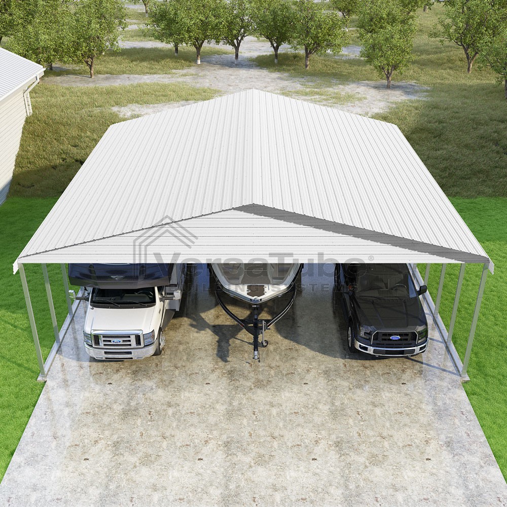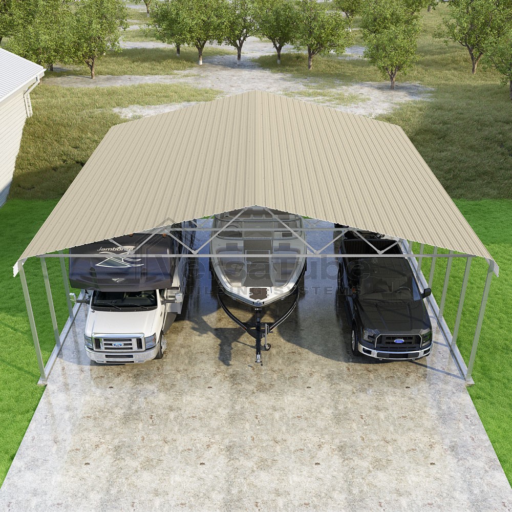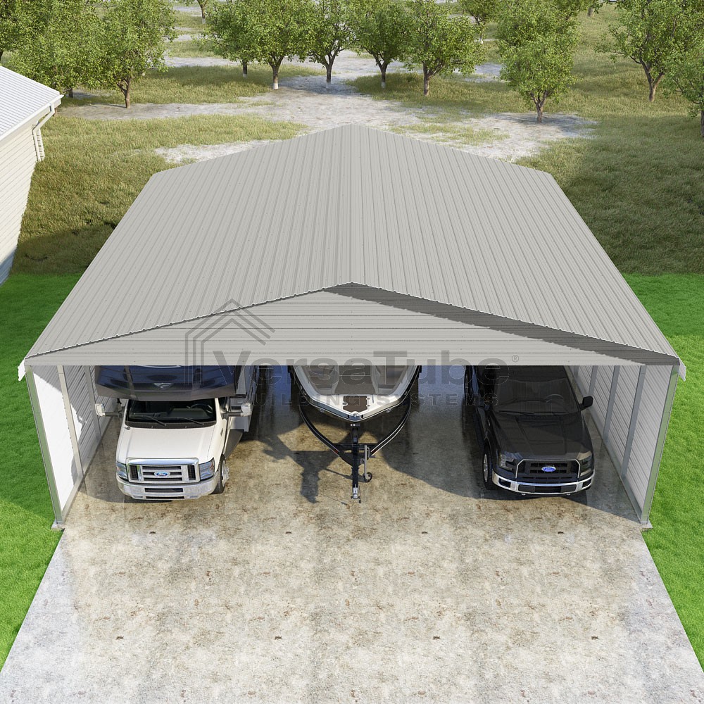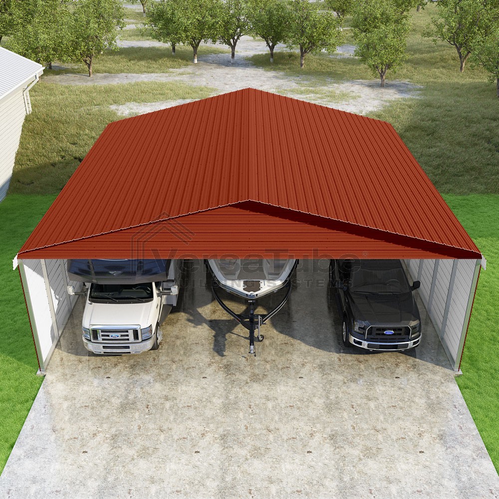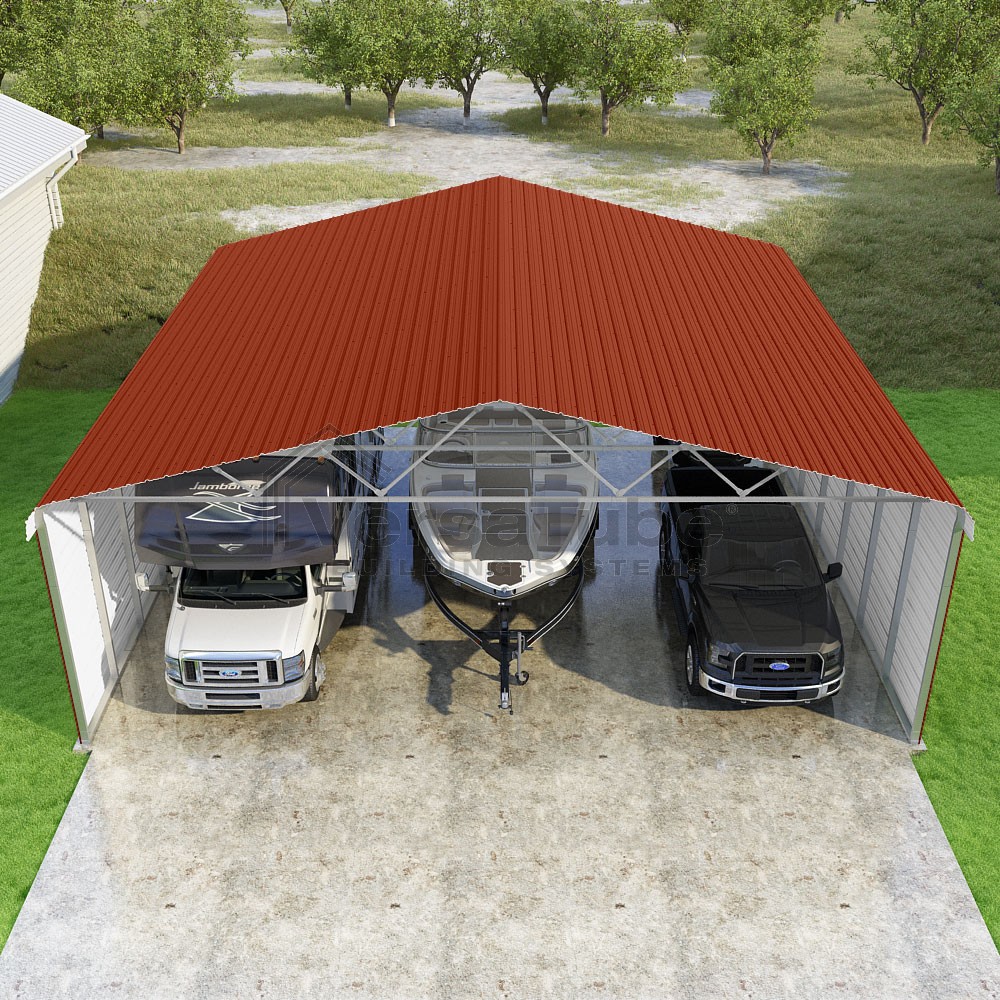 Classic Series DIY carport kit features horizontal application of sheet metal panels with the extra protection of rounded eaves.