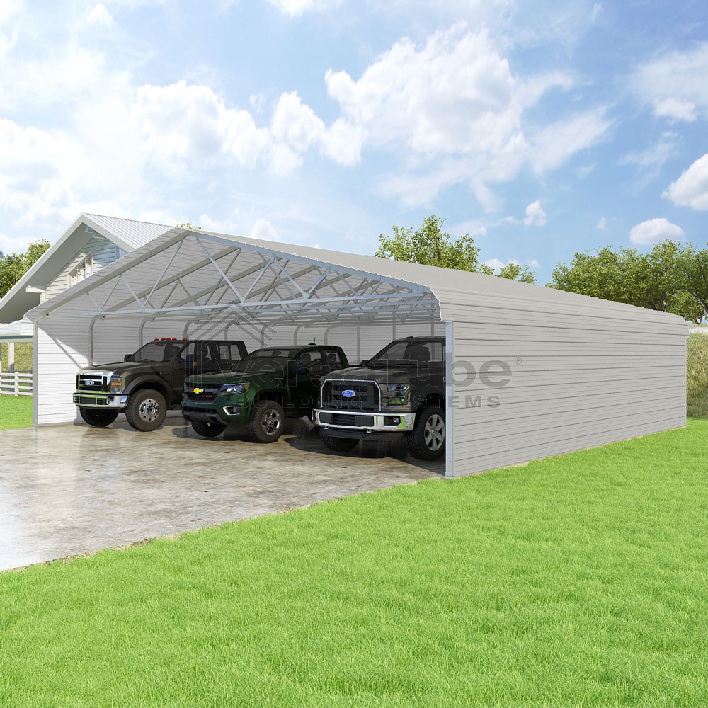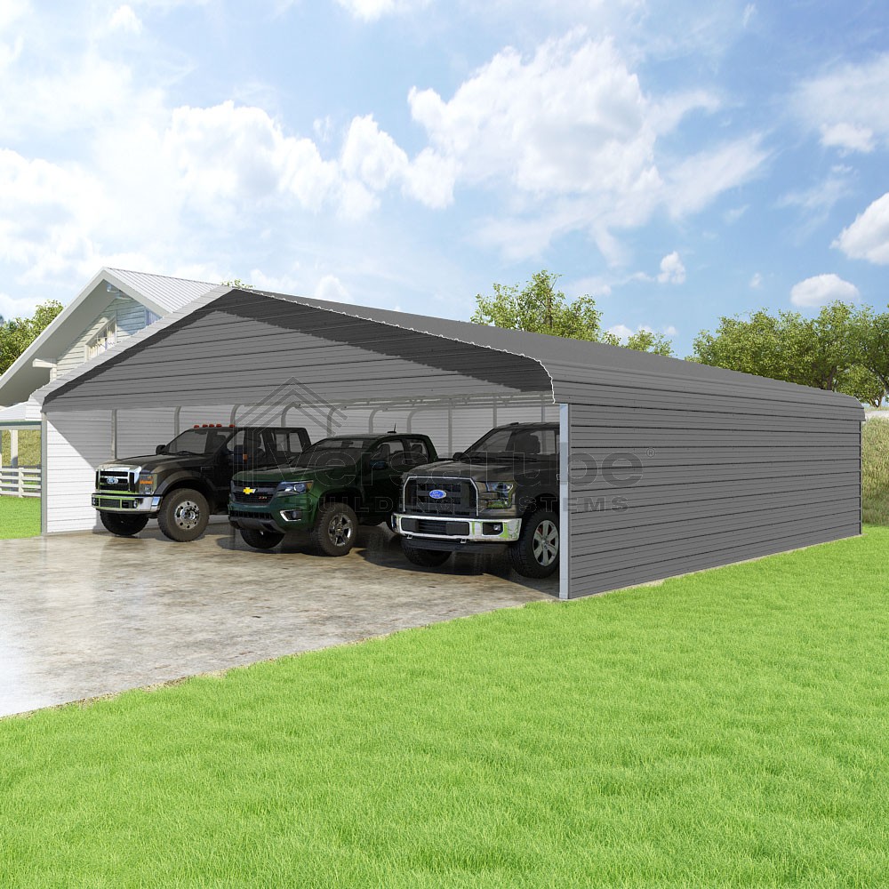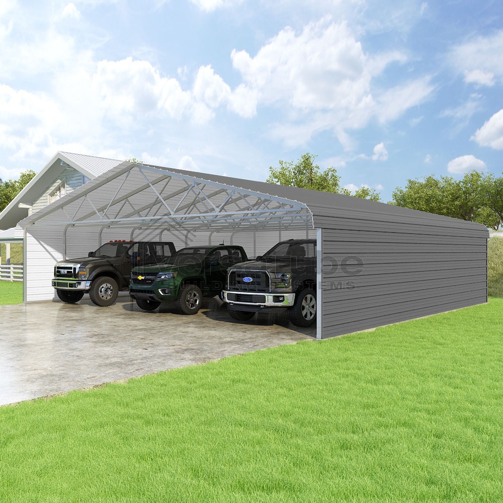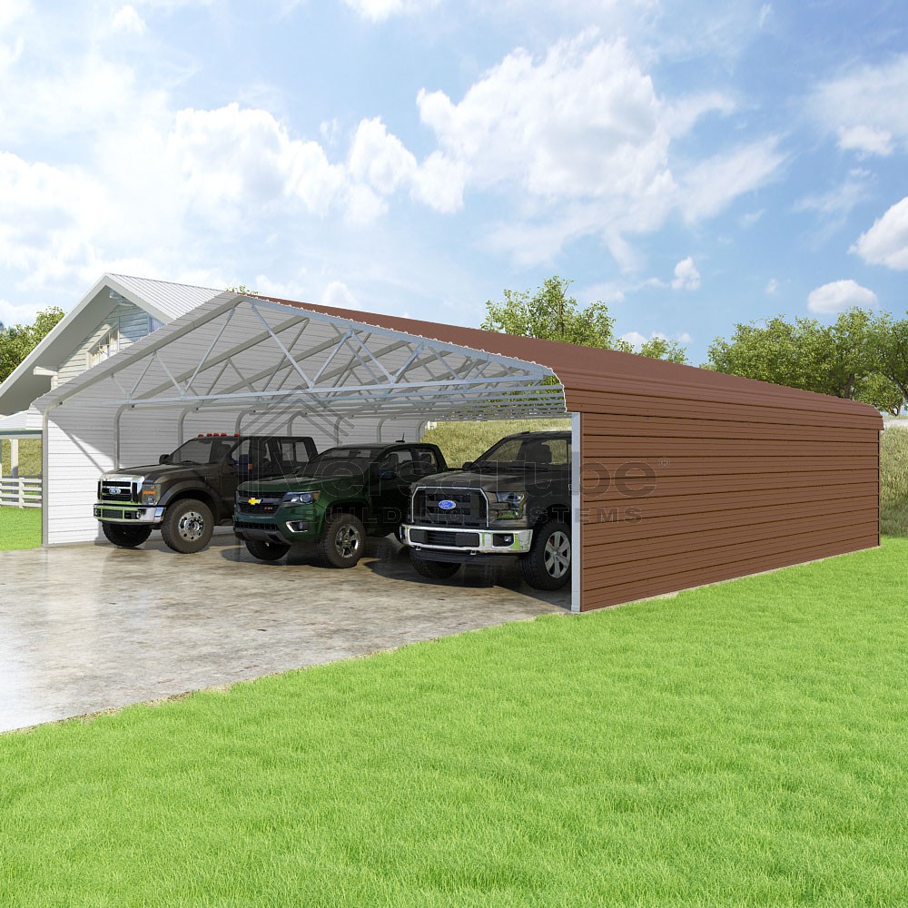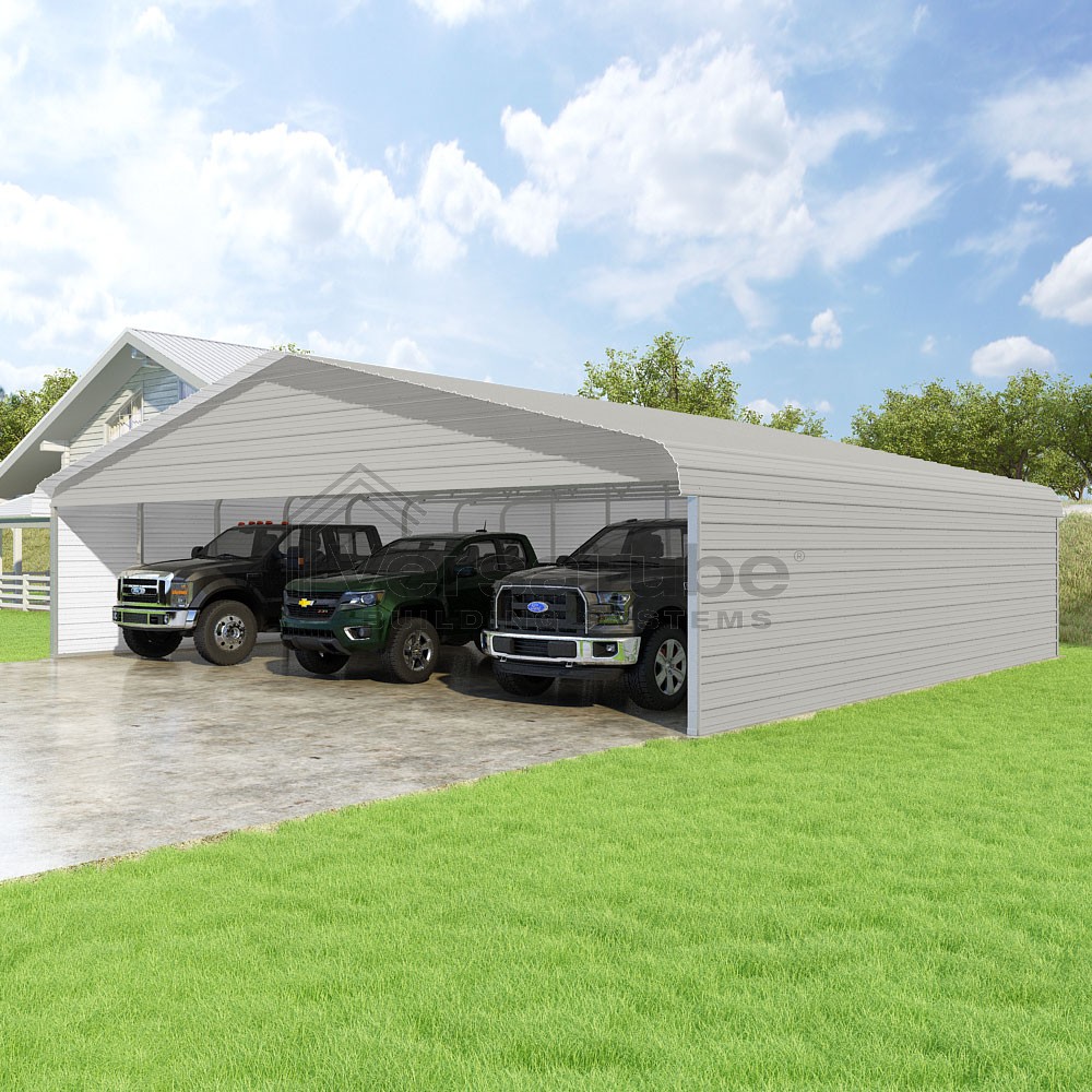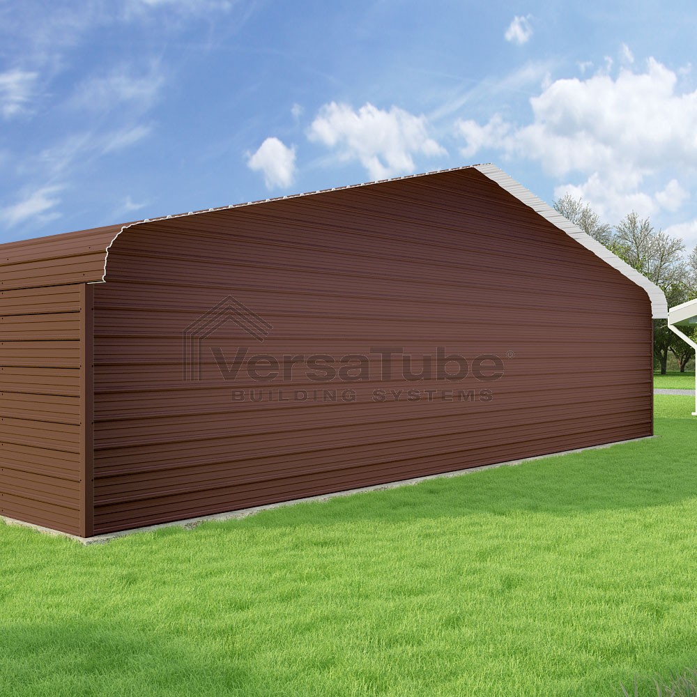 Classic Series DIY carport kit features horizontal application of sheet metal panels with the extra protection of rounded eaves.