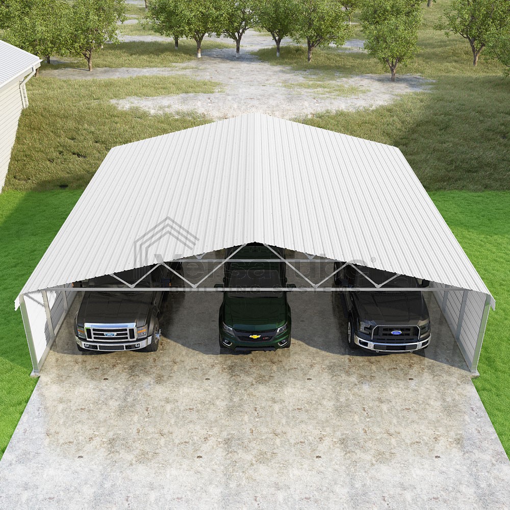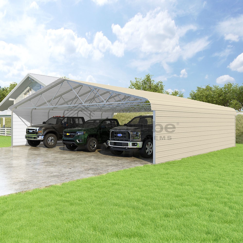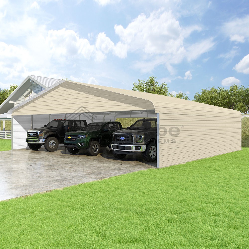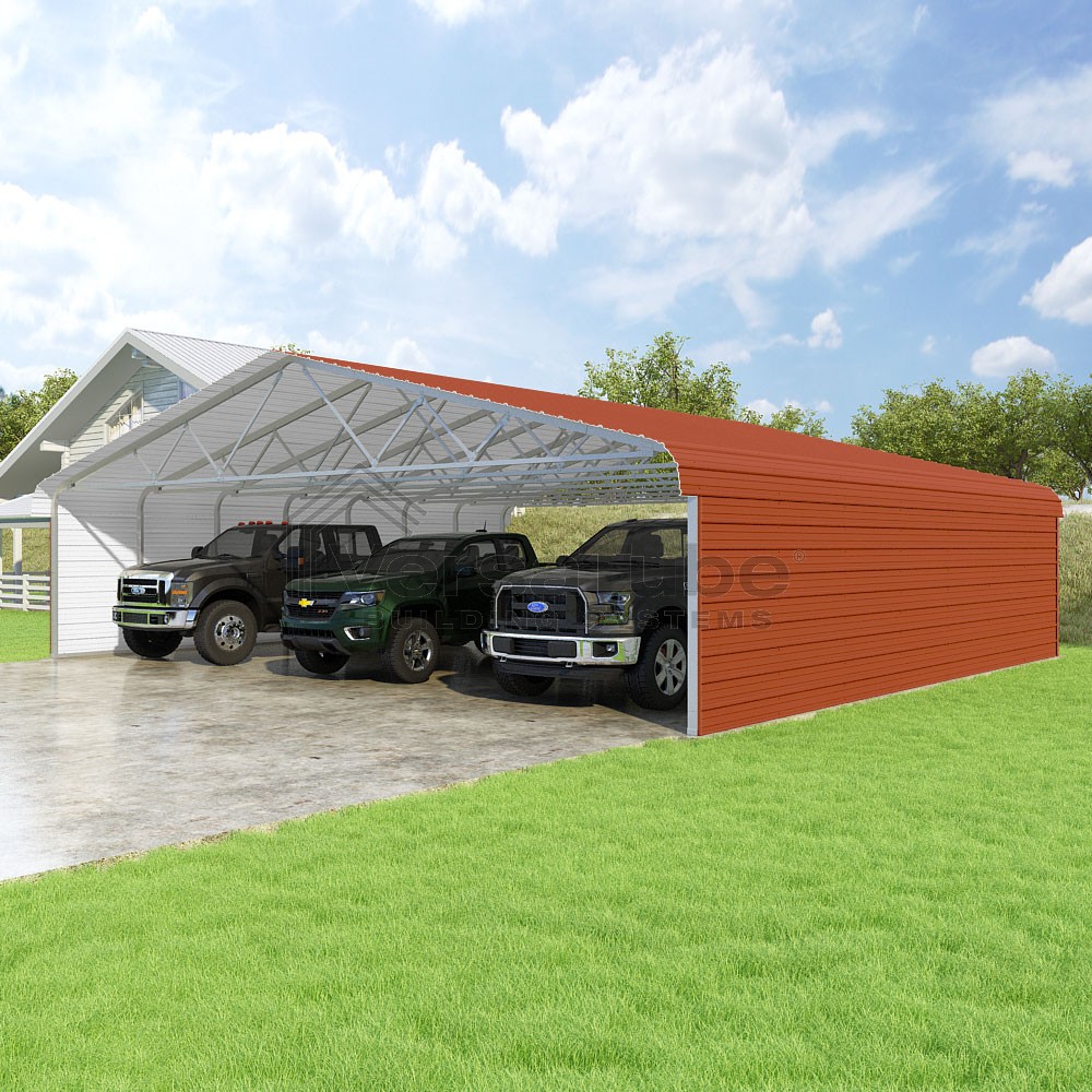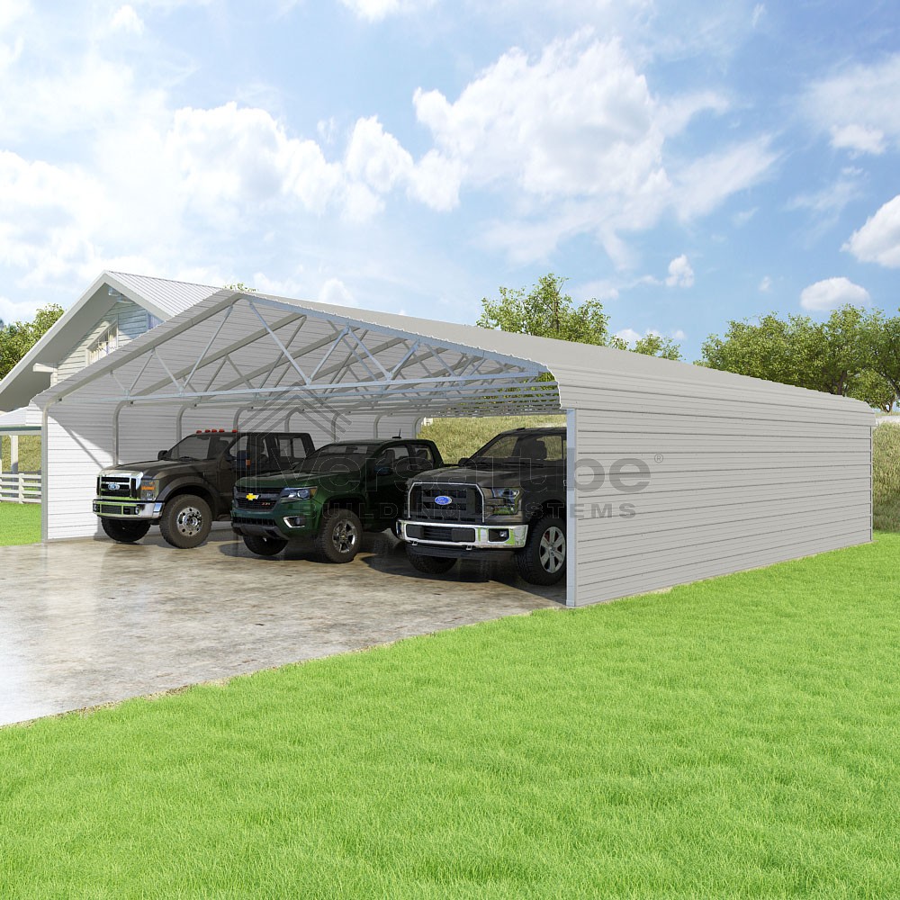 Classic Series DIY carport kit features horizontal application of sheet metal panels with the extra protection of rounded eaves.