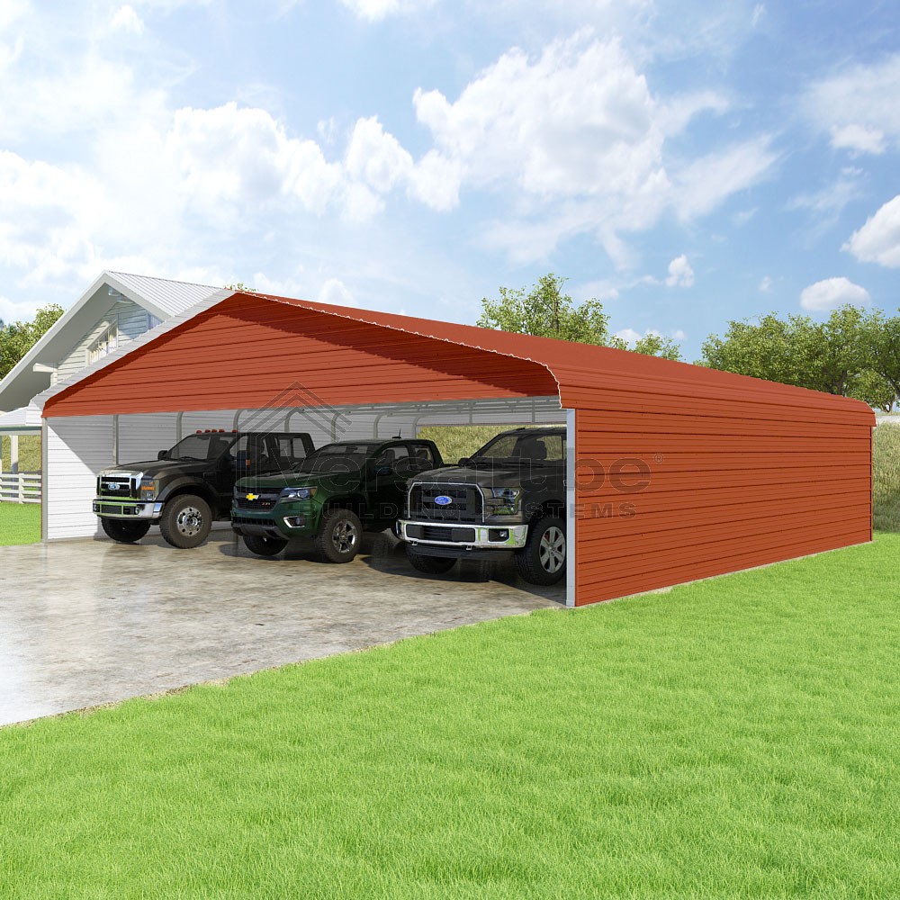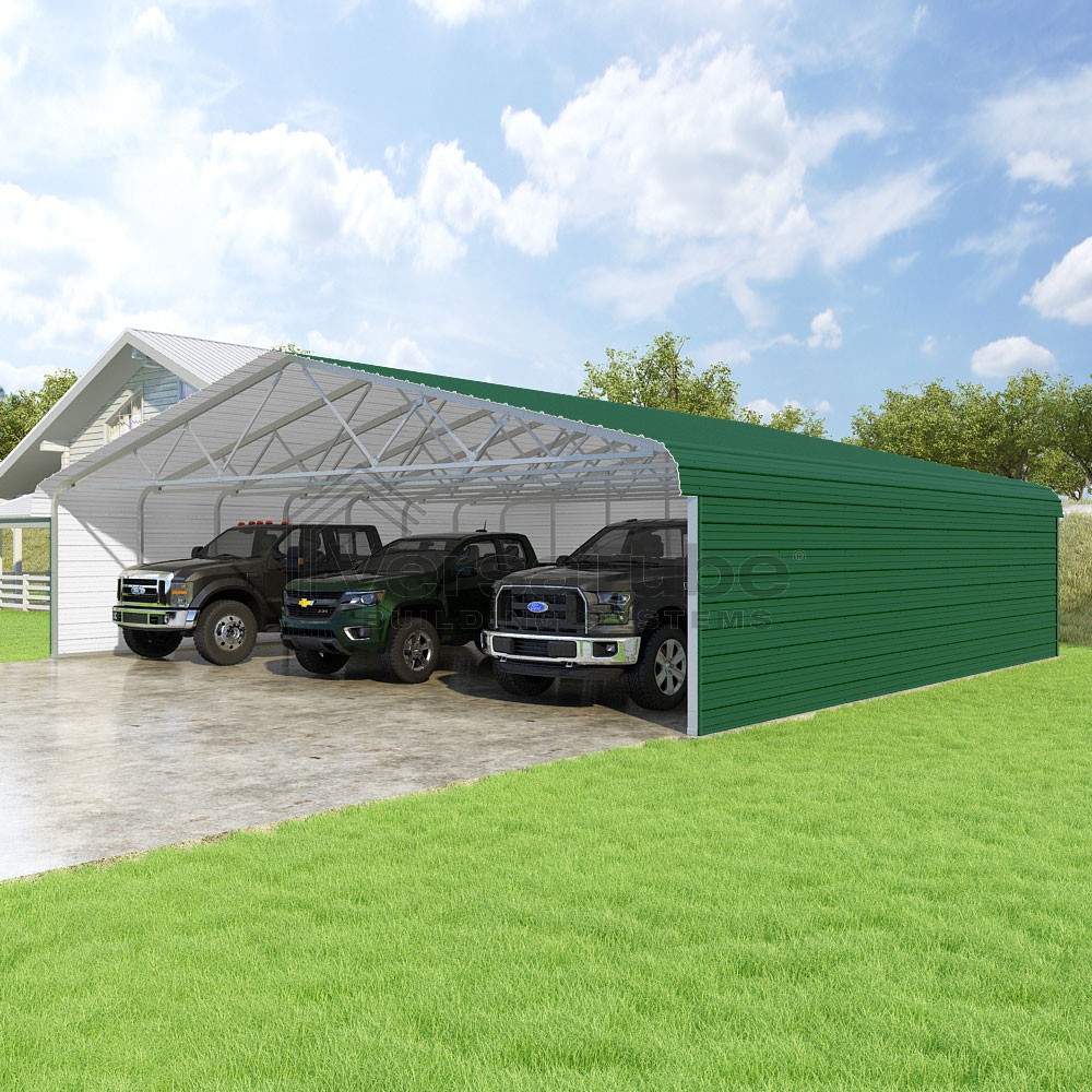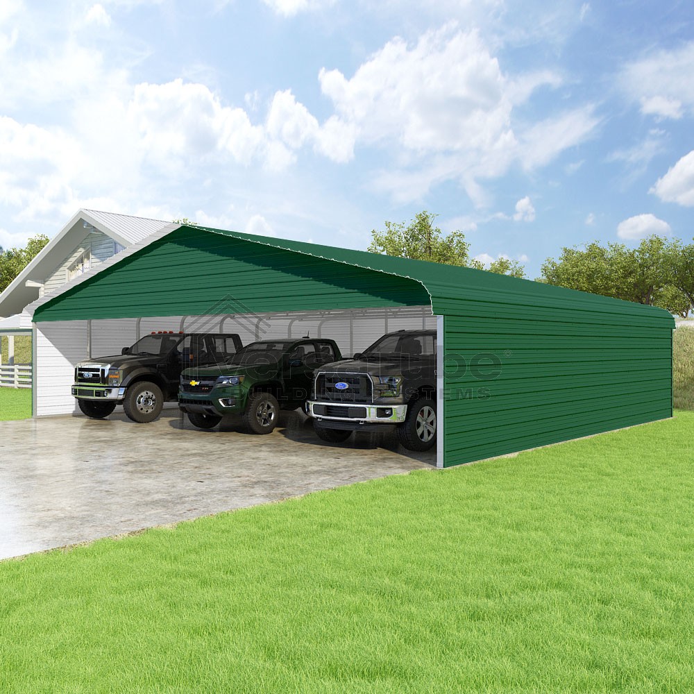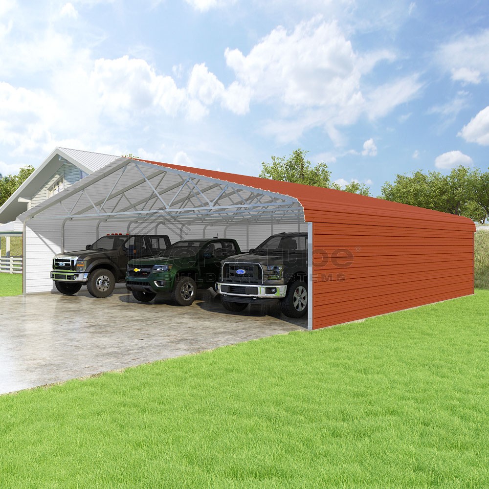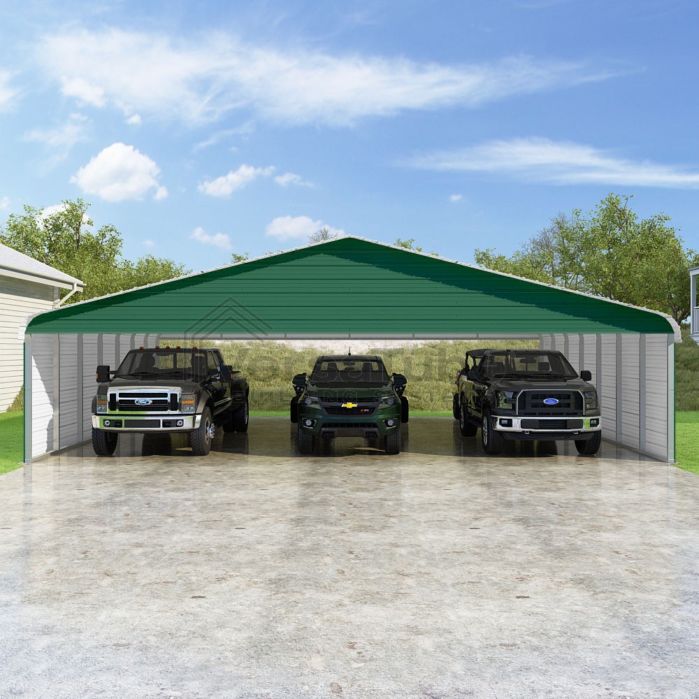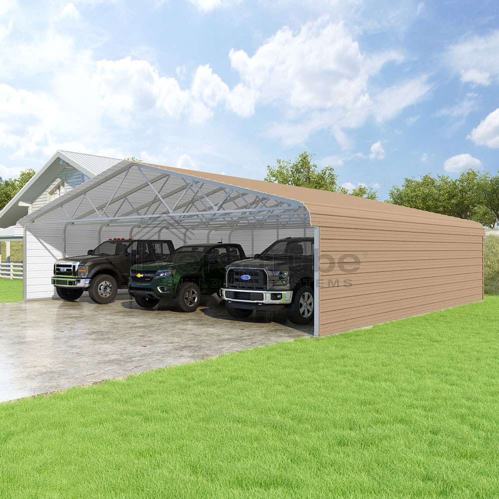 Classic Series DIY carport kit features horizontal application of sheet metal panels with the extra protection of rounded eaves.
