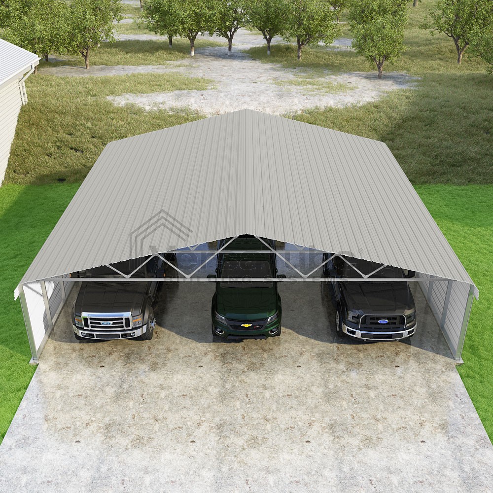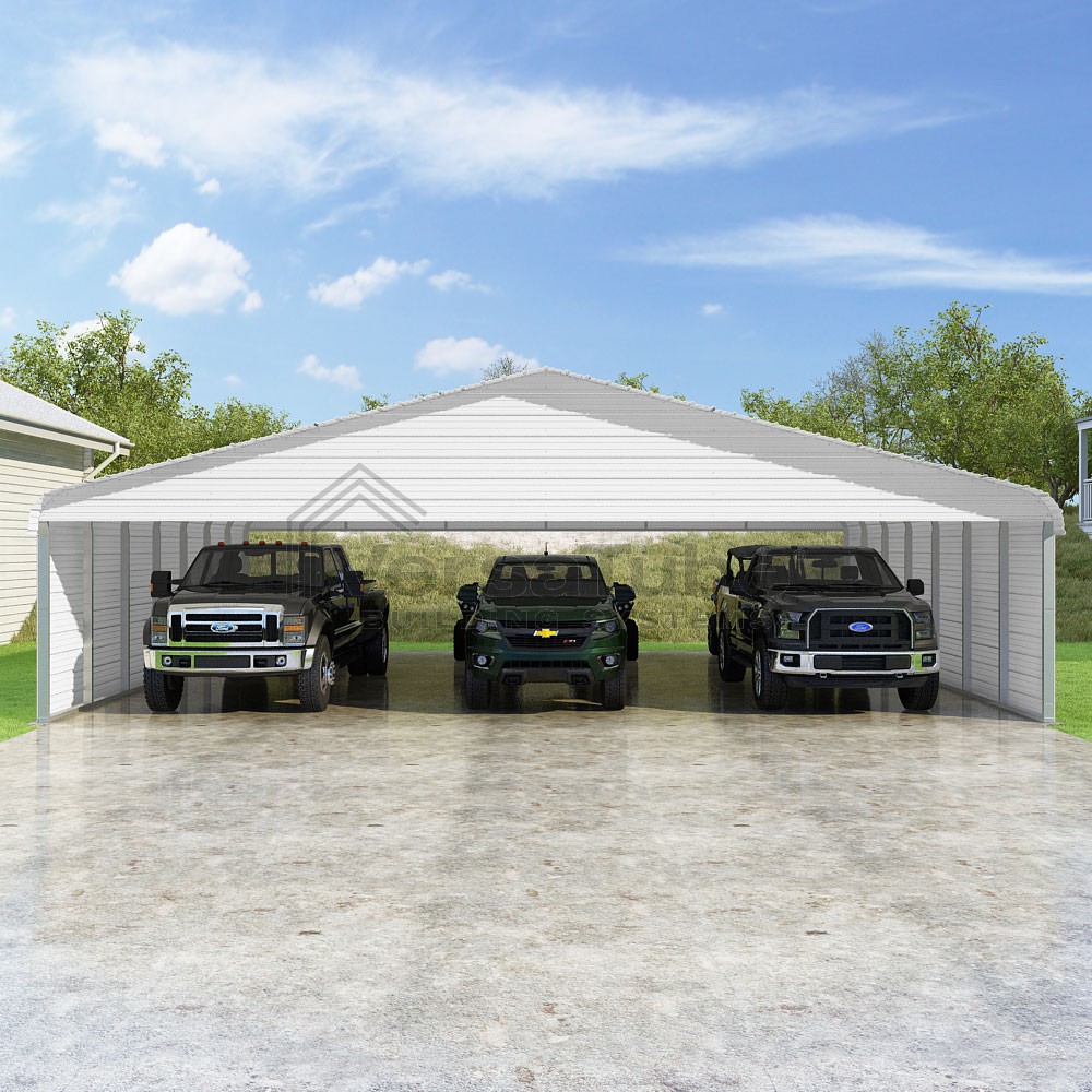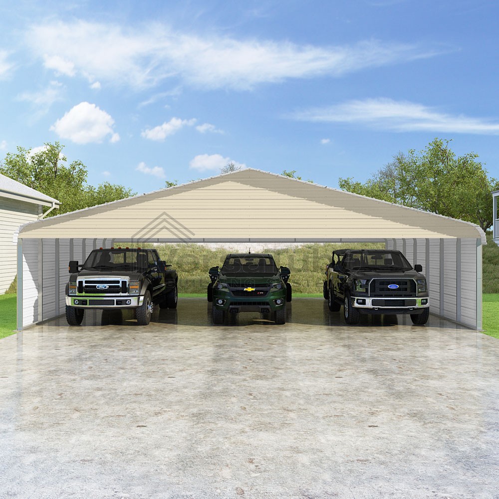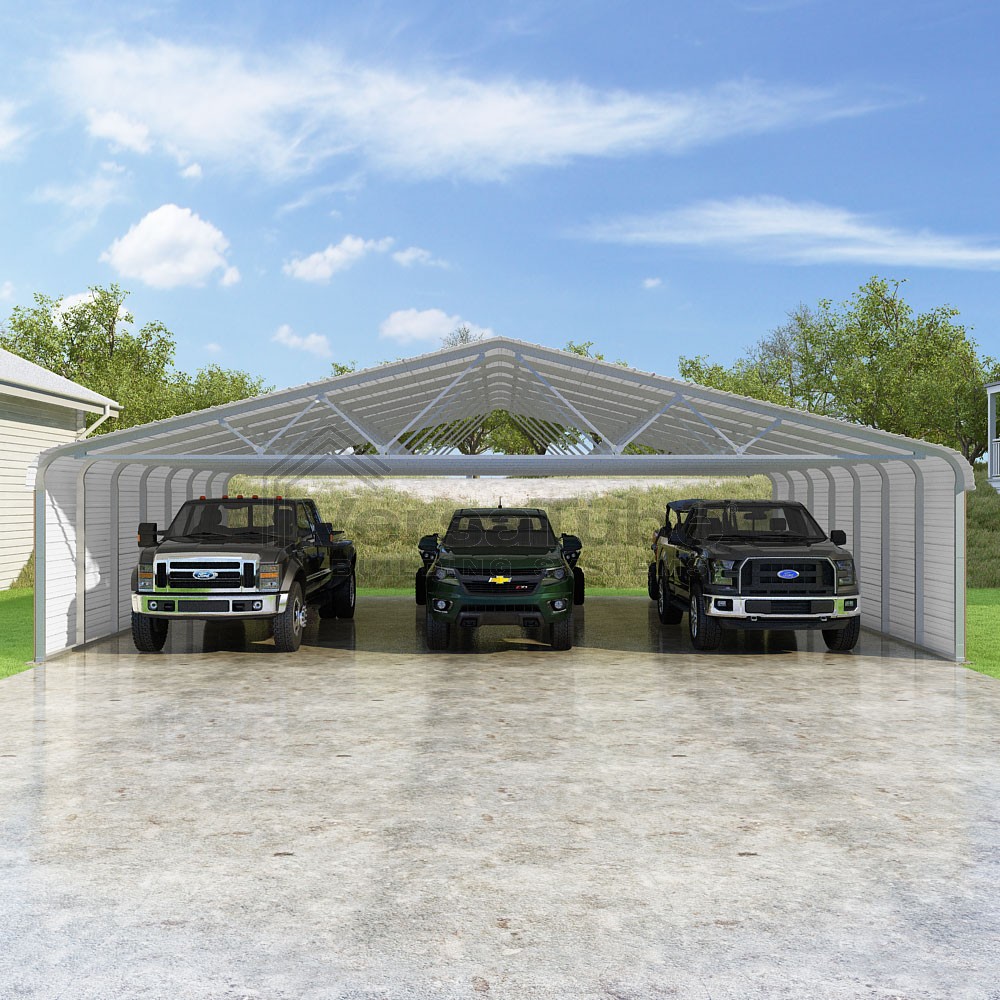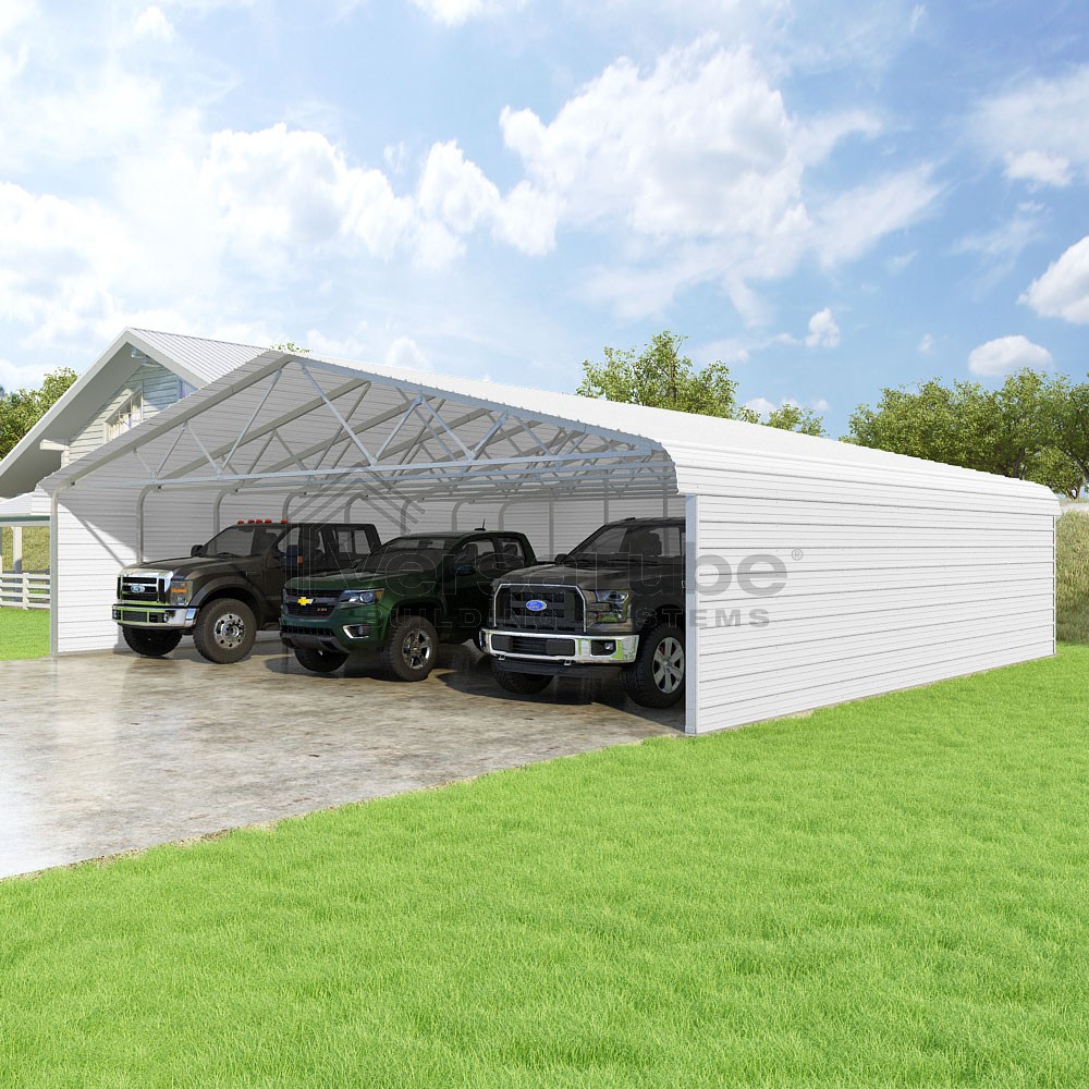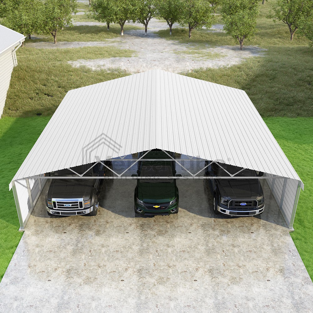 Classic Series DIY carport kit features horizontal application of sheet metal panels with the extra protection of rounded eaves.
