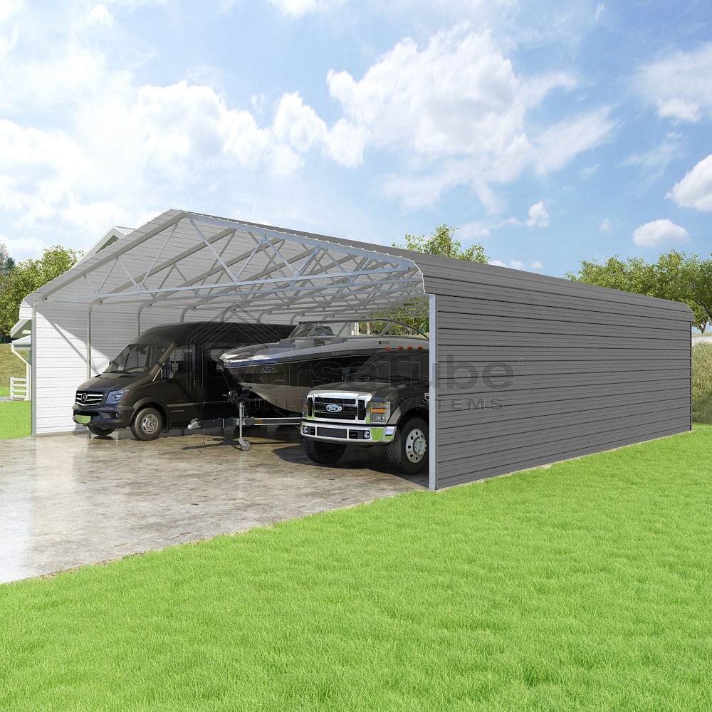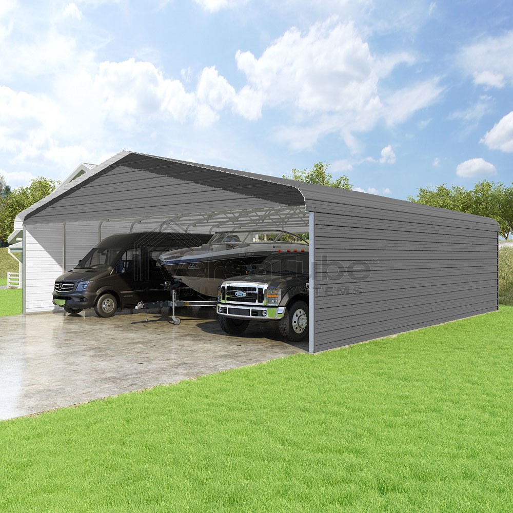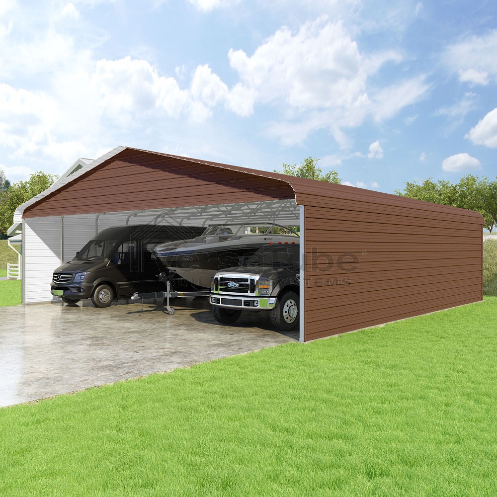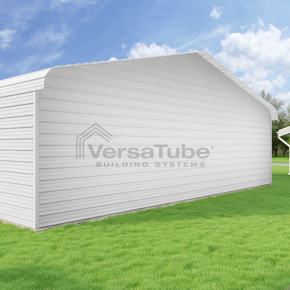Classic Series DIY carport kit features horizontal application of sheet metal panels with the extra protection of rounded eaves.