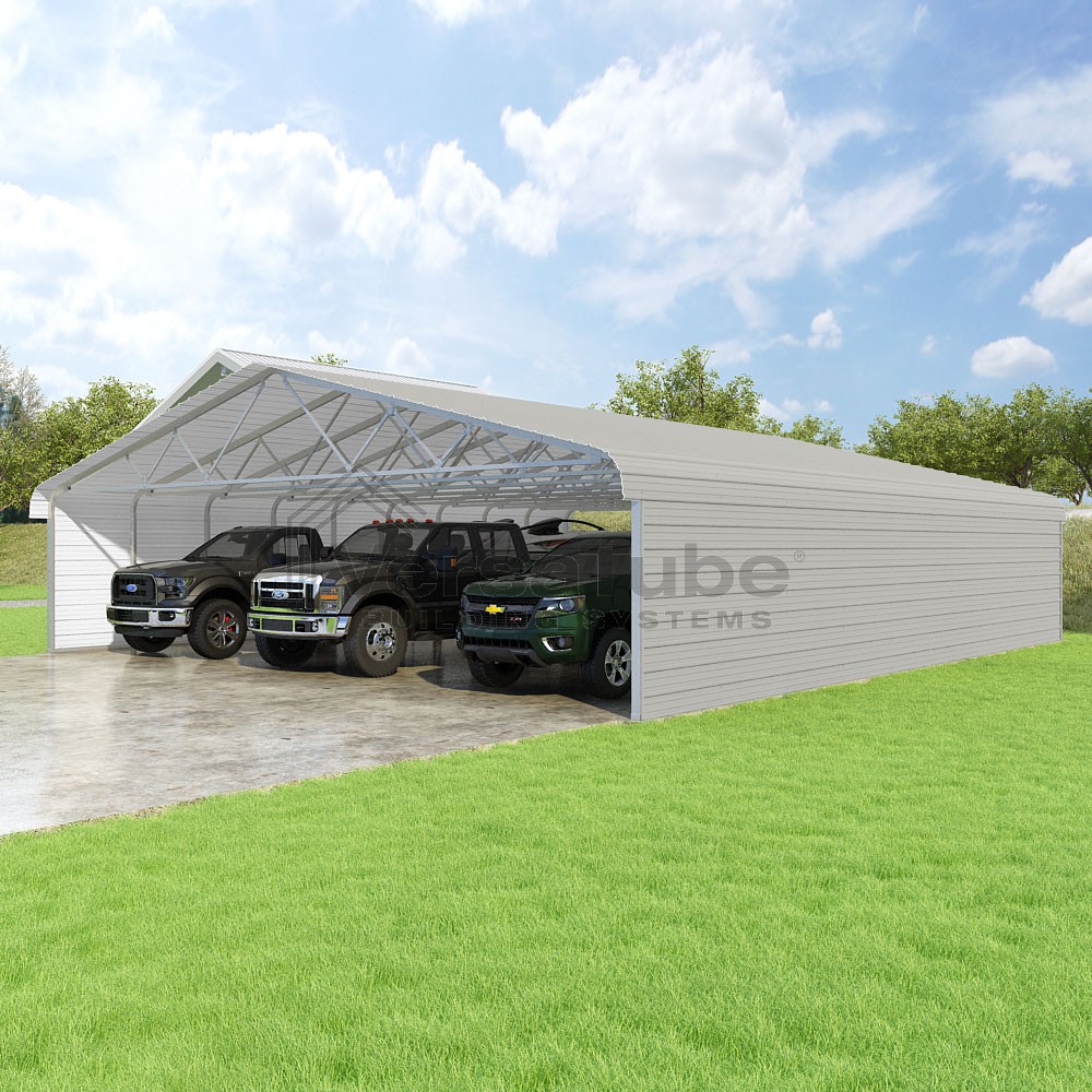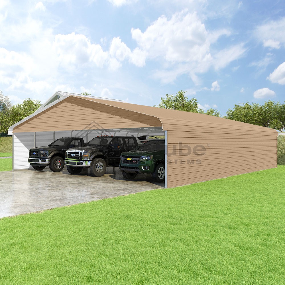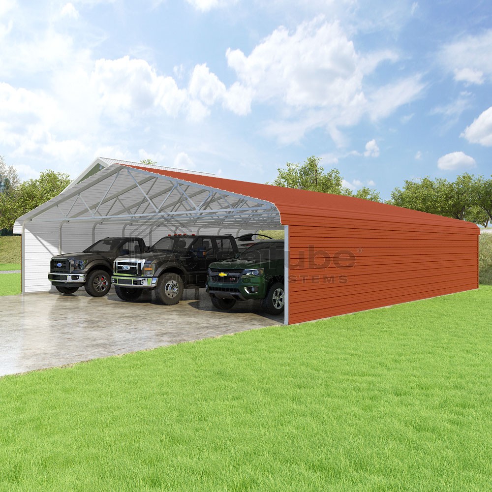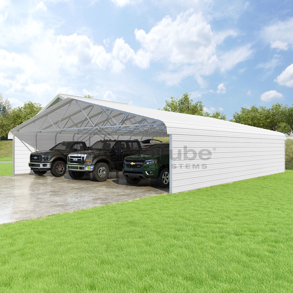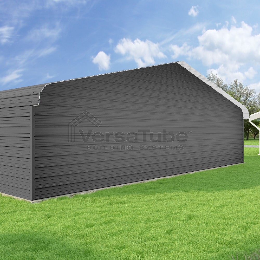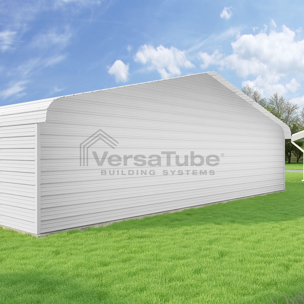 Classic Series DIY carport kit features horizontal application of sheet metal panels with the extra protection of rounded eaves.