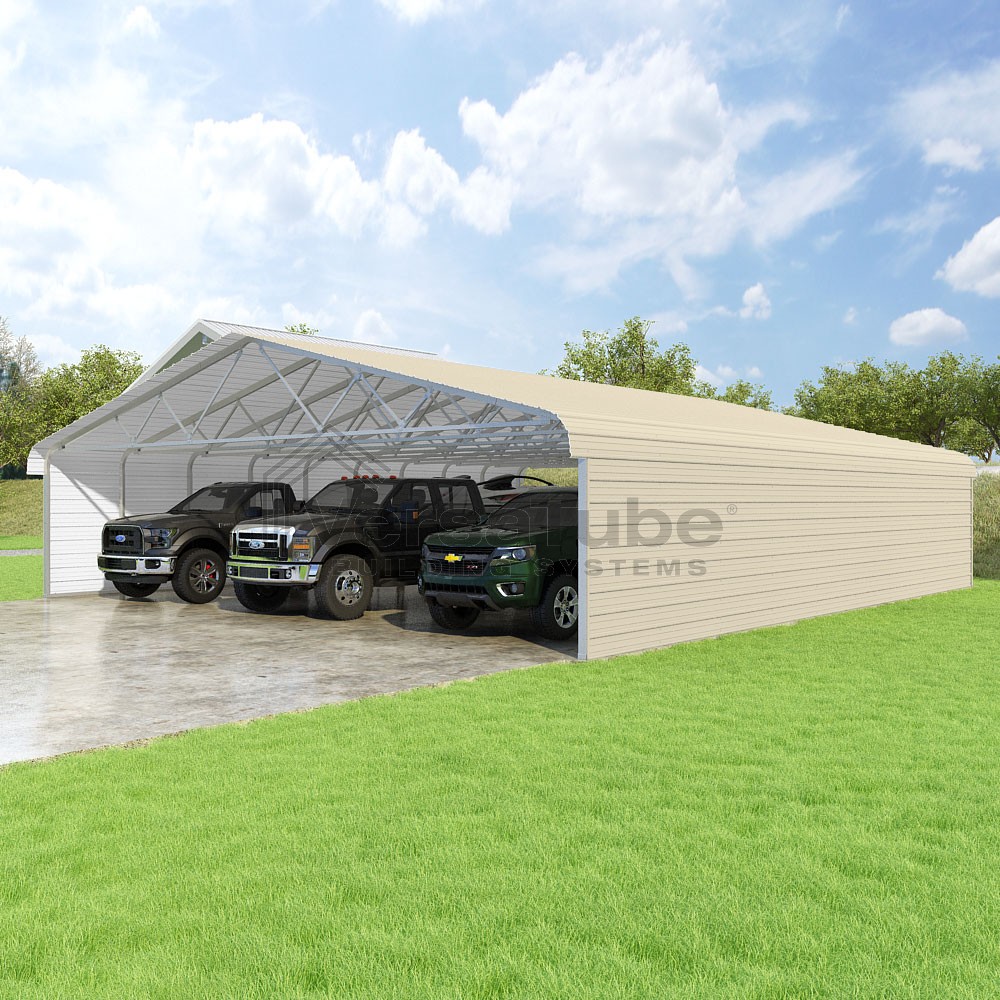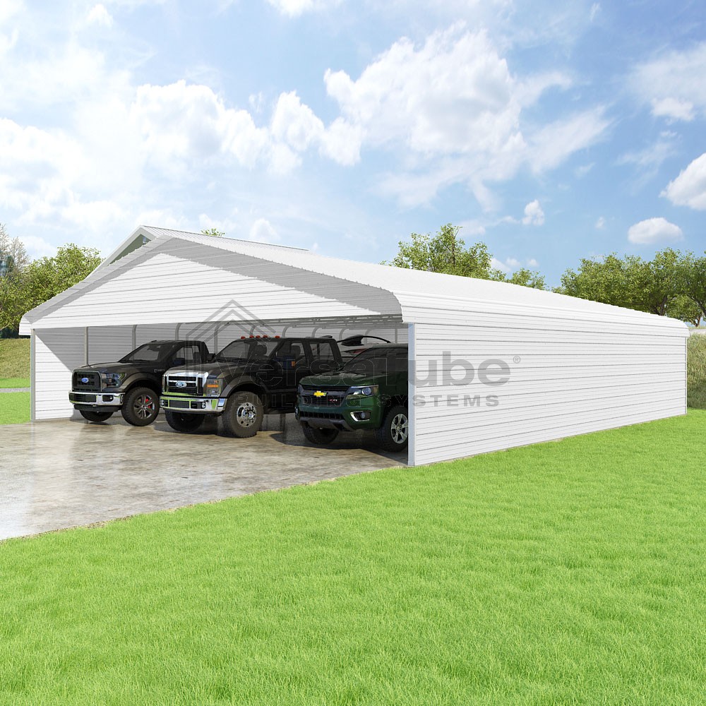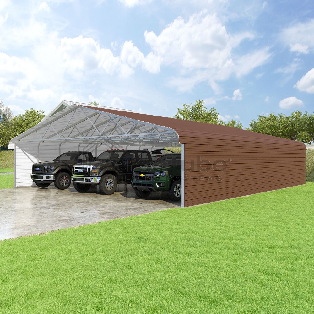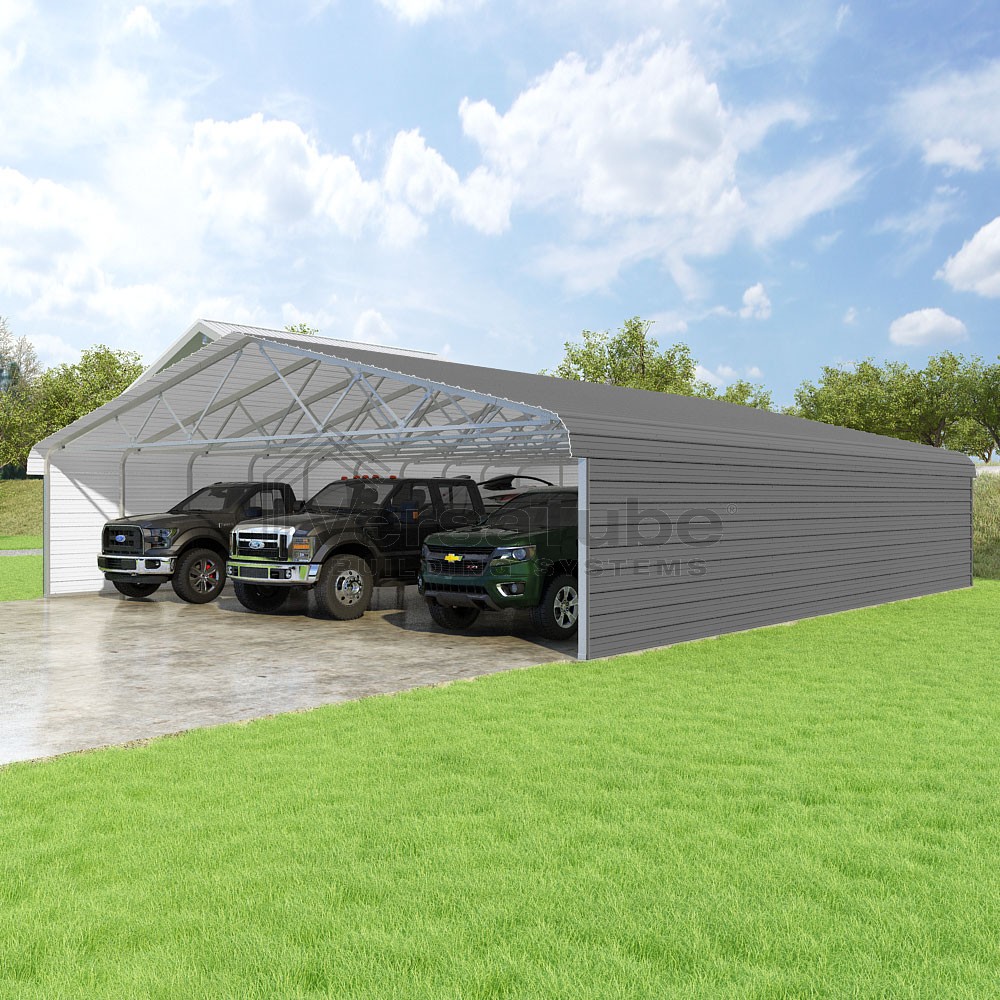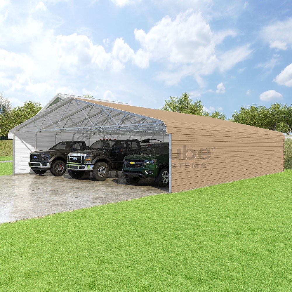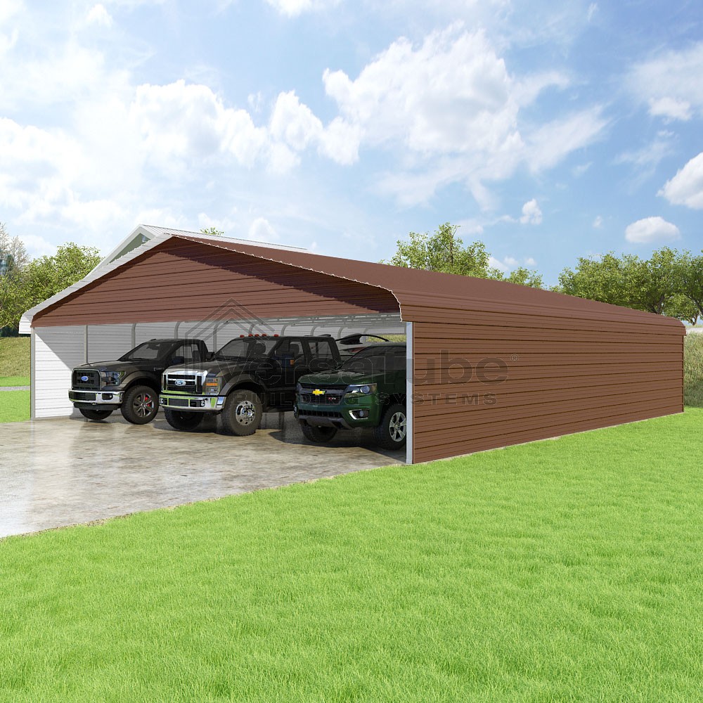 Classic Series DIY carport kit features horizontal application of sheet metal panels with the extra protection of rounded eaves.