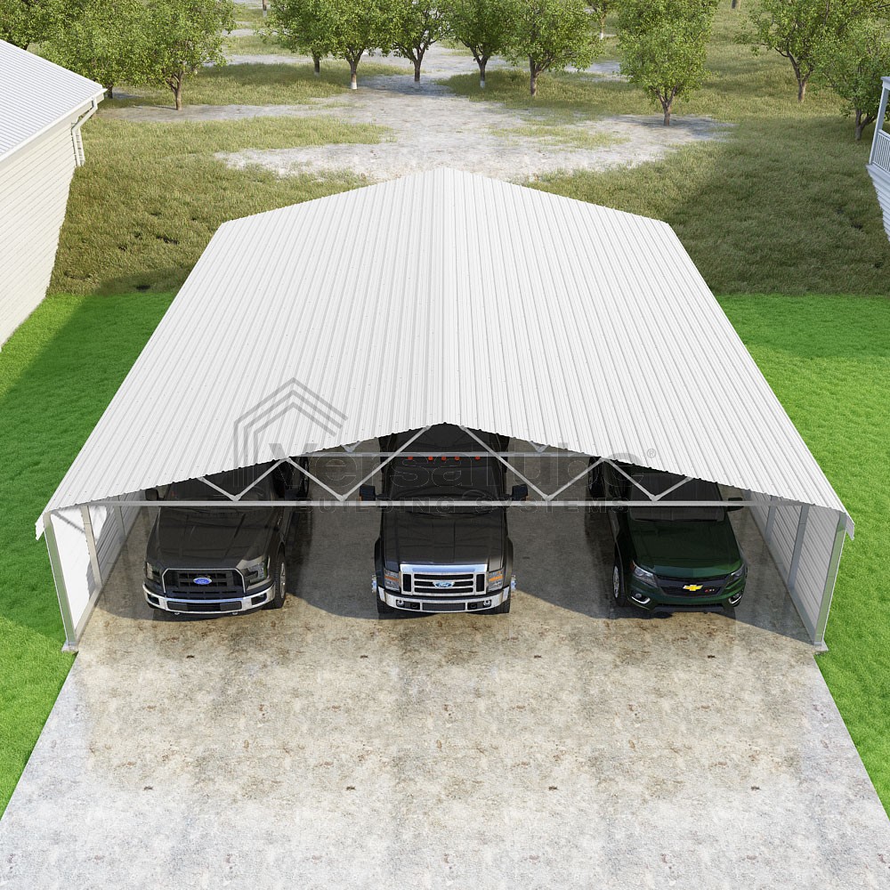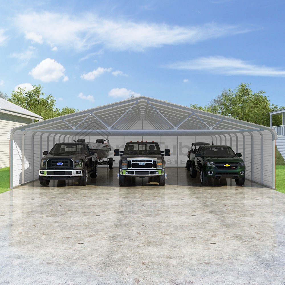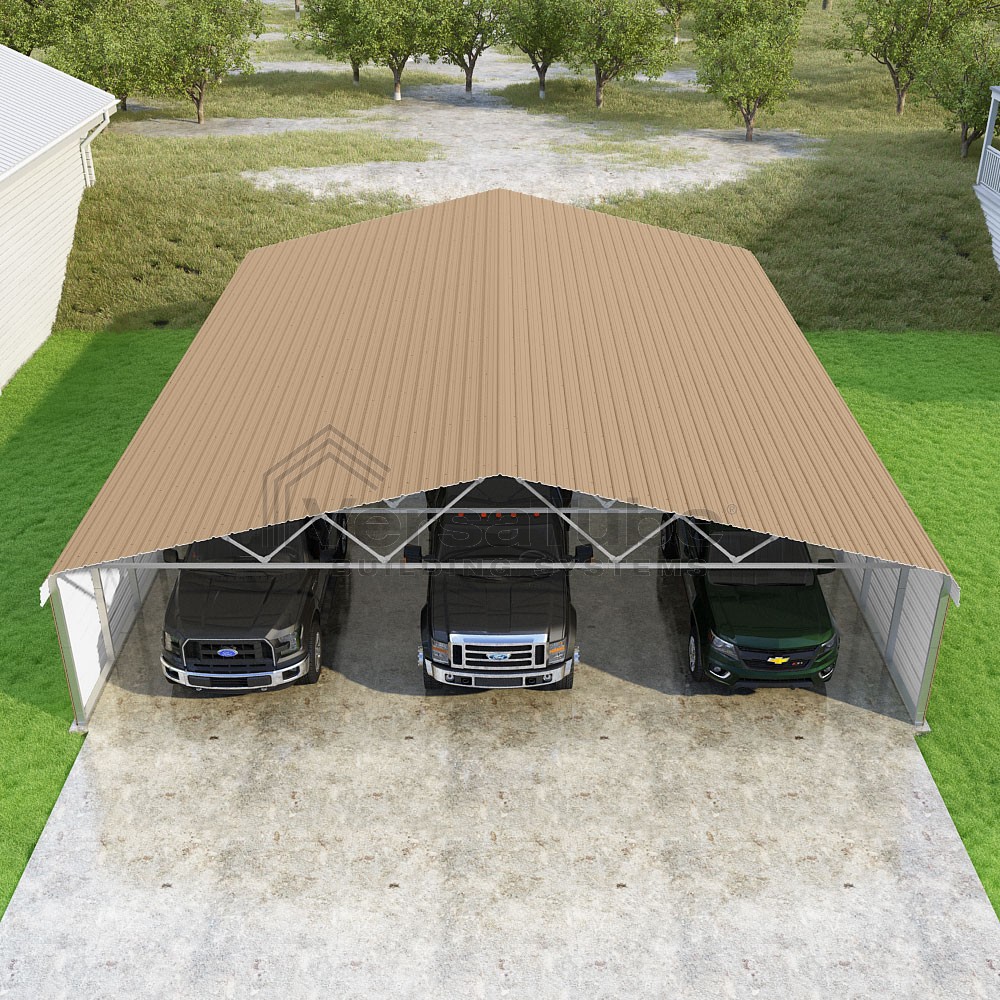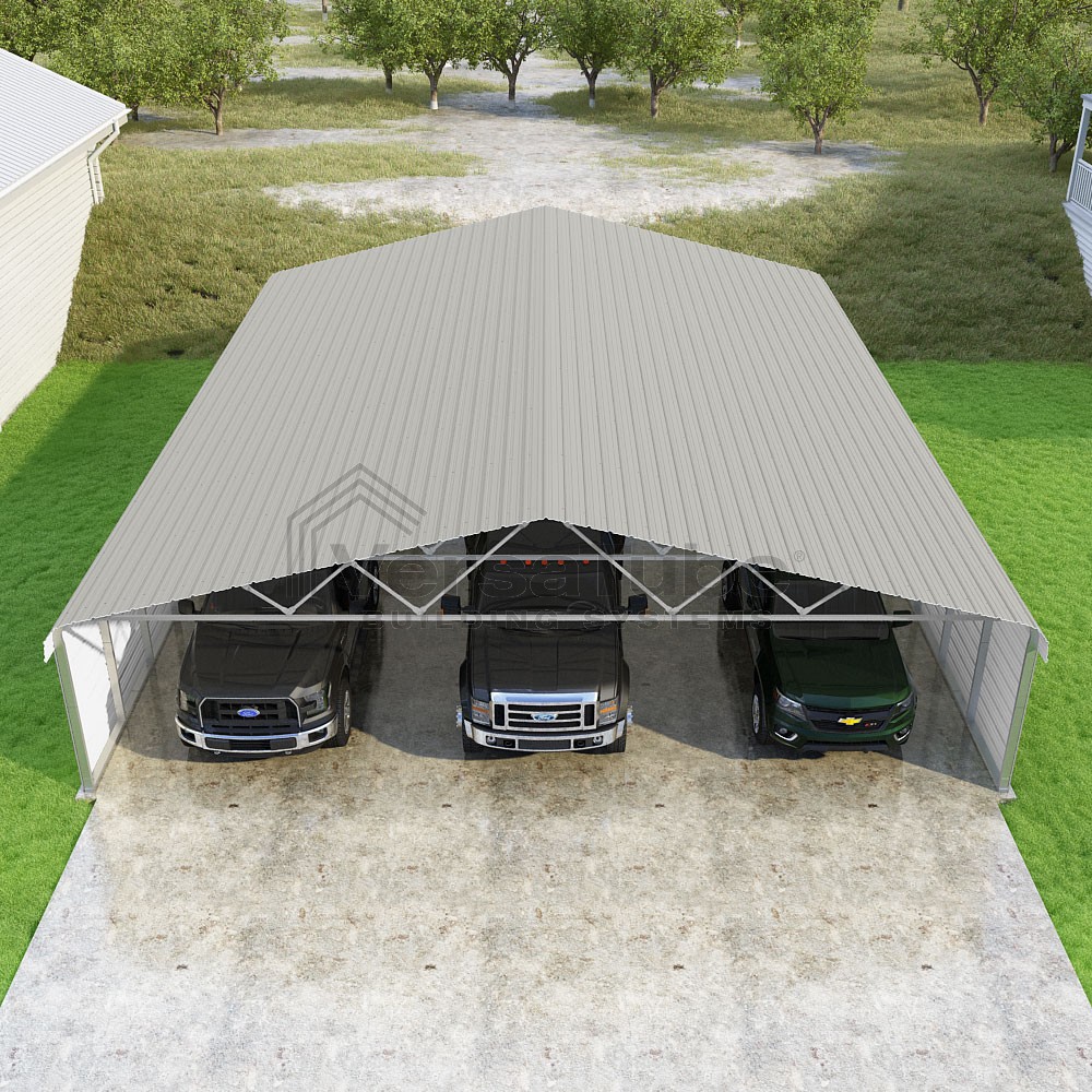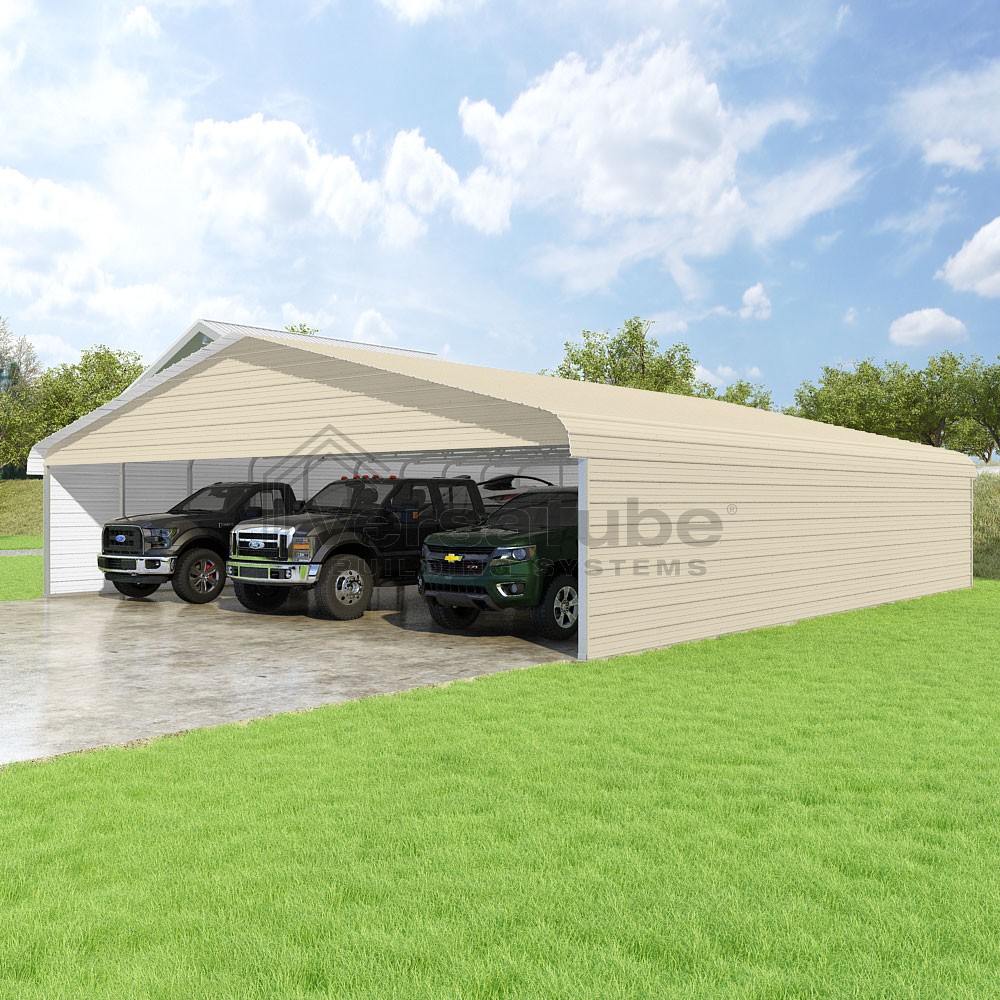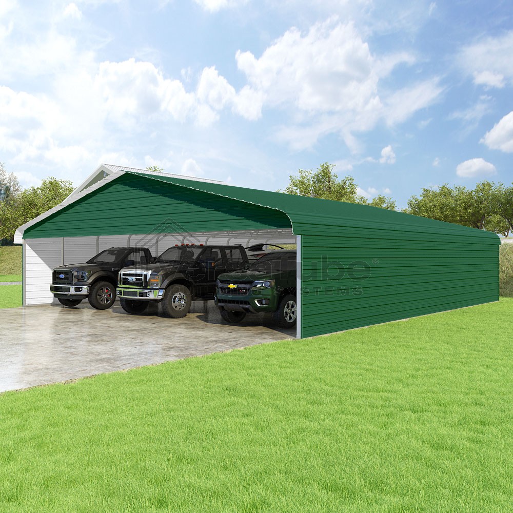 Classic Series DIY carport kit features horizontal application of sheet metal panels with the extra protection of rounded eaves.