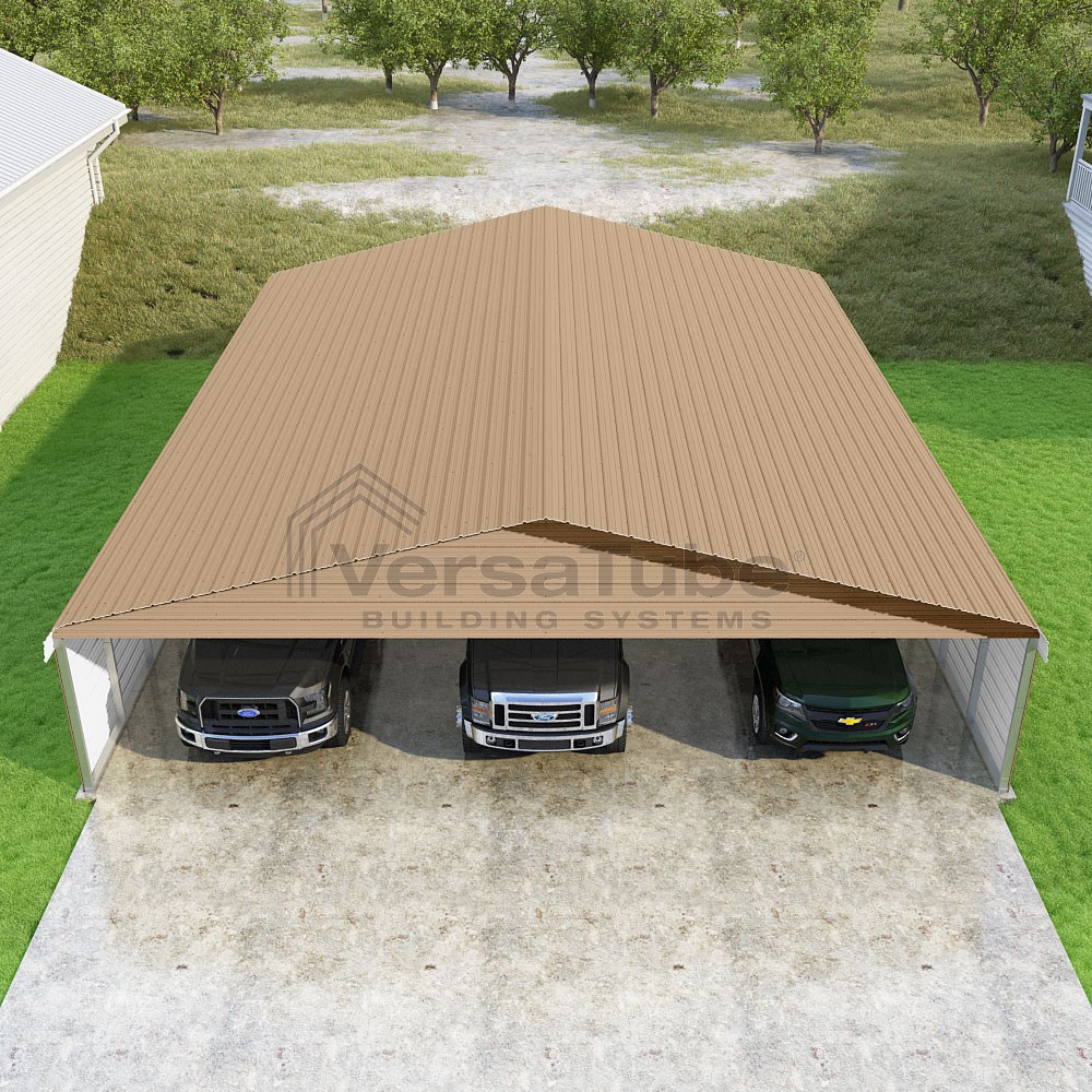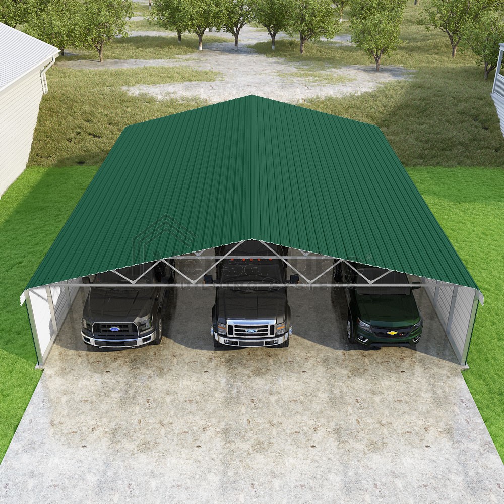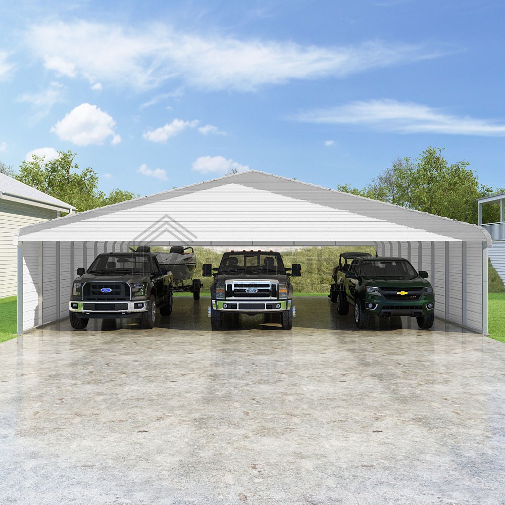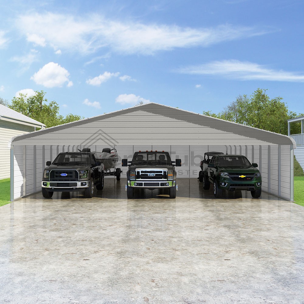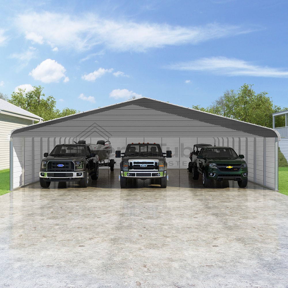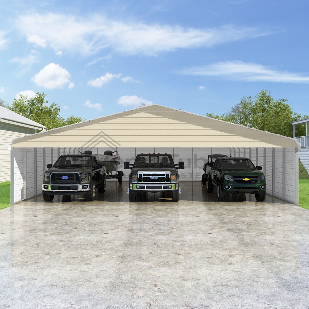 Classic Series DIY carport kit features horizontal application of sheet metal panels with the extra protection of rounded eaves.