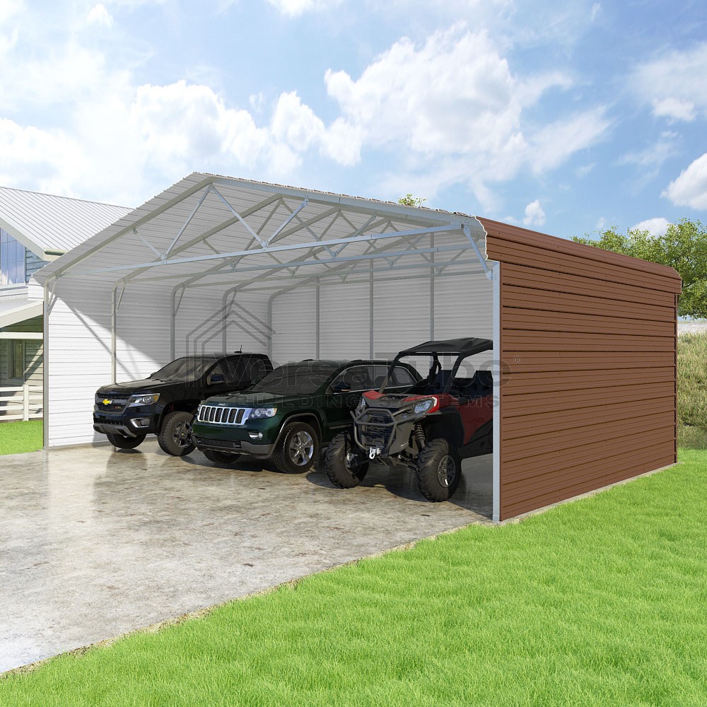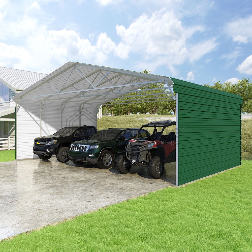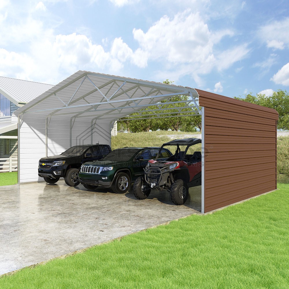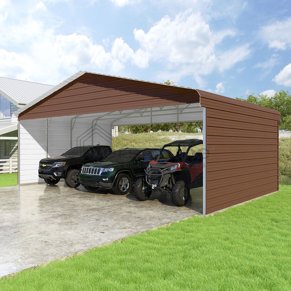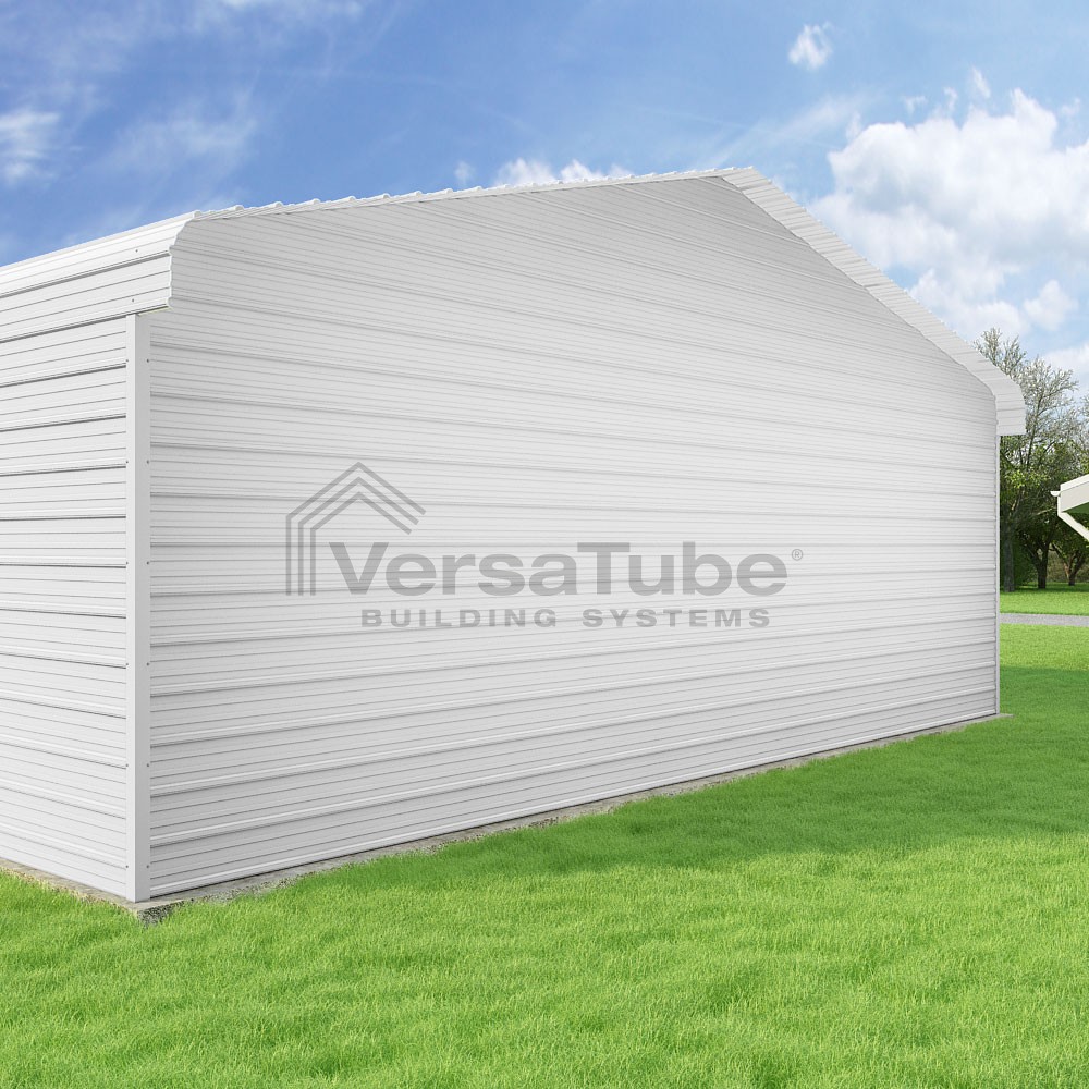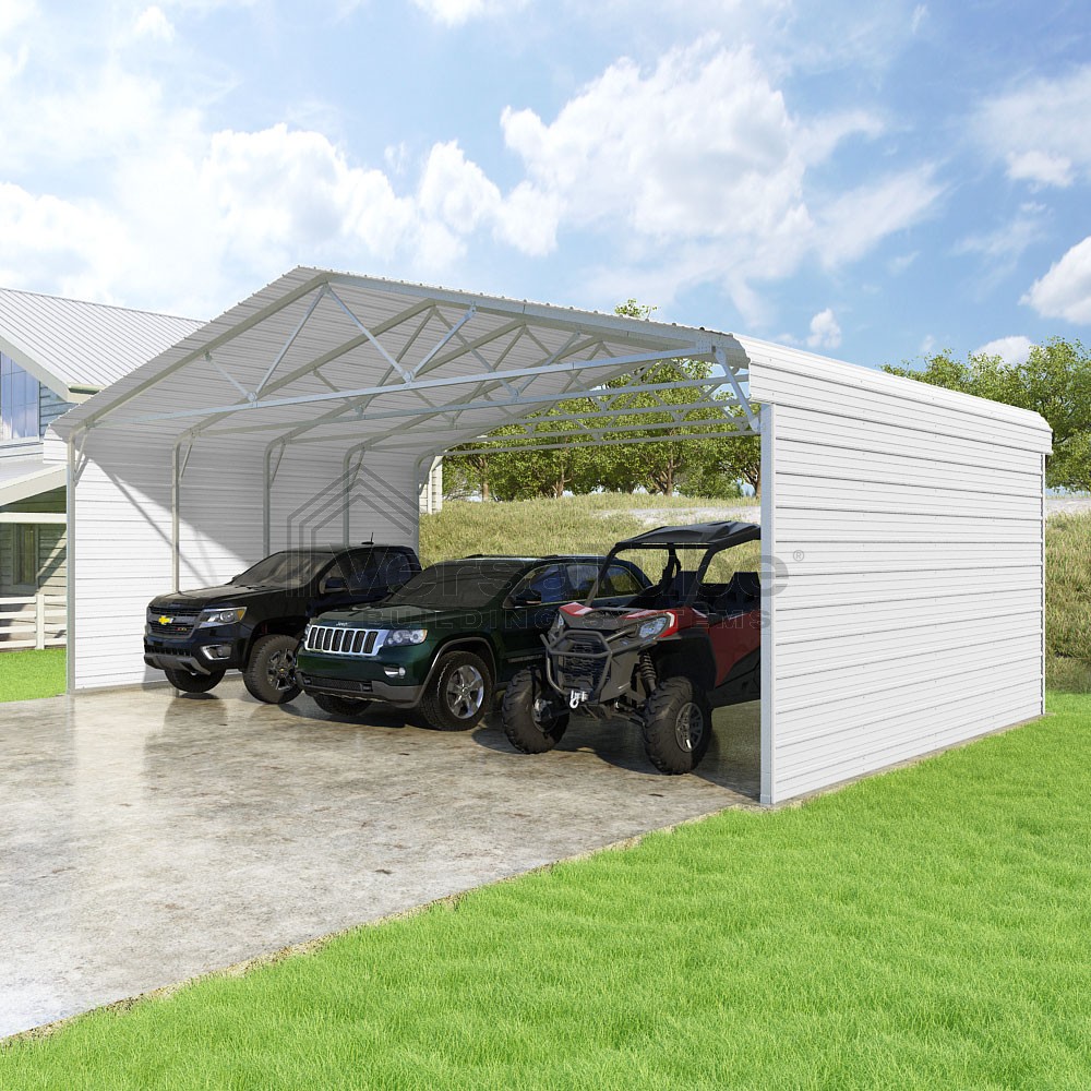 Classic Series DIY carport kit features horizontal application of sheet metal panels with the extra protection of rounded eaves.