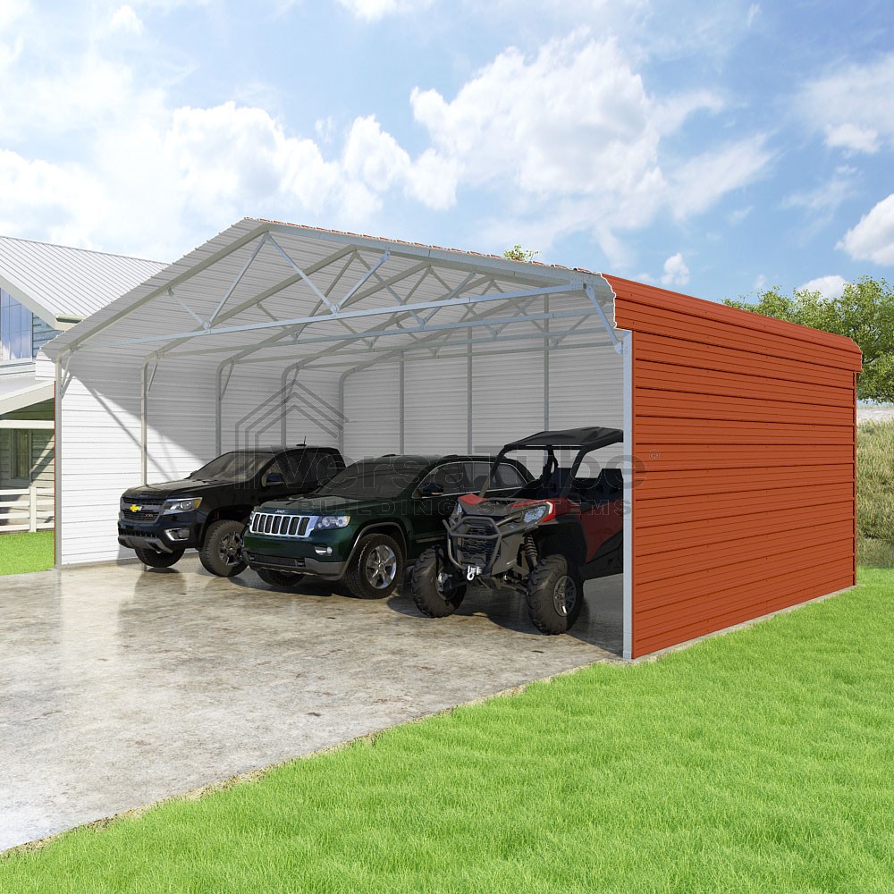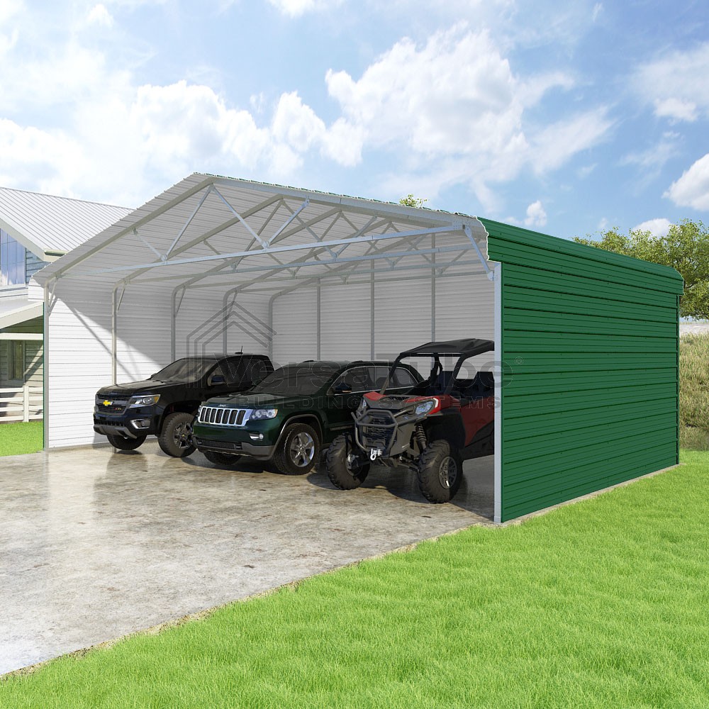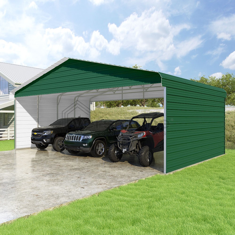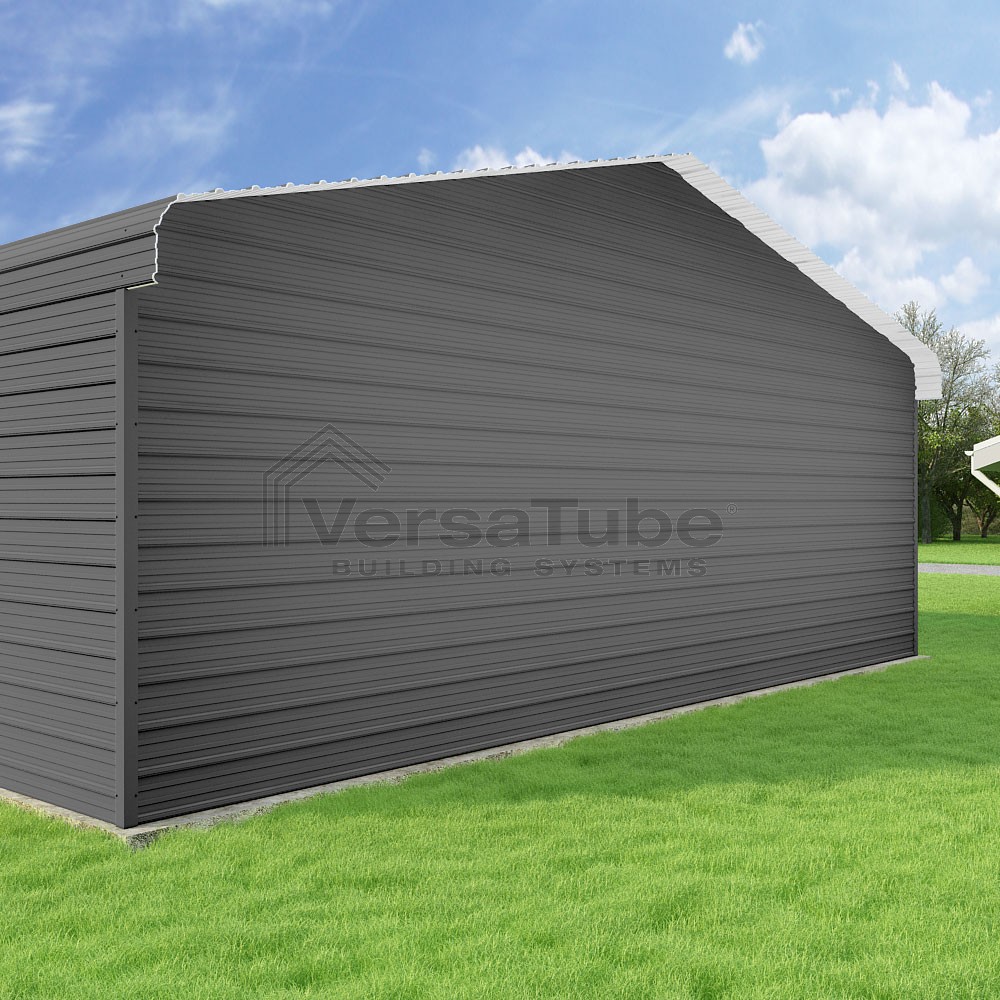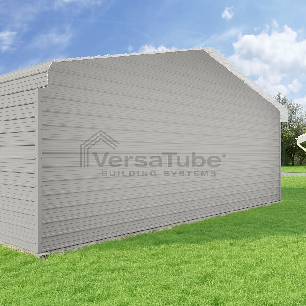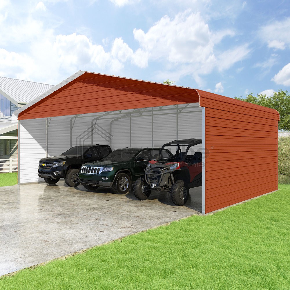 Classic Series DIY carport kit features horizontal application of sheet metal panels with the extra protection of rounded eaves.