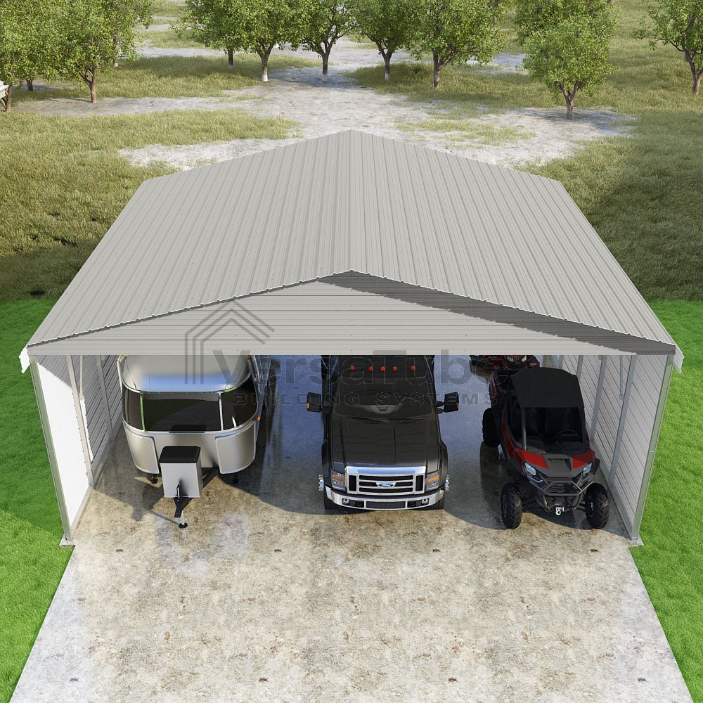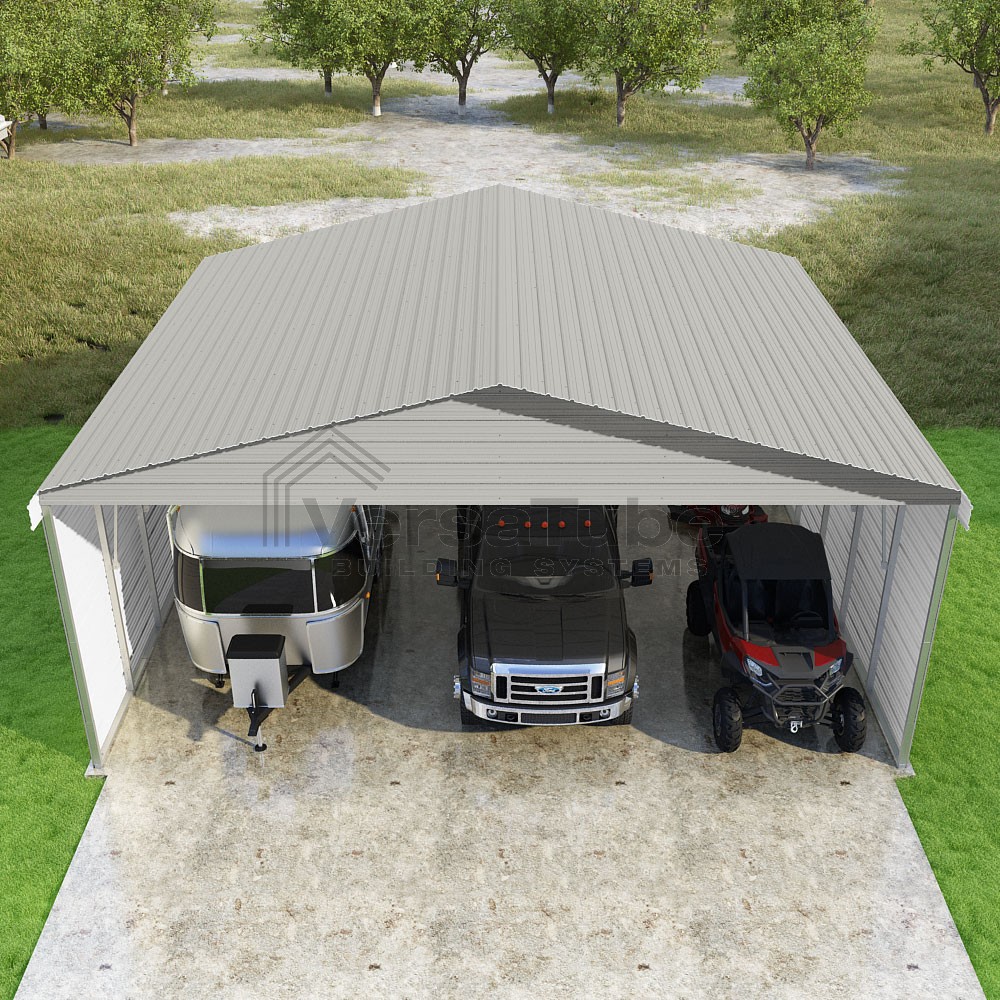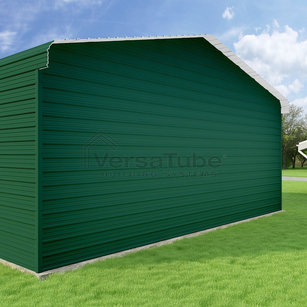 Classic Series DIY carport kit features horizontal application of sheet metal panels with the extra protection of rounded eaves.