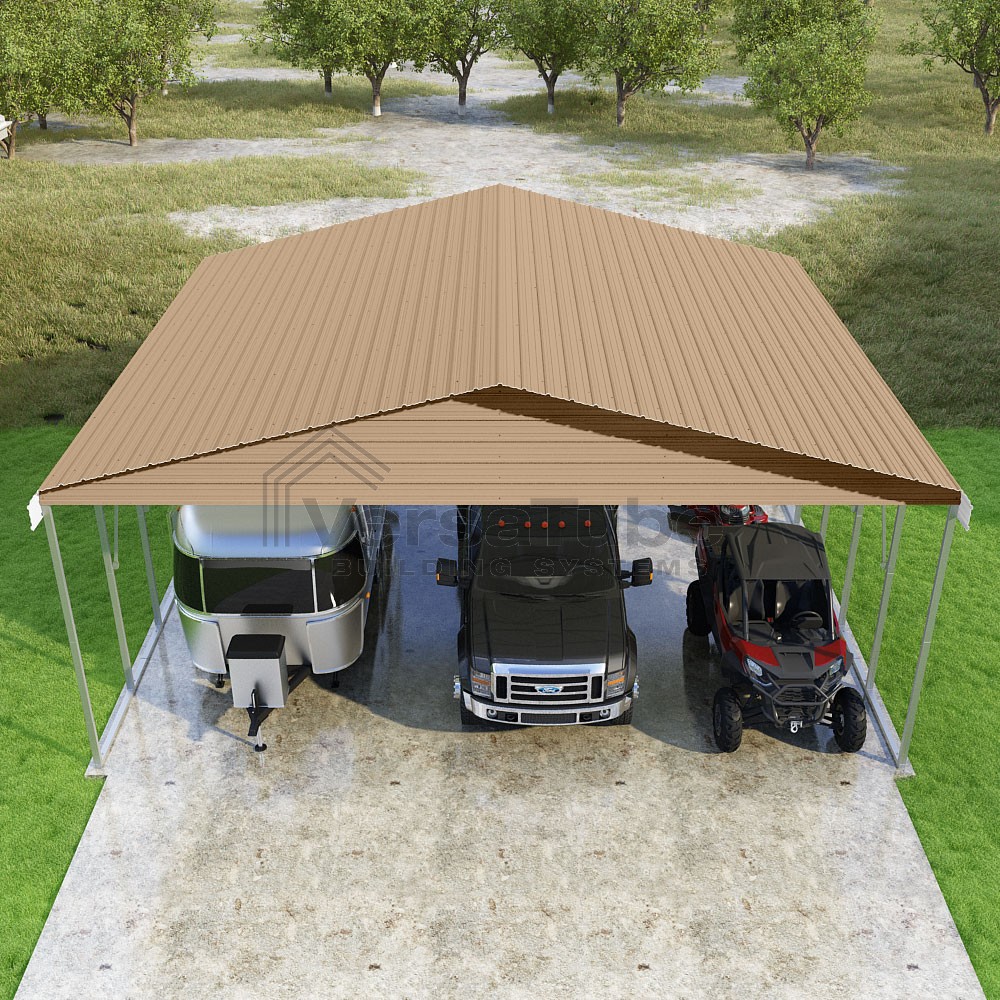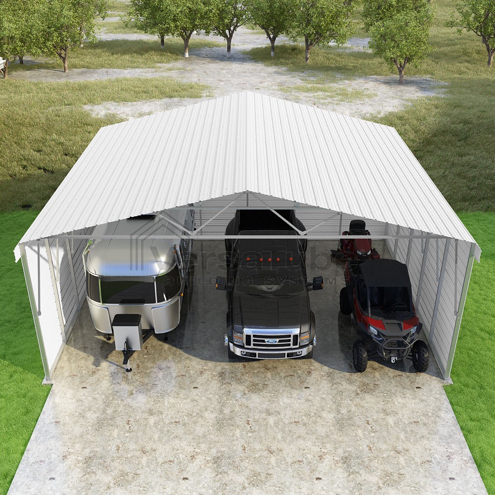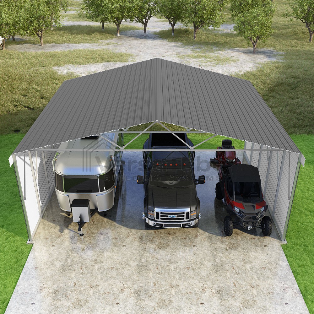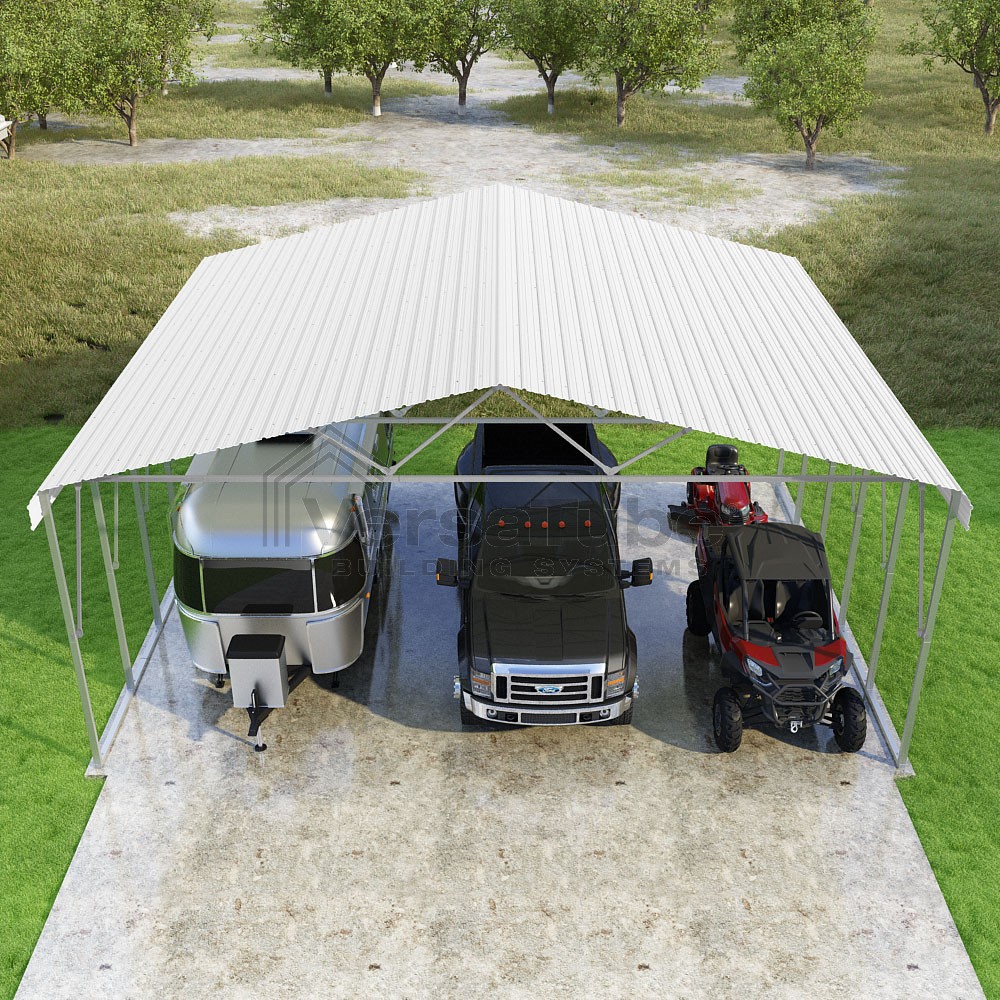 Classic Series DIY carport kit features horizontal application of sheet metal panels with the extra protection of rounded eaves.