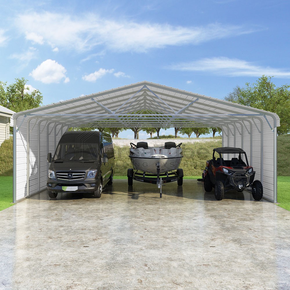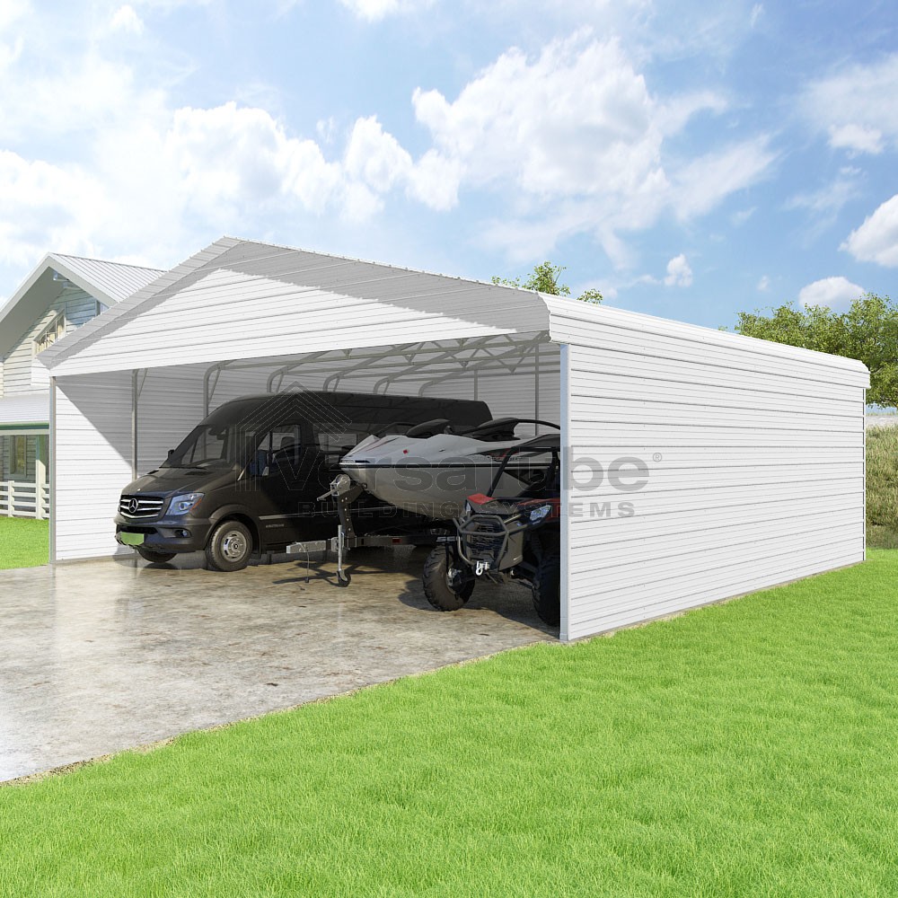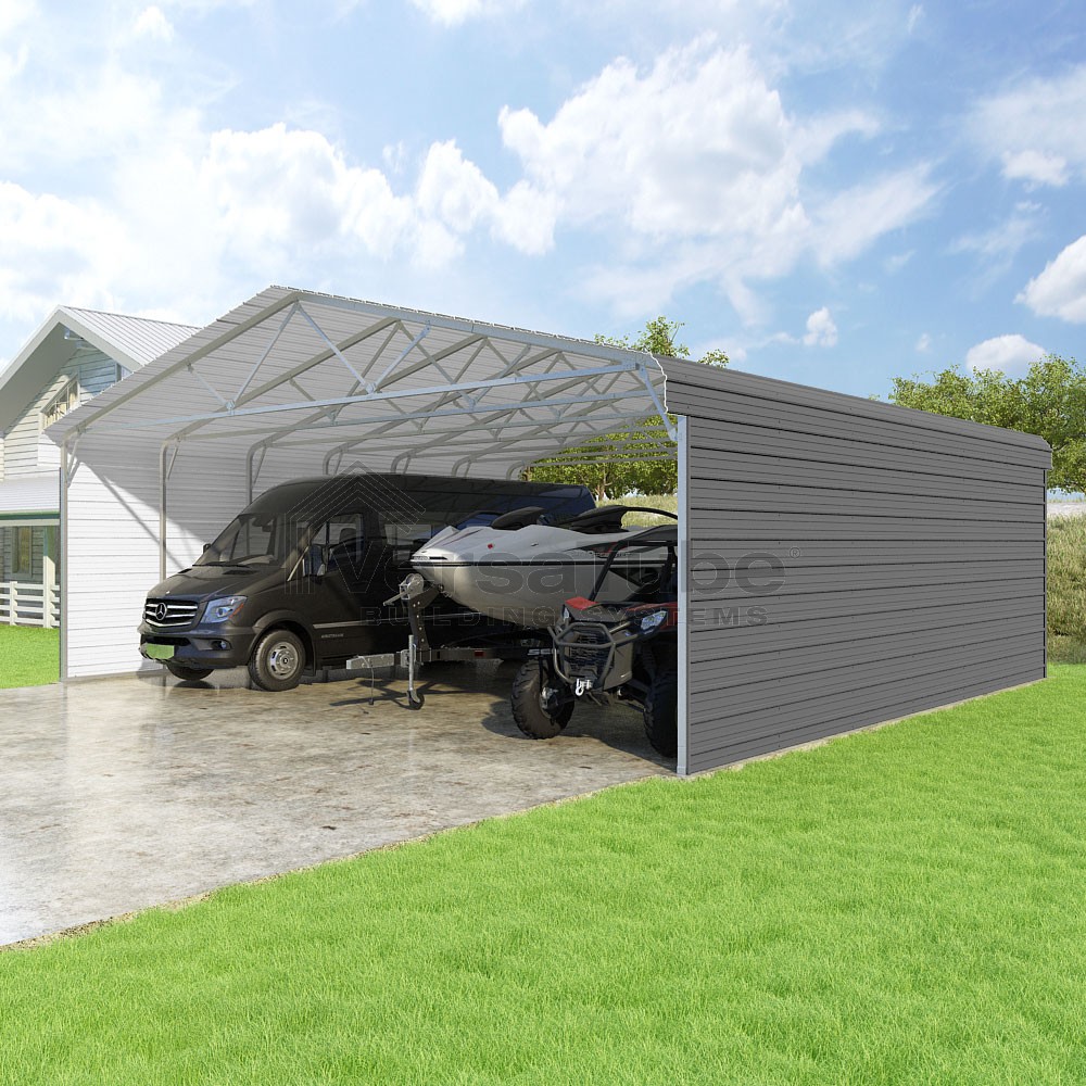 Classic Series DIY carport kit features horizontal application of sheet metal panels with the extra protection of rounded eaves.