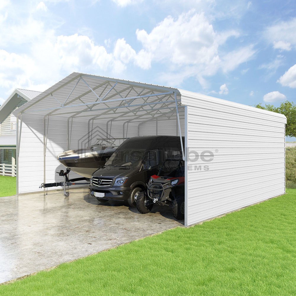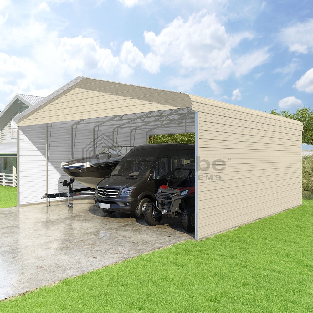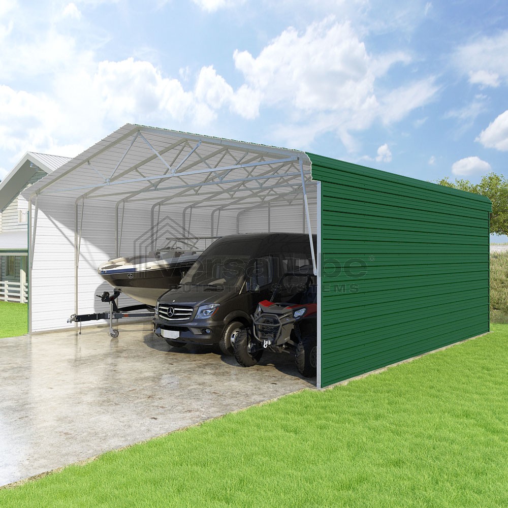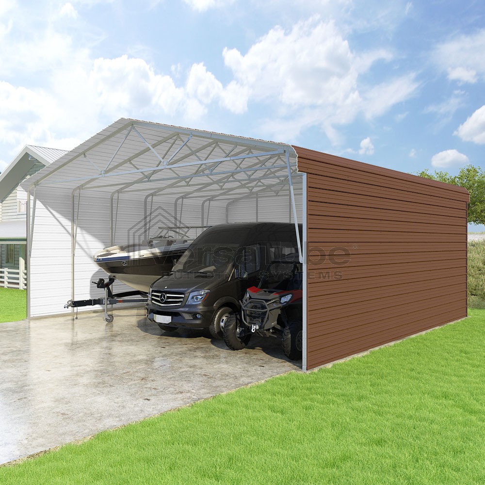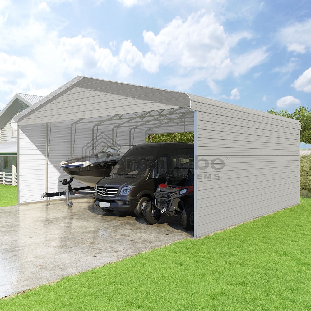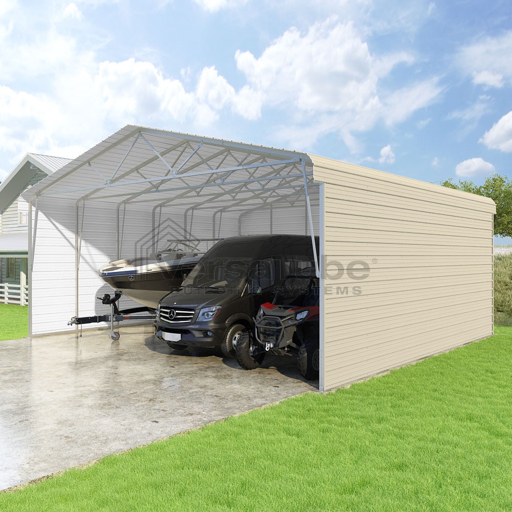 Classic Series DIY carport kit features horizontal application of sheet metal panels with the extra protection of rounded eaves.
