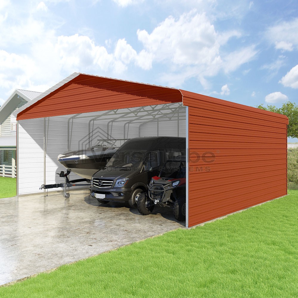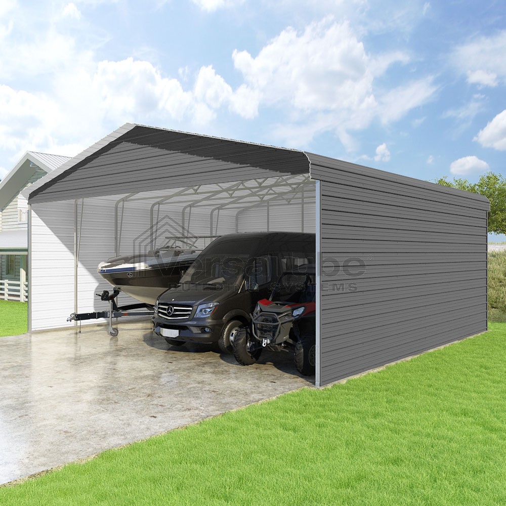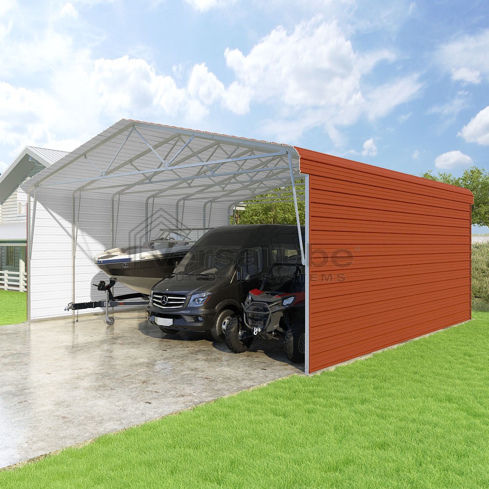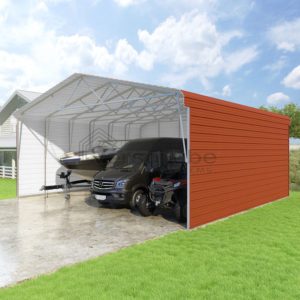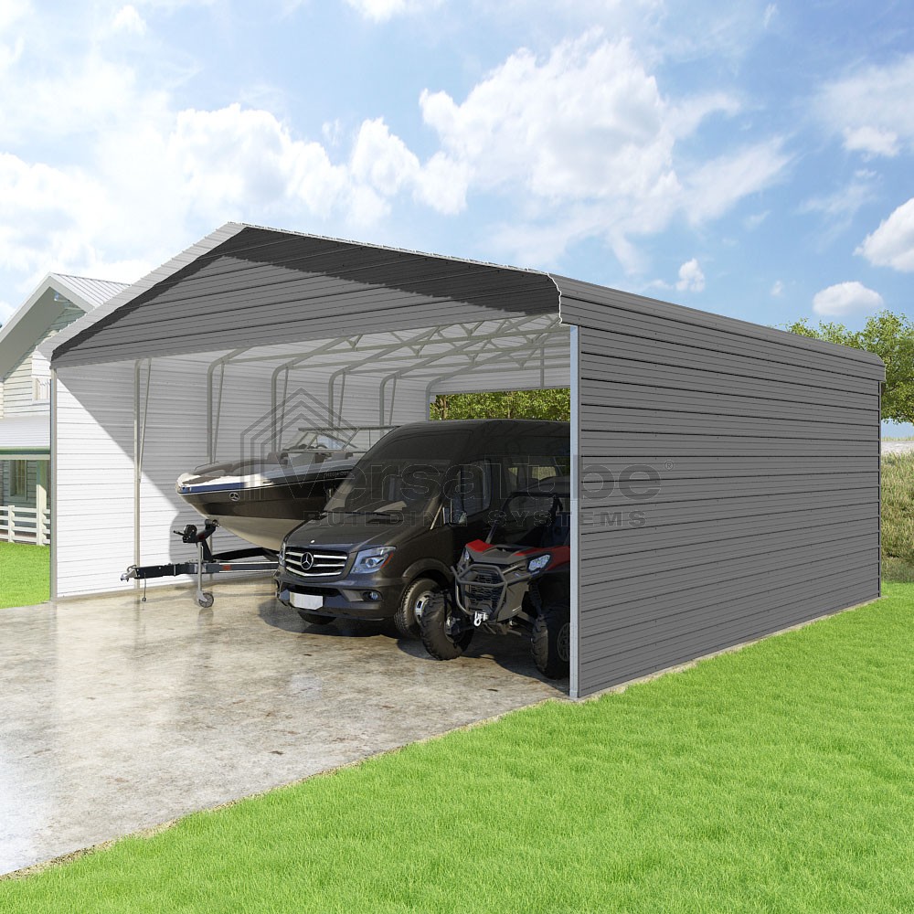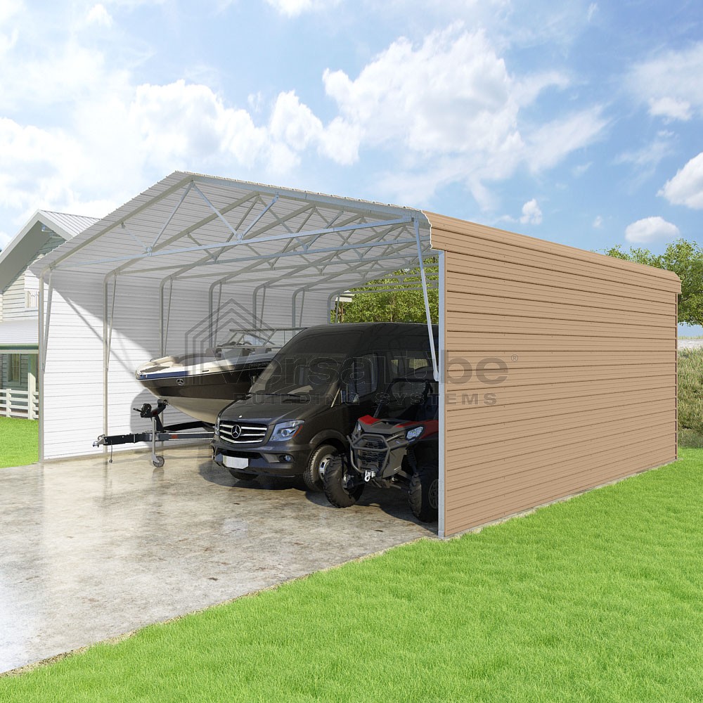 Classic Series DIY carport kit features horizontal application of sheet metal panels with the extra protection of rounded eaves.