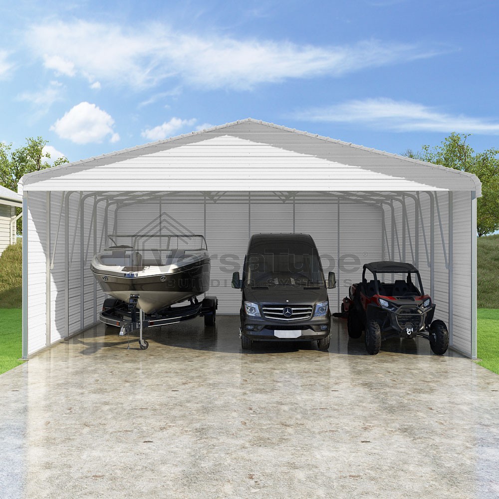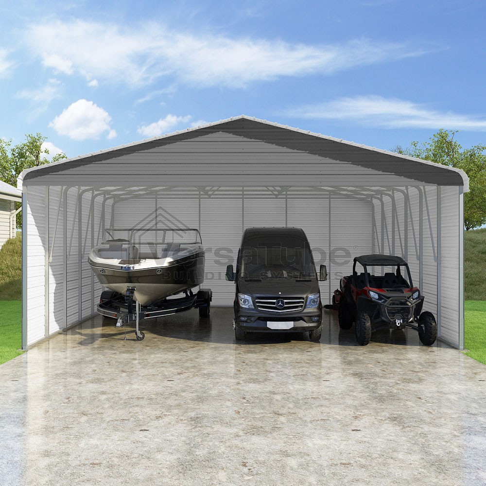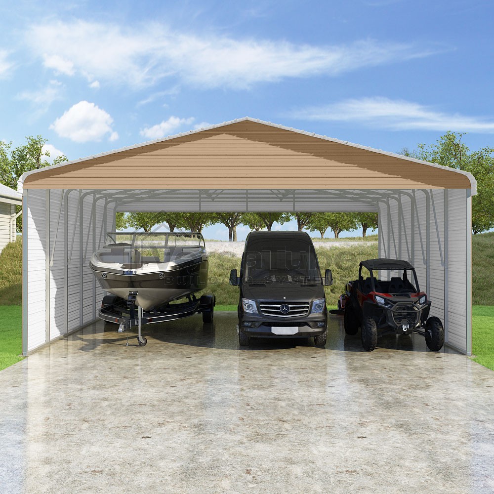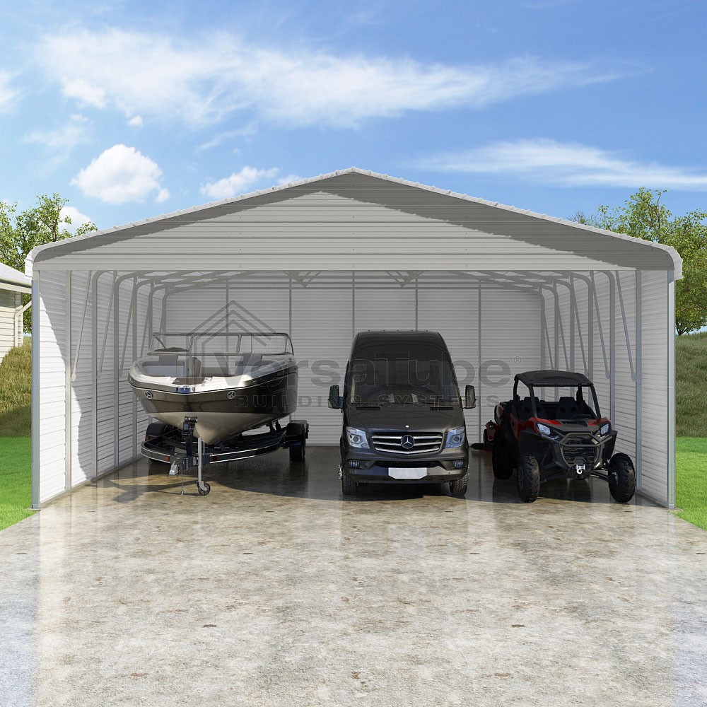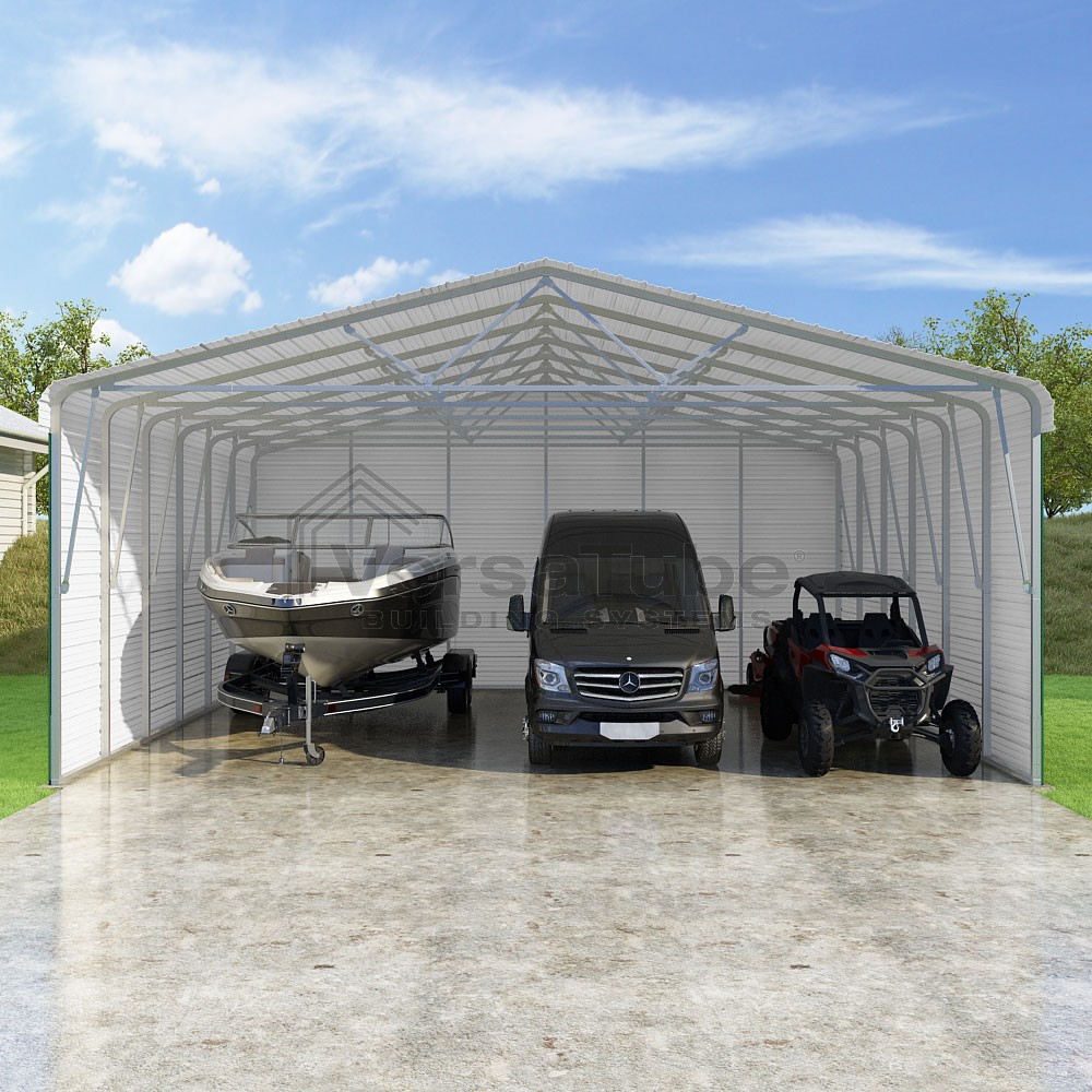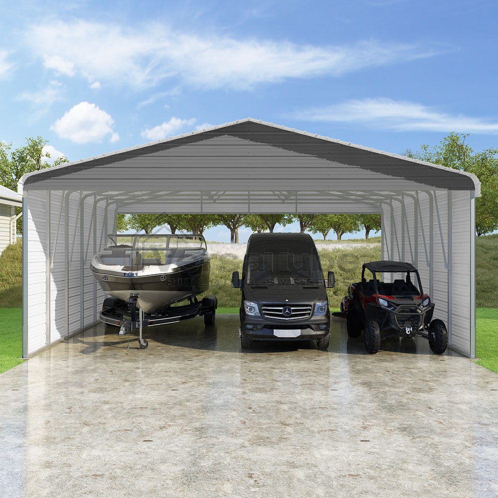 Classic Series DIY carport kit features horizontal application of sheet metal panels with the extra protection of rounded eaves.