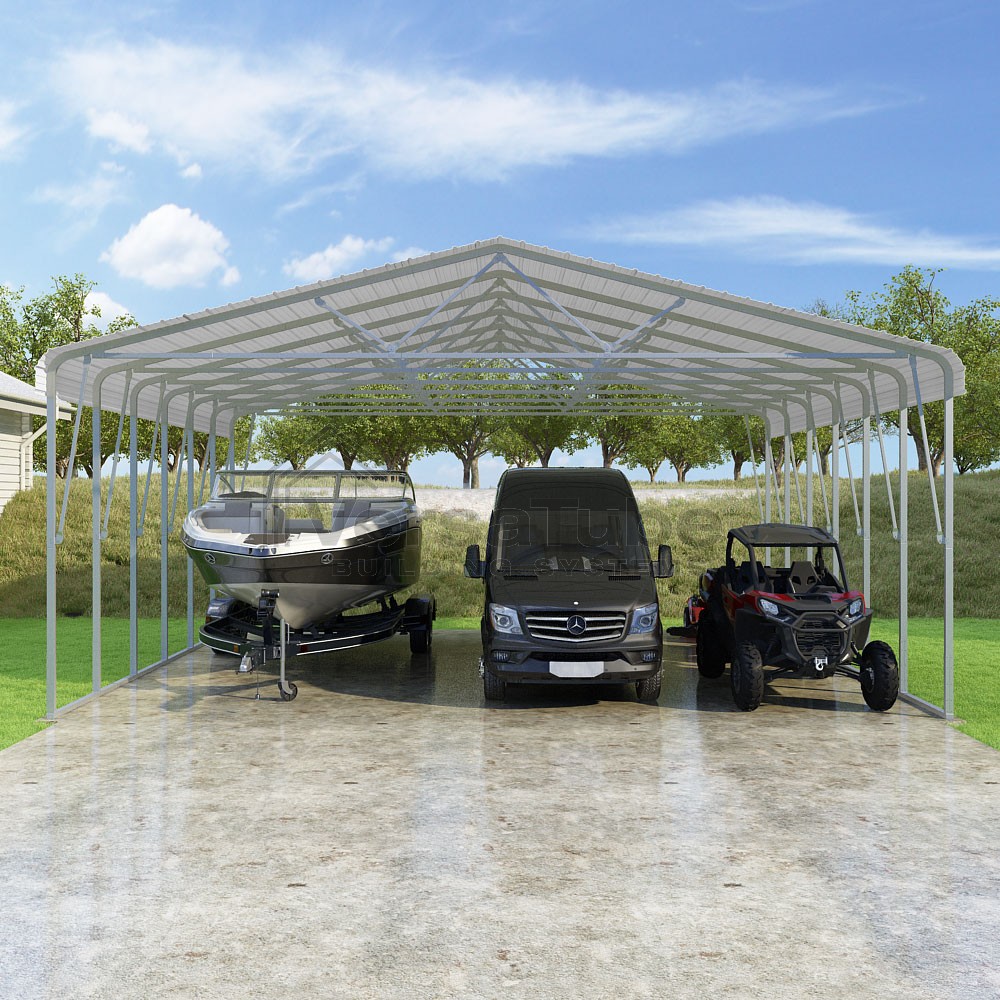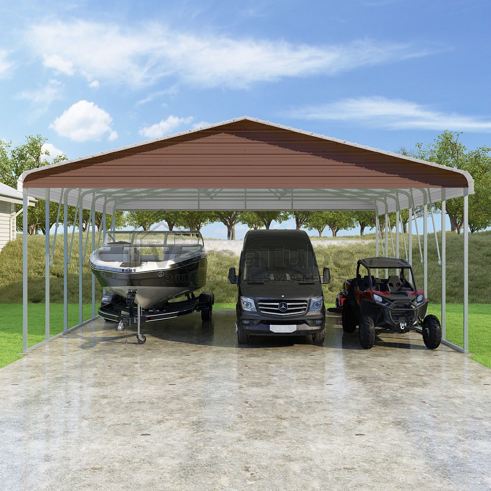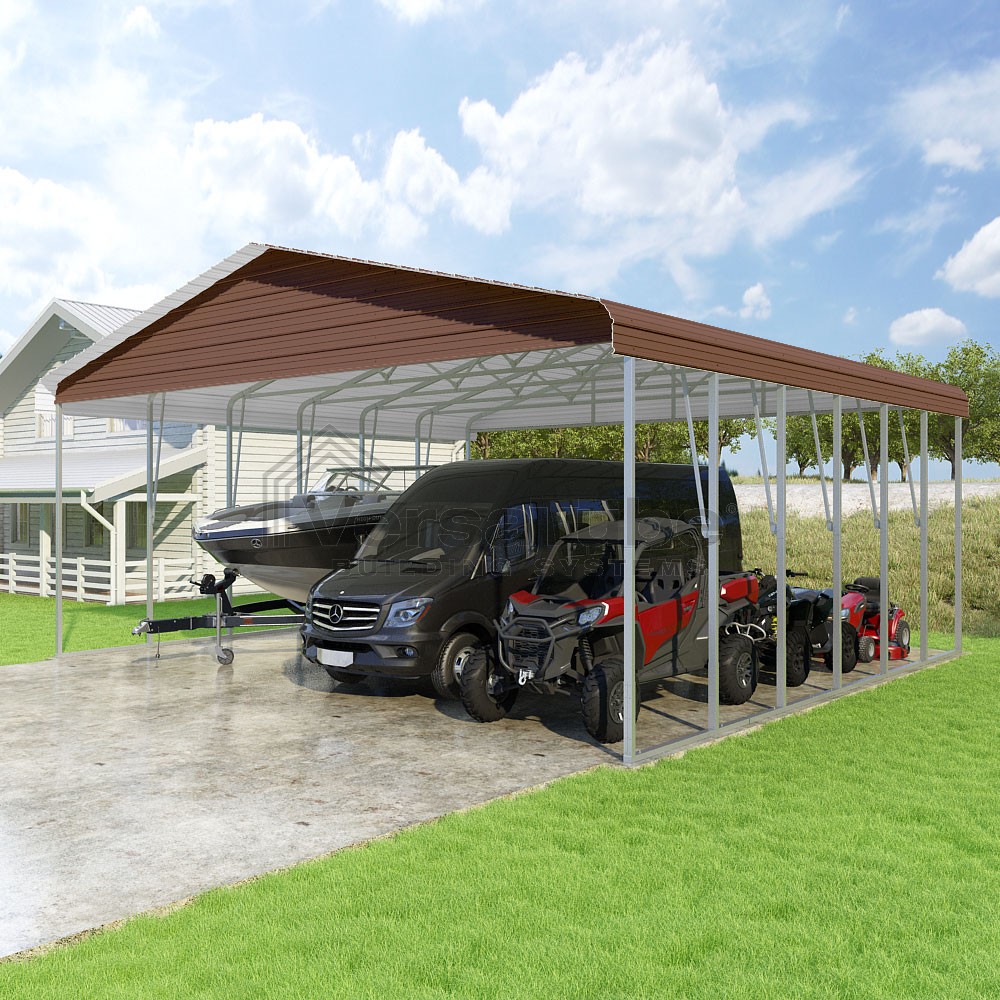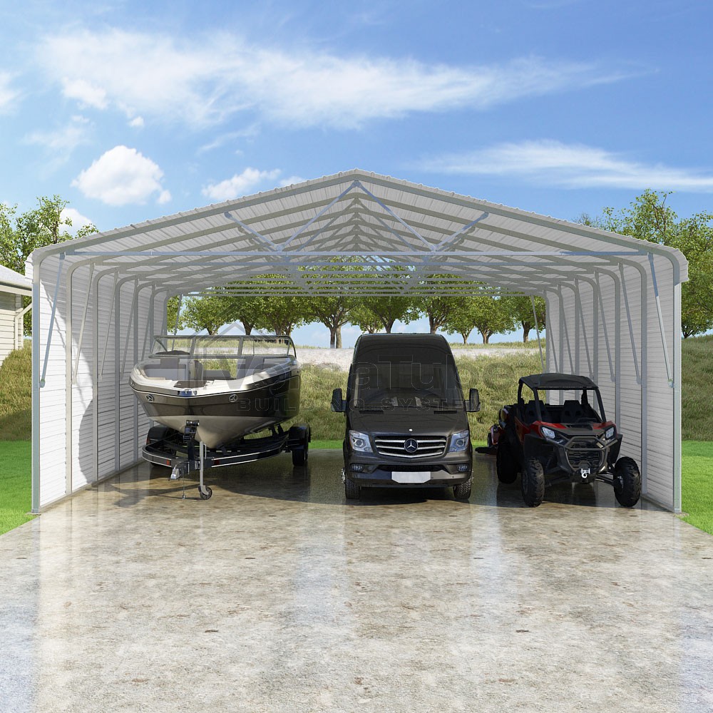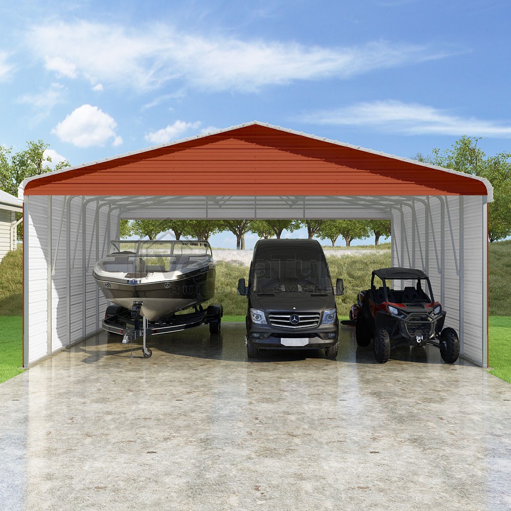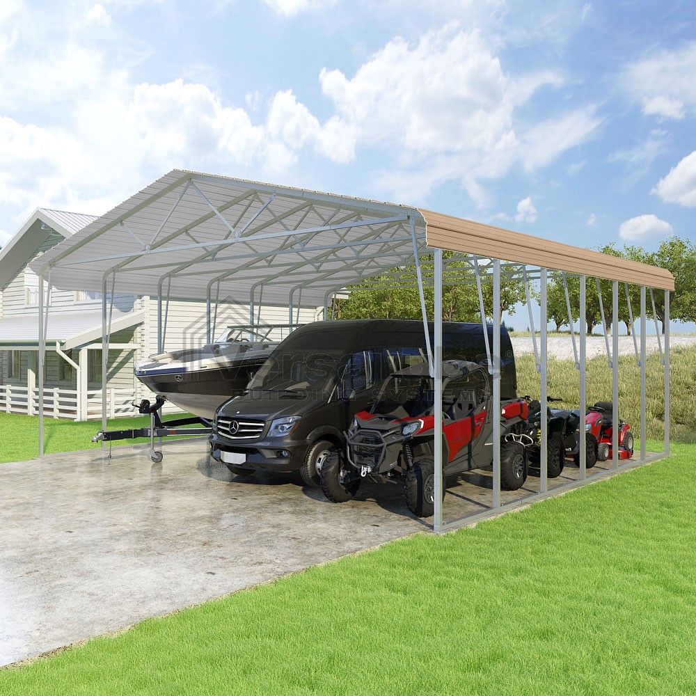 Classic Series DIY carport kit features horizontal application of sheet metal panels with the extra protection of rounded eaves.