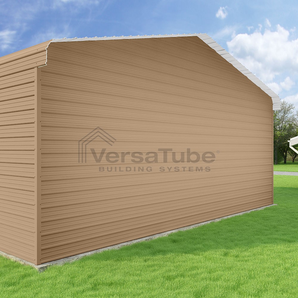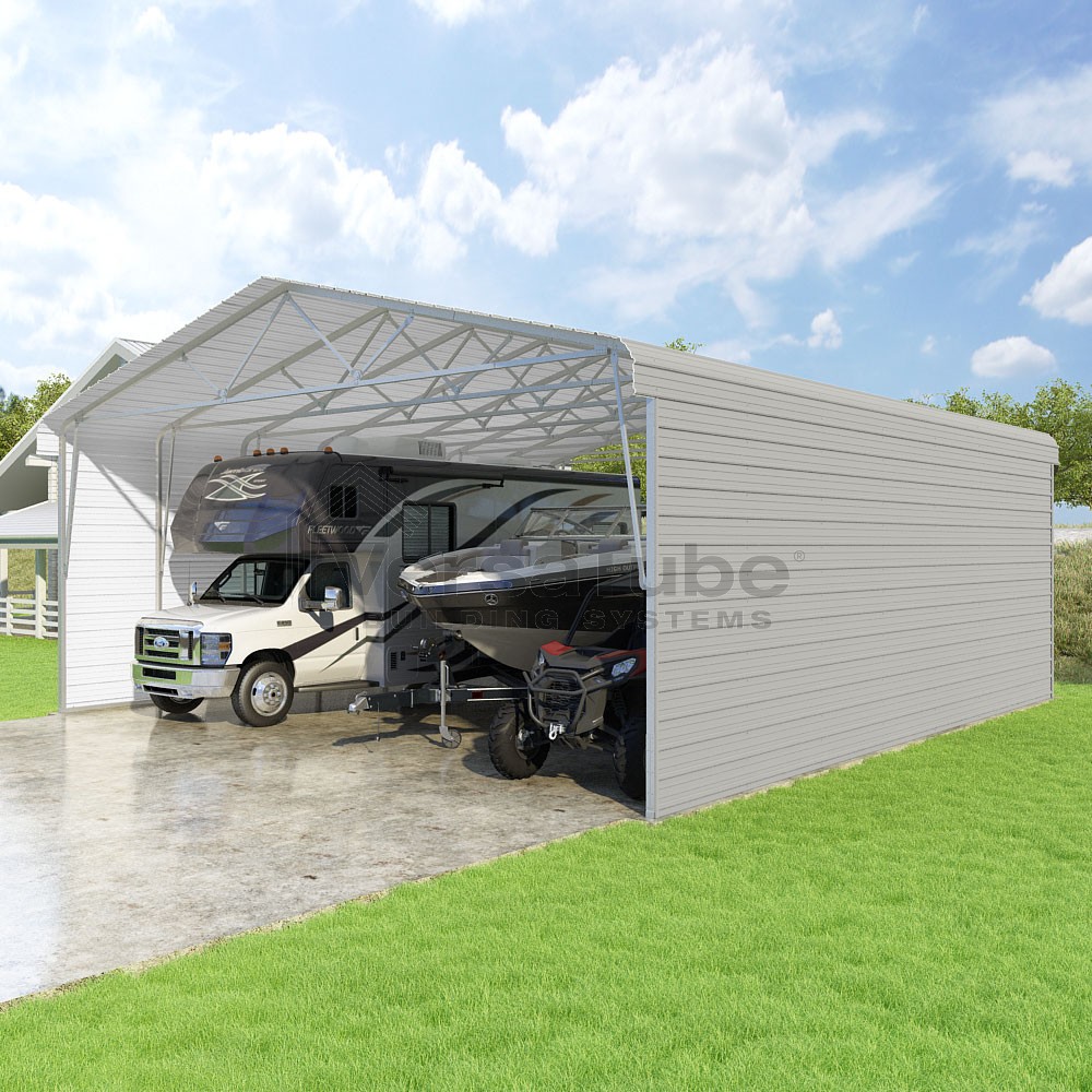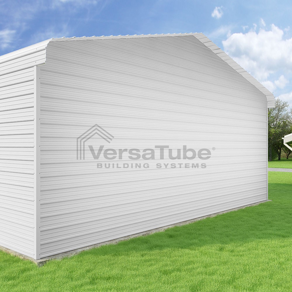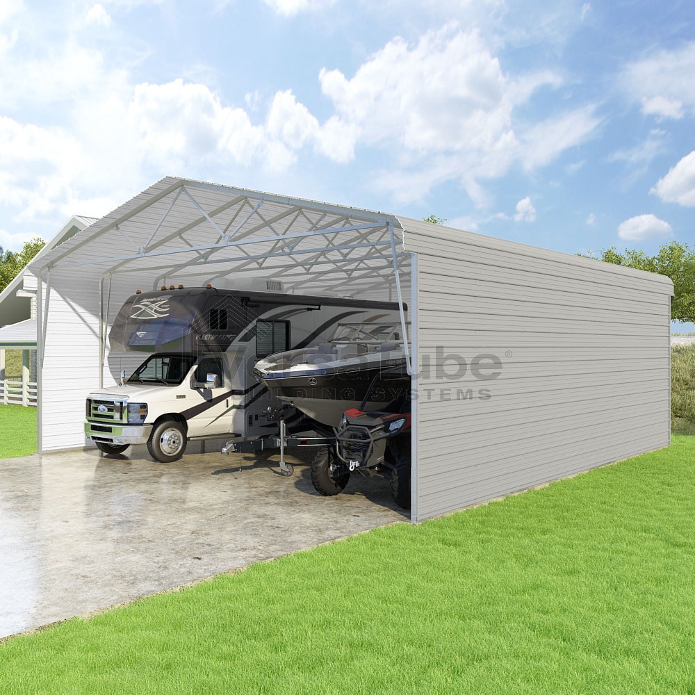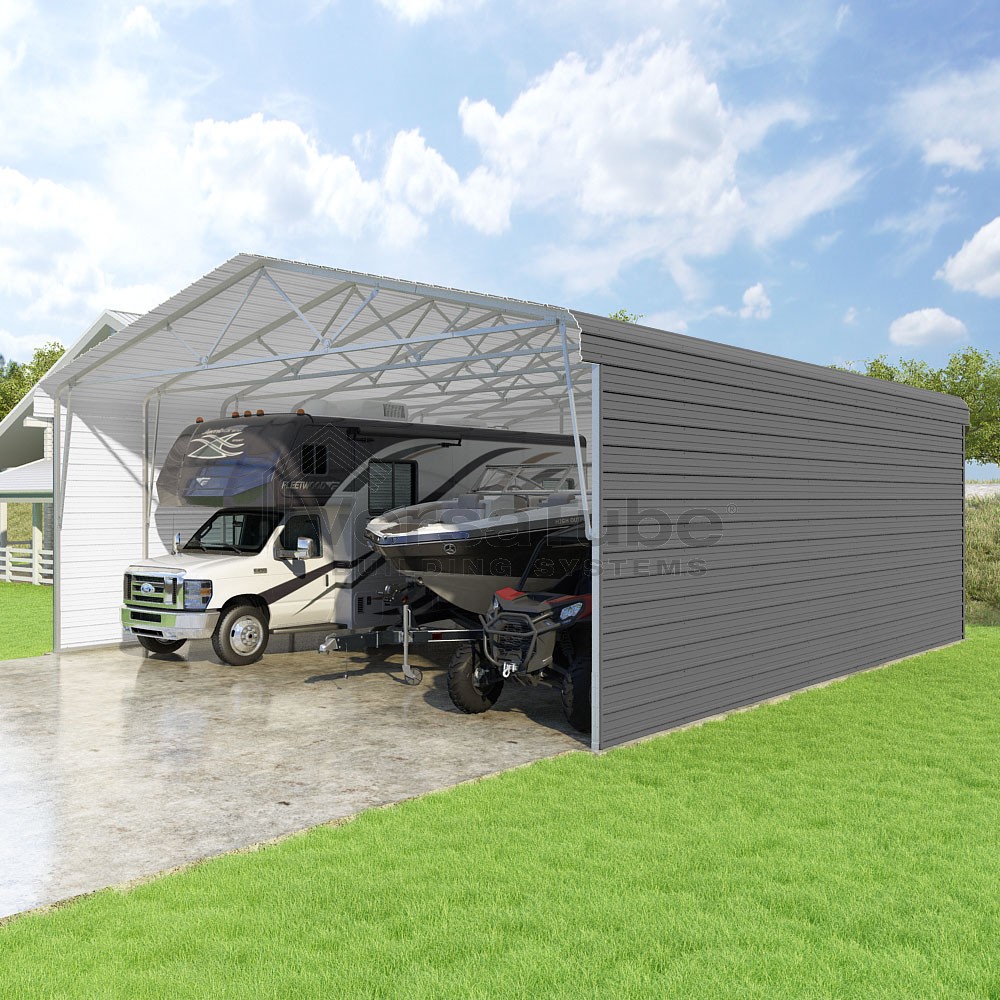 Classic Series DIY carport kit features horizontal application of sheet metal panels with the extra protection of rounded eaves.