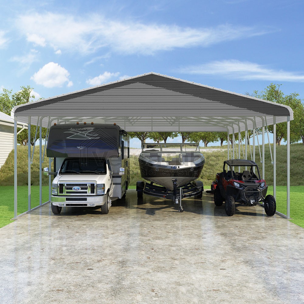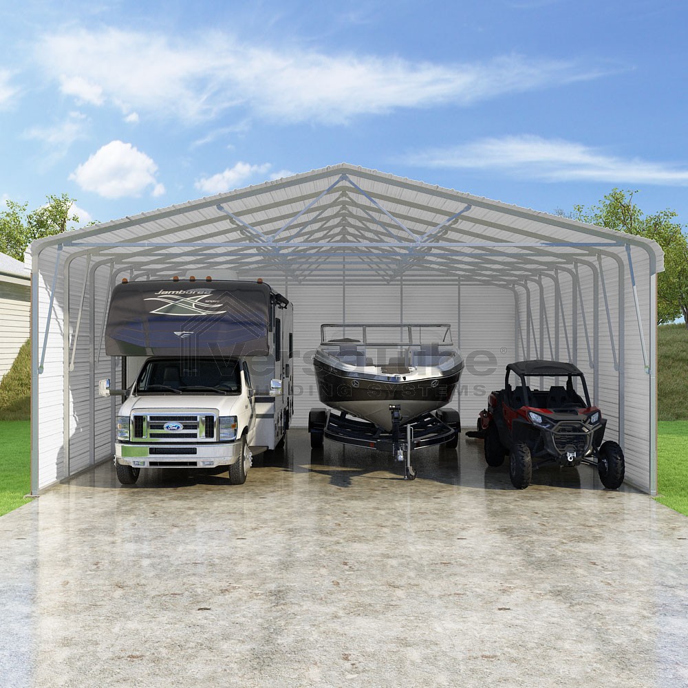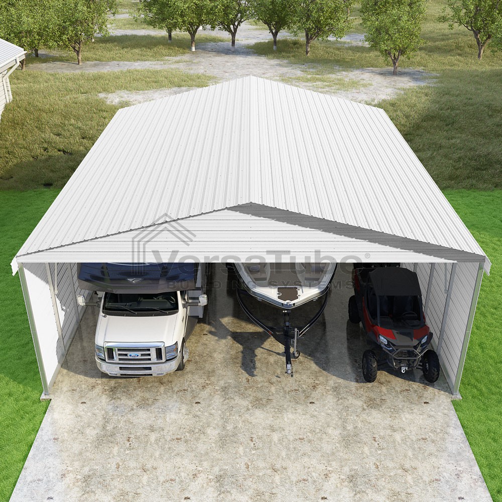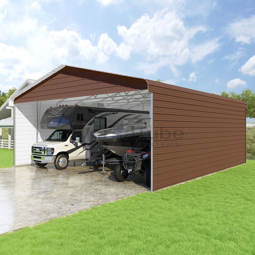 Classic Series DIY carport kit features horizontal application of sheet metal panels with the extra protection of rounded eaves.