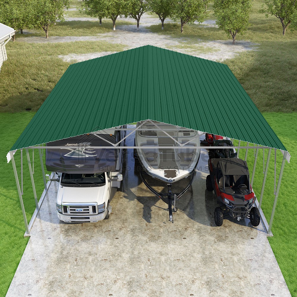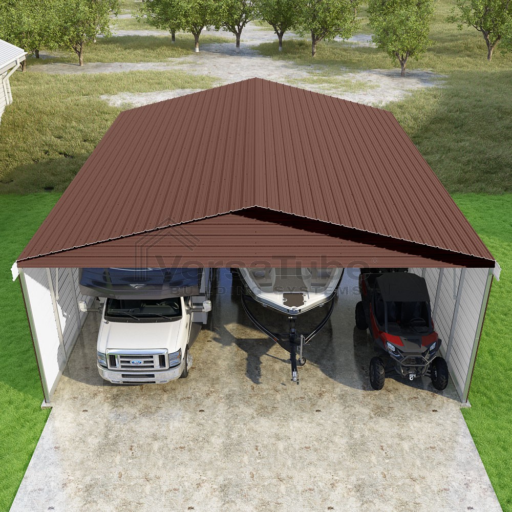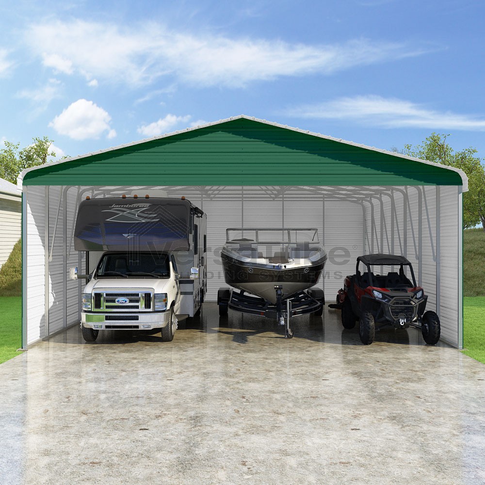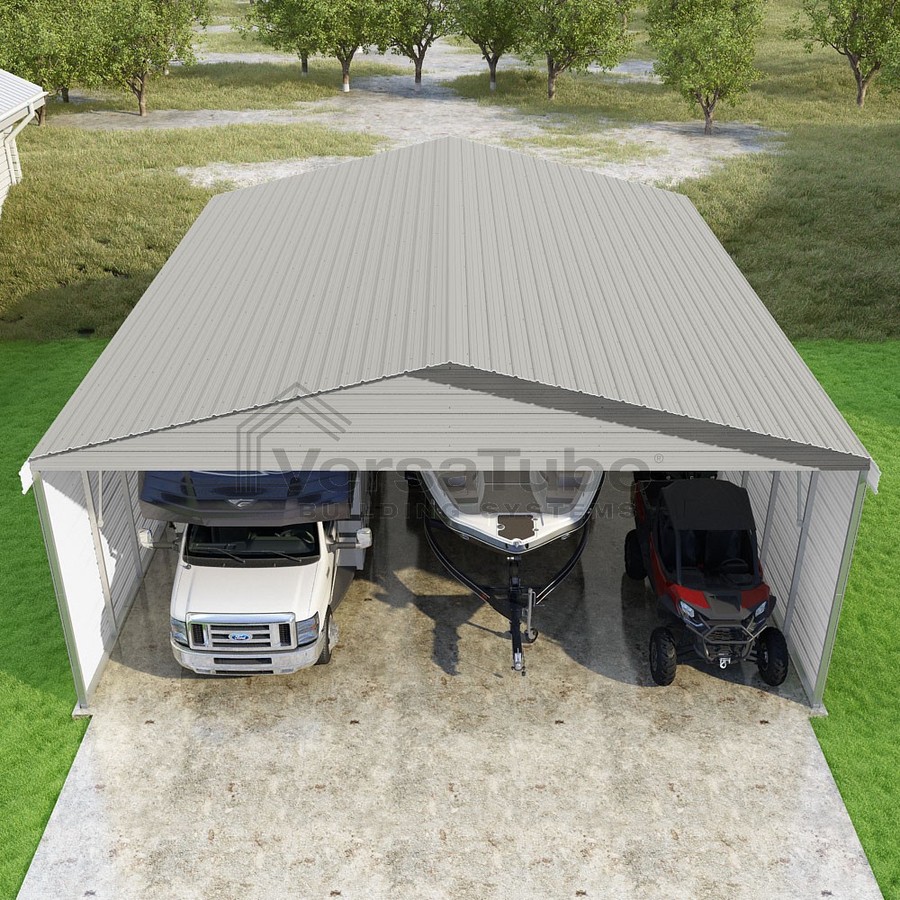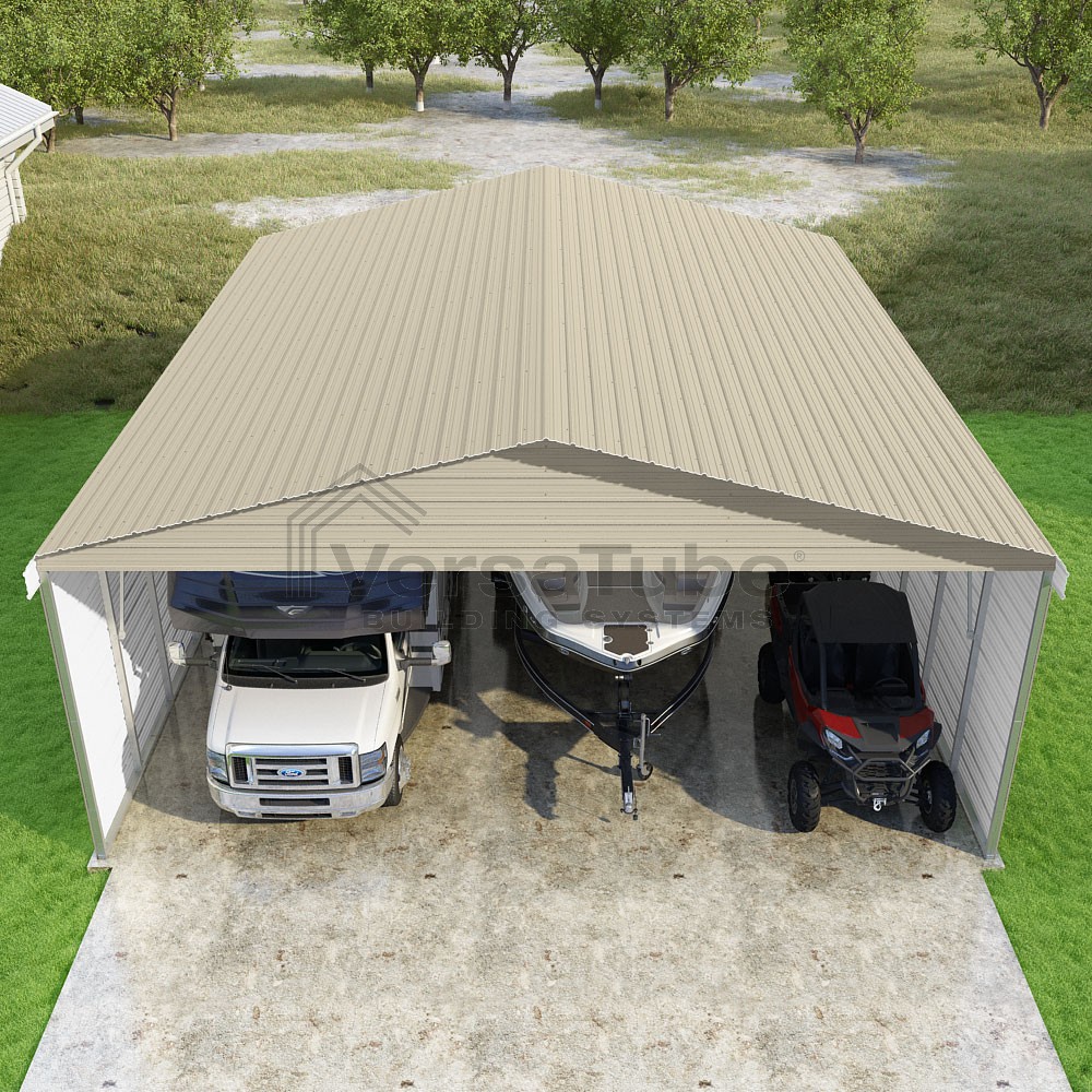 Classic Series DIY carport kit features horizontal application of sheet metal panels with the extra protection of rounded eaves.