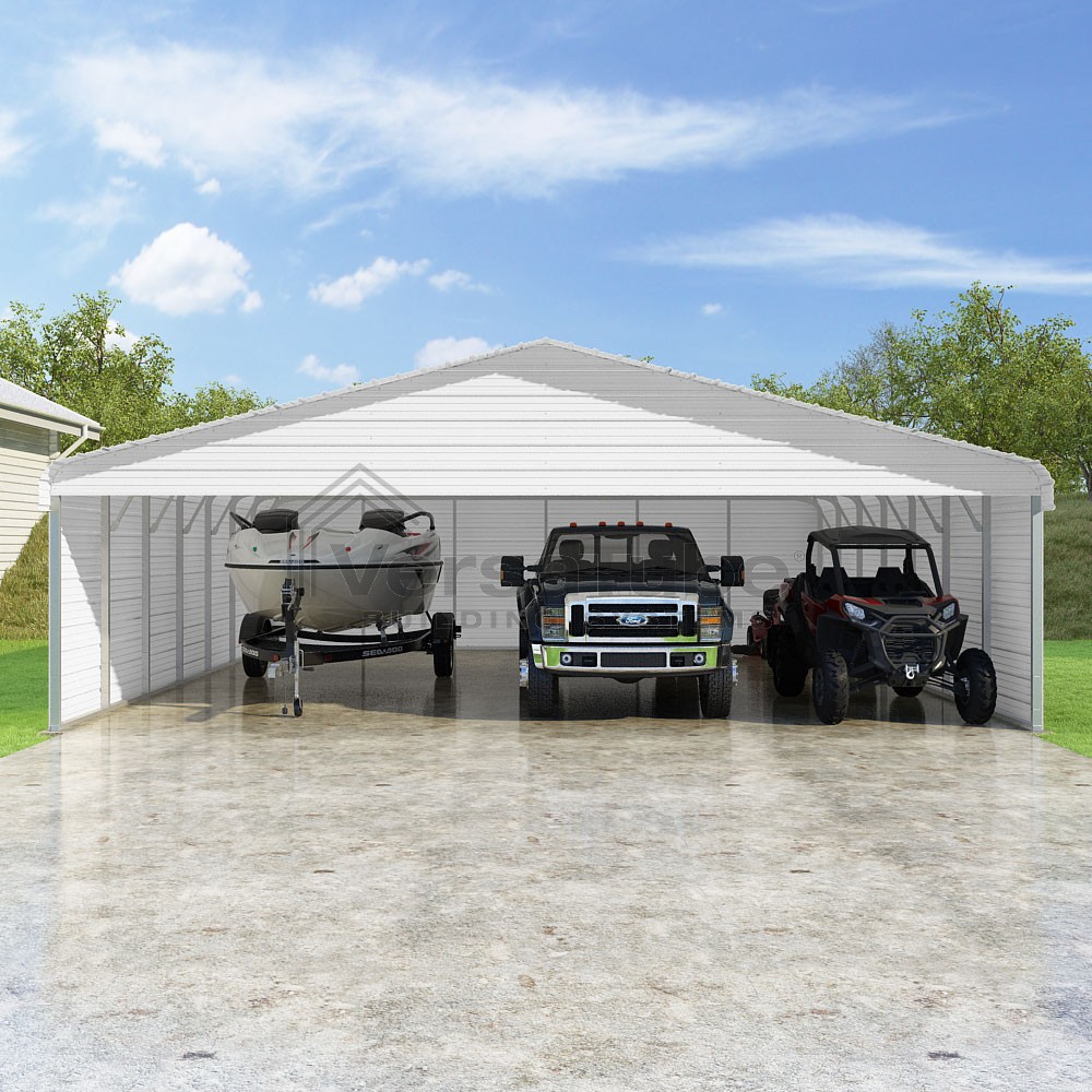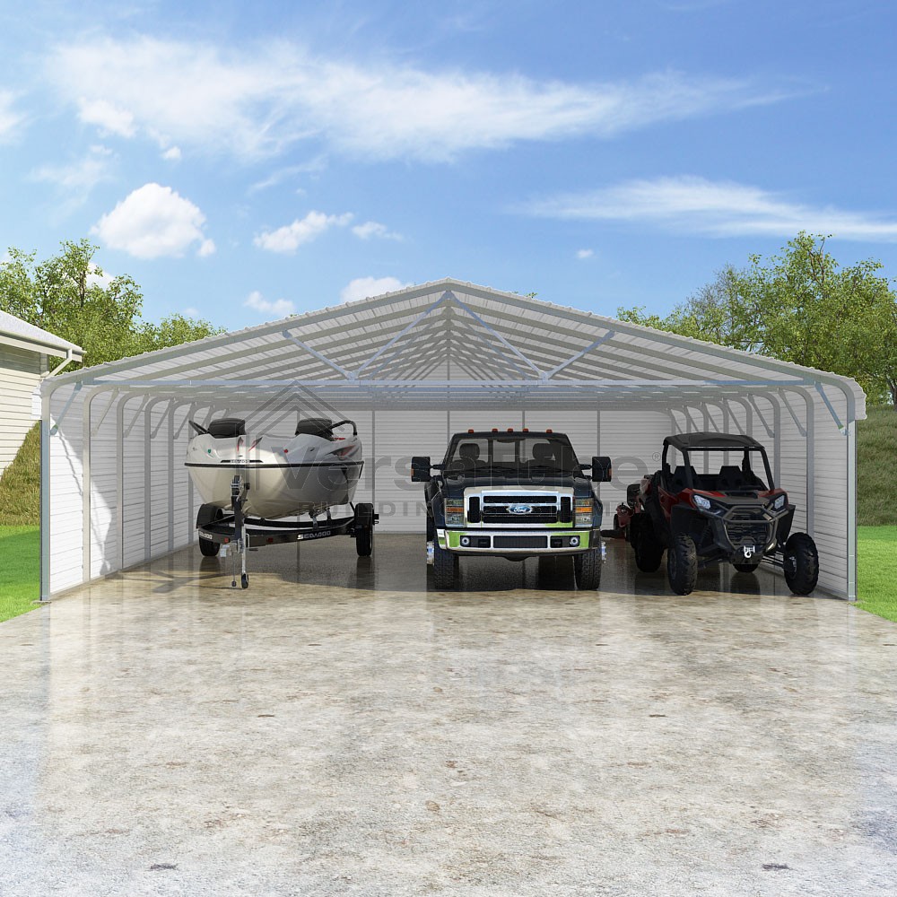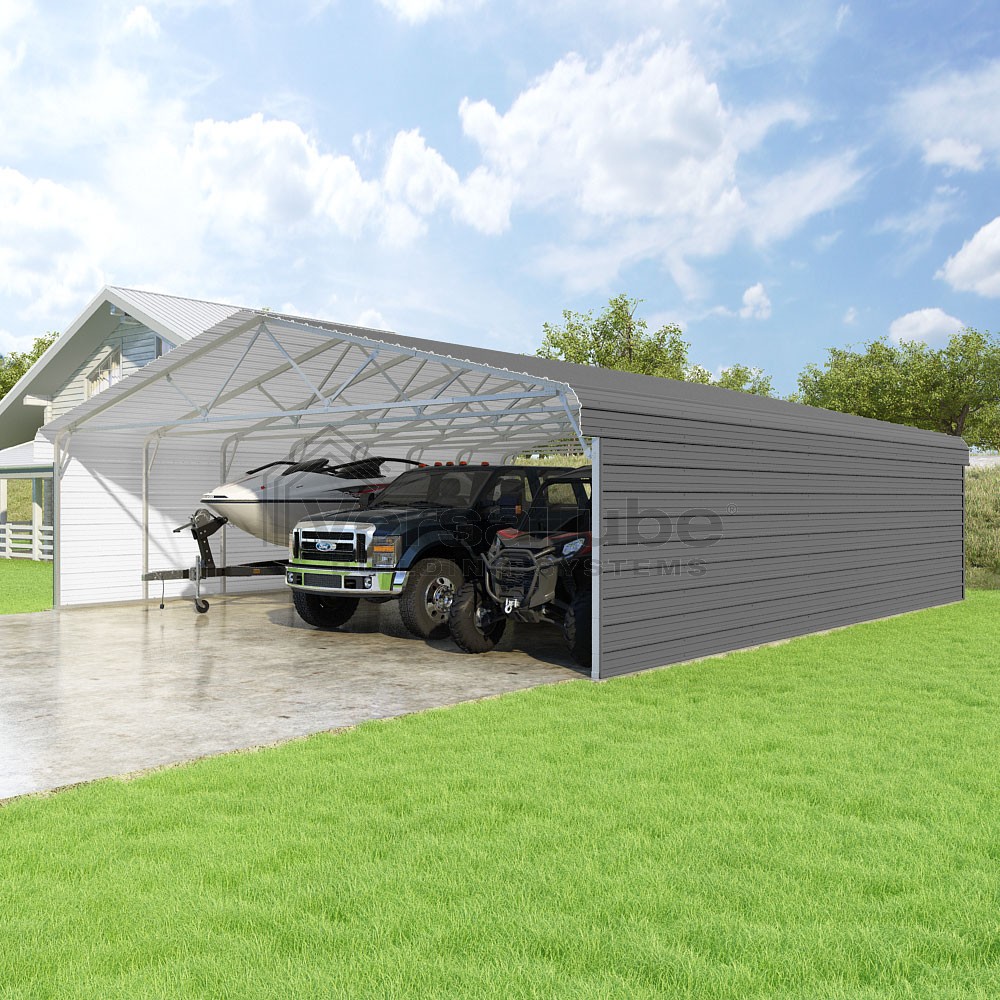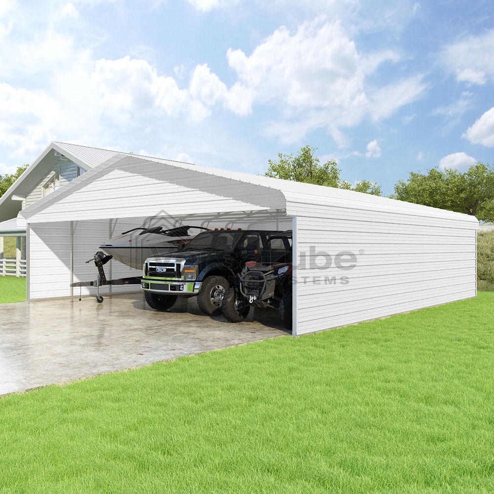Classic Series DIY carport kit features horizontal application of sheet metal panels with the extra protection of rounded eaves.