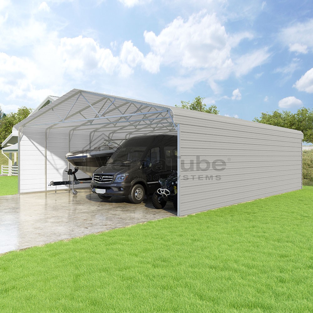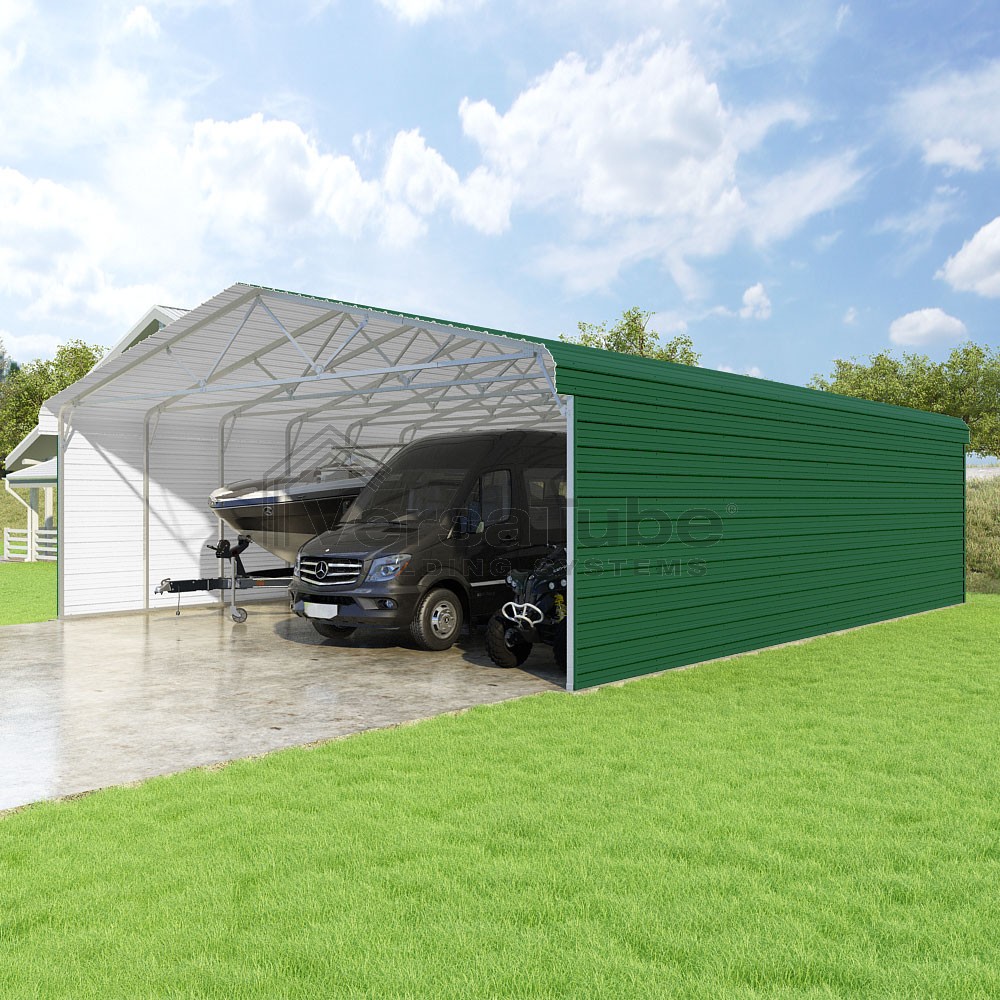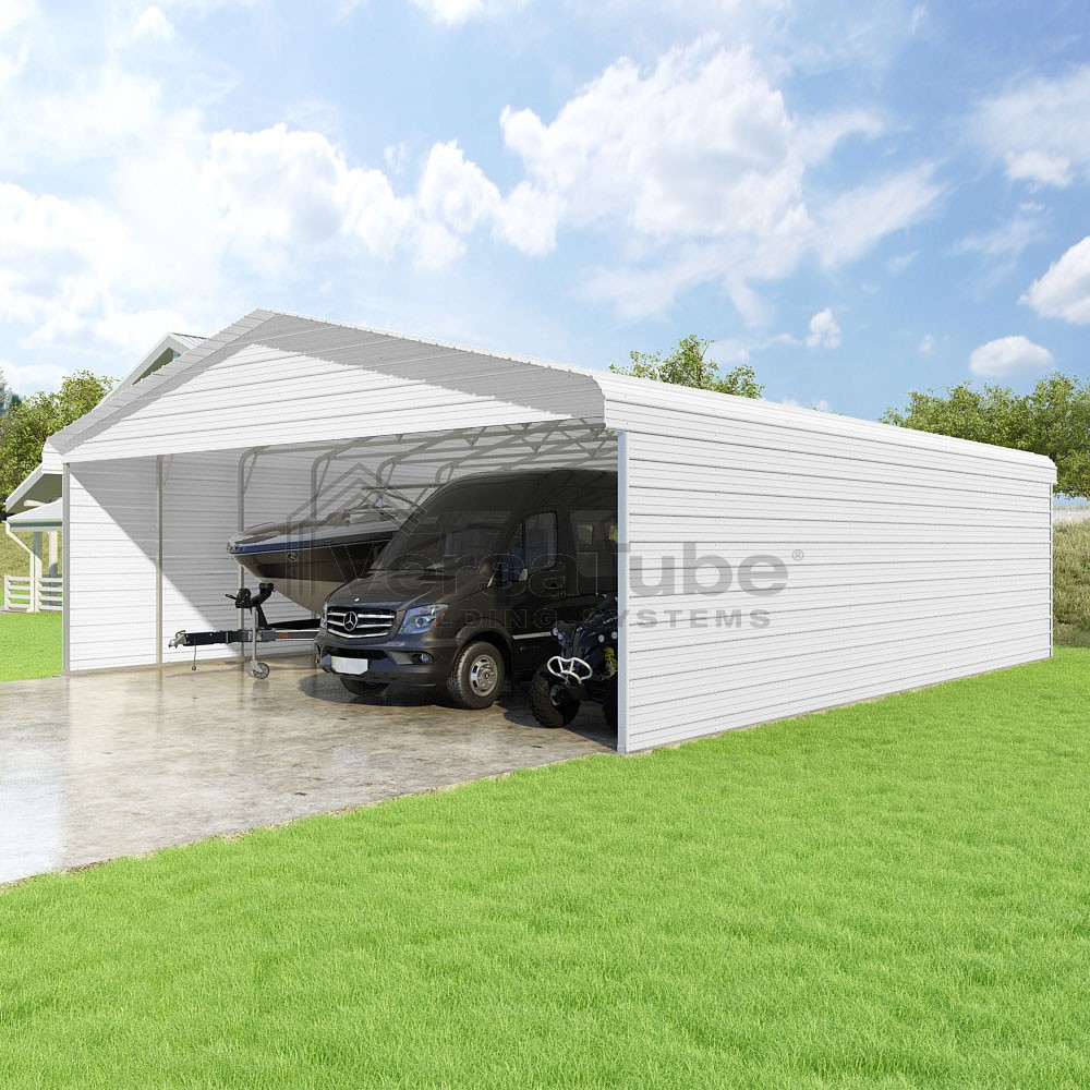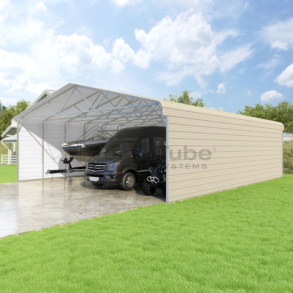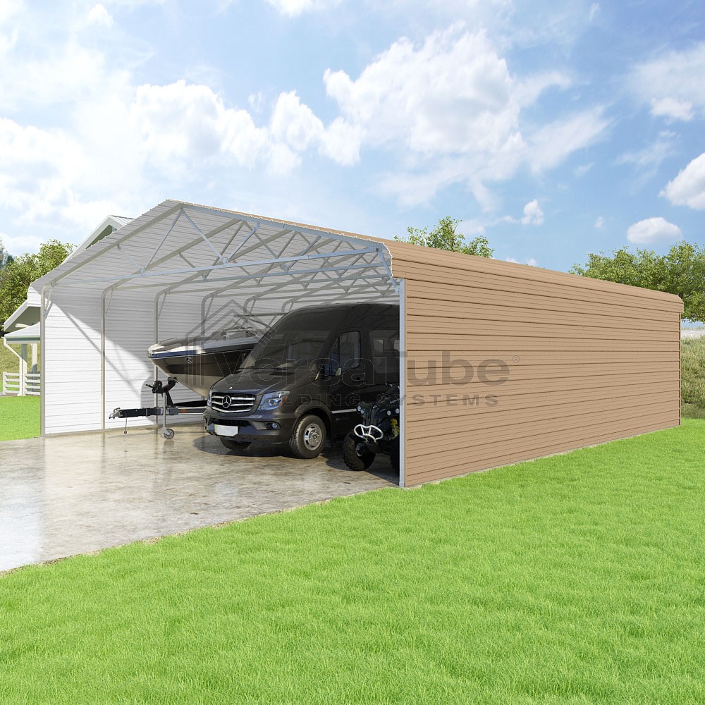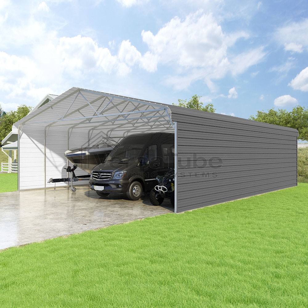 Classic Series DIY carport kit features horizontal application of sheet metal panels with the extra protection of rounded eaves.