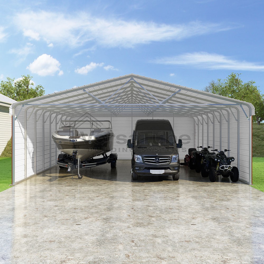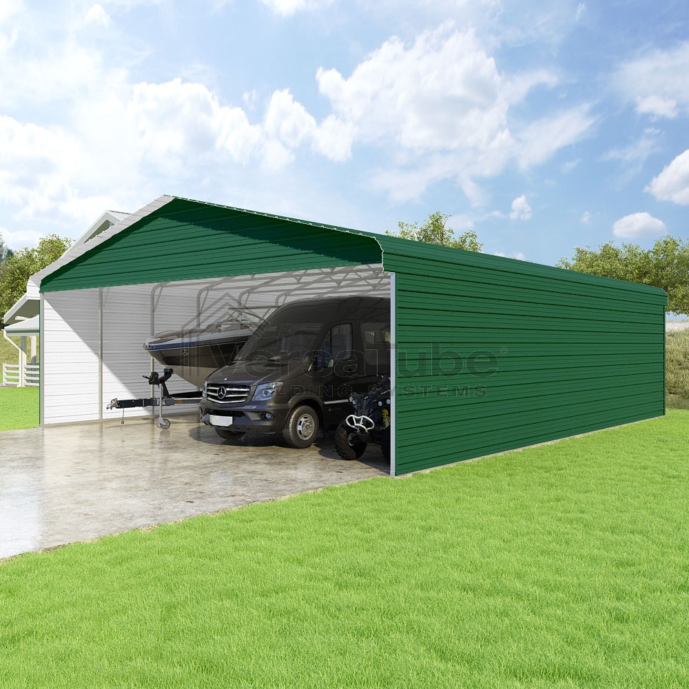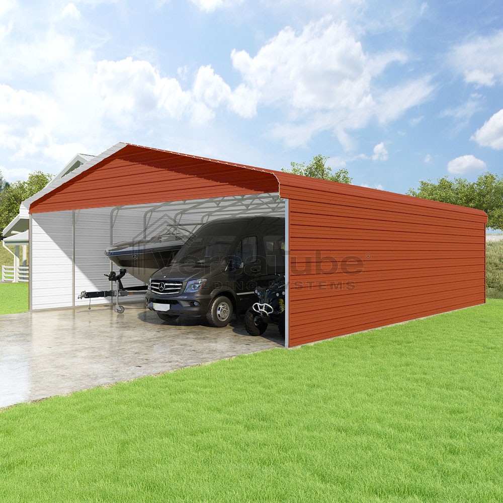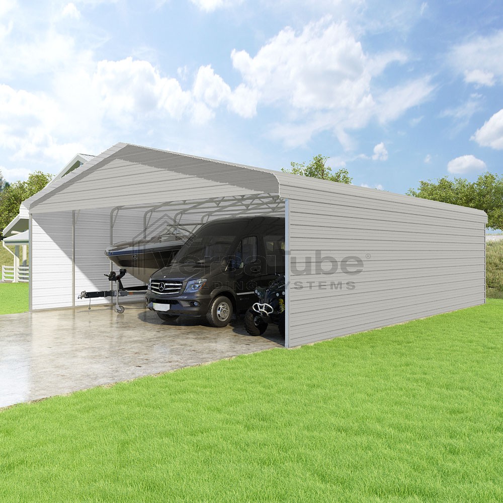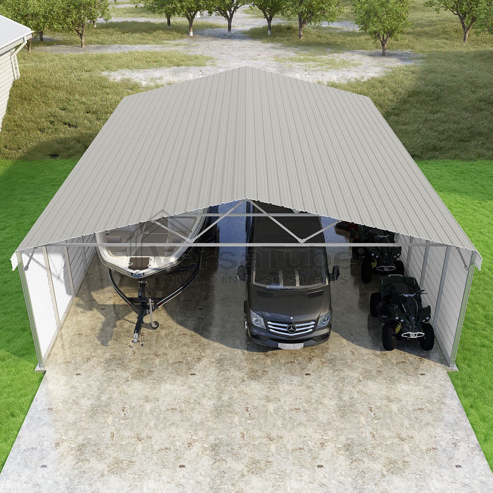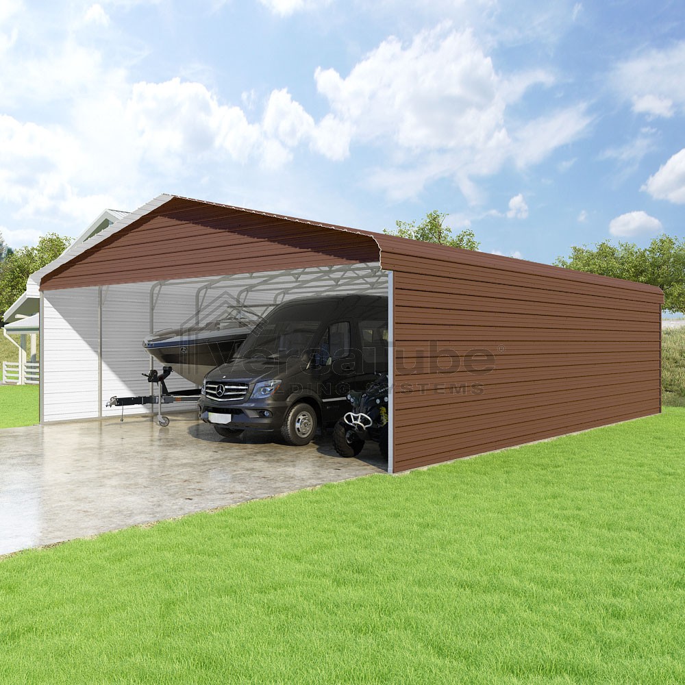 Classic Series DIY carport kit features horizontal application of sheet metal panels with the extra protection of rounded eaves.
