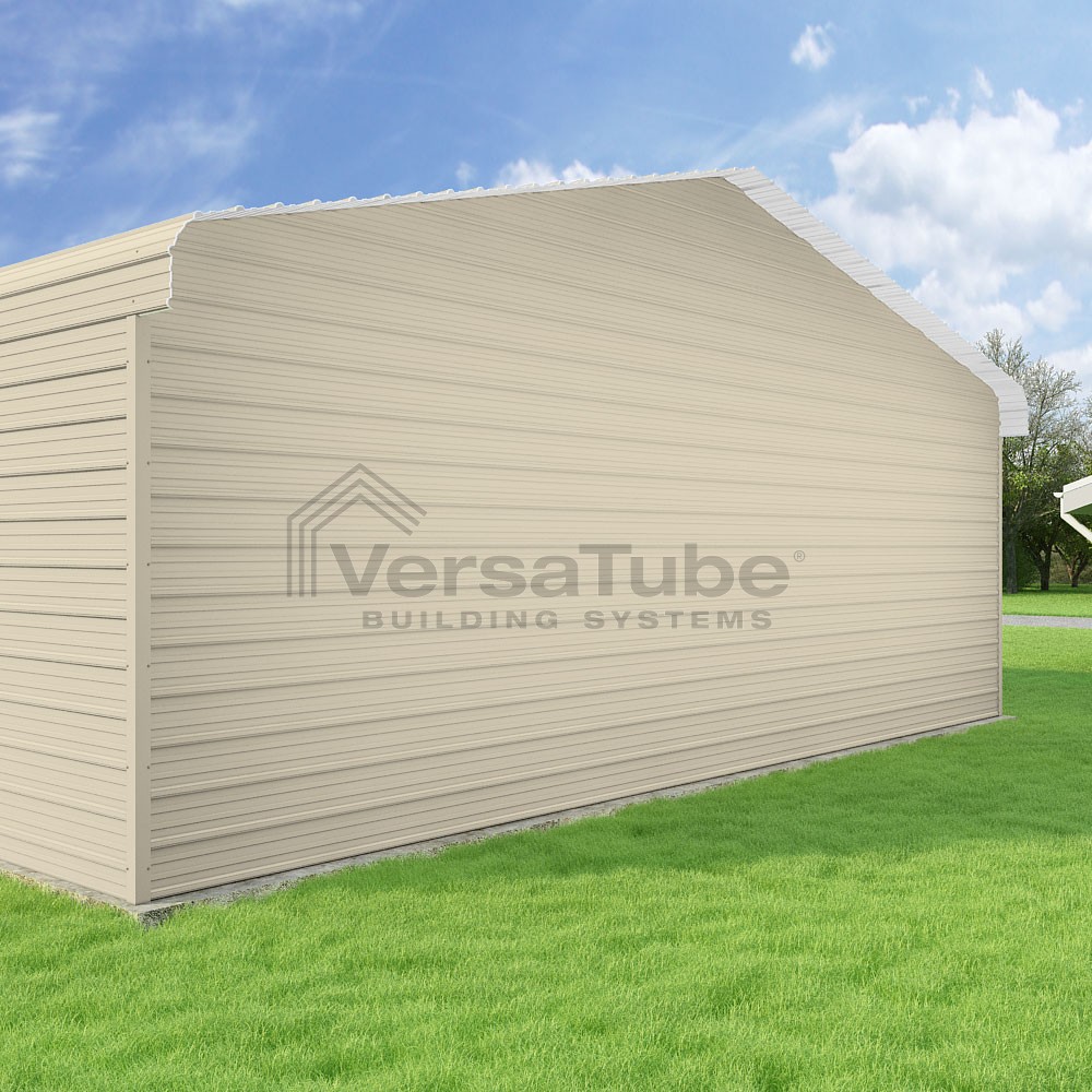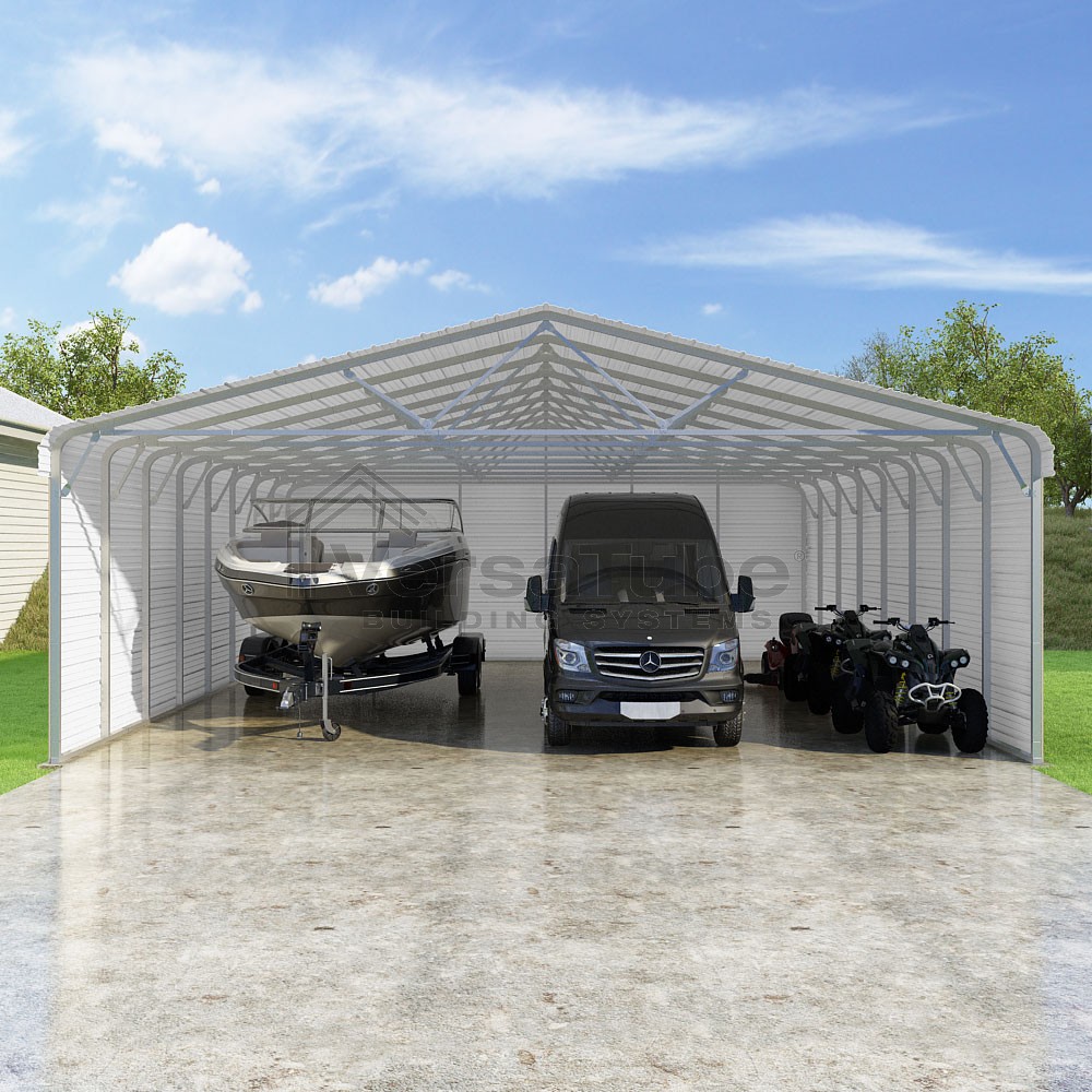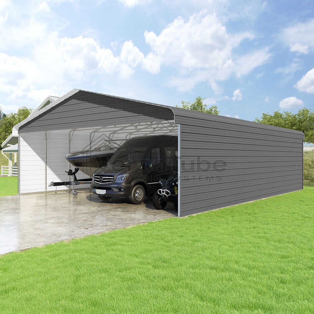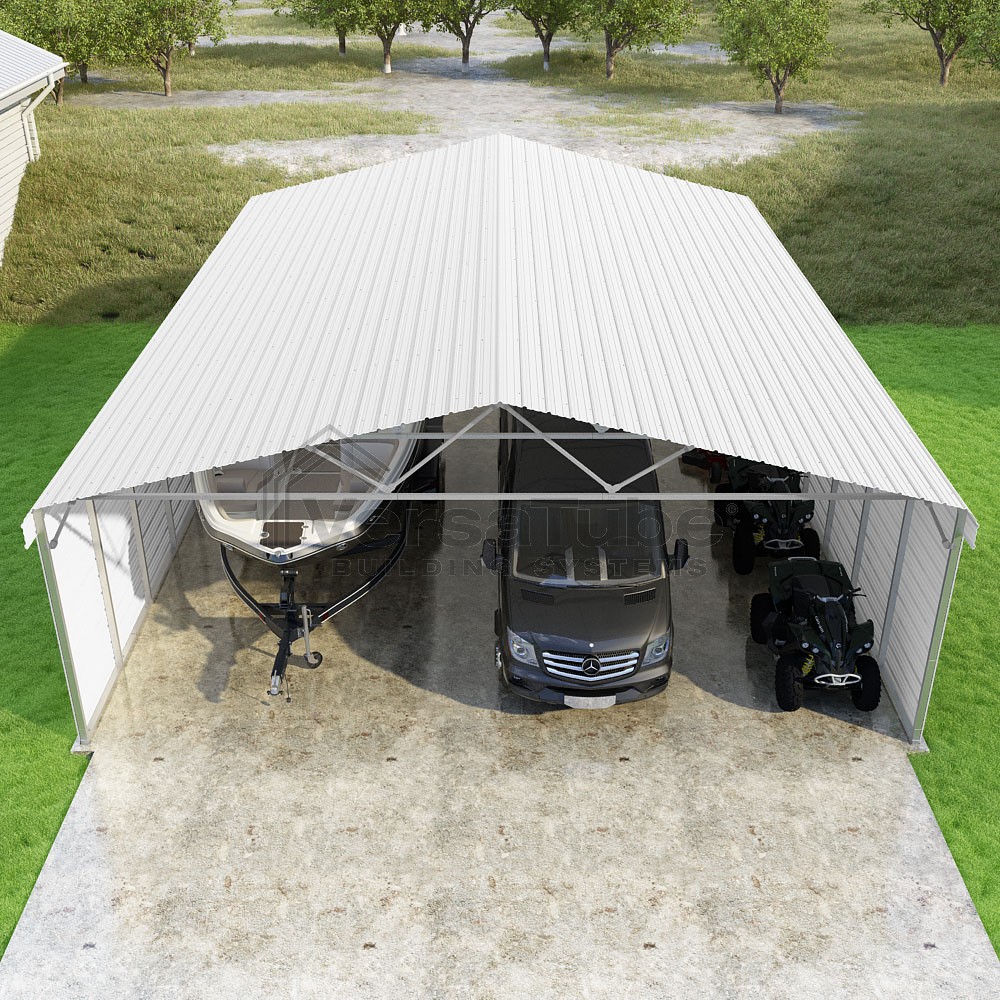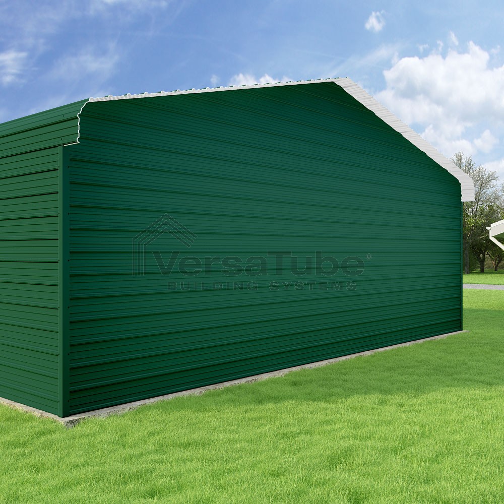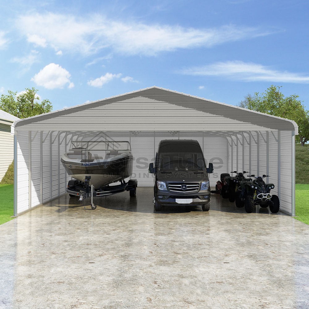 Classic Series DIY carport kit features horizontal application of sheet metal panels with the extra protection of rounded eaves.