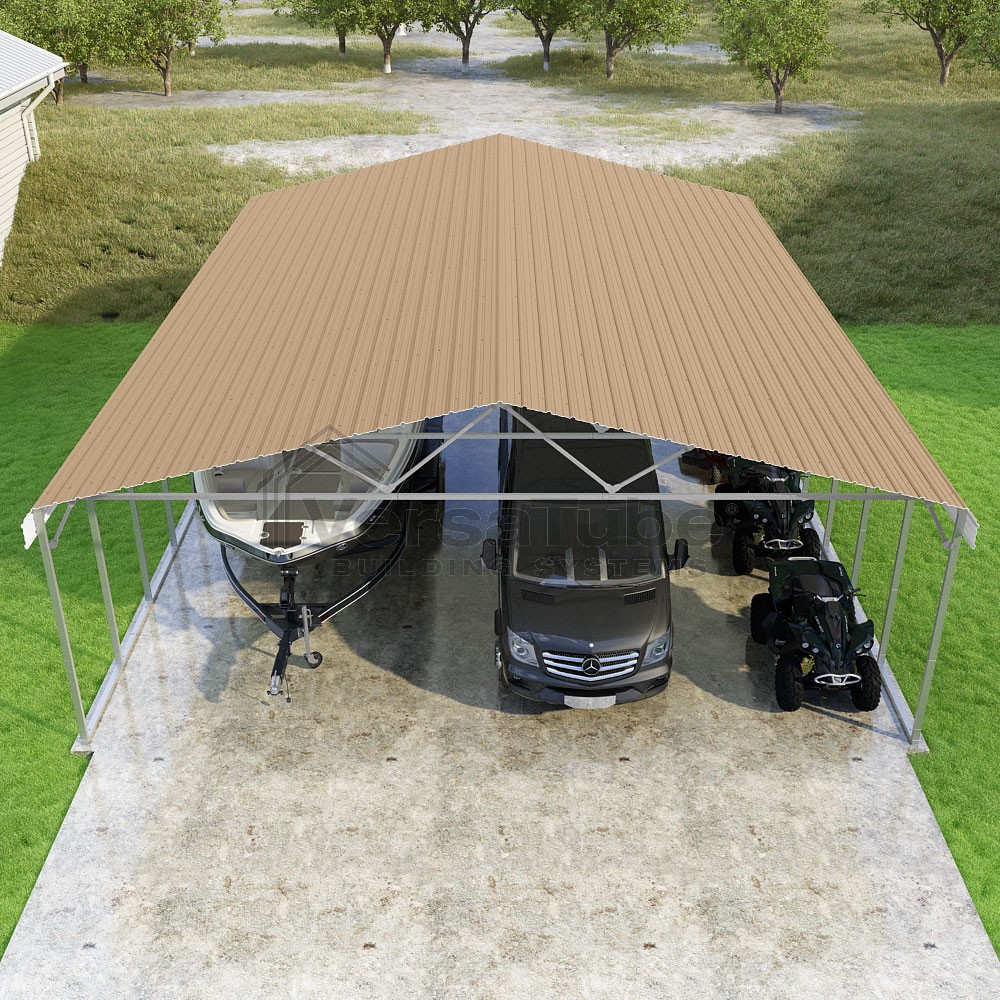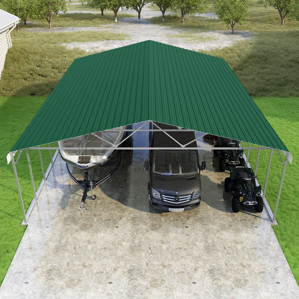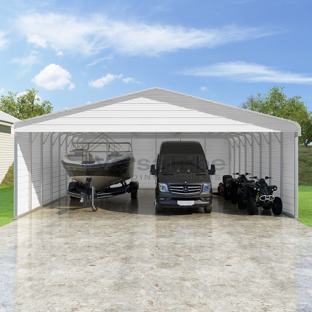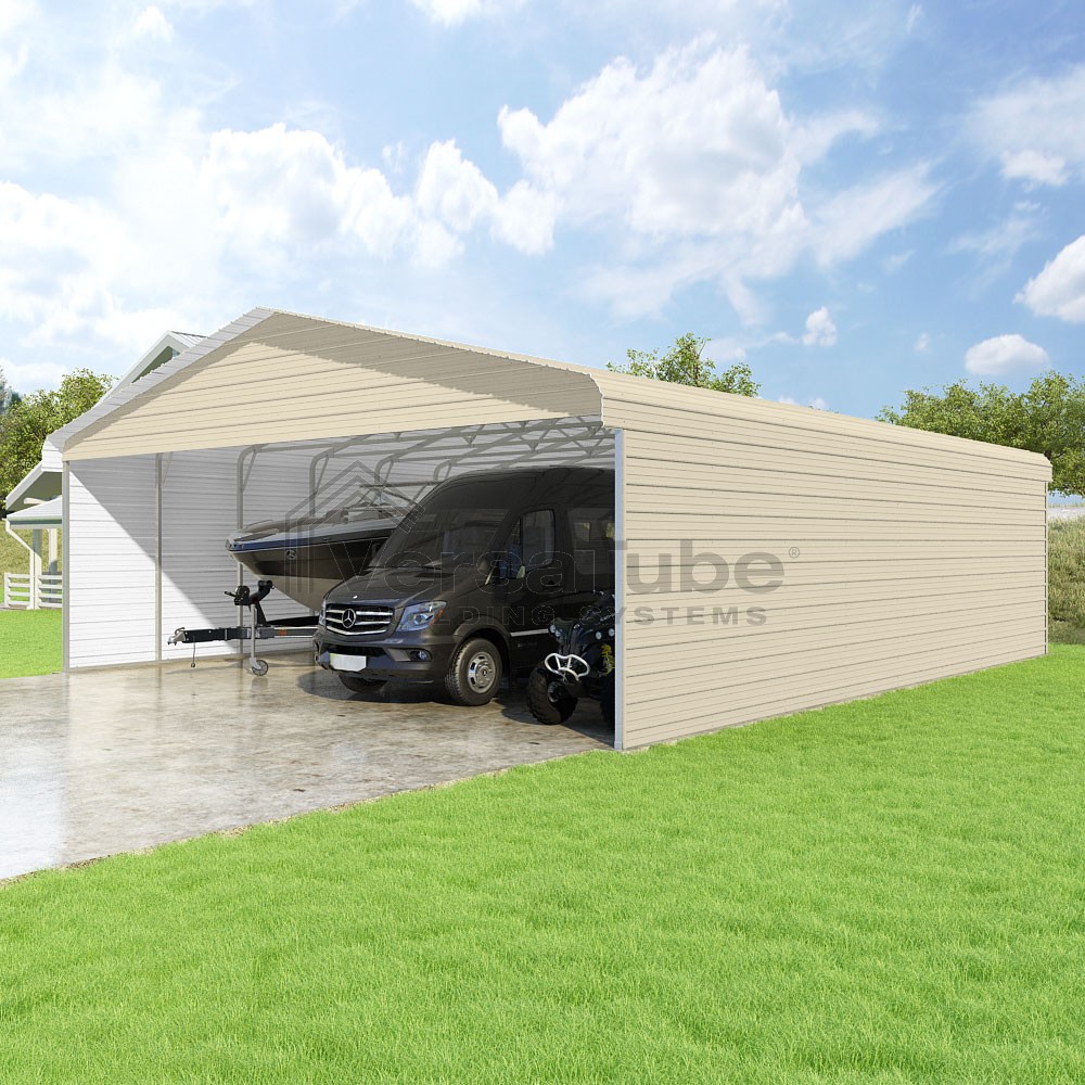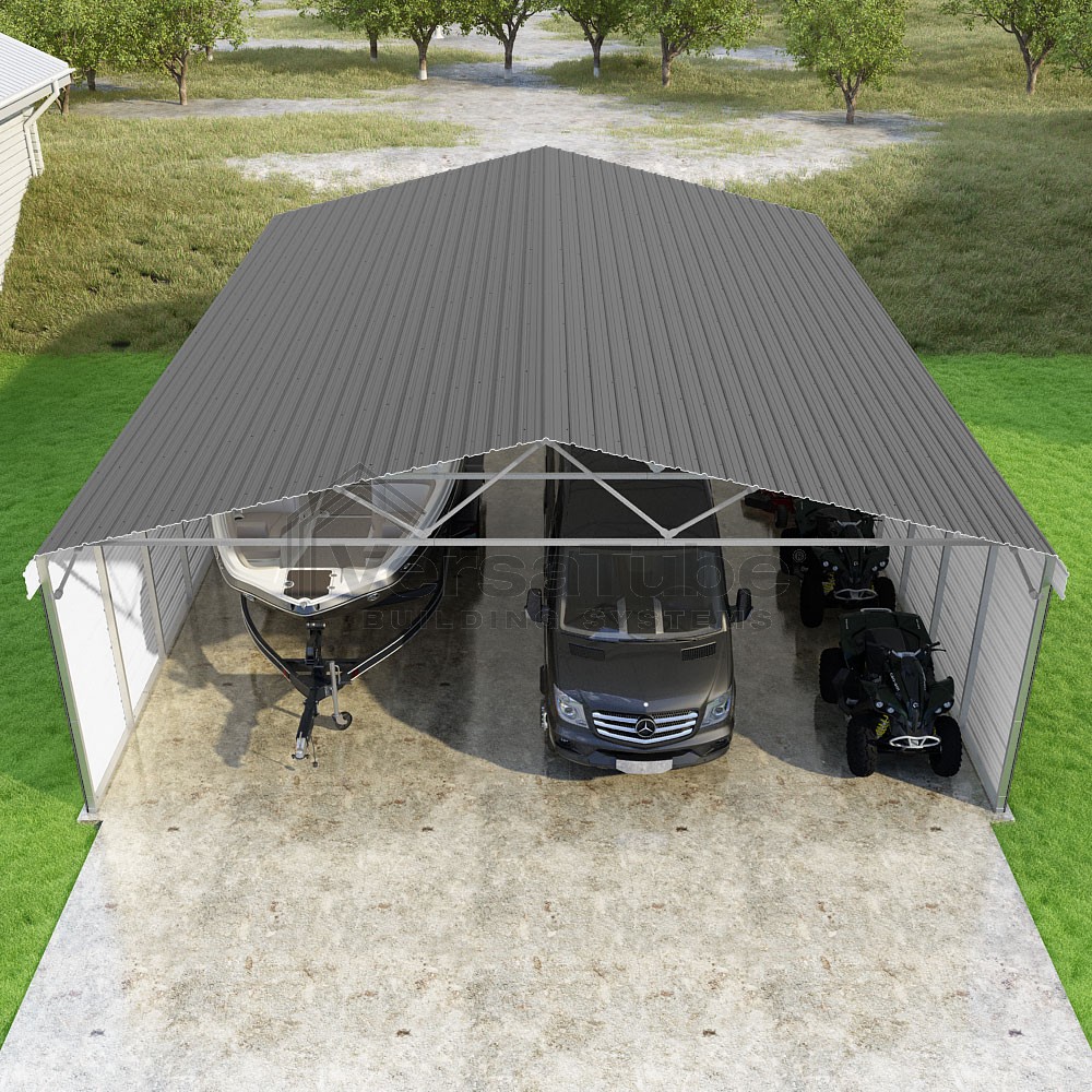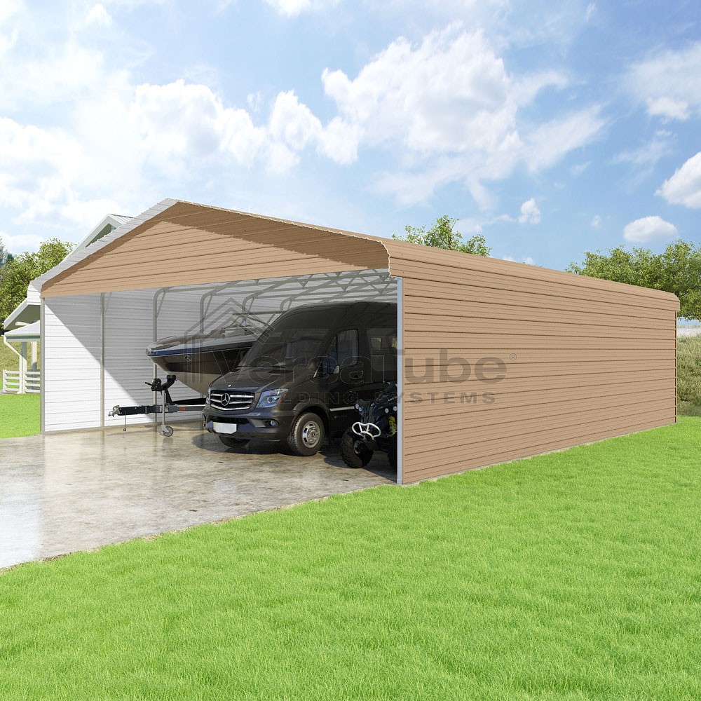 Classic Series DIY carport kit features horizontal application of sheet metal panels with the extra protection of rounded eaves.