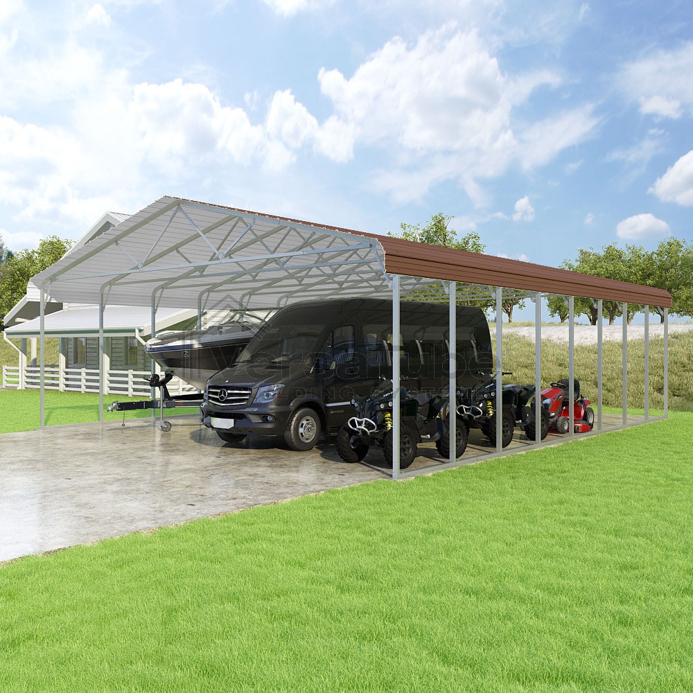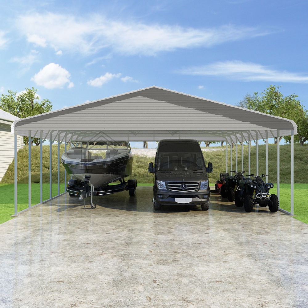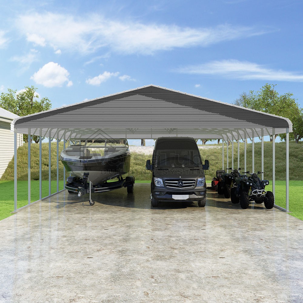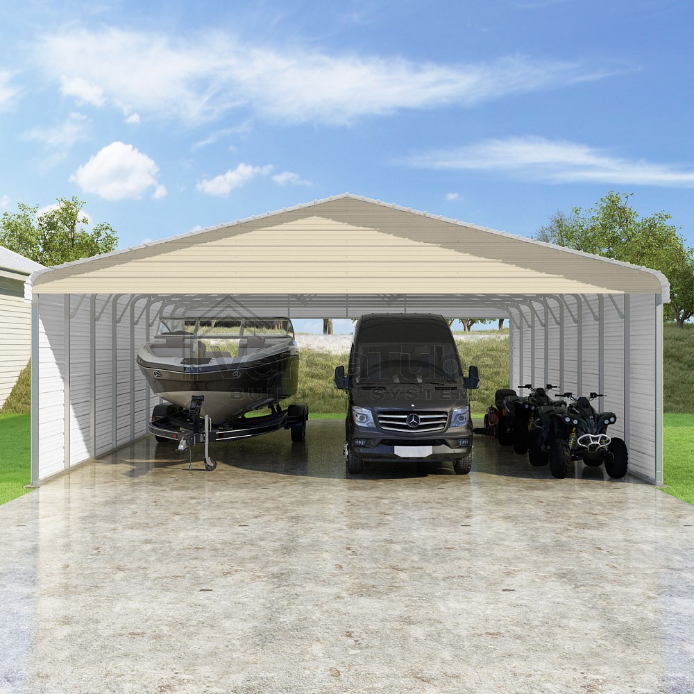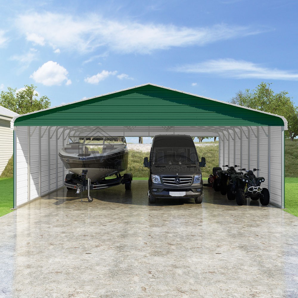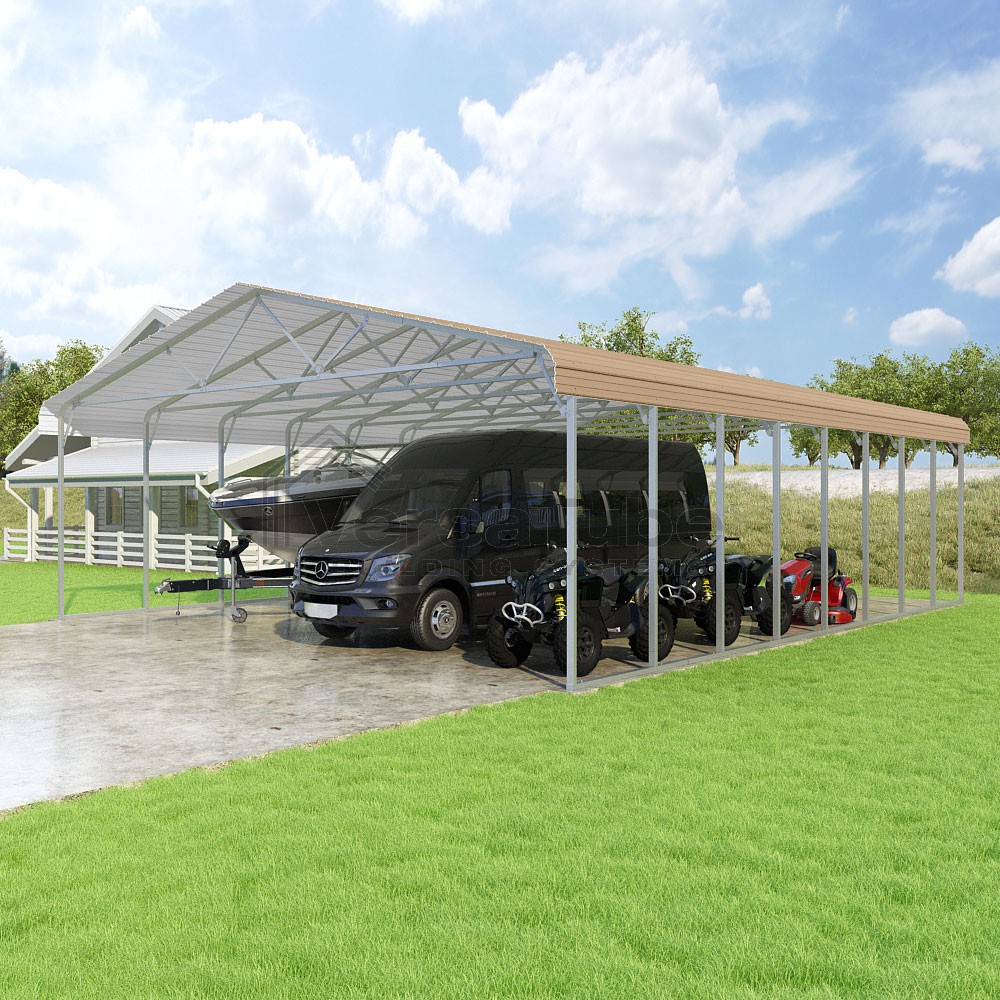 Classic Series DIY carport kit features horizontal application of sheet metal panels with the extra protection of rounded eaves.