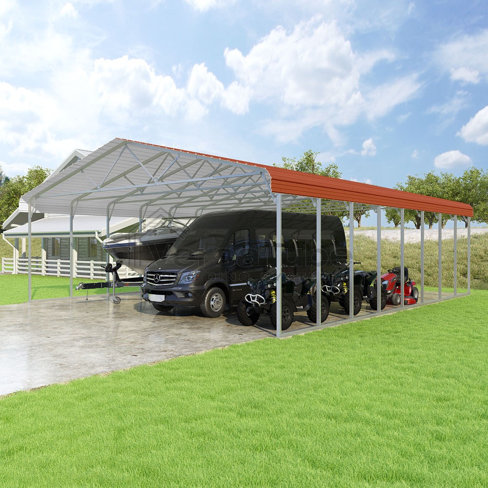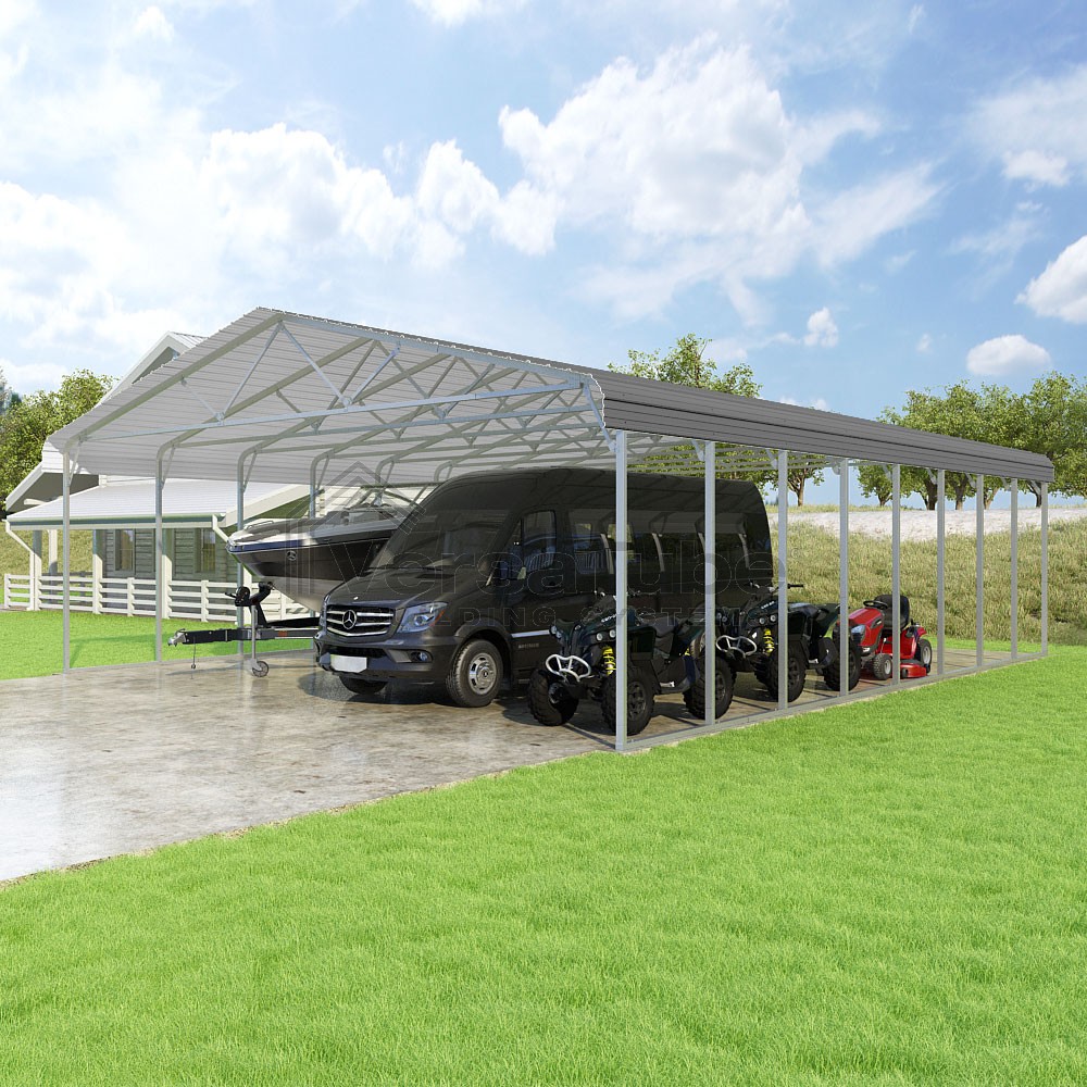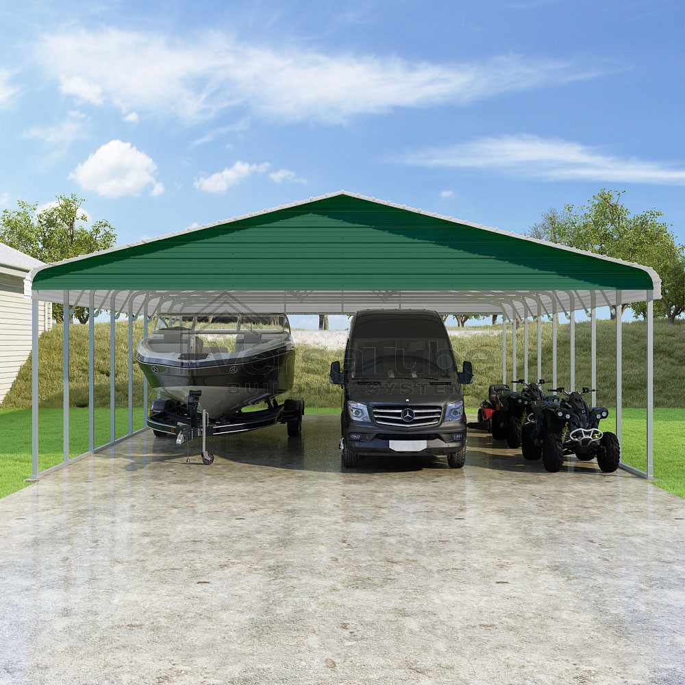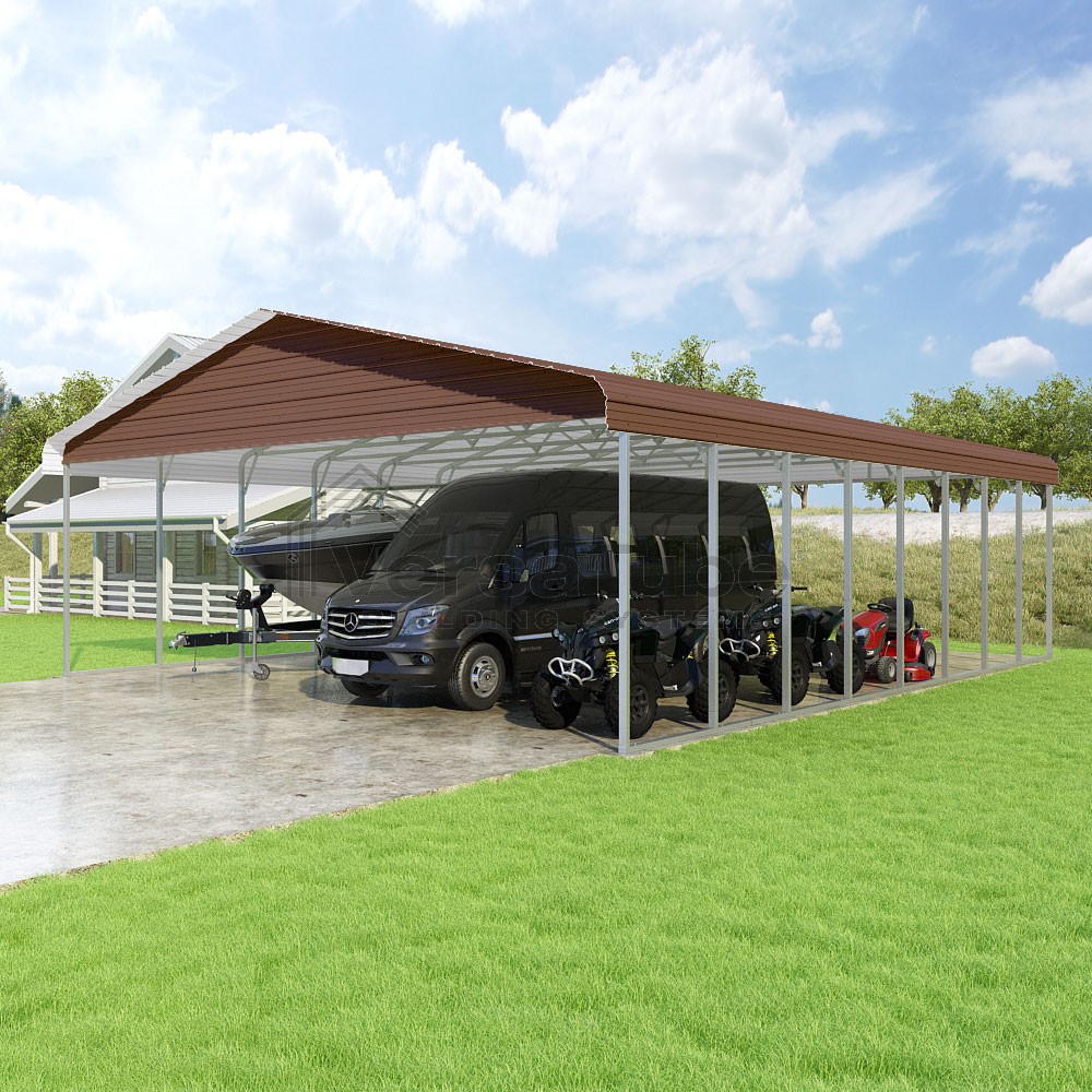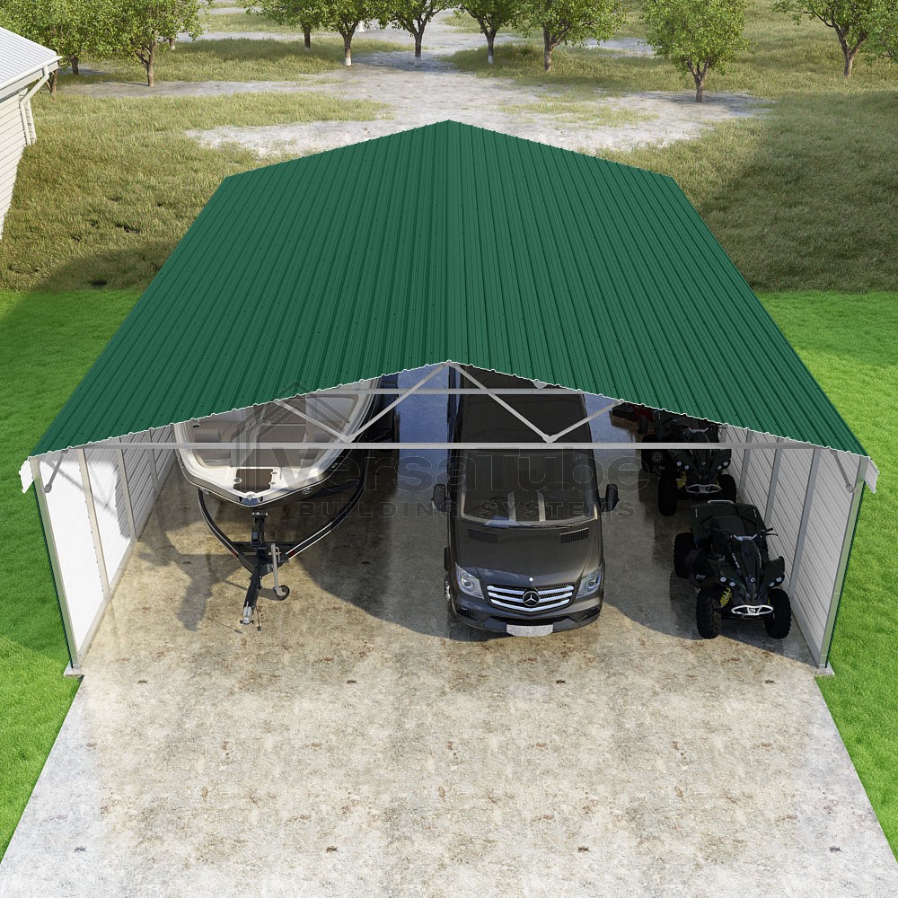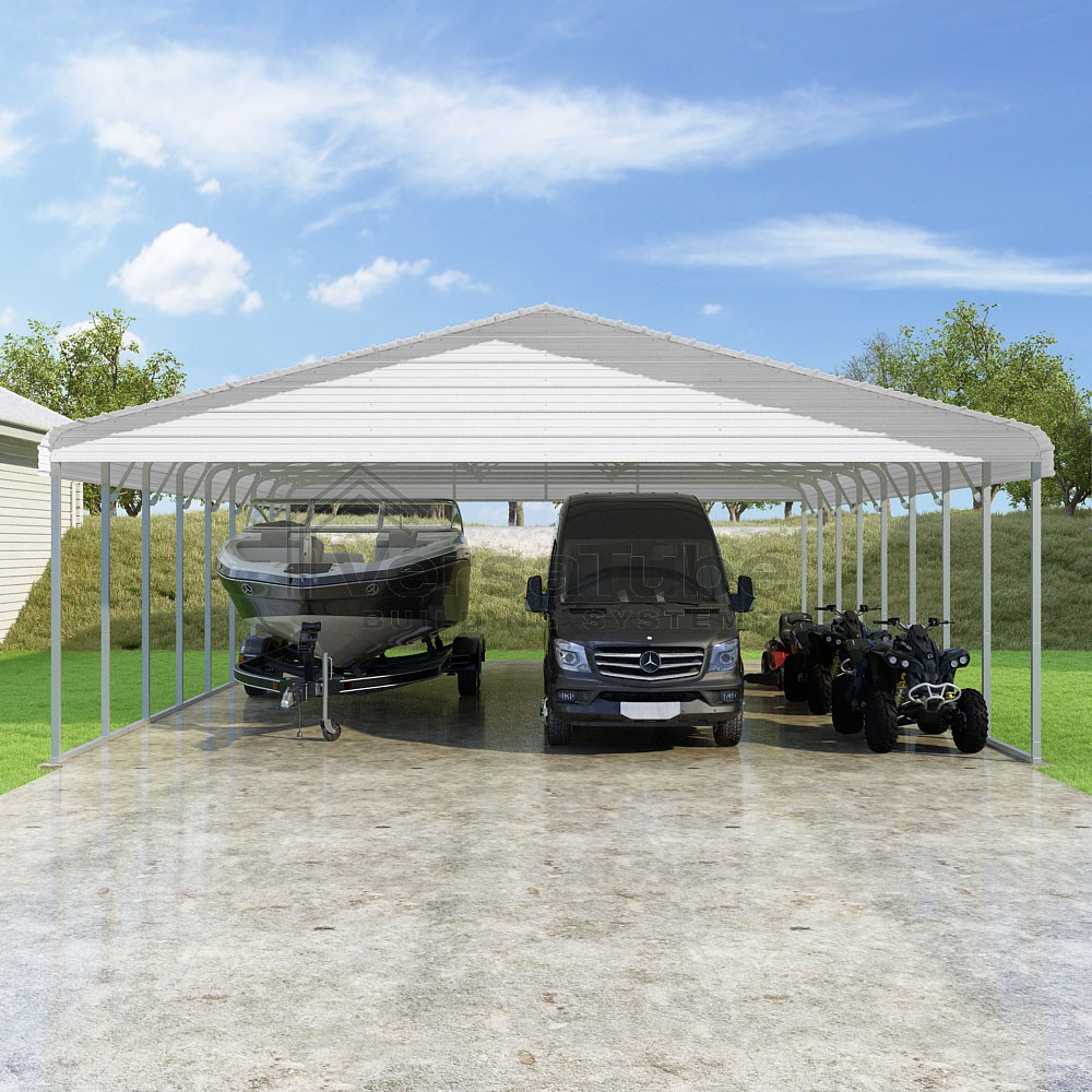 Classic Series DIY carport kit features horizontal application of sheet metal panels with the extra protection of rounded eaves.