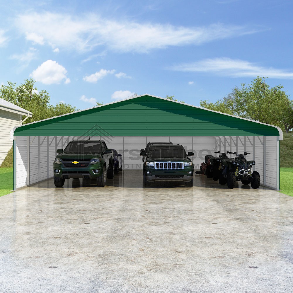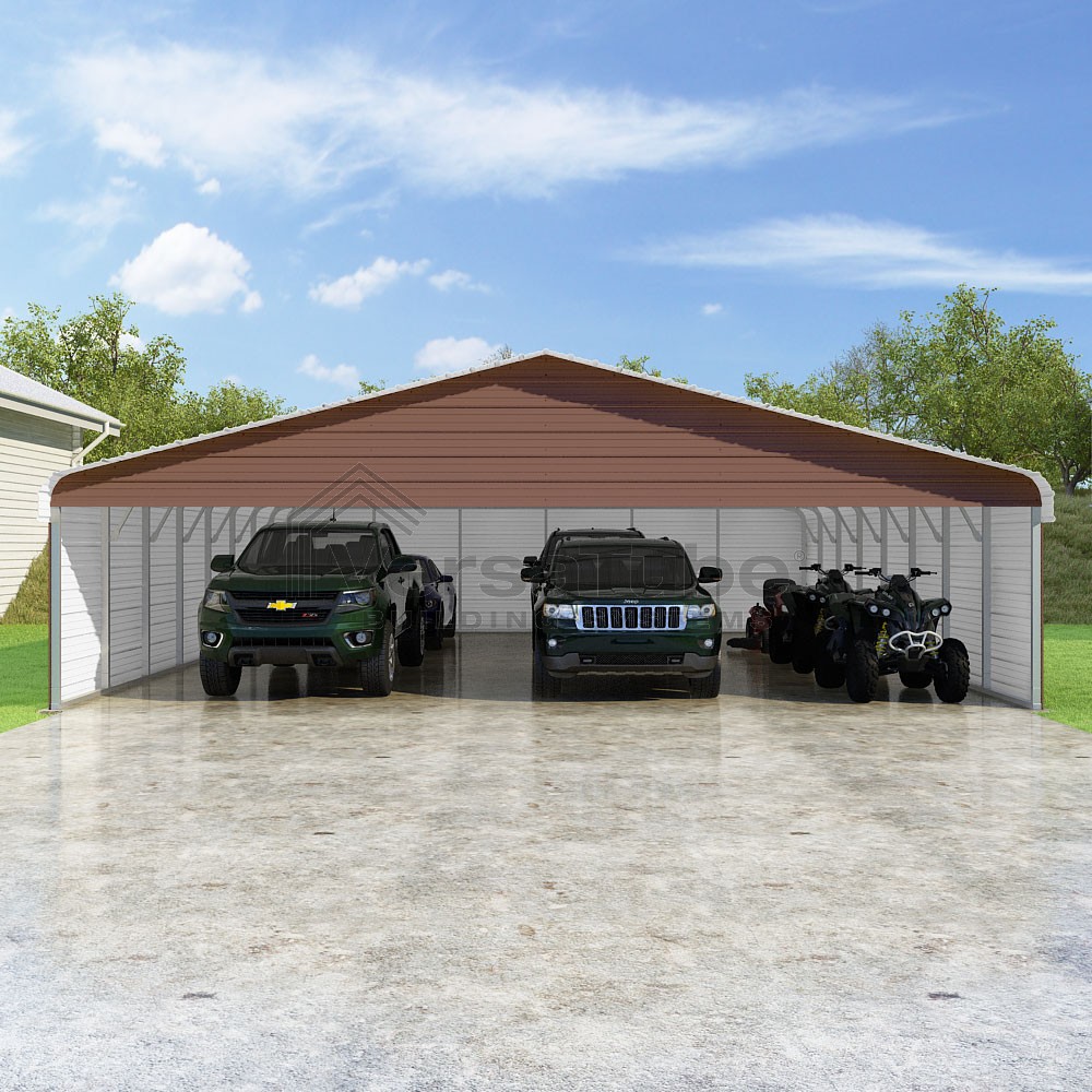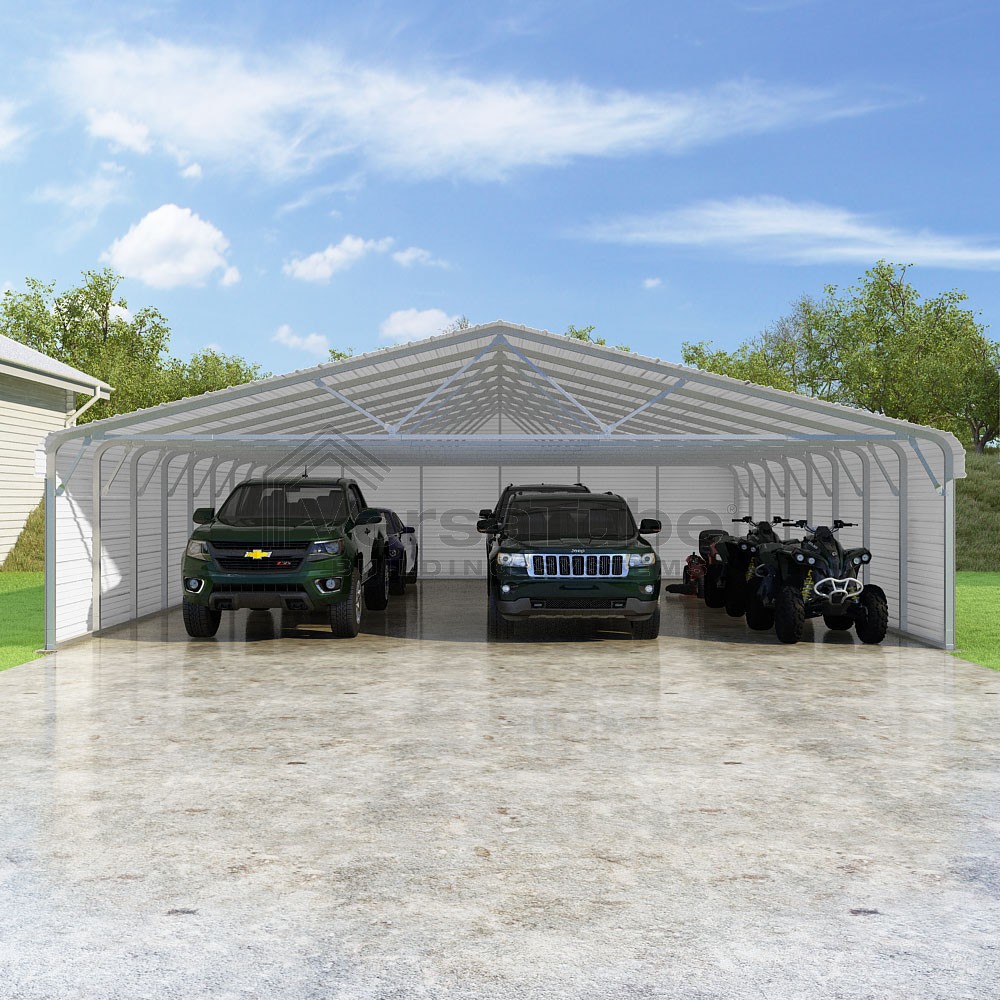 Classic Series DIY carport kit features horizontal application of sheet metal panels with the extra protection of rounded eaves.