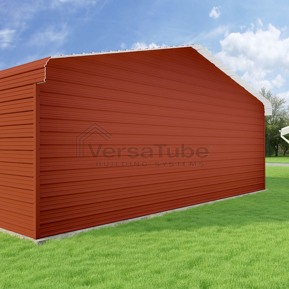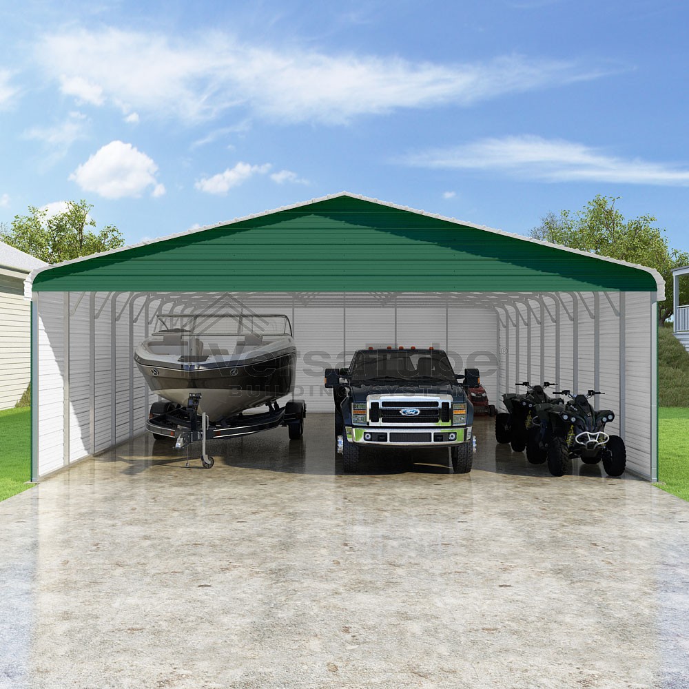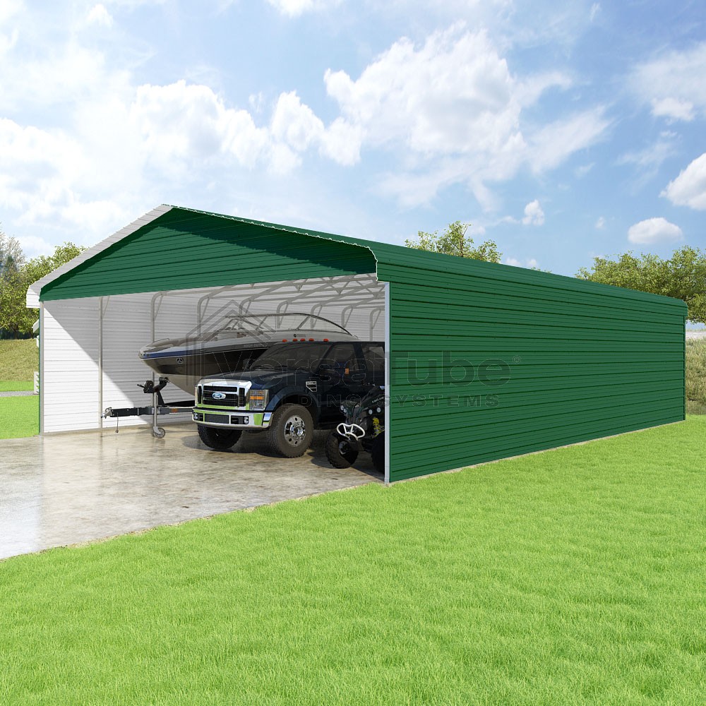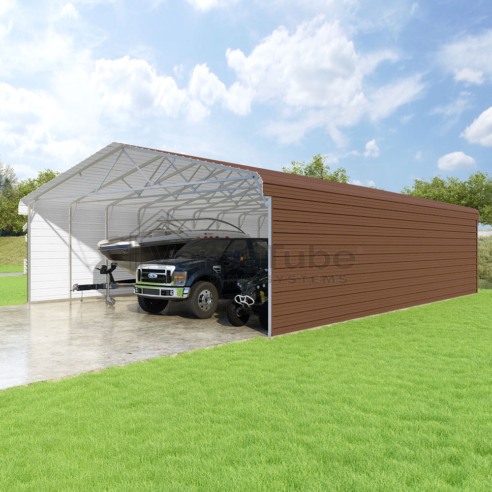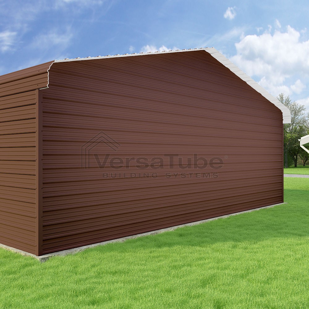 Classic Series DIY carport kit features horizontal application of sheet metal panels with the extra protection of rounded eaves.