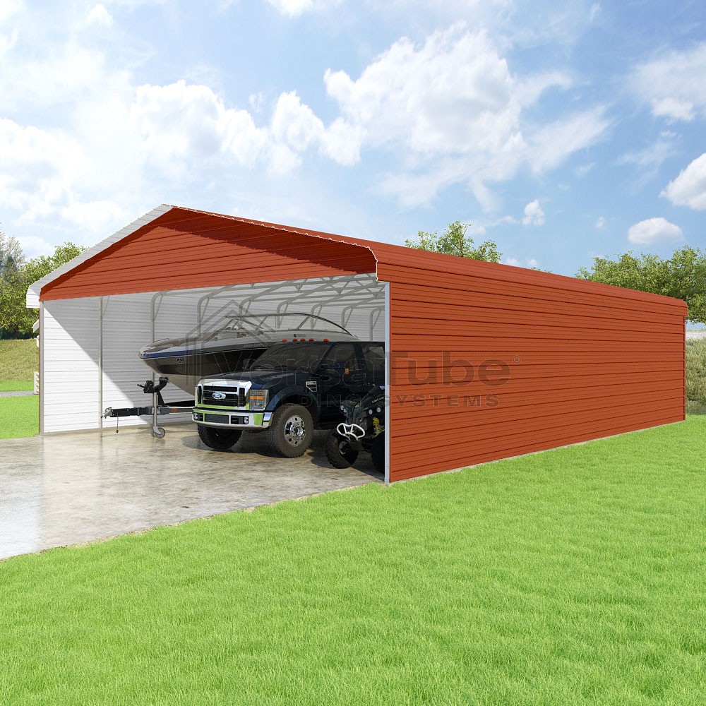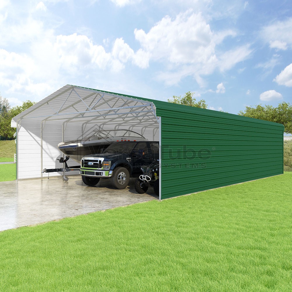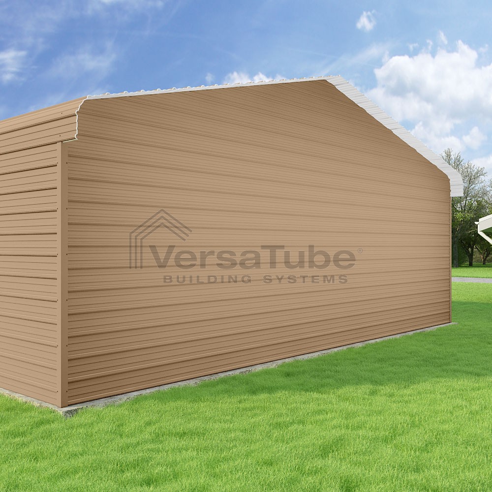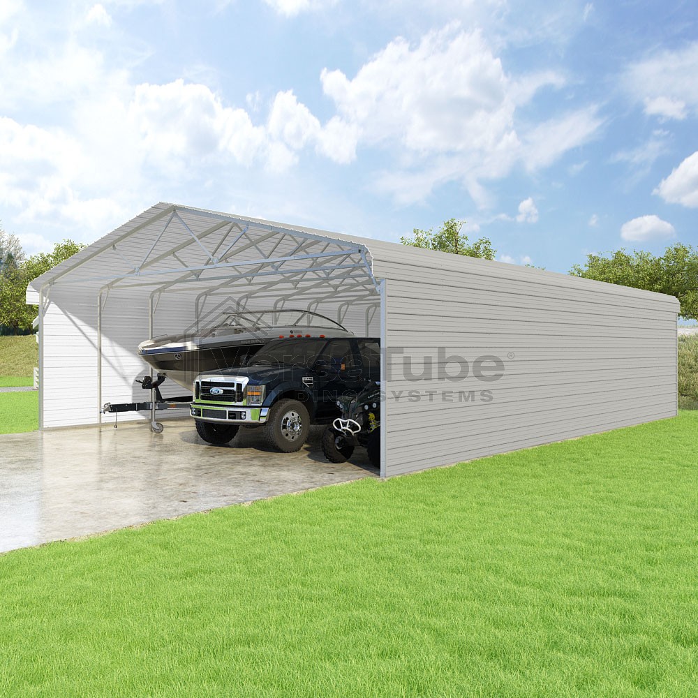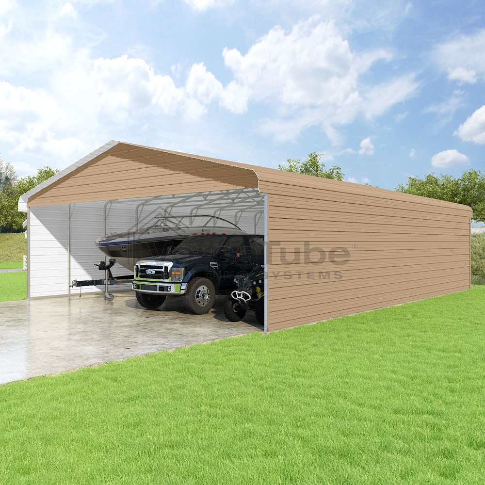 Classic Series DIY carport kit features horizontal application of sheet metal panels with the extra protection of rounded eaves.