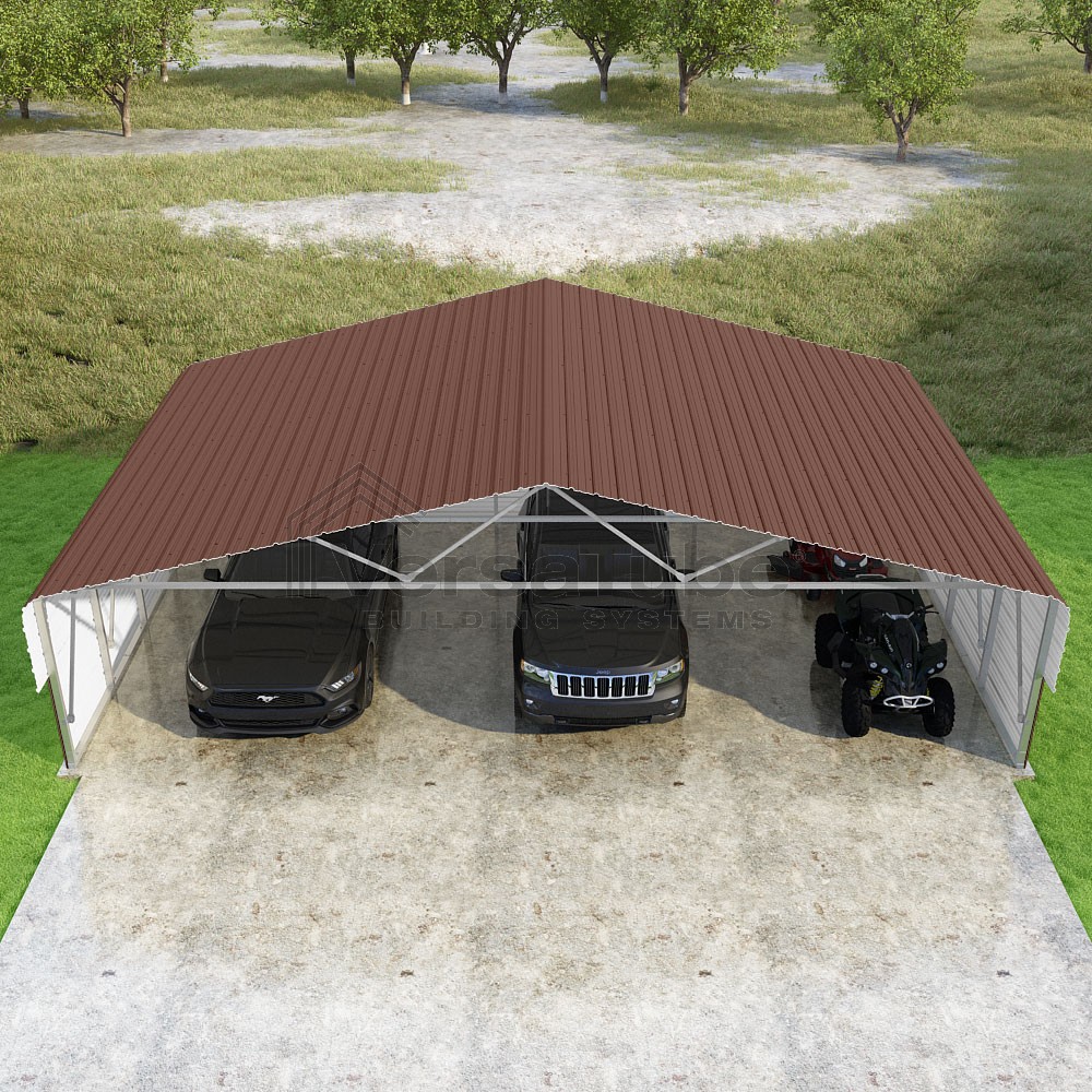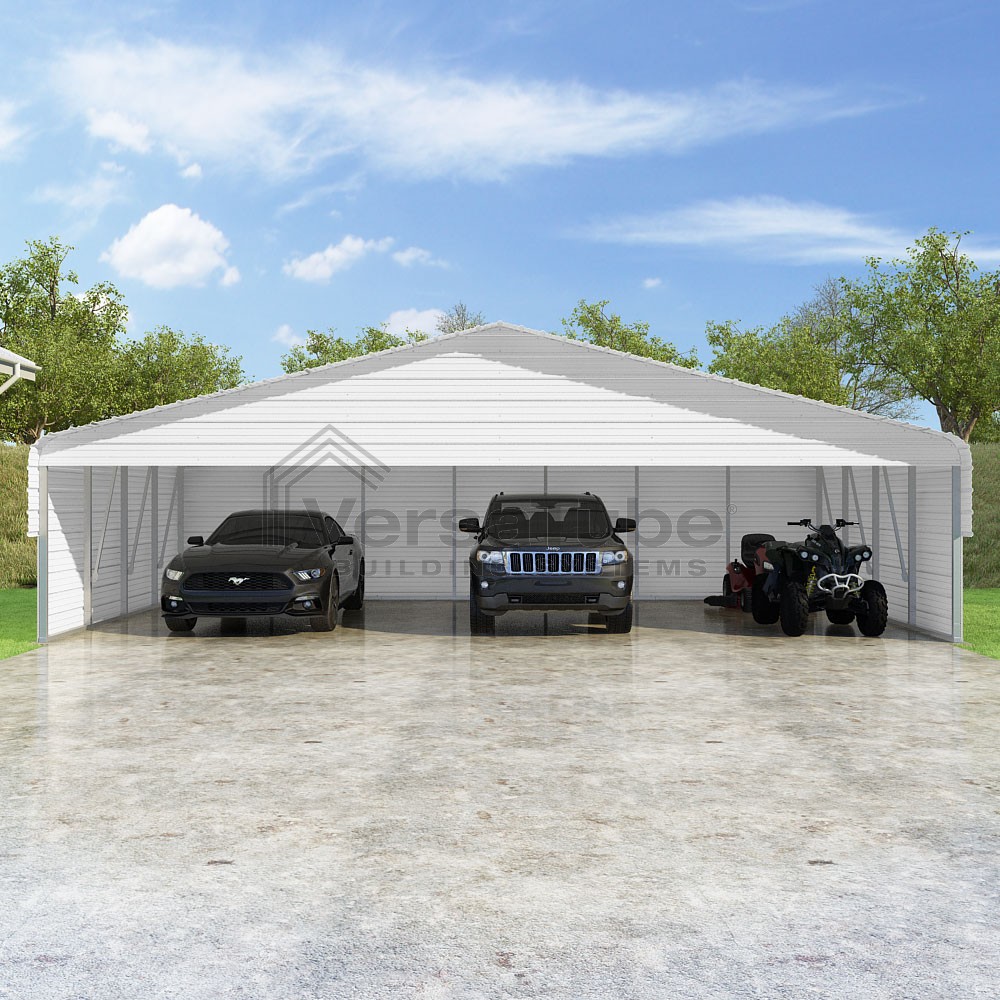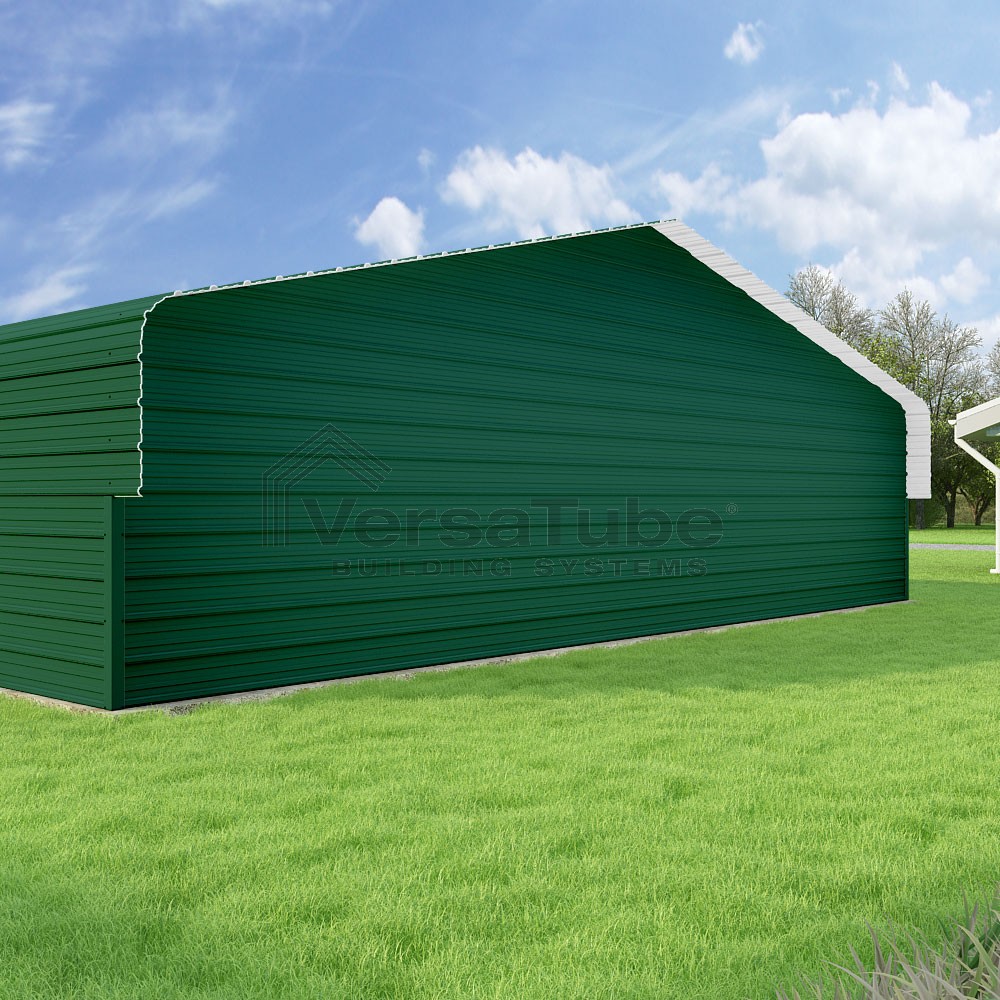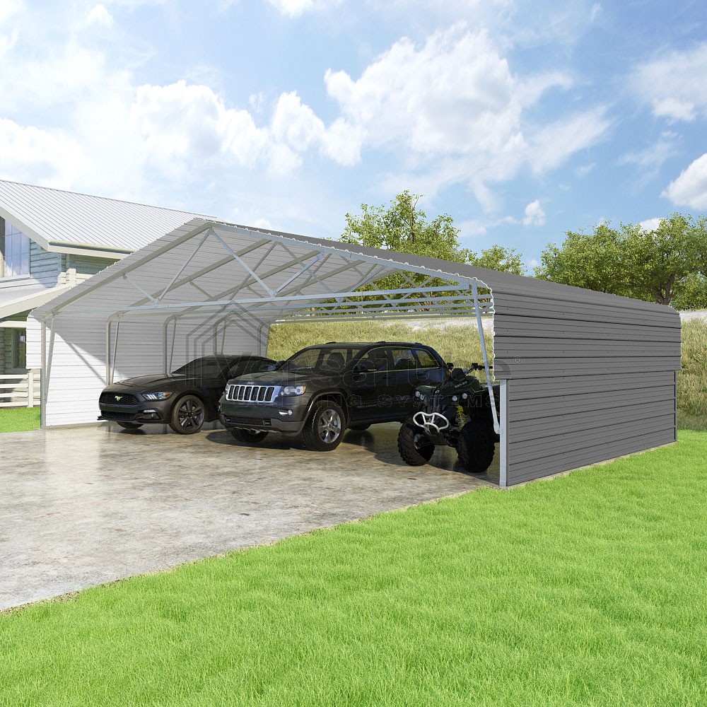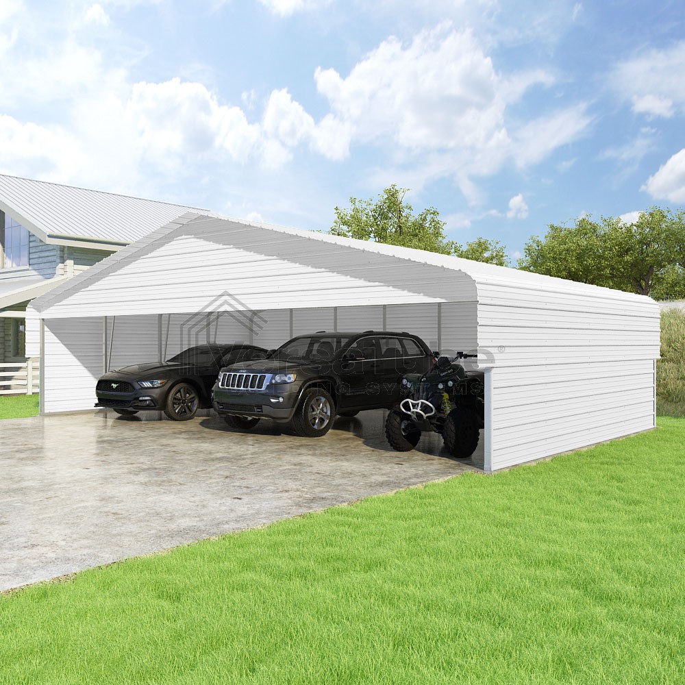 Classic Series DIY carport kit features horizontal application of sheet metal panels with the extra protection of rounded eaves.