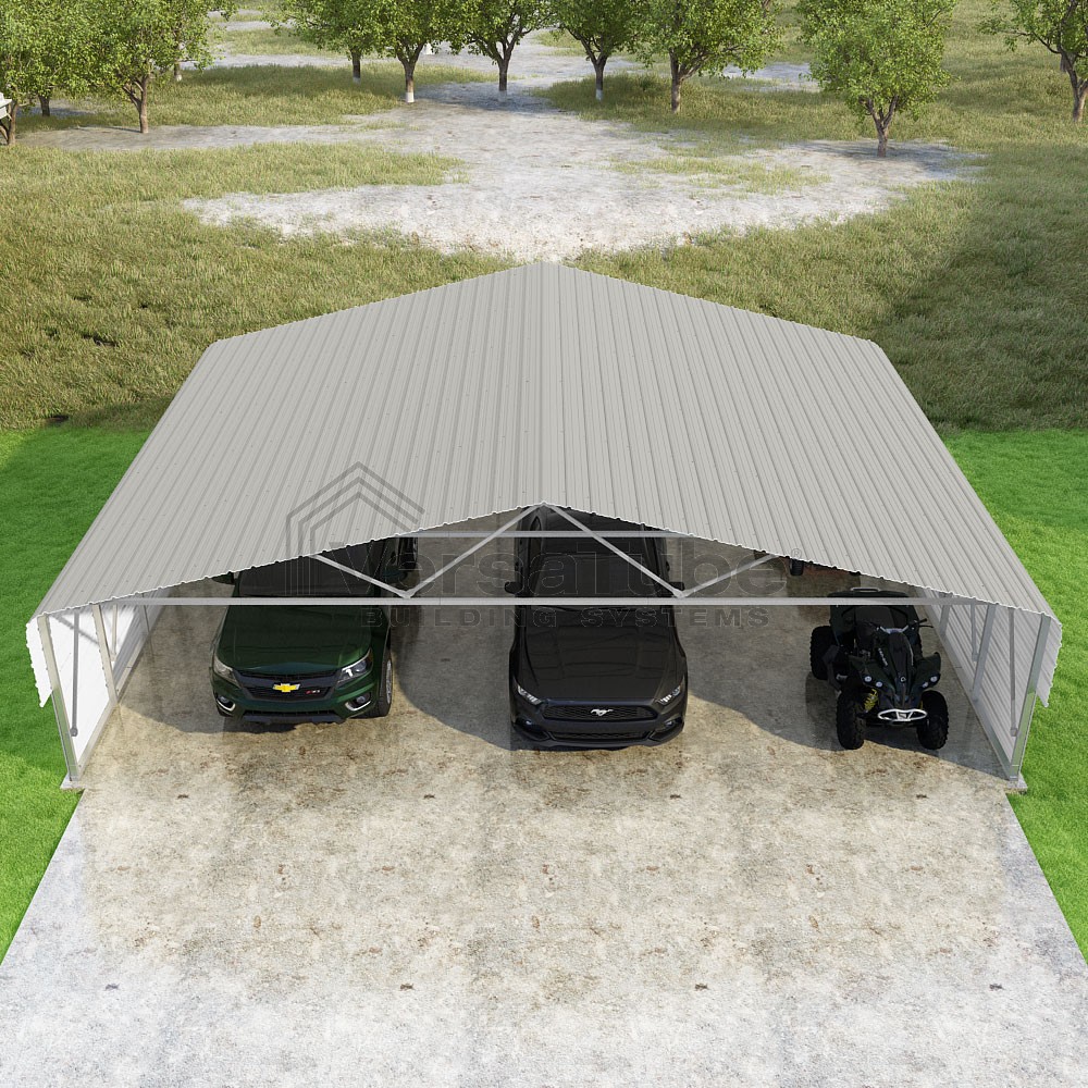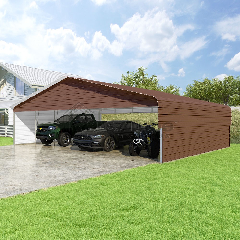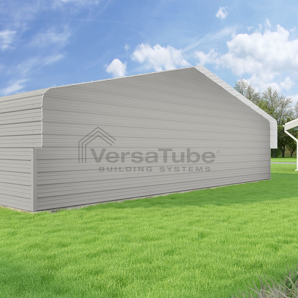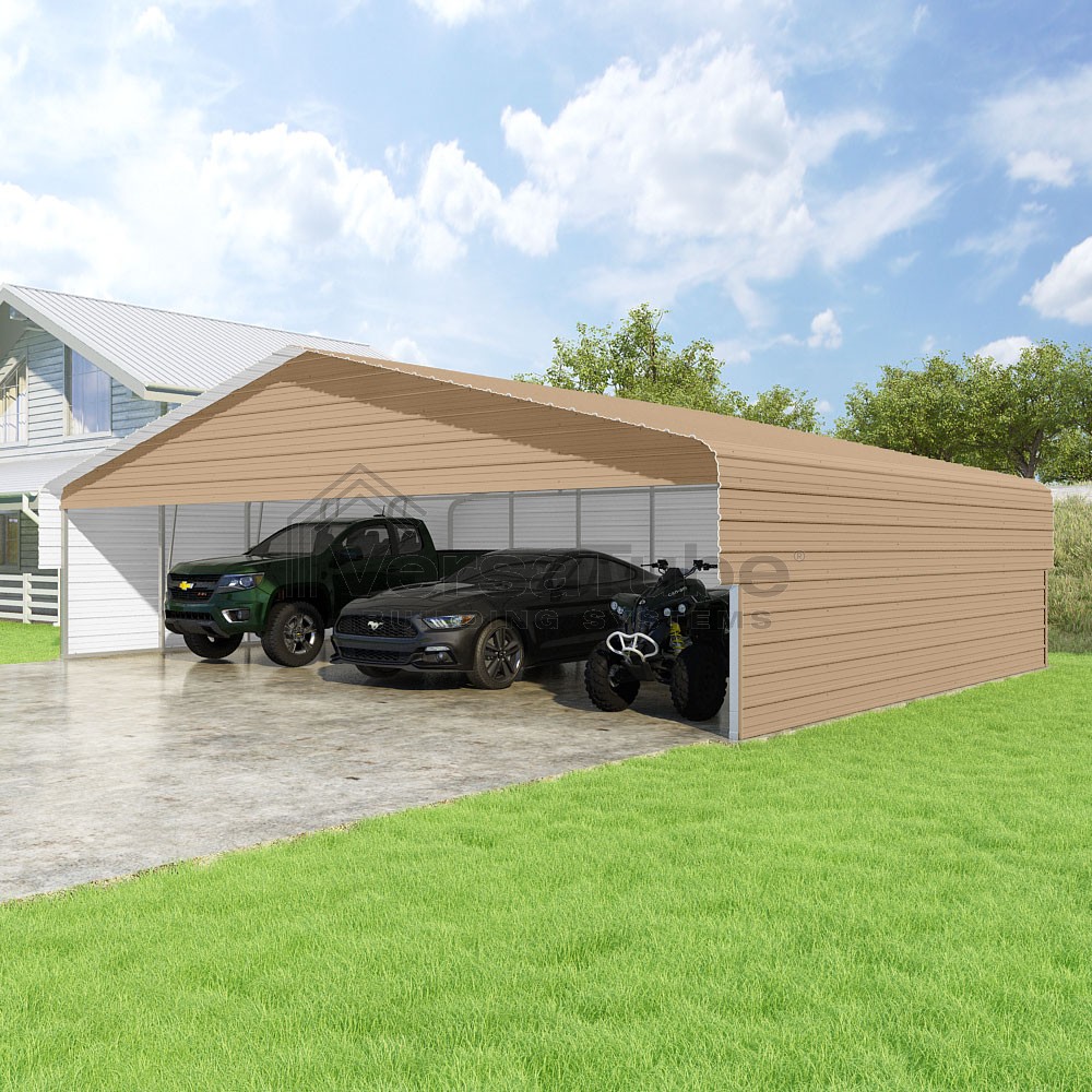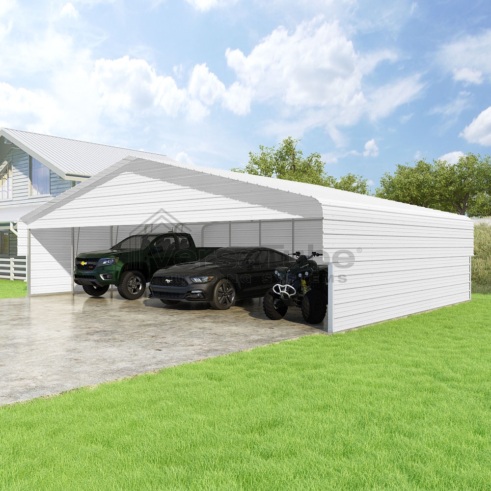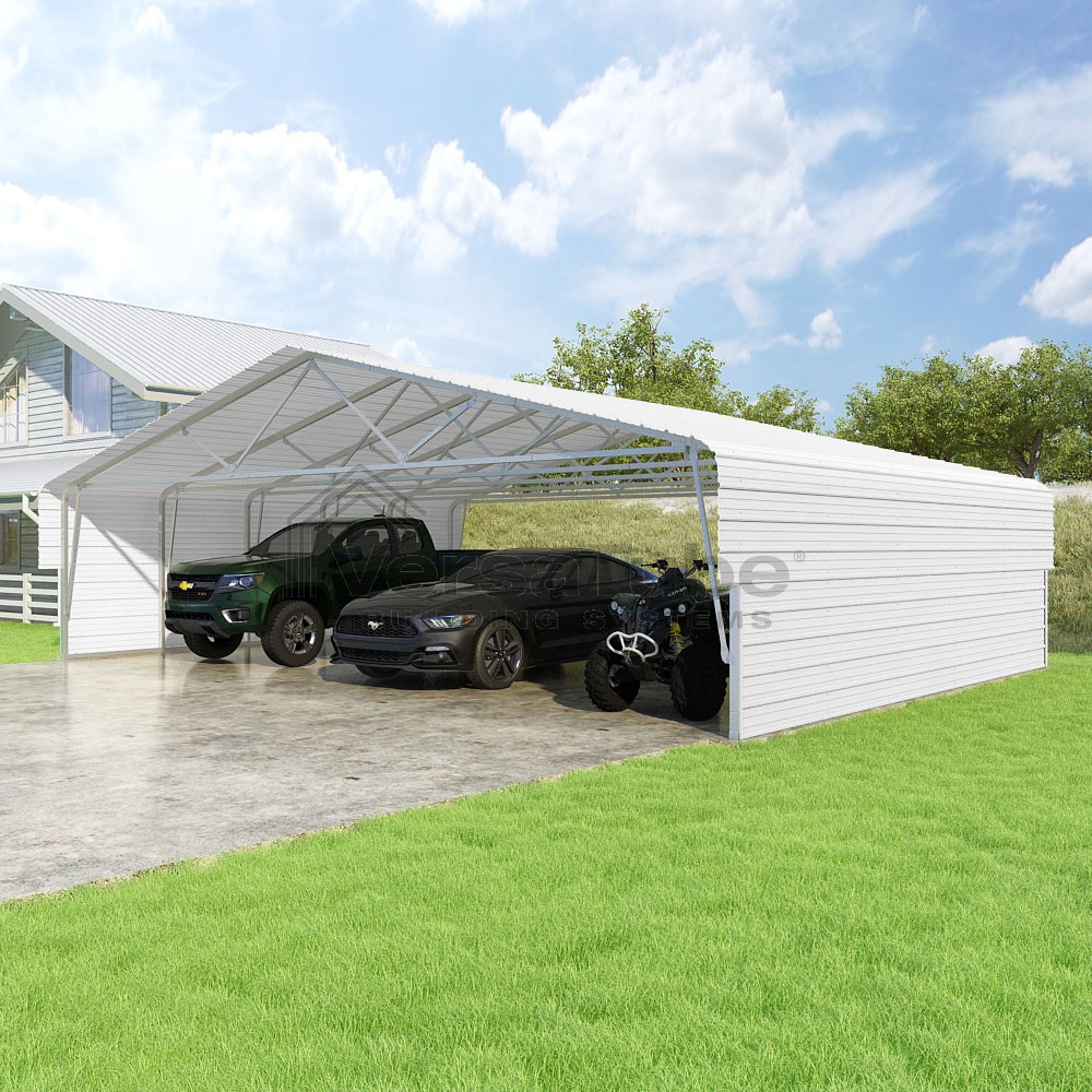 Classic Series DIY carport kit features horizontal application of sheet metal panels with the extra protection of rounded eaves.