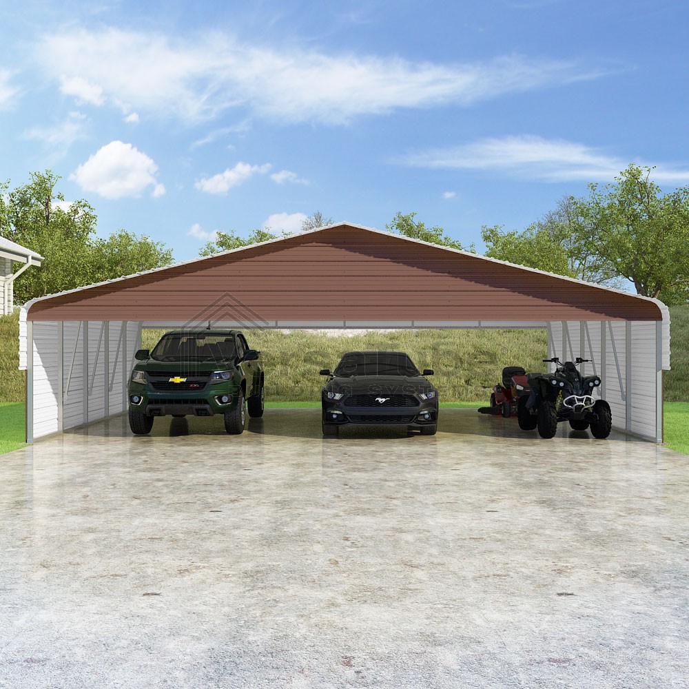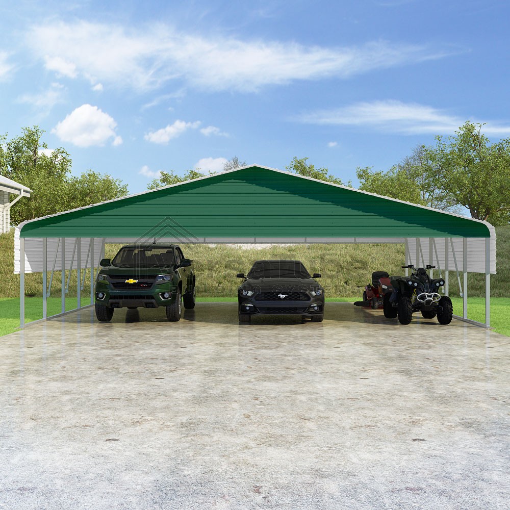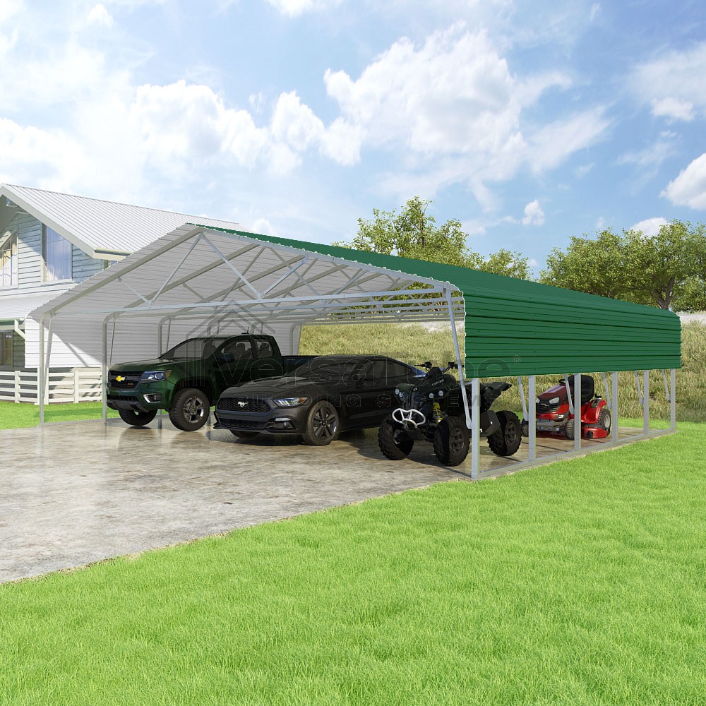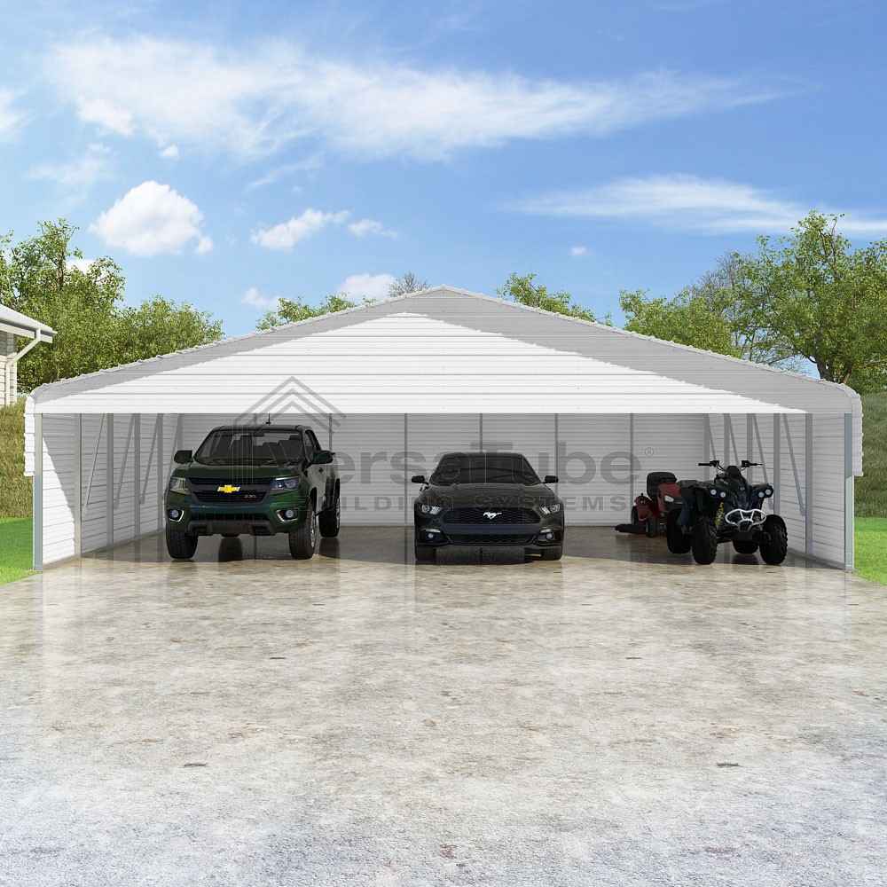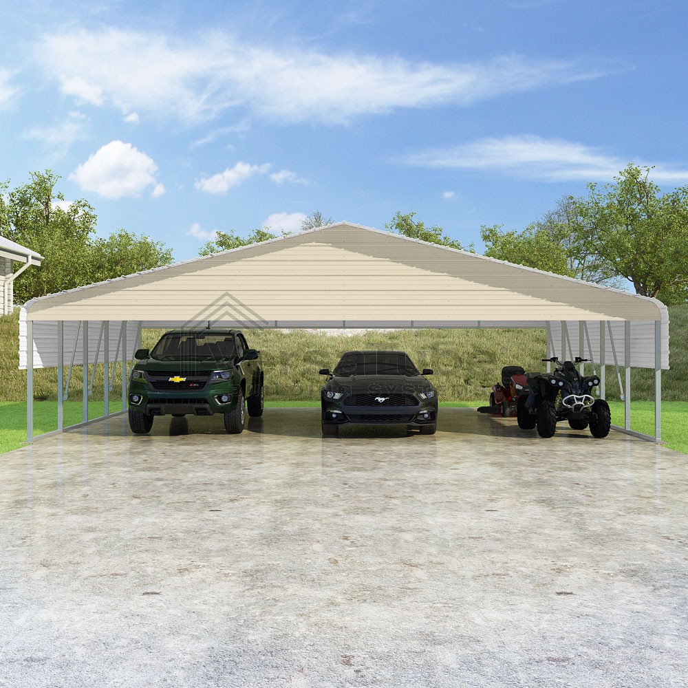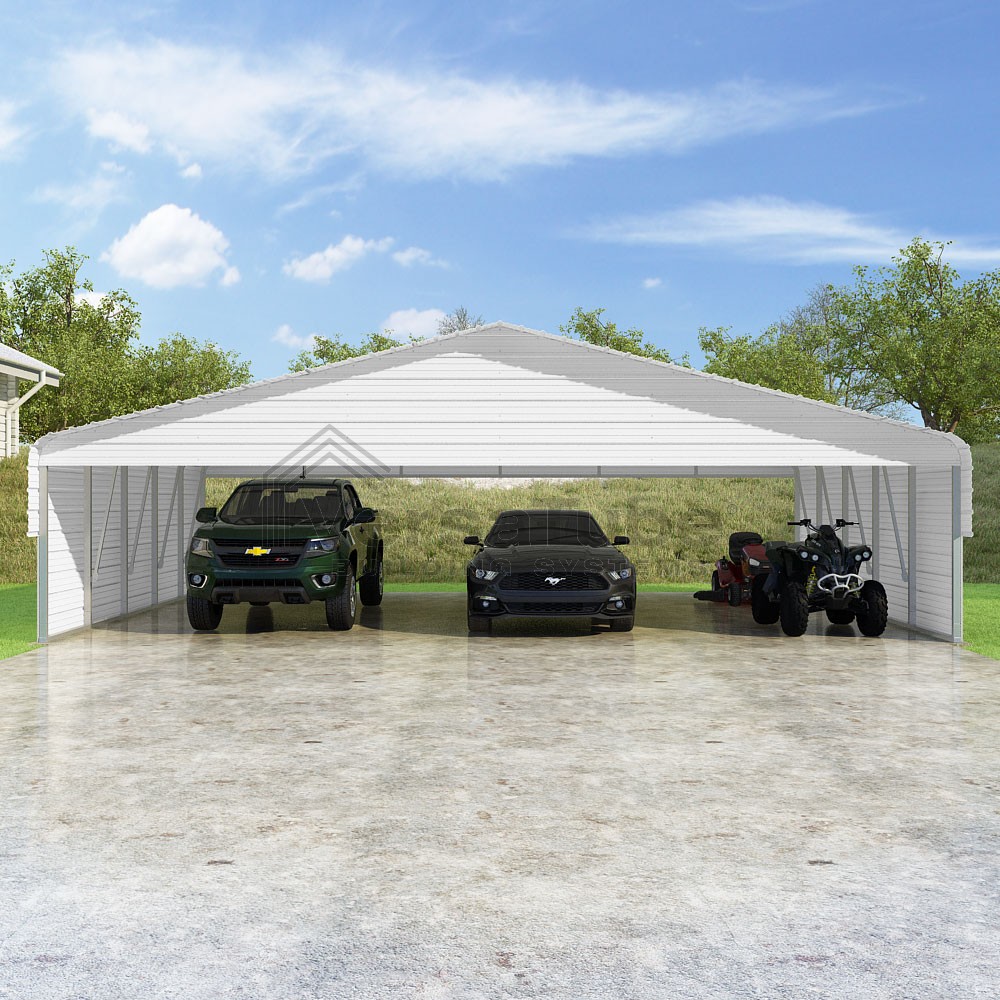 Classic Series DIY carport kit features horizontal application of sheet metal panels with the extra protection of rounded eaves.