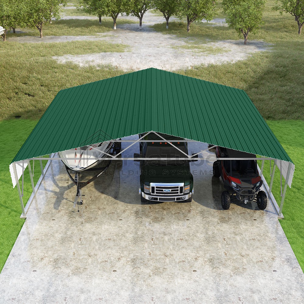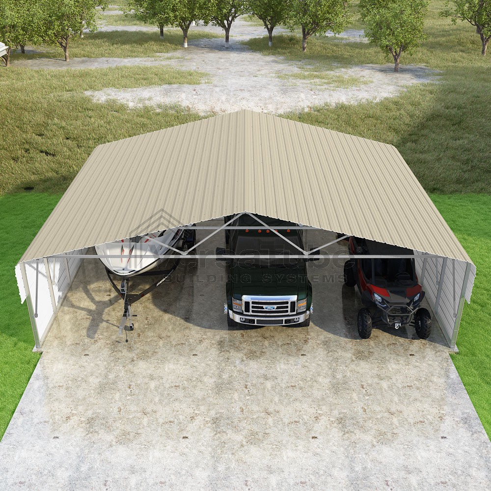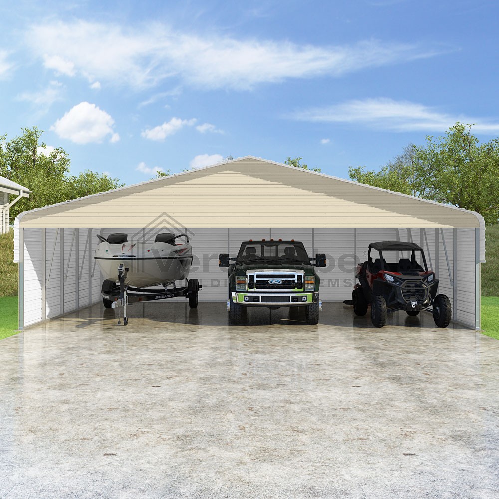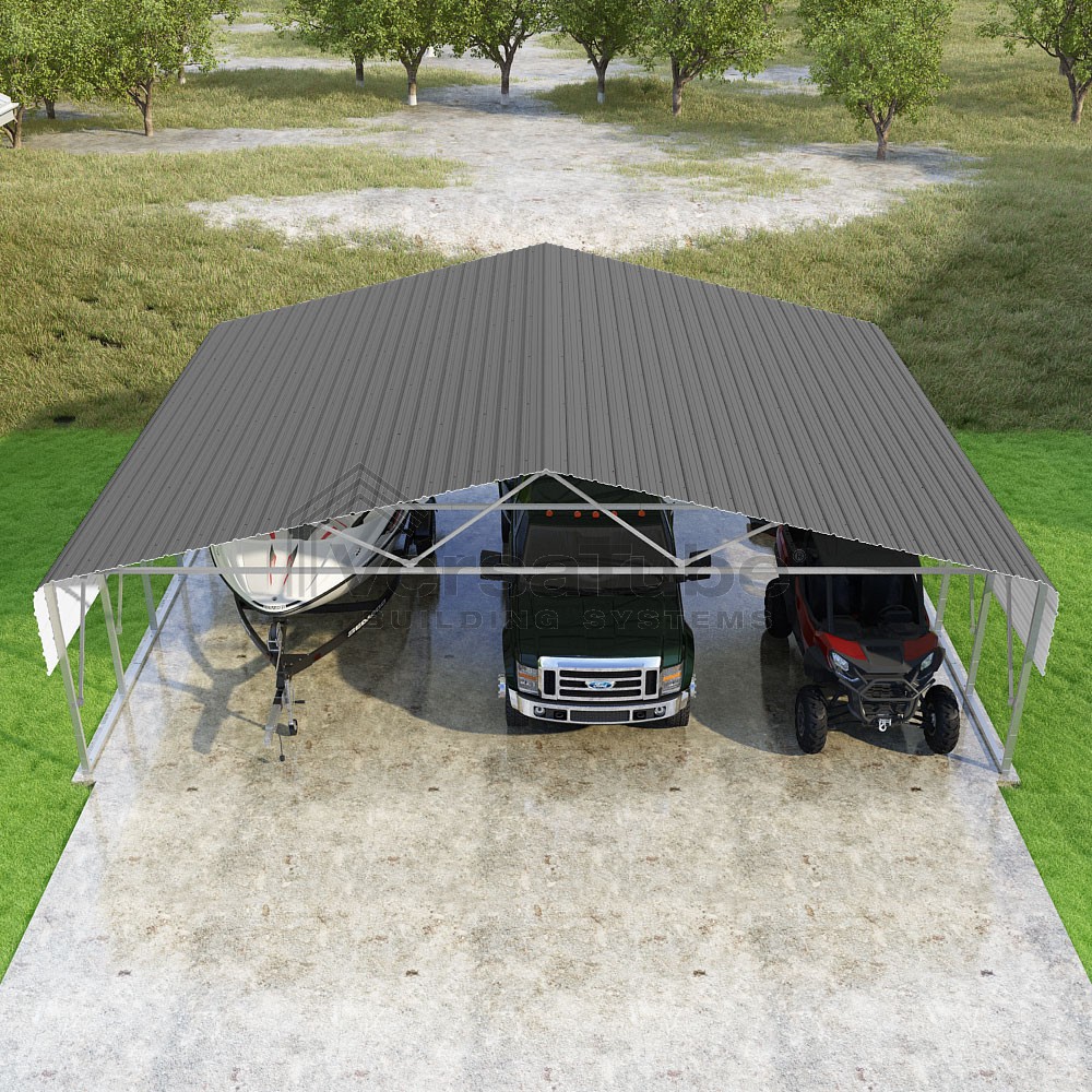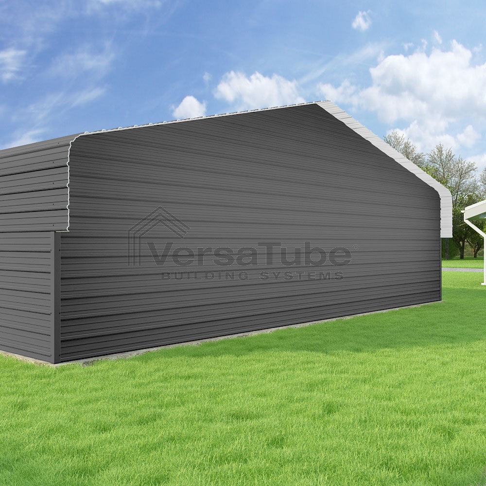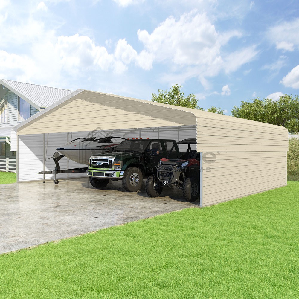 Classic Series DIY carport kit features horizontal application of sheet metal panels with the extra protection of rounded eaves.