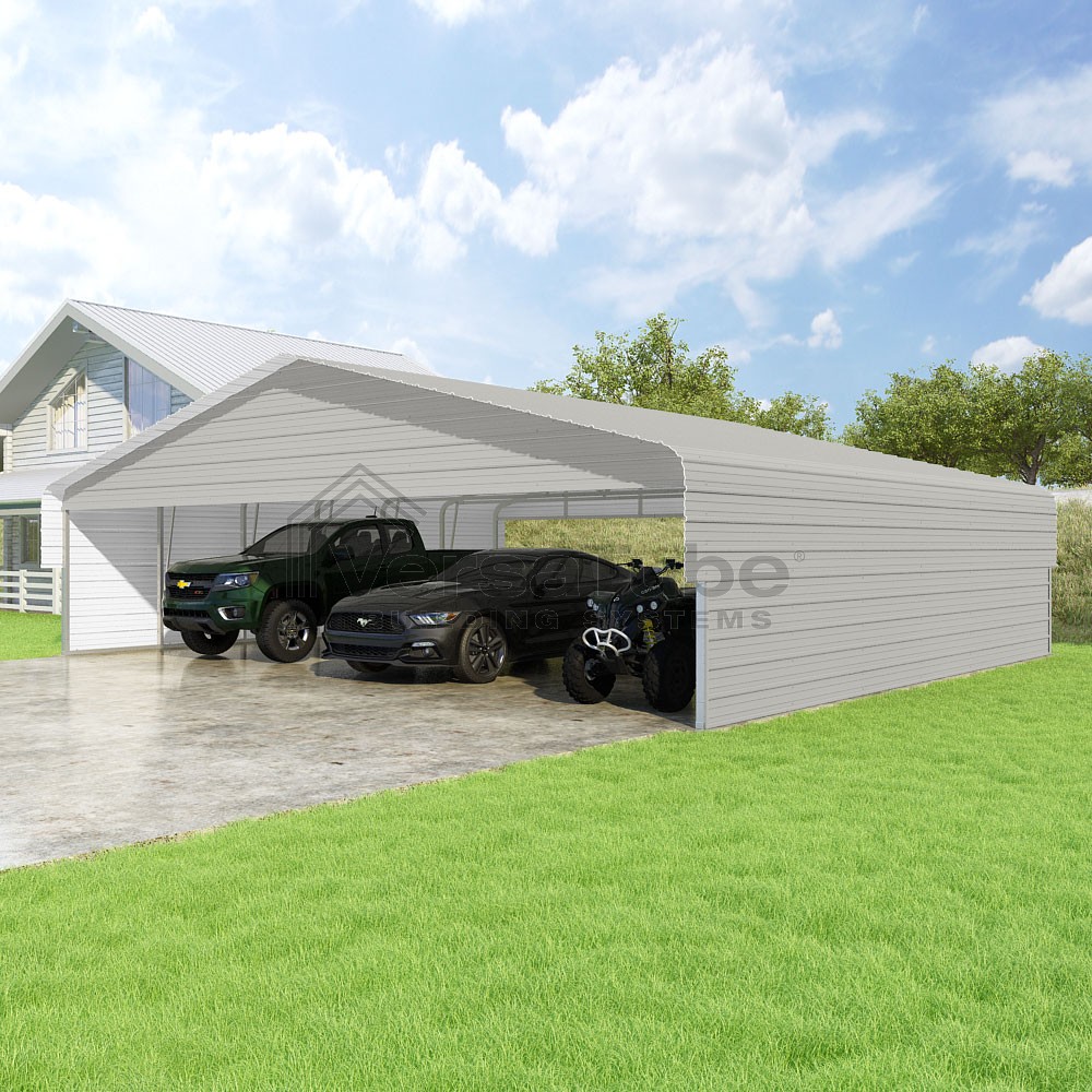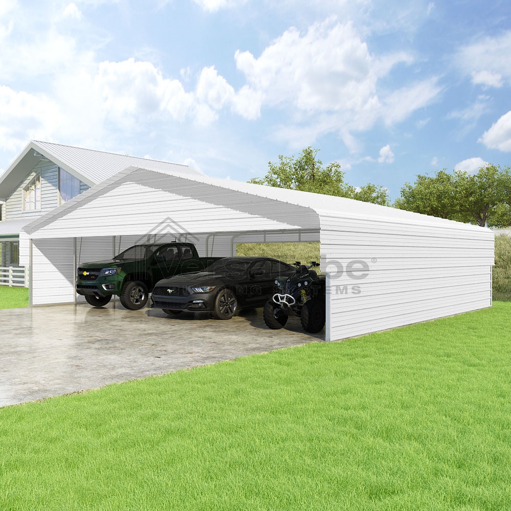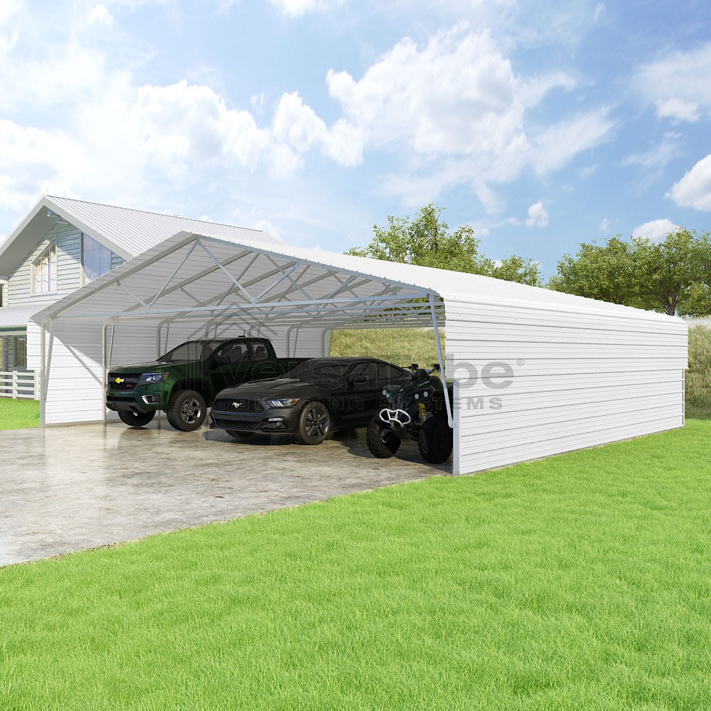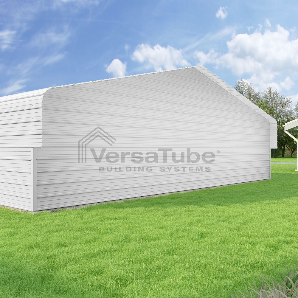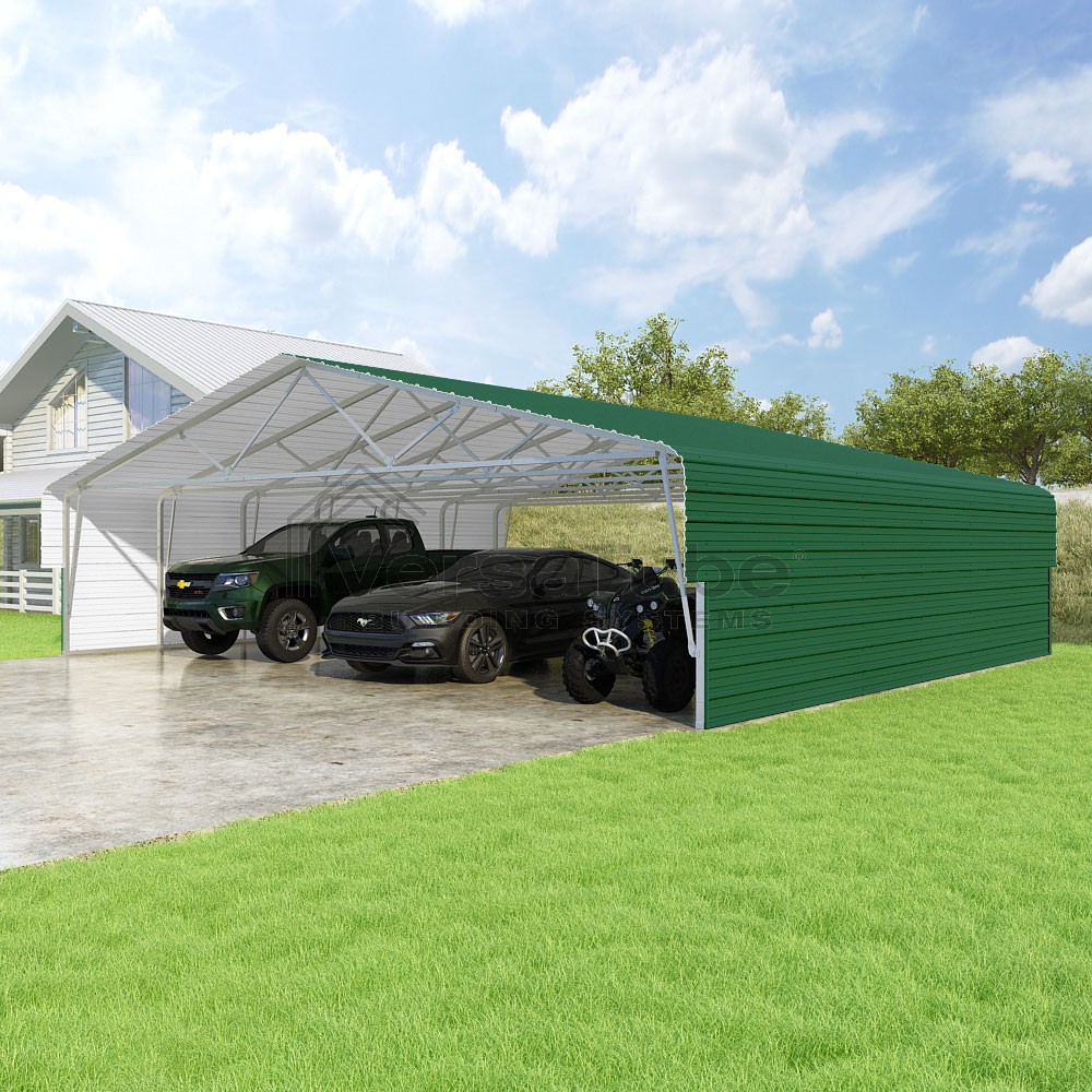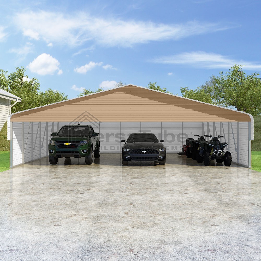 Classic Series DIY carport kit features horizontal application of sheet metal panels with the extra protection of rounded eaves.